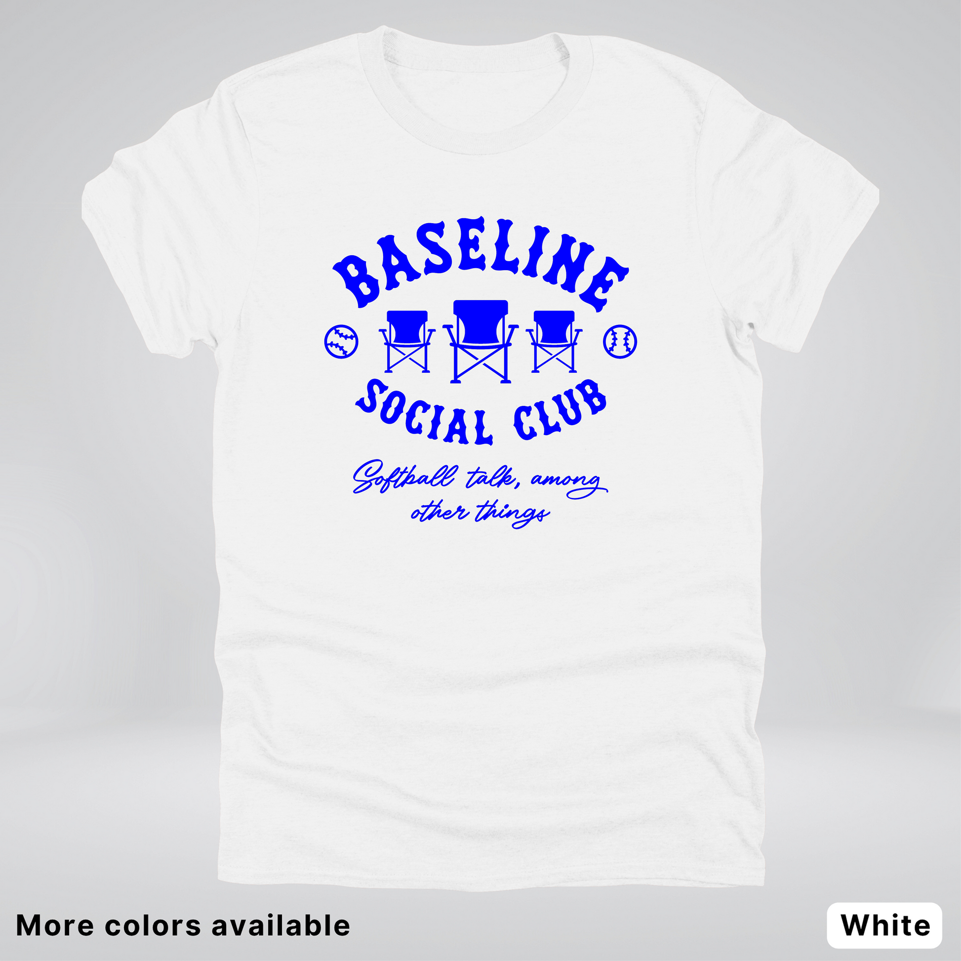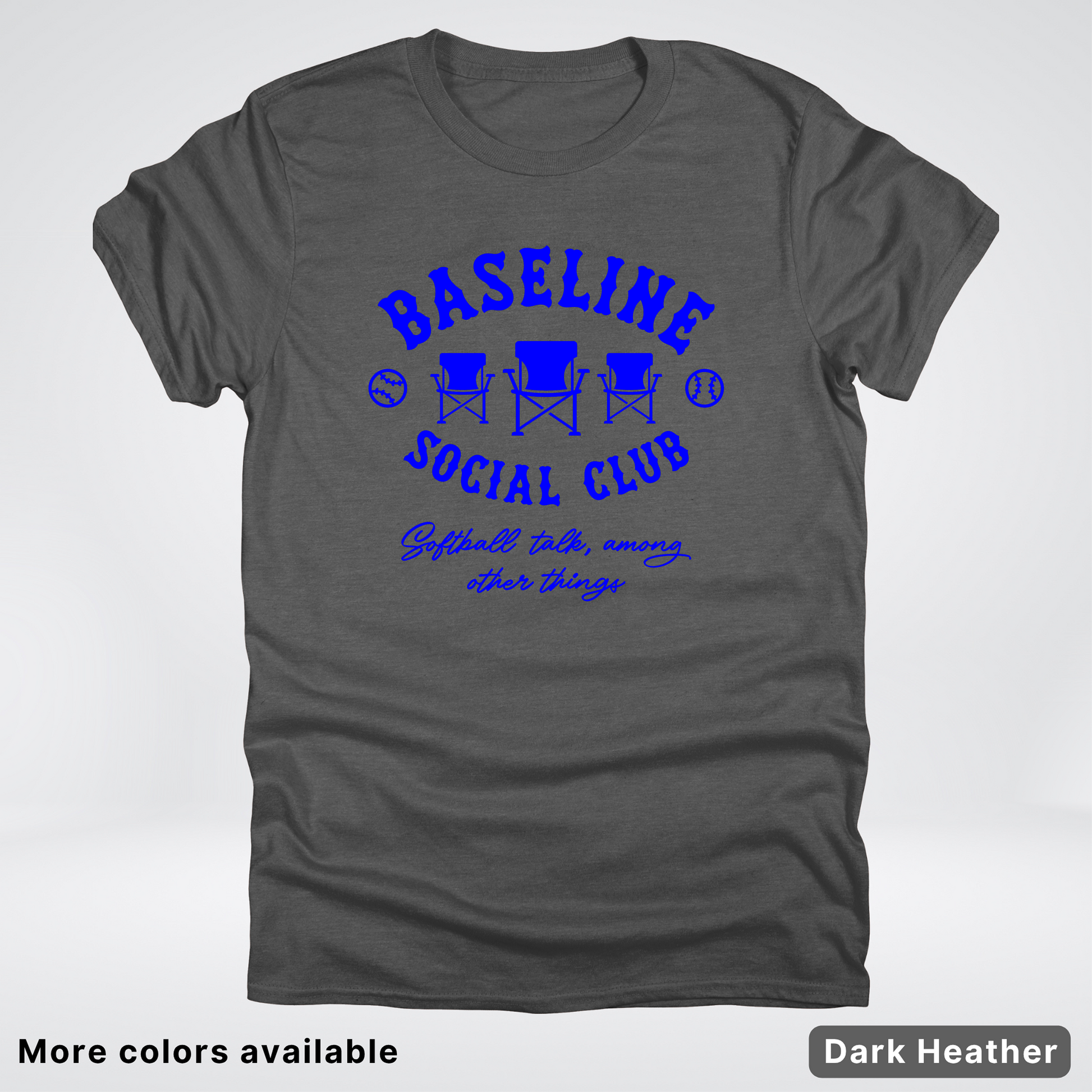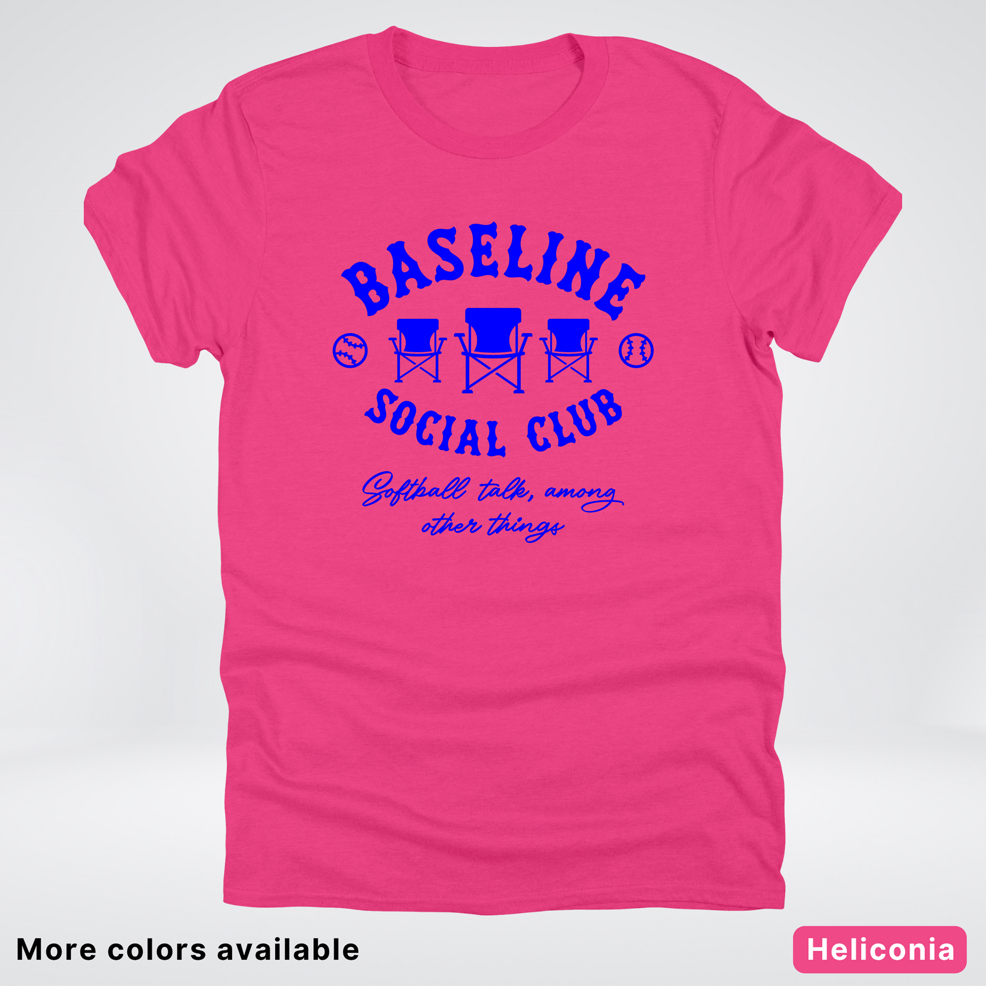 Join the Baseline Social Club in this vibrant blue softball-themed tee that celebrates the spirit of the game. Perfect for players, fans, and anyone who lives for those sunny diamond days, this comfortable t-shirt brings team pride to your everyday wardrobe. Whether you're heading to the field or just showing your love for the sport, this playful design keeps your passion visible. Soft, durable, and ready for action—or just hanging out with fellow softball enthusiasts.