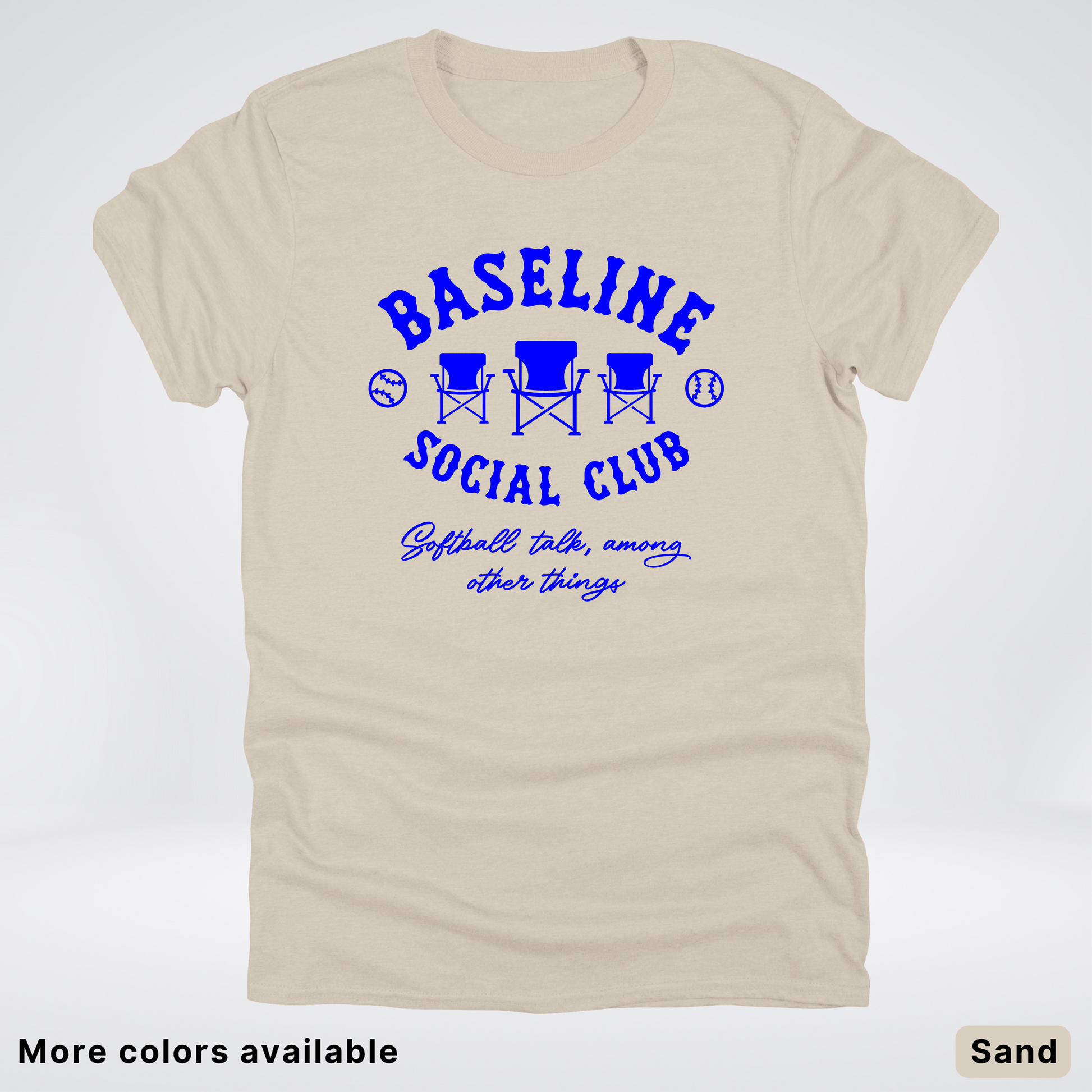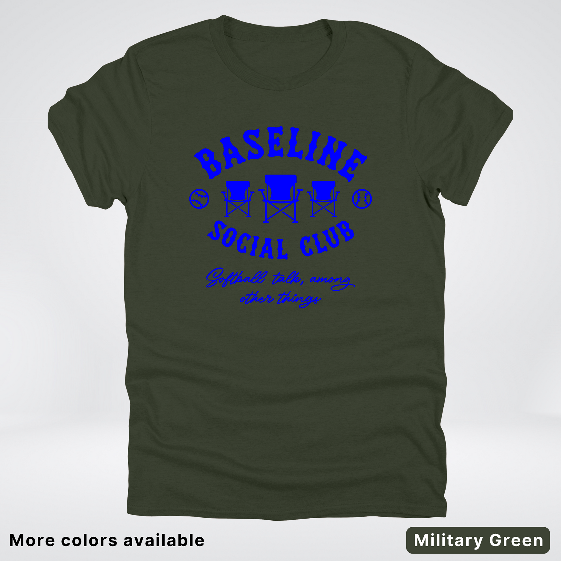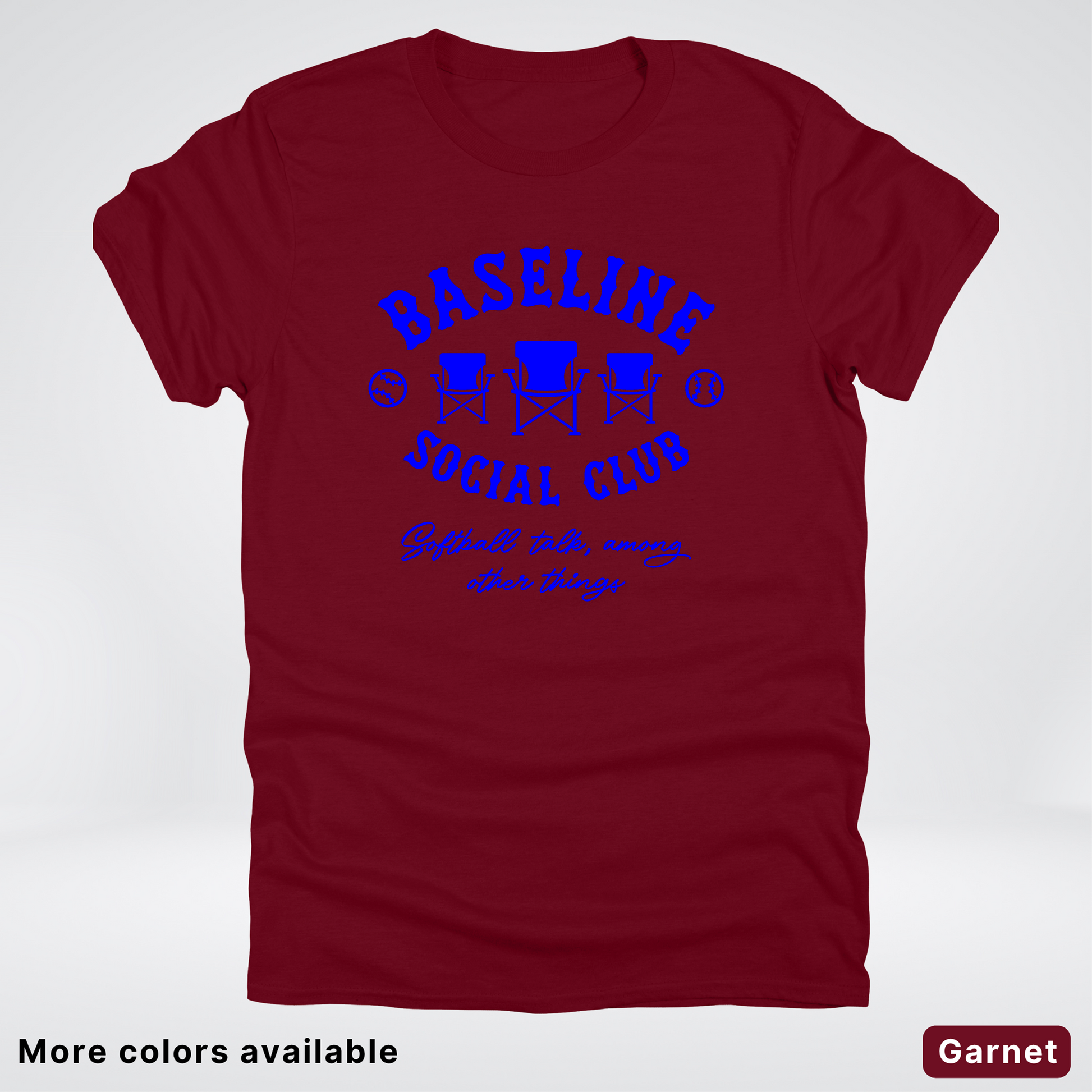 Join the Baseline Social Club in this vibrant blue softball-themed tee that celebrates the spirit of the game. Perfect for players, fans, and anyone who lives for those sunny diamond days, this comfortable t-shirt brings team pride to your everyday wardrobe. Whether you're heading to the field or just showing your love for the sport, this playful design keeps your passion visible. Soft, durable, and ready for action—or just hanging out with fellow softball enthusiasts.