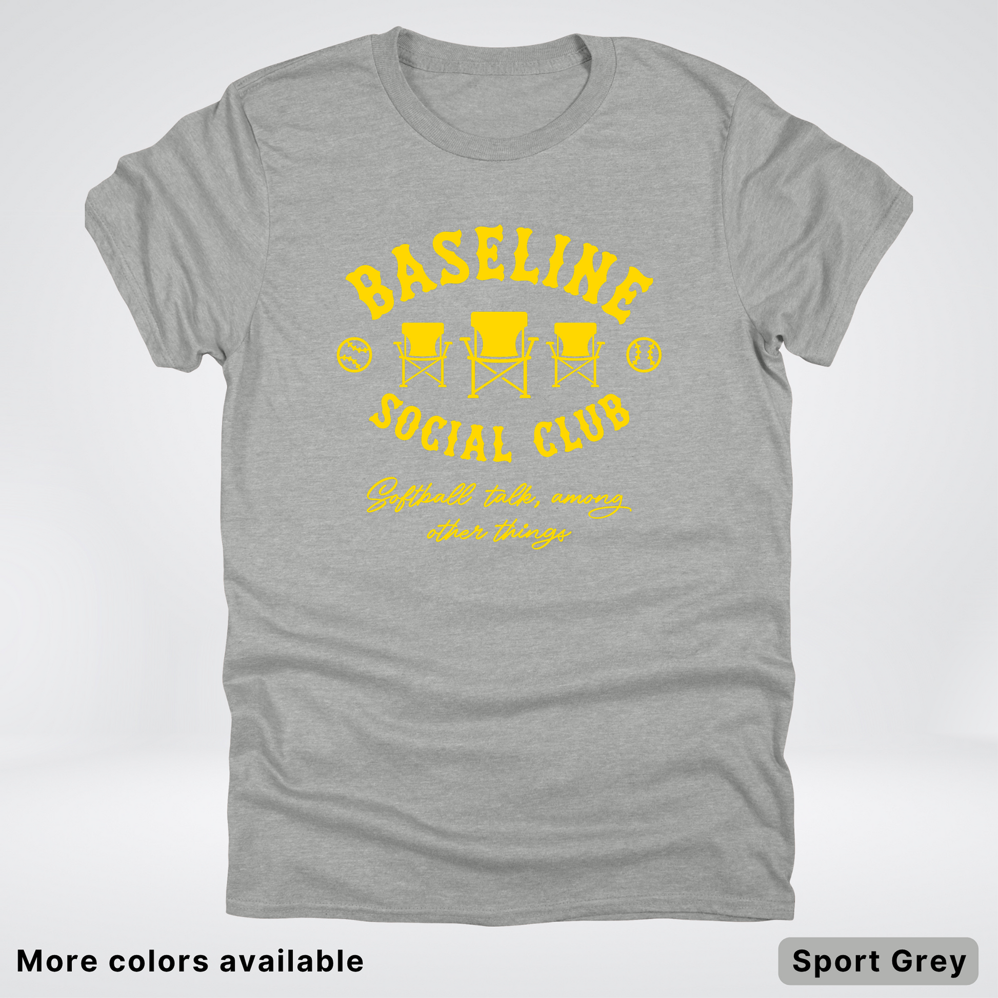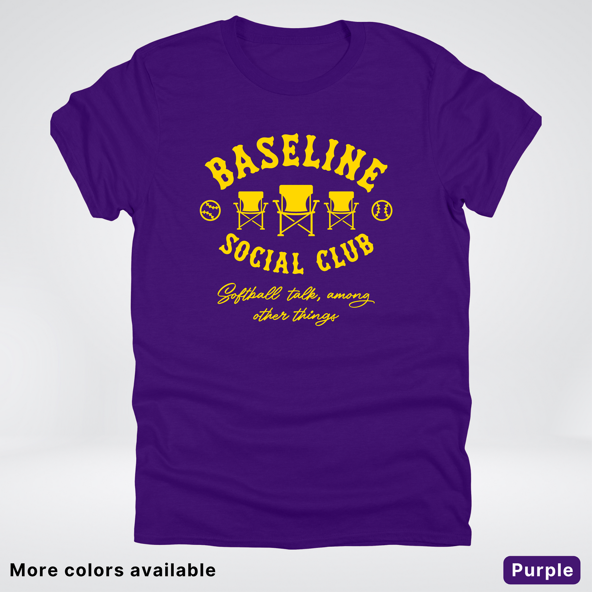 Join the Baseline Social Club in this eye-catching gold design tee that celebrates softball spirit and team pride. Perfect for players, fans, and social butterflies alike, this comfortable t-shirt brings a touch of athletic flair to your everyday wardrobe. Whether you're heading to the field or hanging with your crew, rock this playful design and show your love for the game. Soft, durable, and ready for action—because looking good while playing hard is always in style.