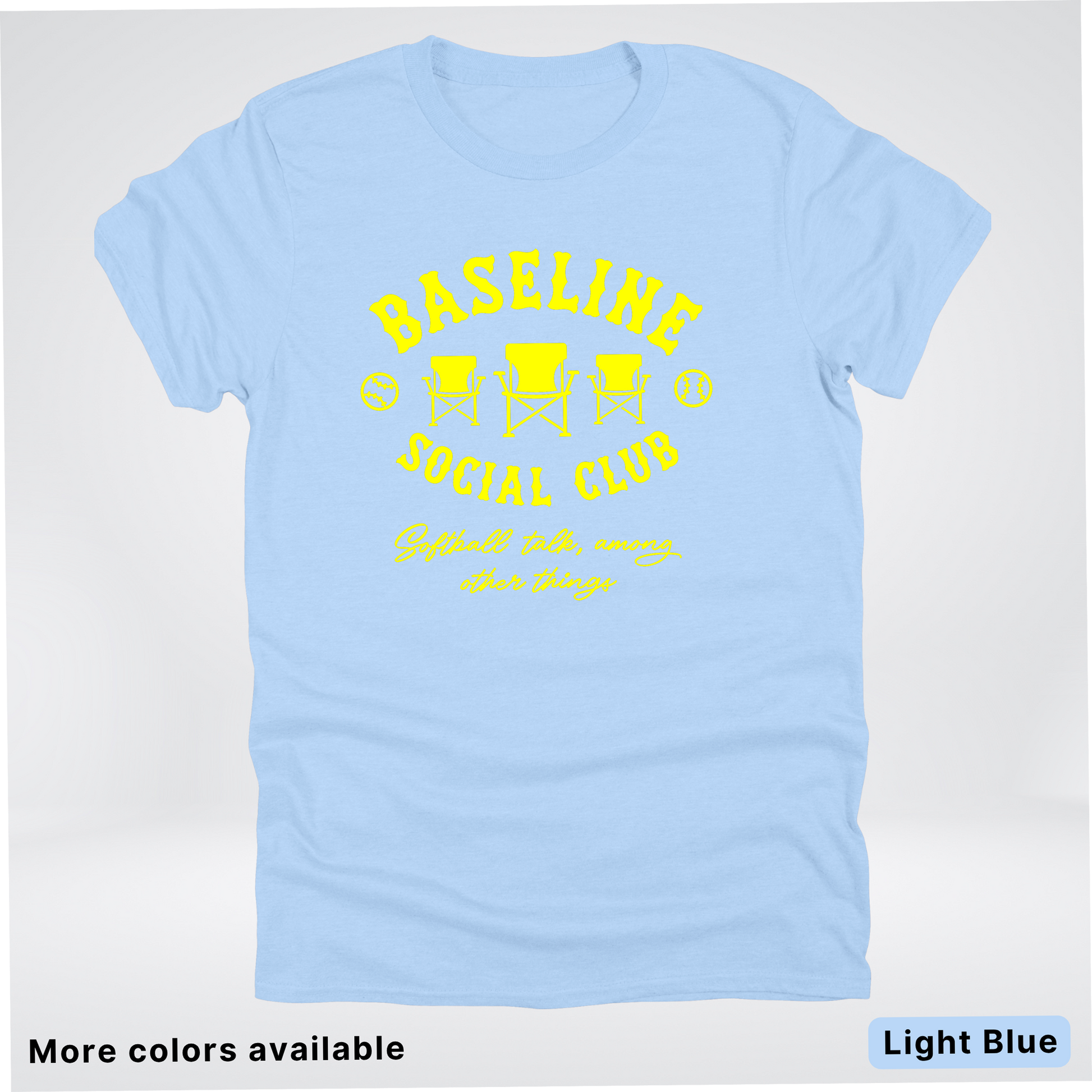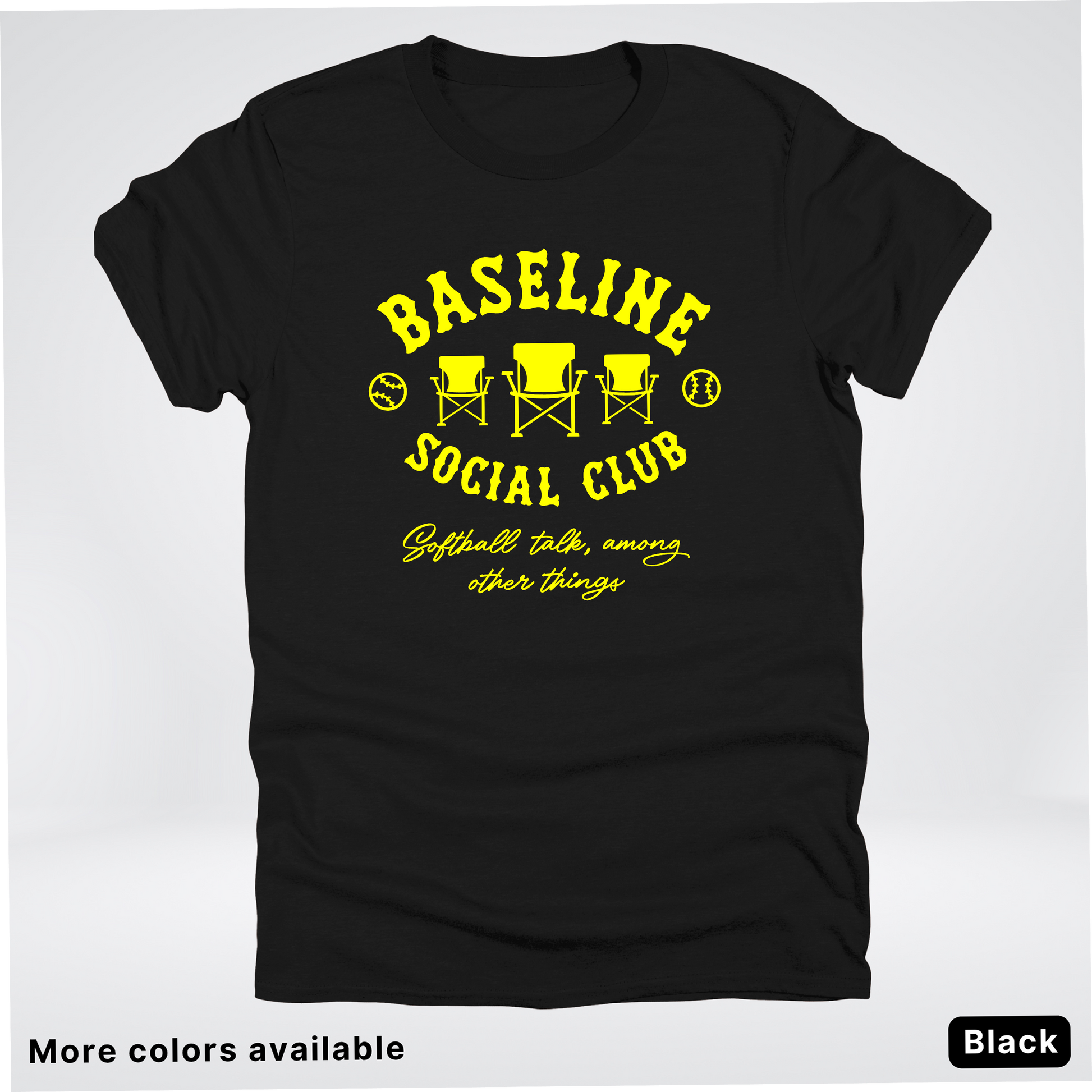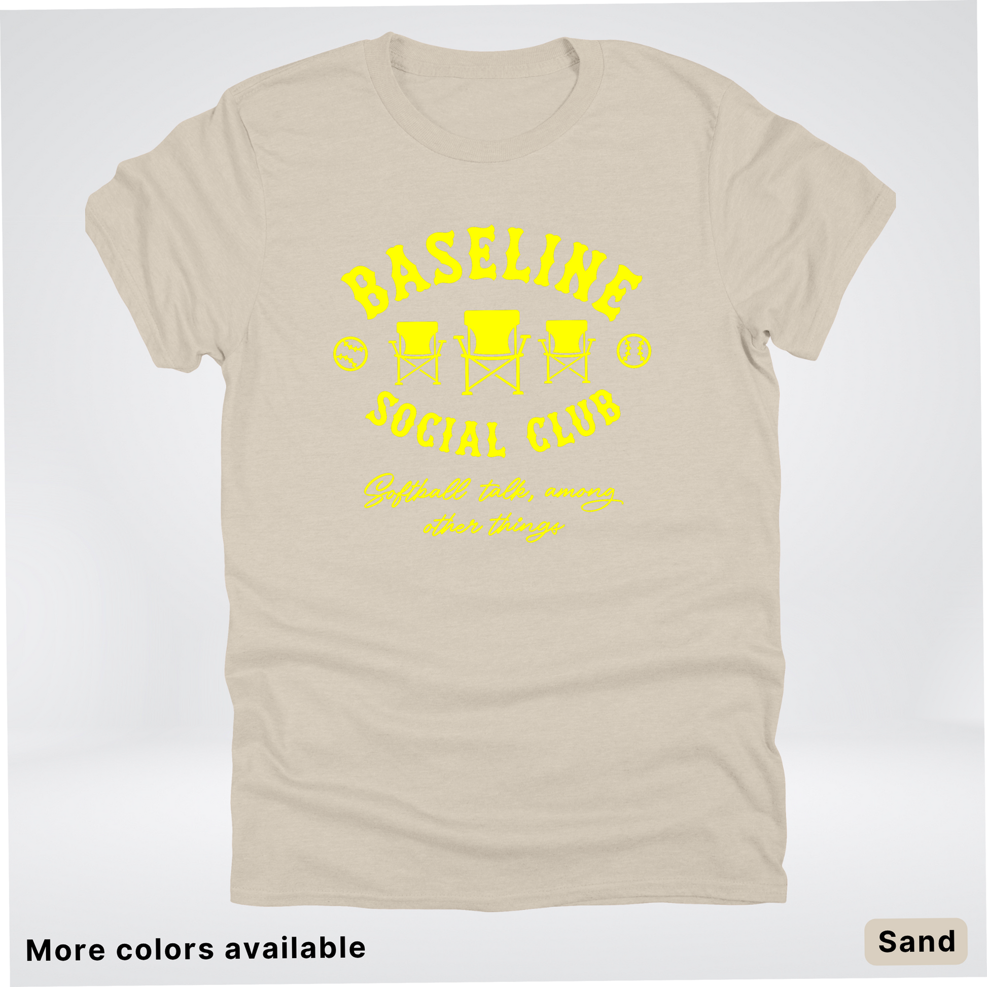 Swing into style with the Baseline Social Club Softball tee! This vibrant yellow design celebrates your love for the game with a playful spirit that's perfect for practice, game day, or just showing off your softball pride. Crafted for comfort and durability, it's the ideal way to rep your team and connect with fellow players. Whether you're heading to the field or hanging out with your crew, this tee keeps your passion visible and your vibe unmistakable.