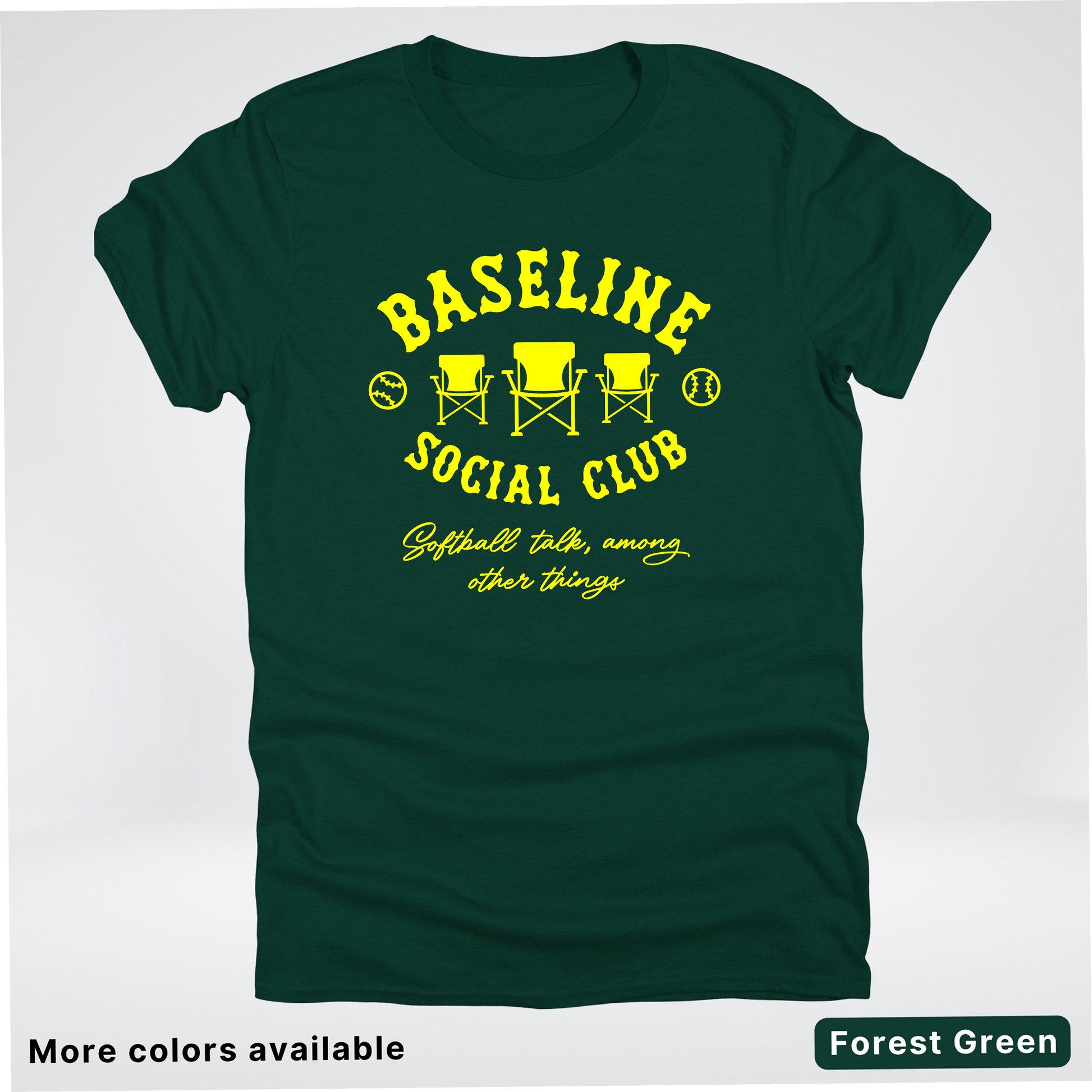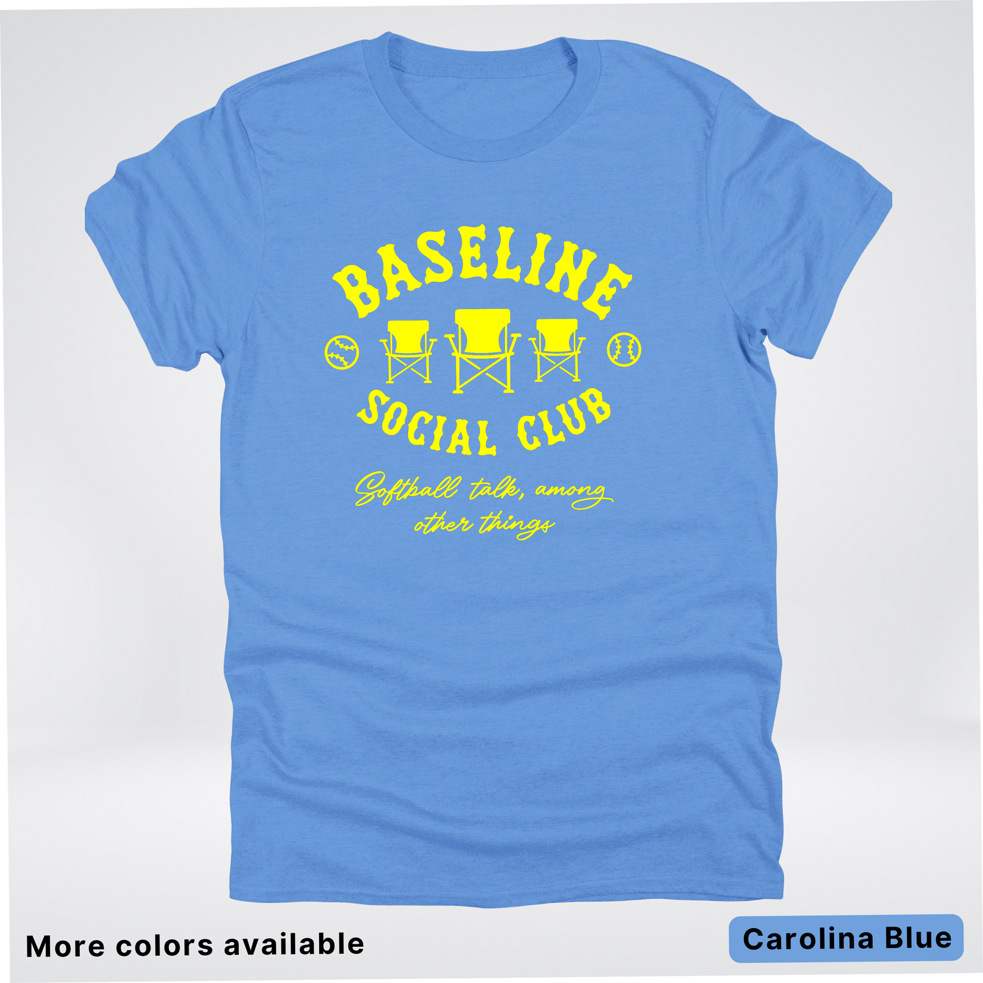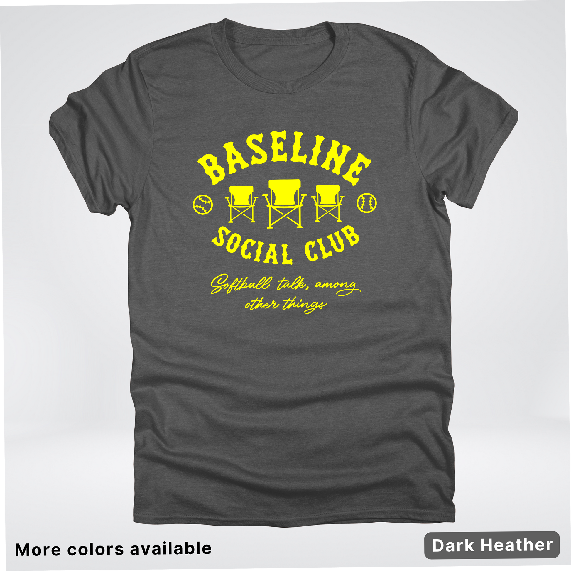 Swing into style with the Baseline Social Club Softball tee! This vibrant yellow design celebrates your love for the game with a playful spirit that's perfect for practice, game day, or just showing off your softball pride. Crafted for comfort and durability, it's the ideal way to rep your team and connect with fellow players. Whether you're heading to the field or hanging out with your crew, this tee keeps your passion visible and your vibe unmistakable.