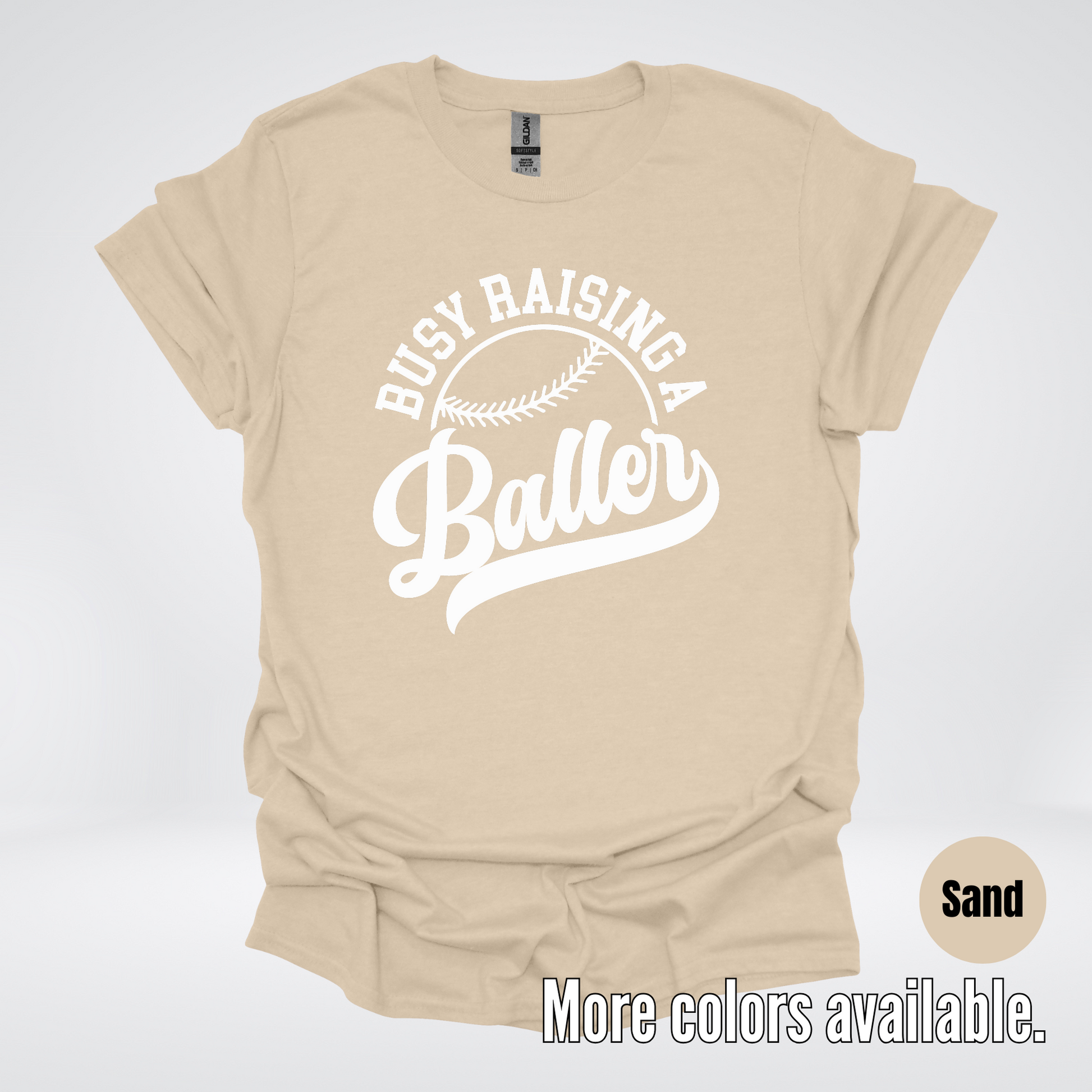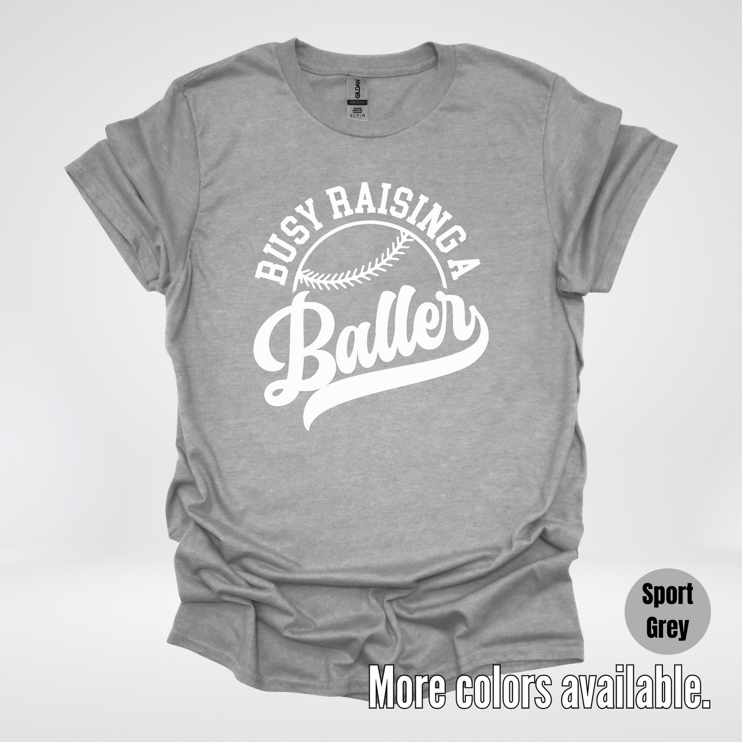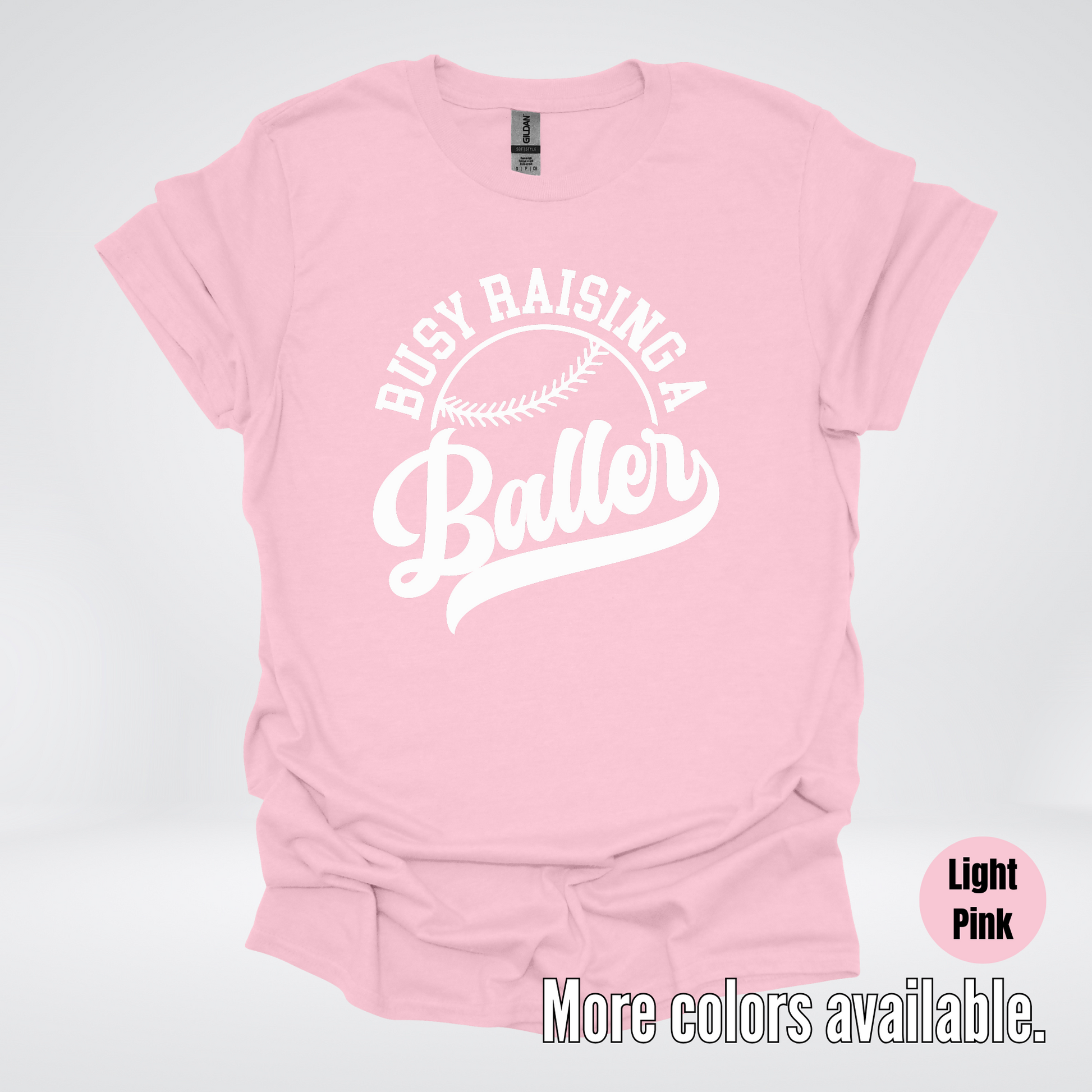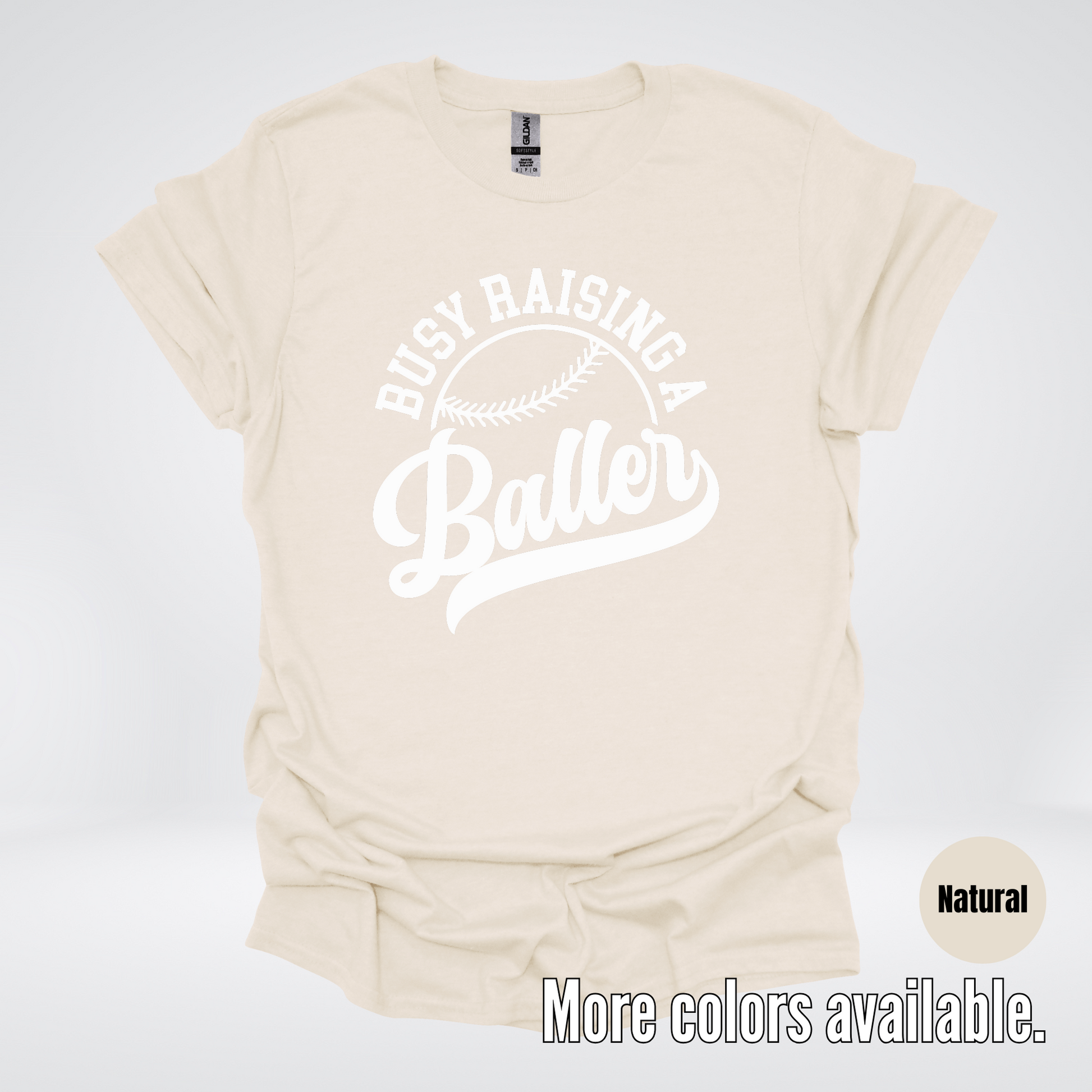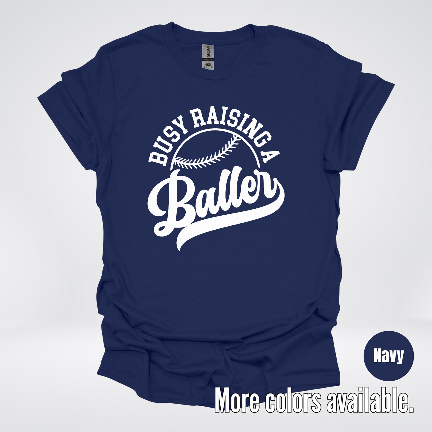 Busy Raising A Baller – White Design – Baseball Softball T-Shirt