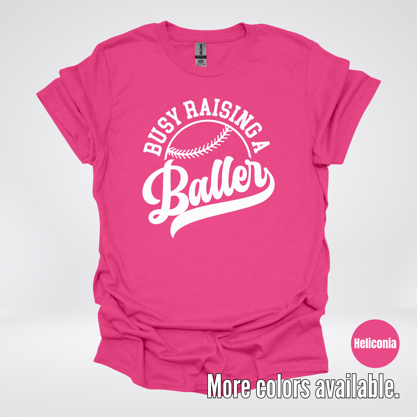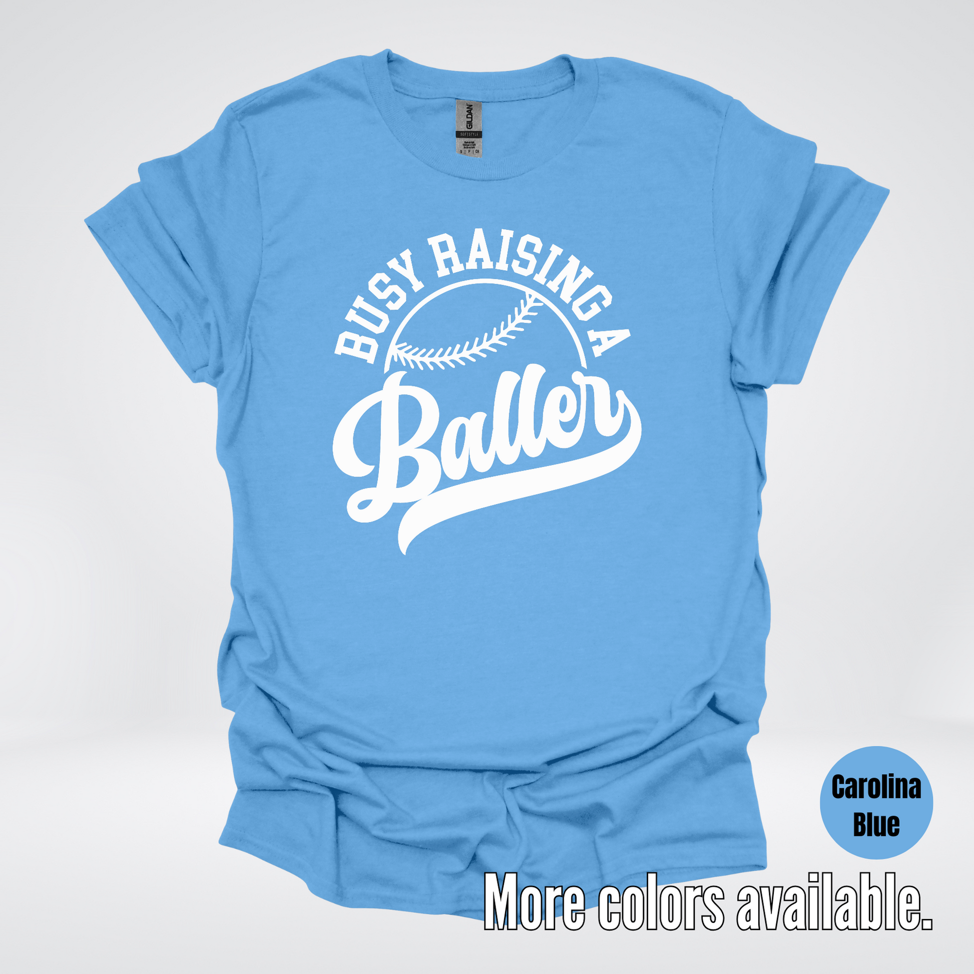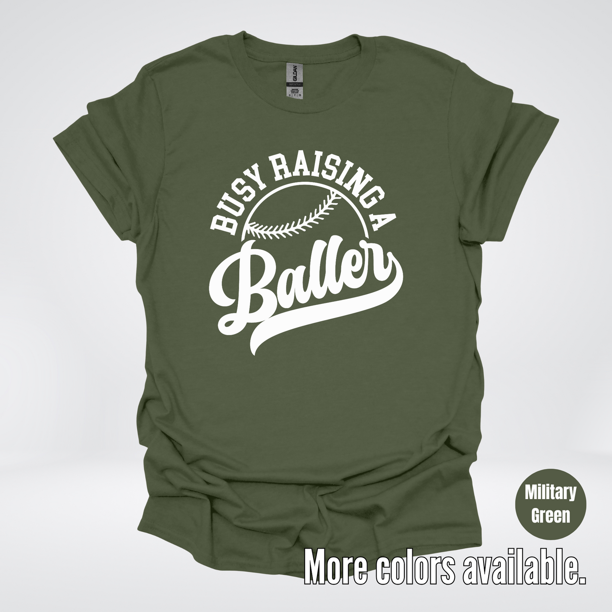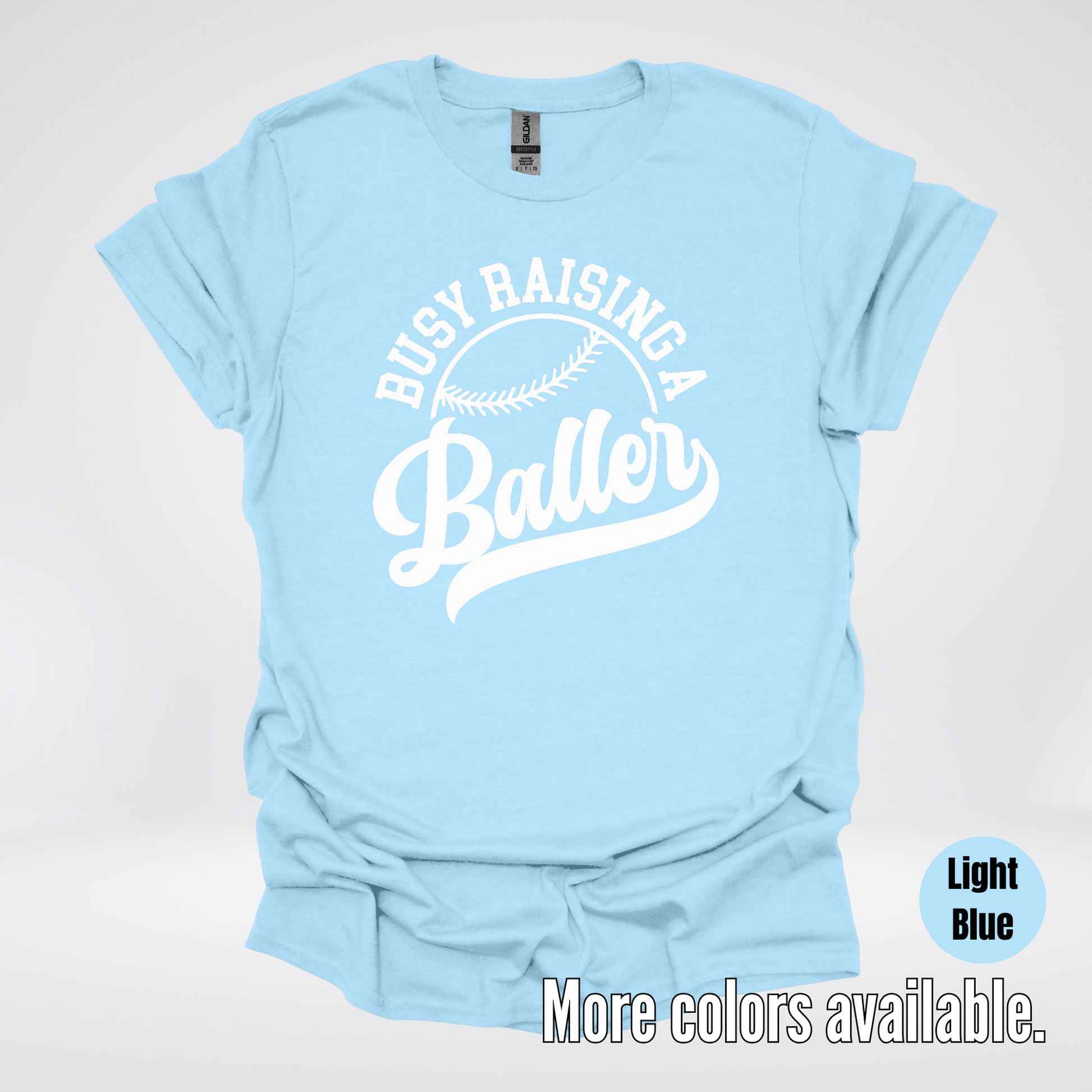 Busy Raising A Baller – White Design – Baseball Softball T-Shirt