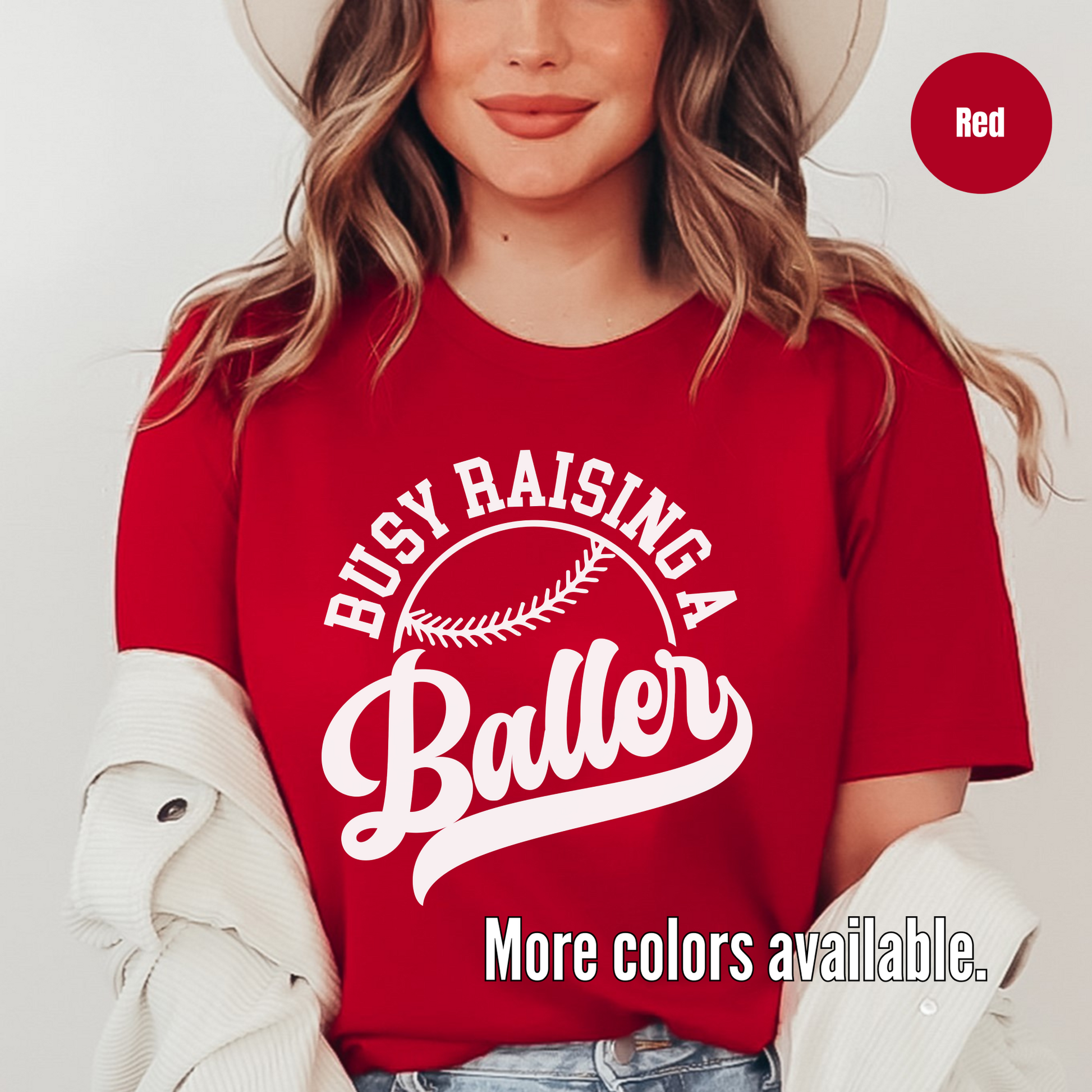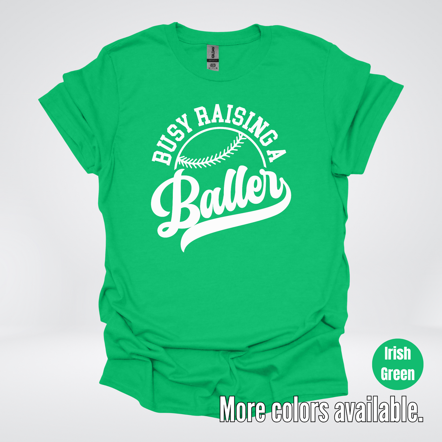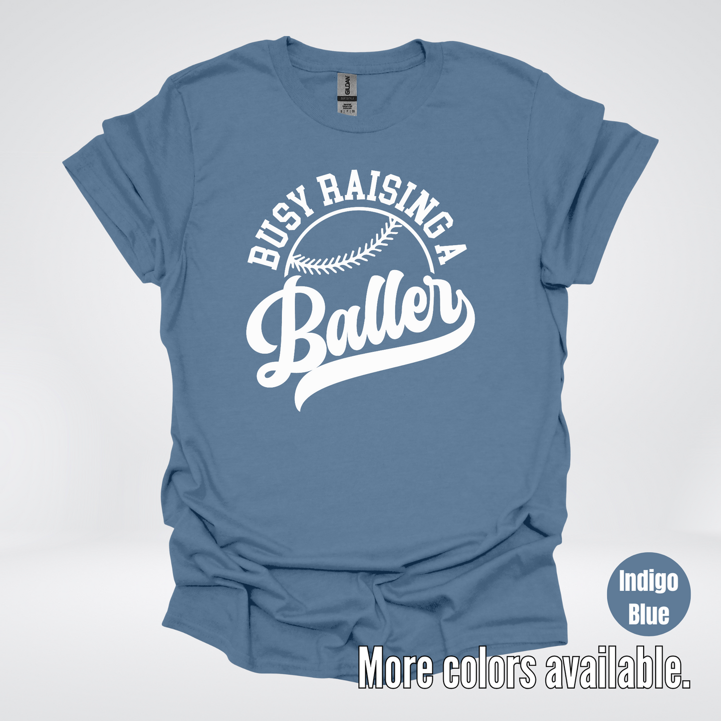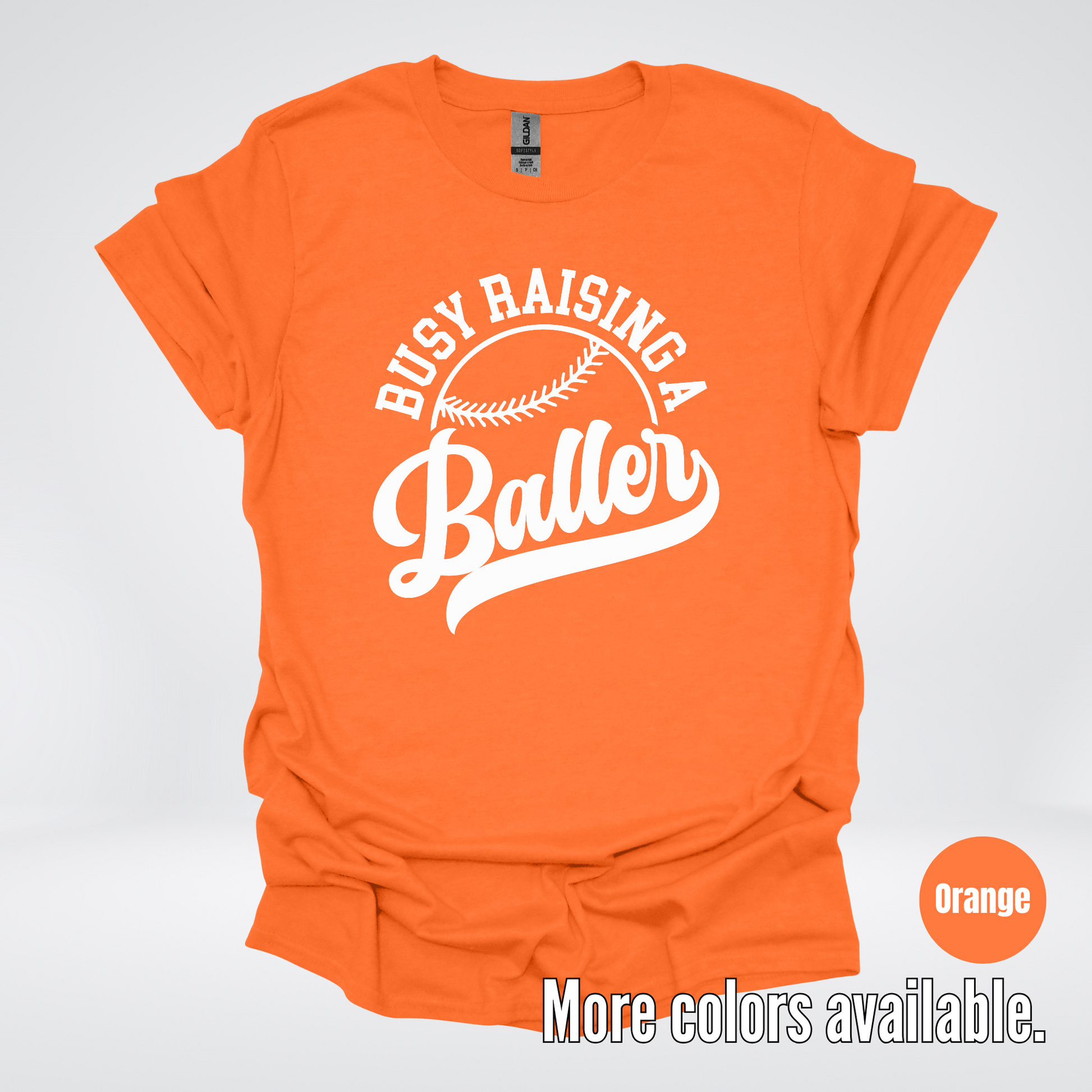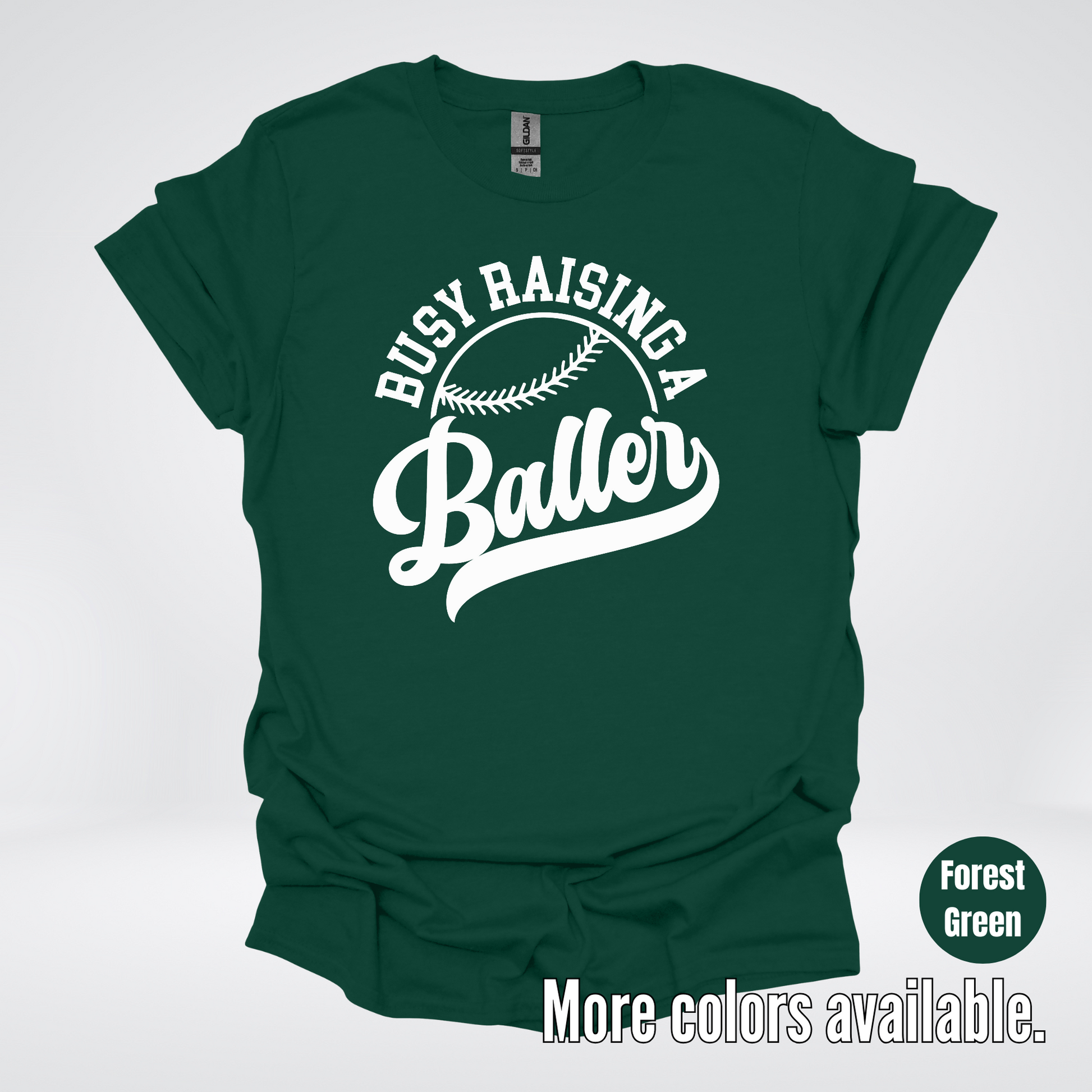 Busy Raising A Baller – White Design – Baseball Softball T-Shirt