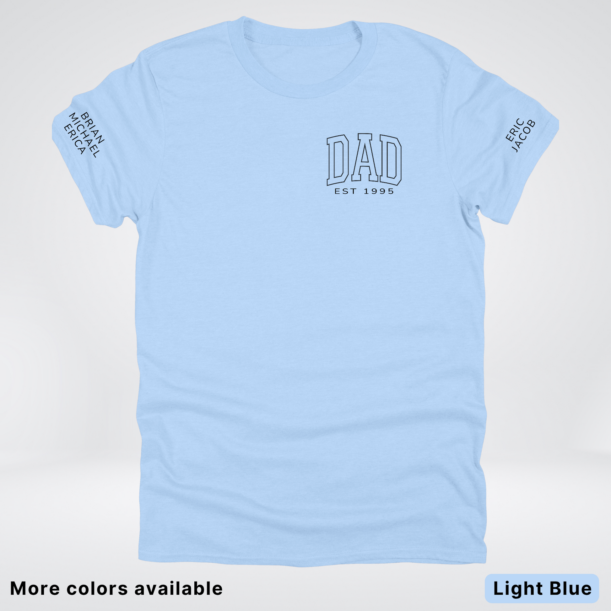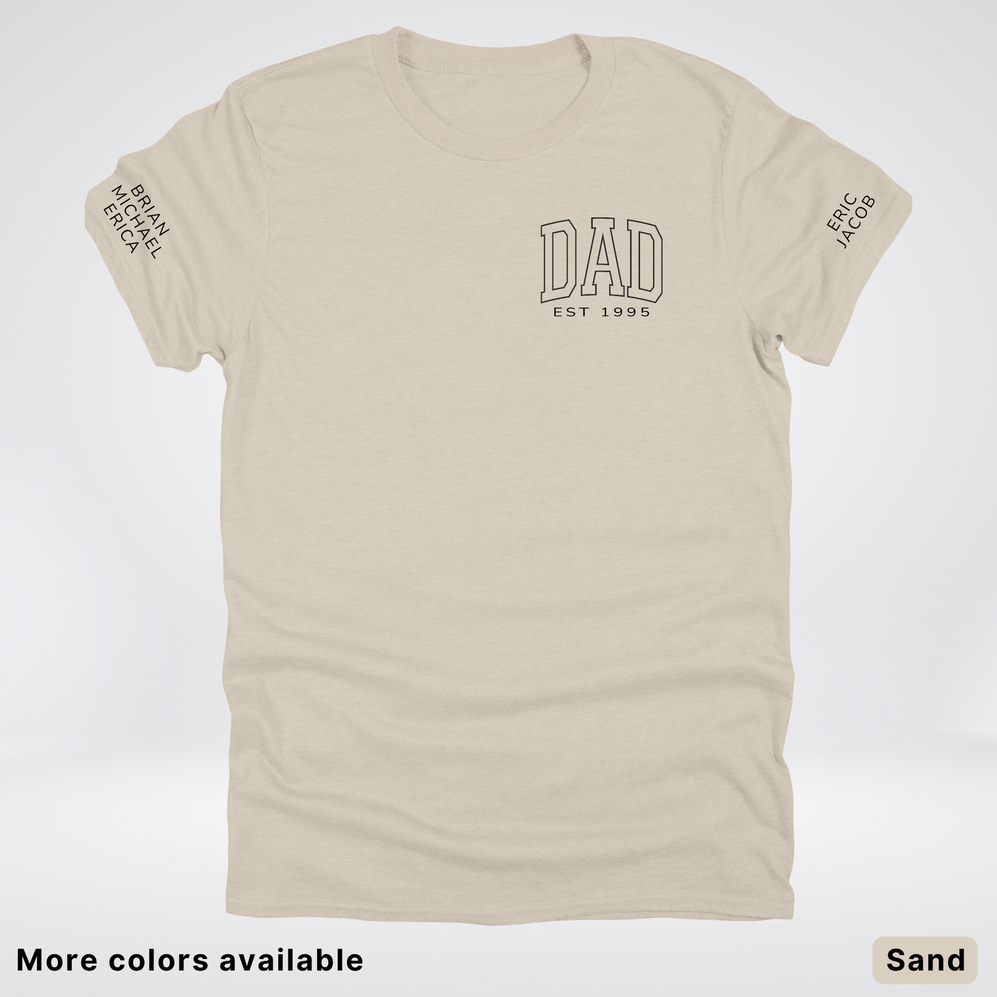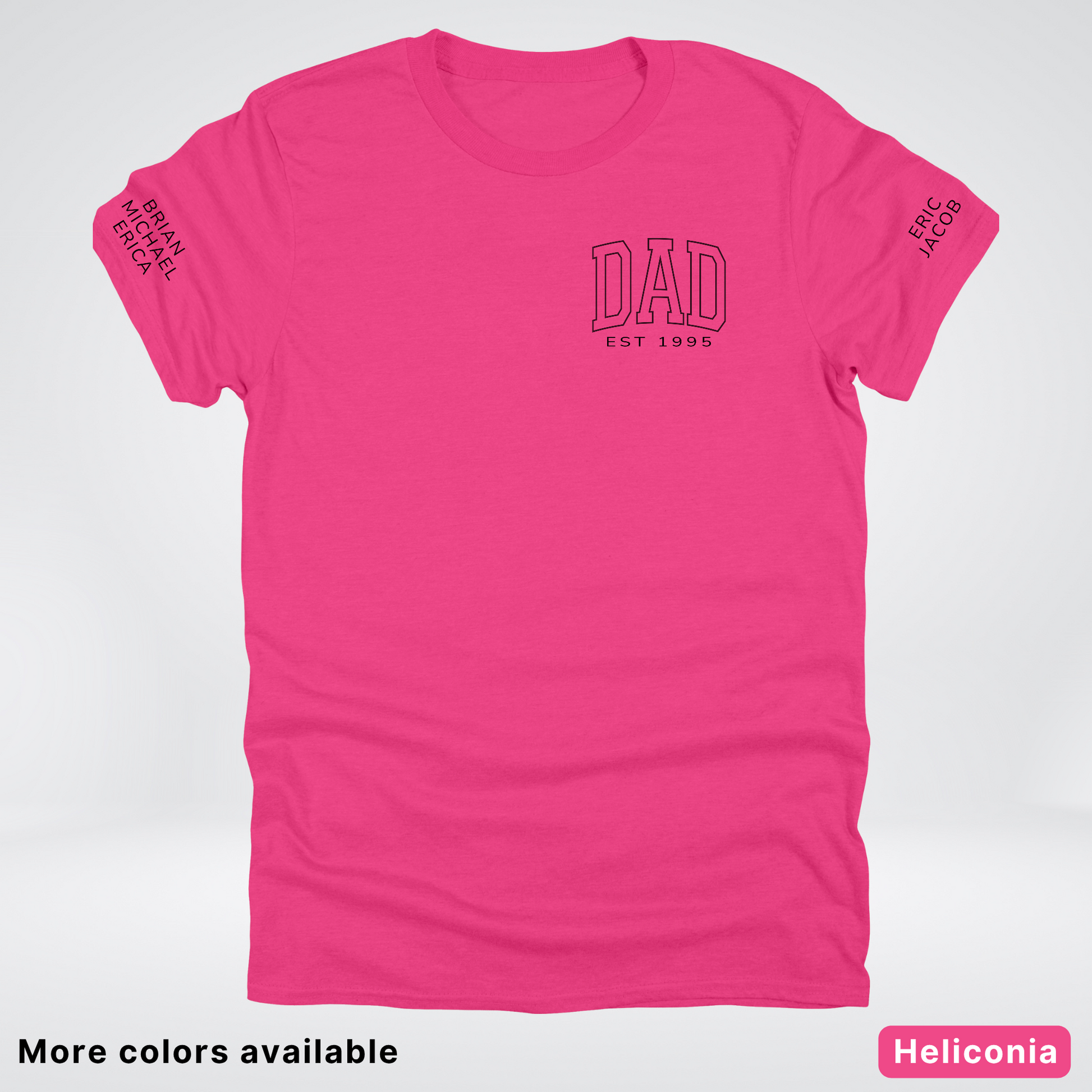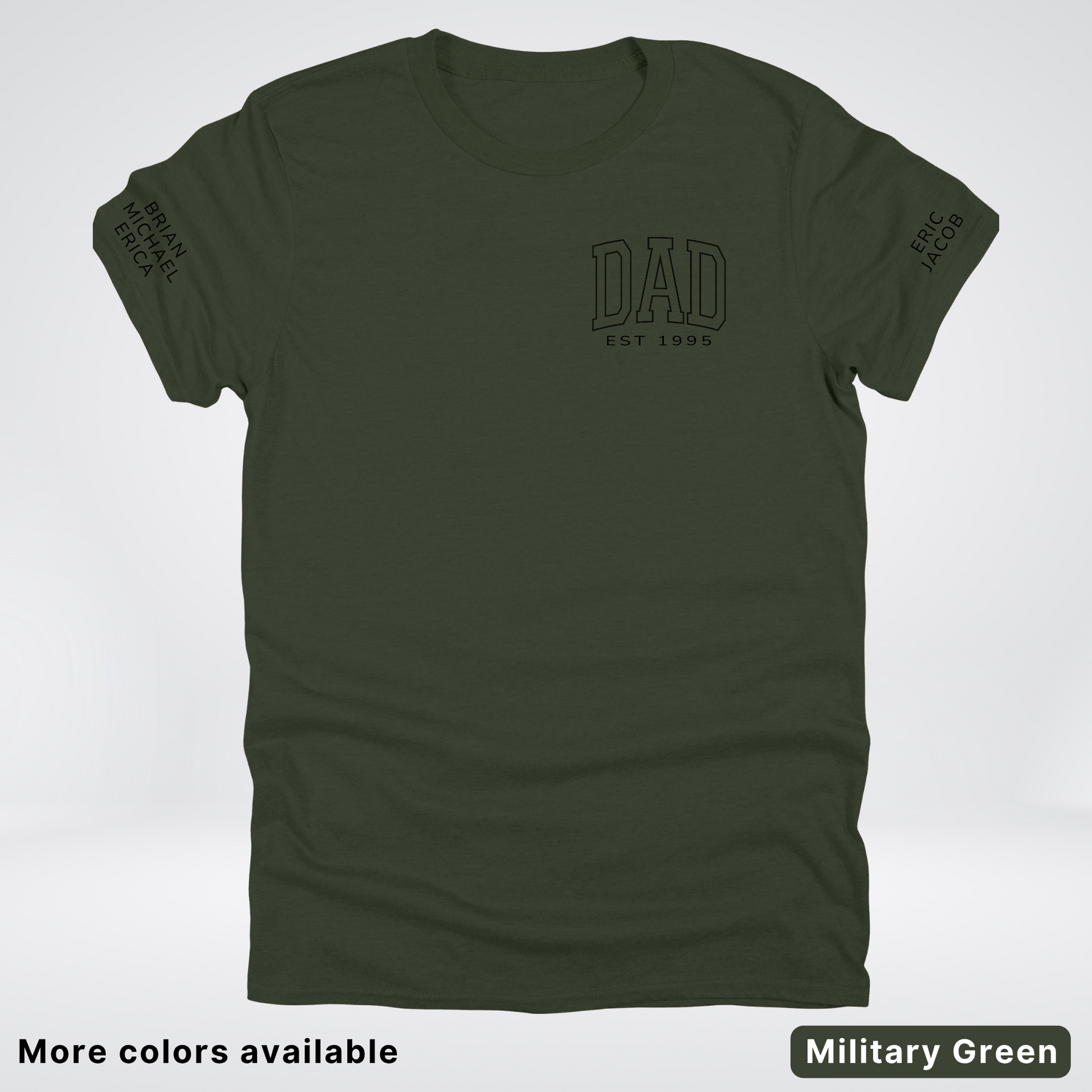 Custom Dad EST Year and Left And Right Sleeve Name - Black Design – Father’s Day T-Shirt