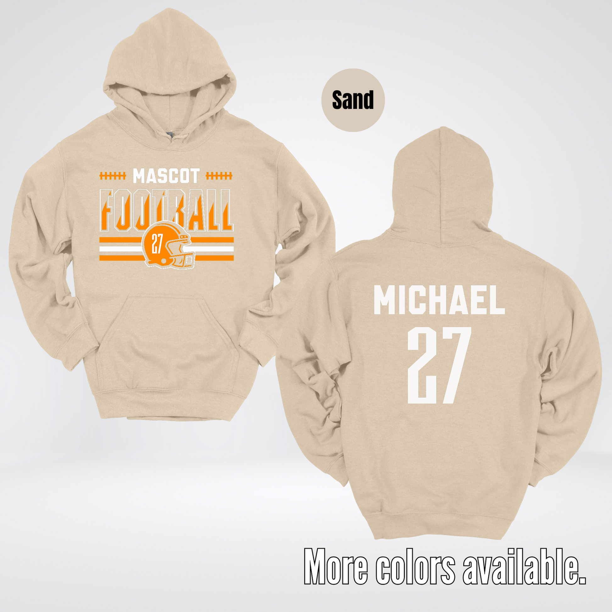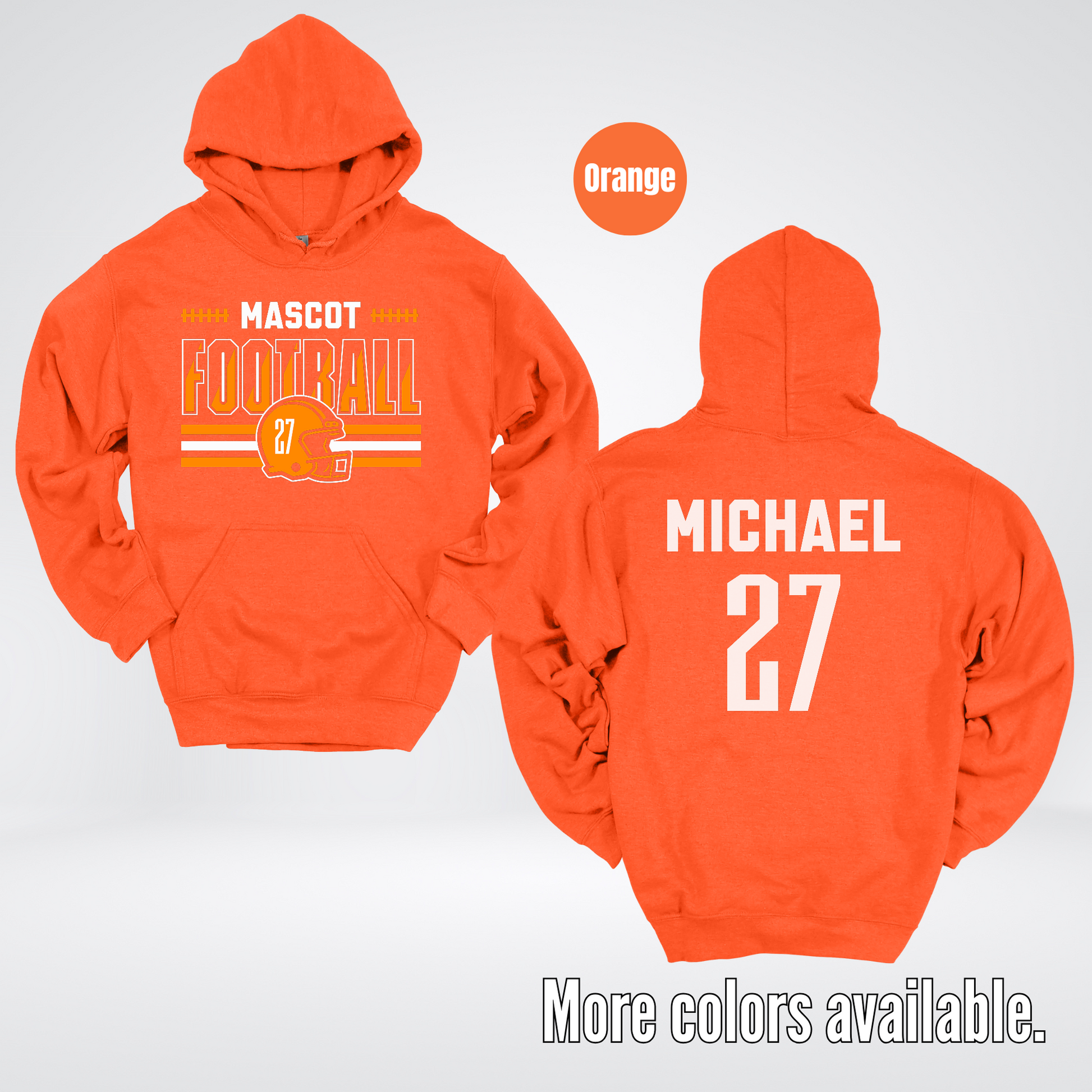 Show your team spirit with this vibrant orange hoodie featuring your custom mascot, number, and name alongside a bold football design. Perfect for game day or casual wear, it combines comfort with personalized flair to keep you cheering in style. Whether tailgating or relaxing, this hoodie makes you part of the winning team!