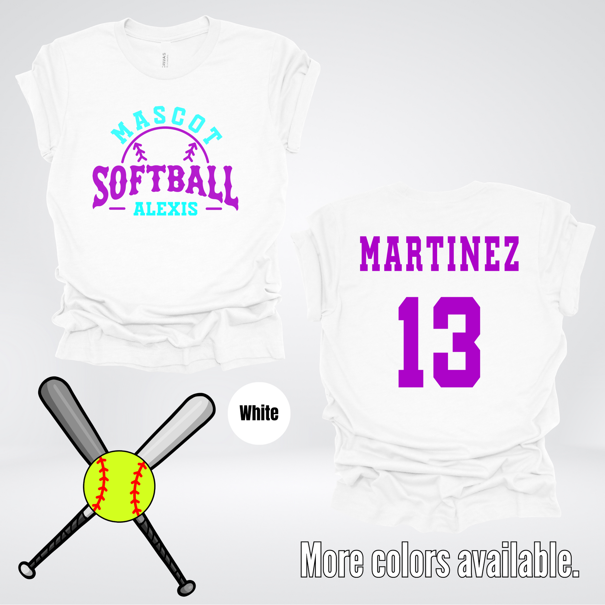 Custom Mascot, Number, First Name, & Last Name – Teal & Purple - Softball Design 01 T-Shirt