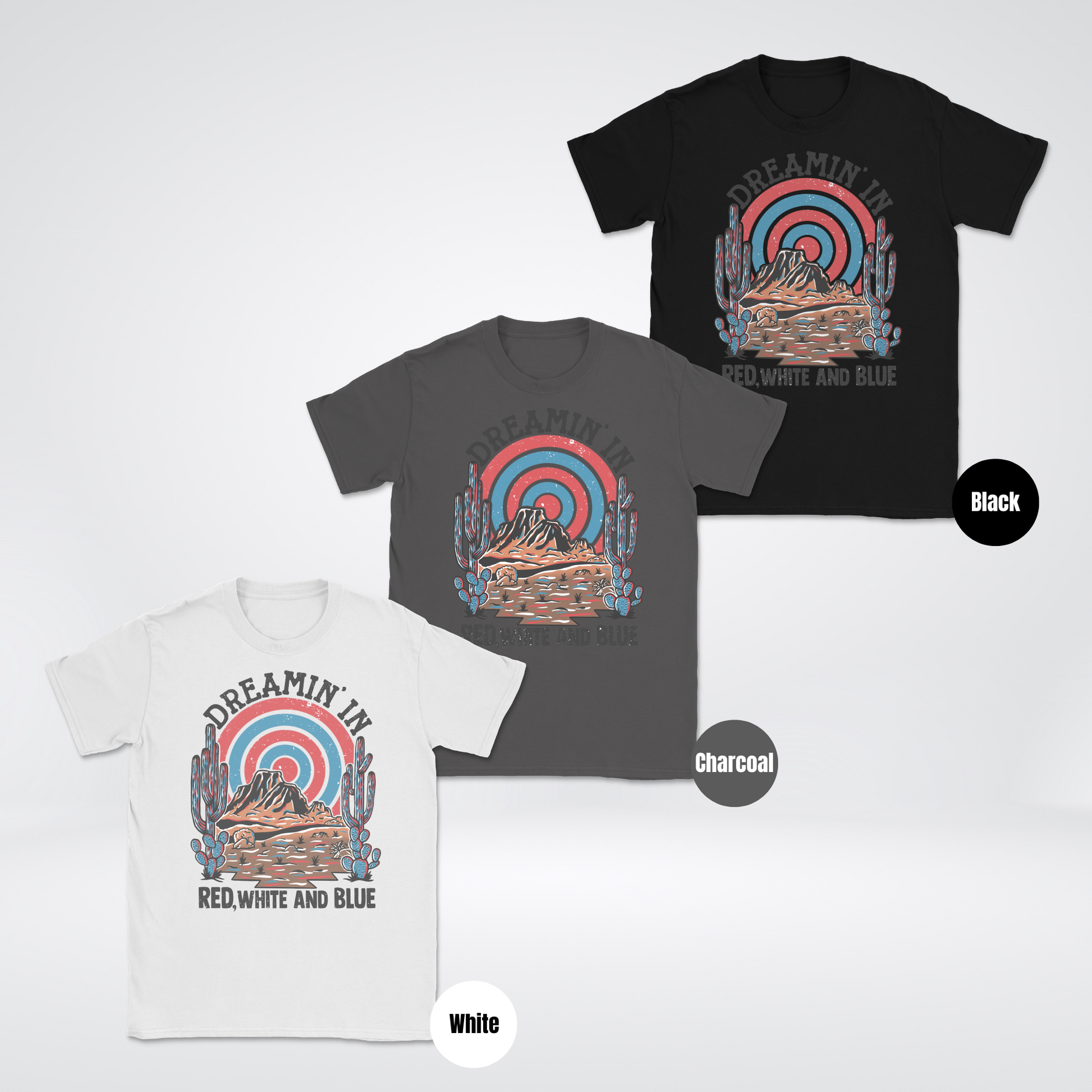 Unleash your patriotic spirit with our Dreamin In Red White And Blue Unisex Softstyle T-Shirt. Made with soft and comfortable material, this t-shirt is perfect for showing off your love for America. Let your style speak for itself with this unique and playful design. (Get your 'Merica on!)