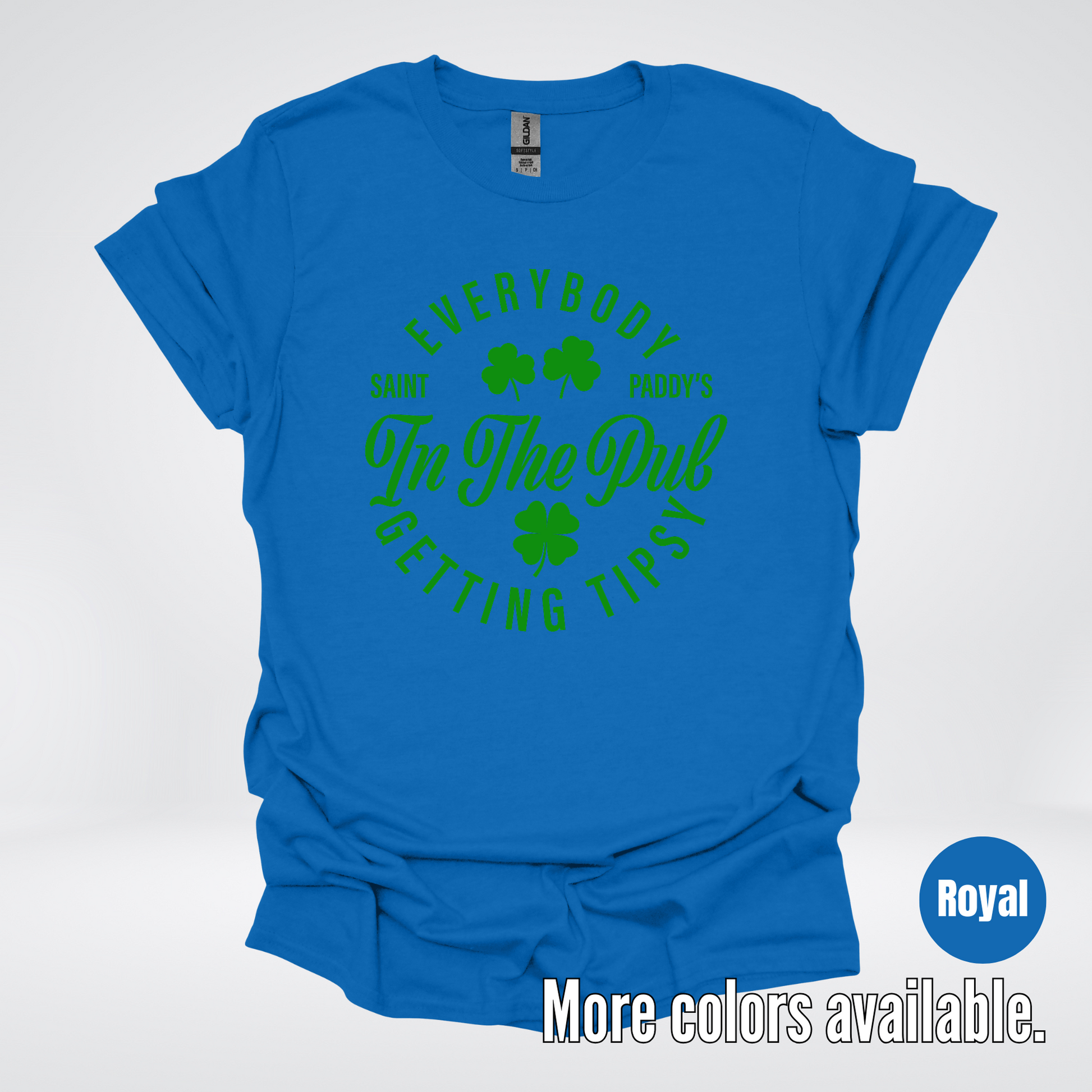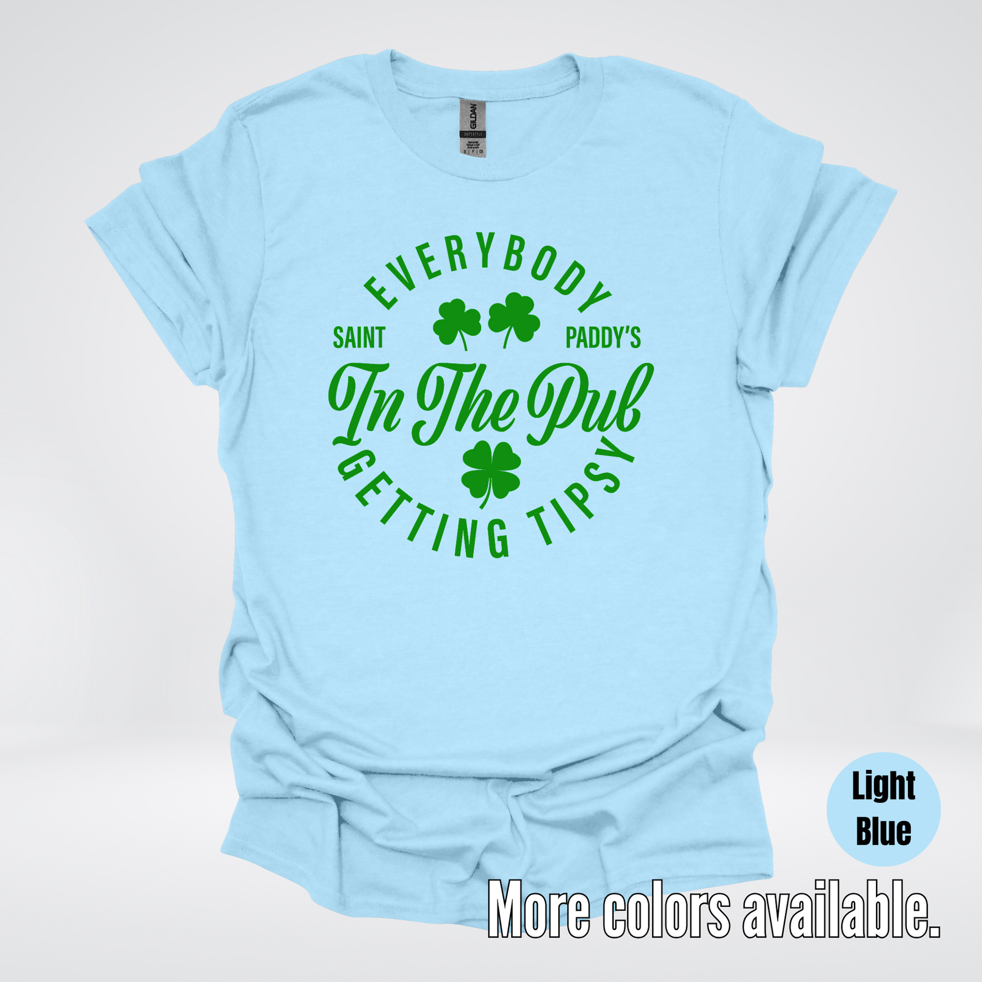 Toast to St. Patrick's Day with this playful and quirky t-shirt! Featuring the phrase "Everybody In The Pub Gettin' Tipsy" on a green background, this shirt is the perfect way to show off your fun-loving side. Cheers to a good time with this shirt on your back!