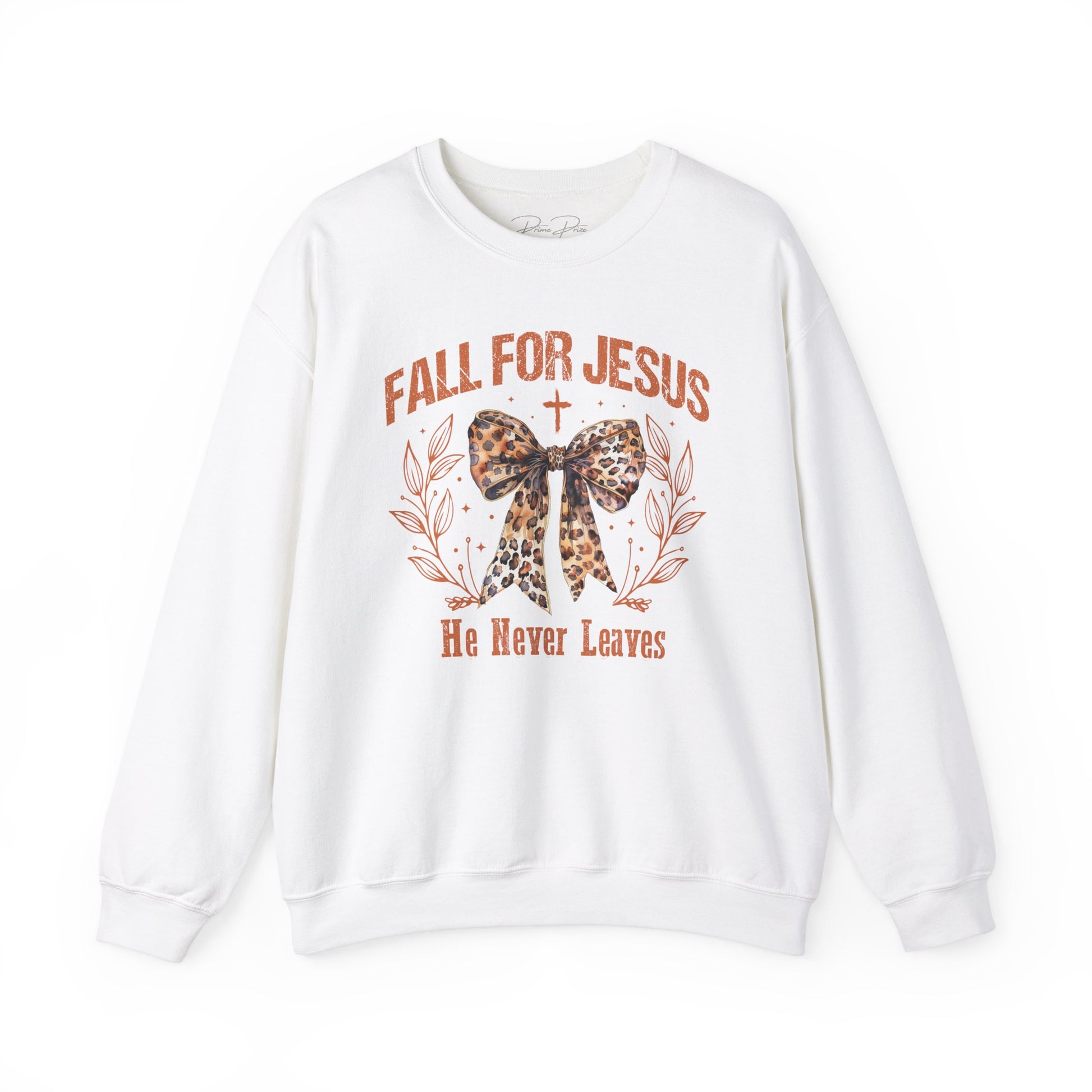 Fall For Jesus He Never Leaves Leopard Print Coquette Crewneck Sweatshirt