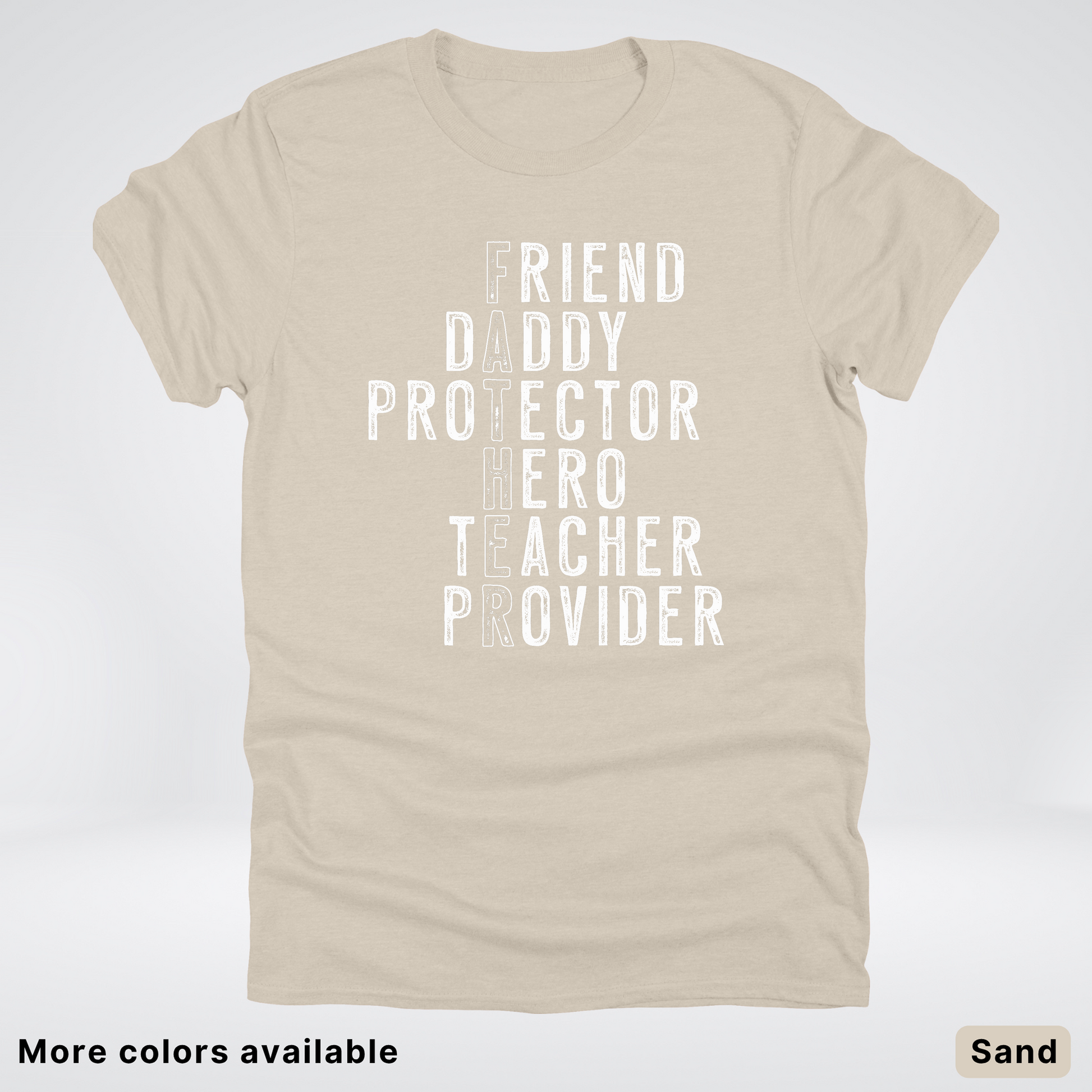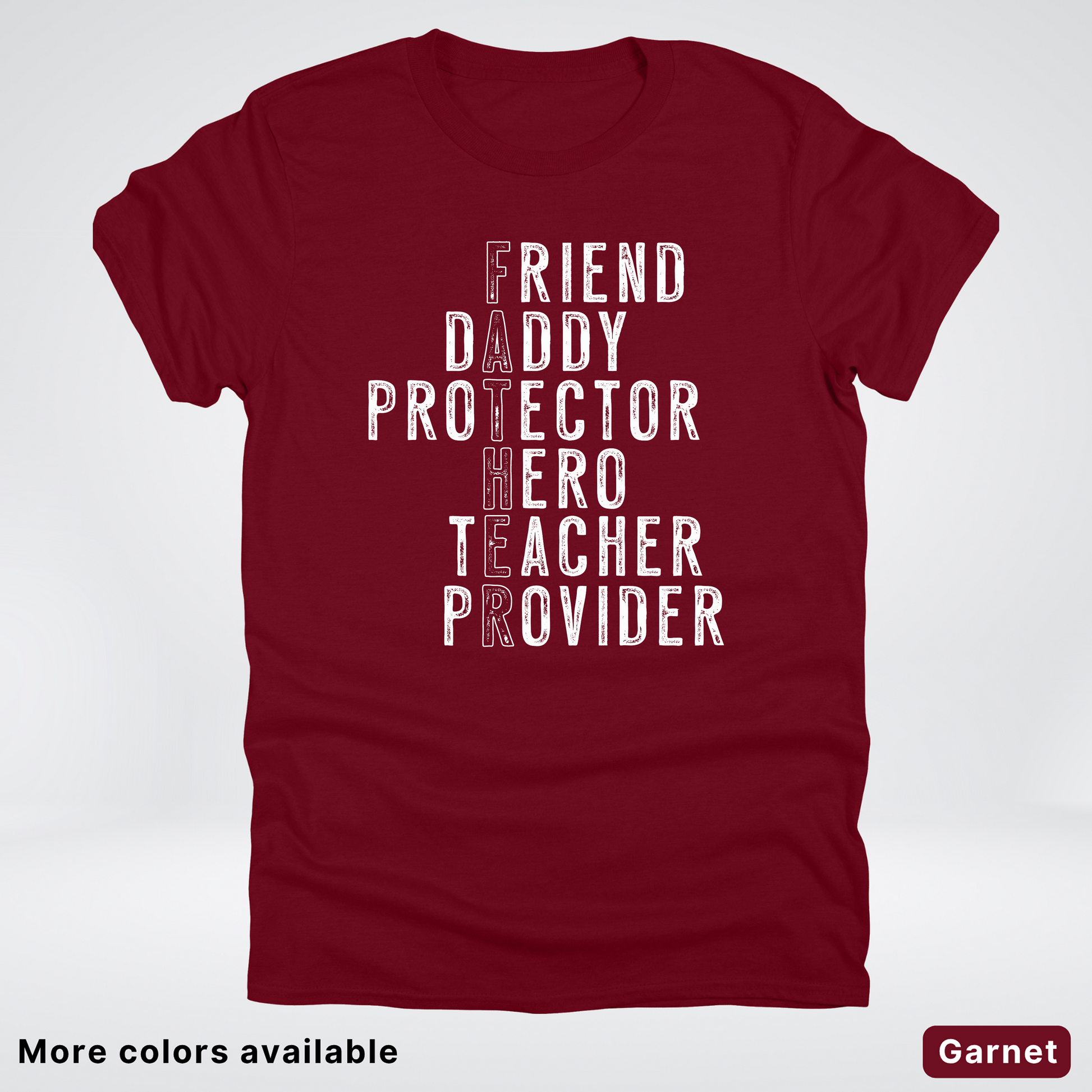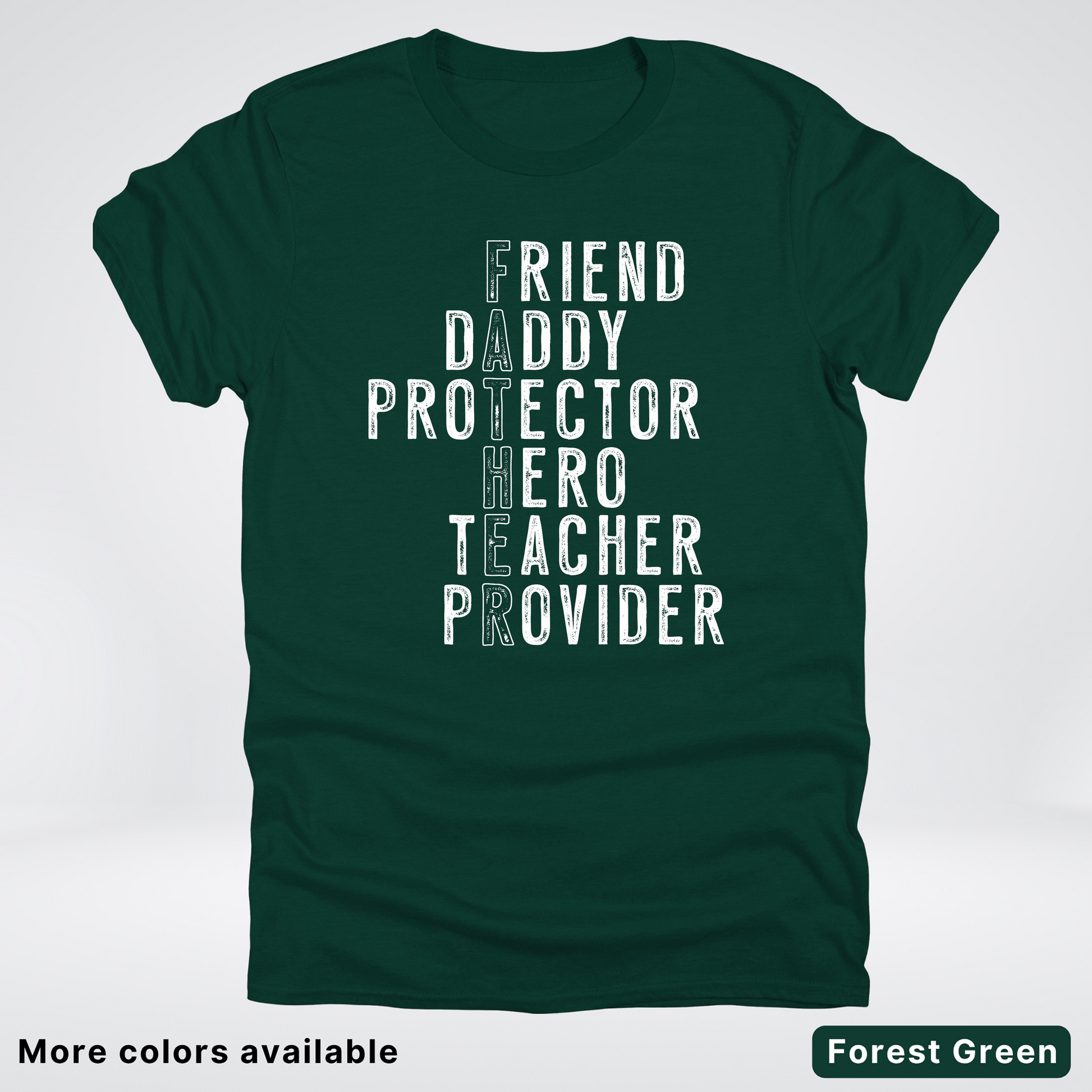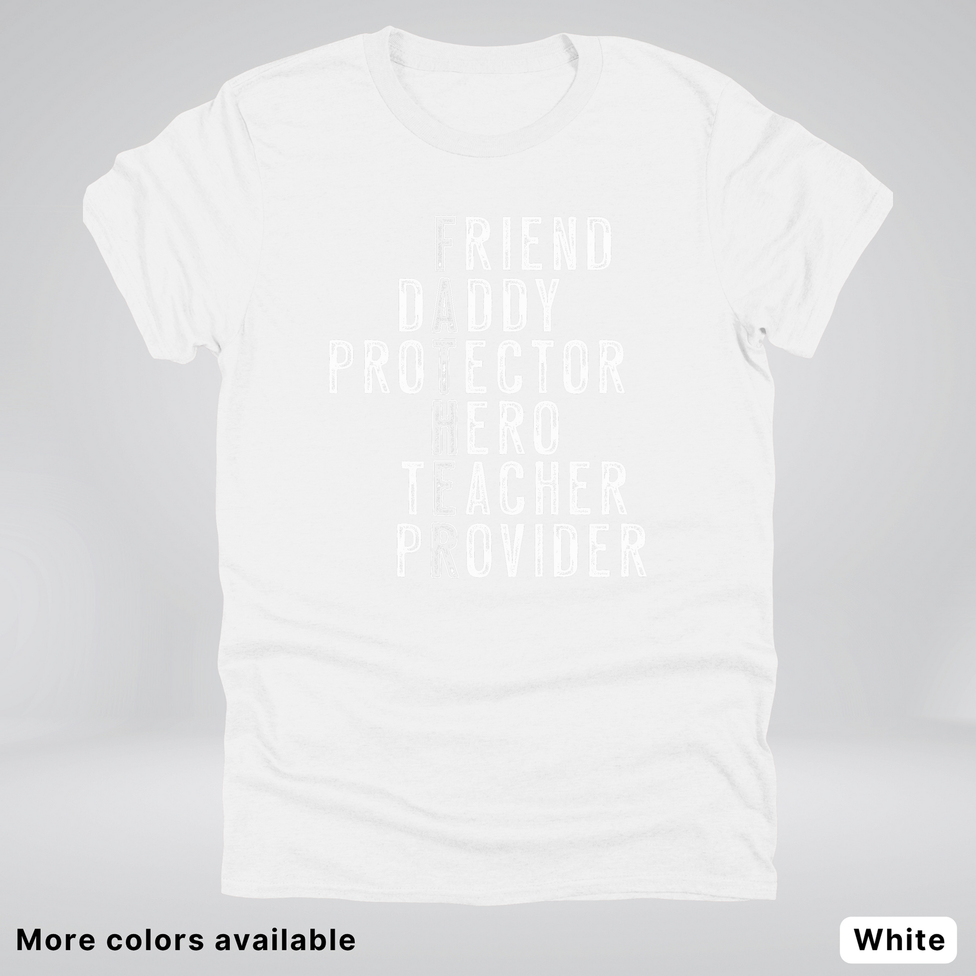 Celebrate the superhero in your life with our Father Crossword T-Shirt! This playful design cleverly weaves together all the roles dad juggles daily - Friend, Daddy, Protector, Hero, Teacher, and Provider. The crisp white design pops against the shirt, making it the perfect way to show your appreciation this Father's Day. Dad will smile every time he wears this thoughtful reminder of all he means to you!