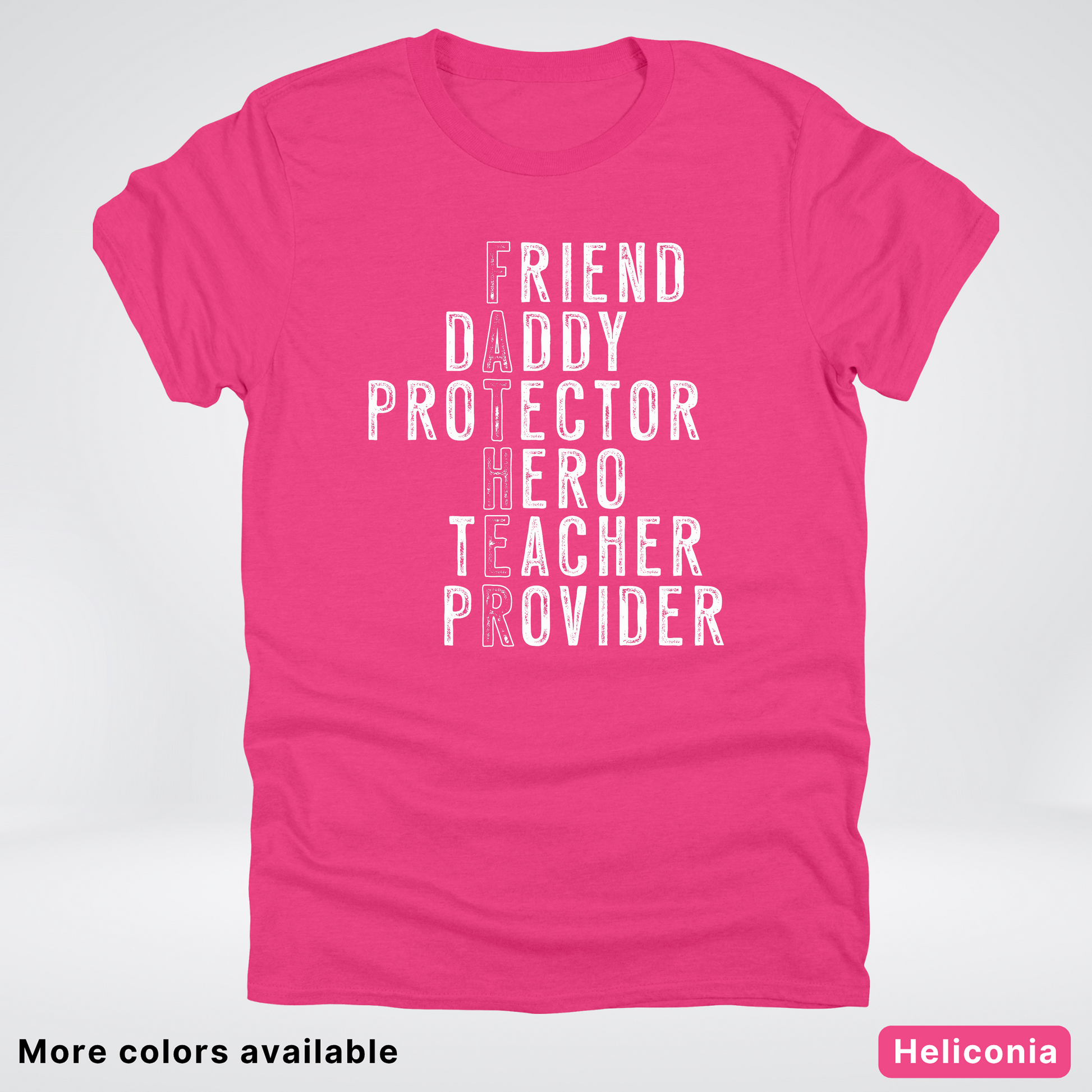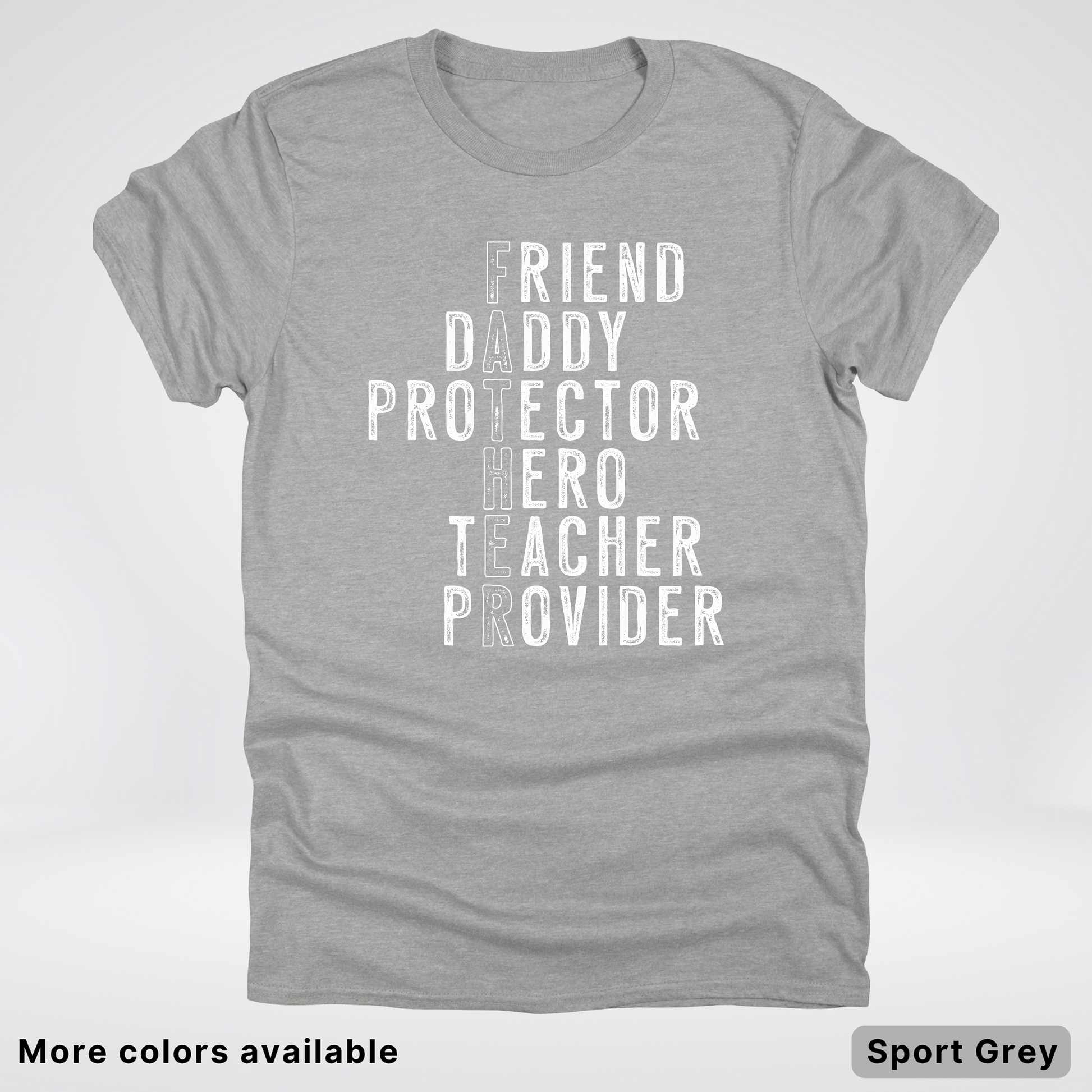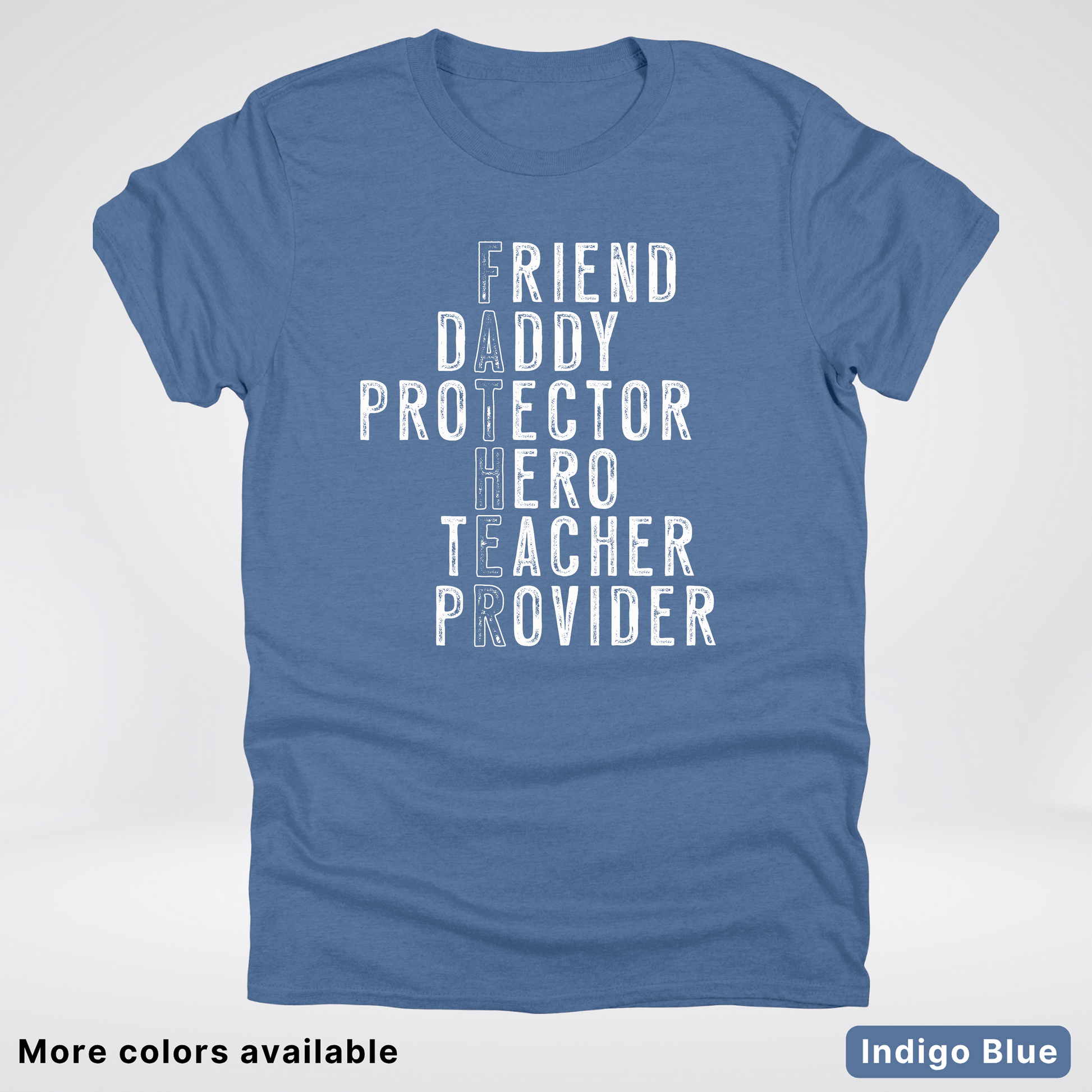 Celebrate the superhero in your life with our Father Crossword T-Shirt! This playful design cleverly weaves together all the roles dad juggles daily - Friend, Daddy, Protector, Hero, Teacher, and Provider. The crisp white design pops against the shirt, making it the perfect way to show your appreciation this Father's Day. Dad will smile every time he wears this thoughtful reminder of all he means to you!