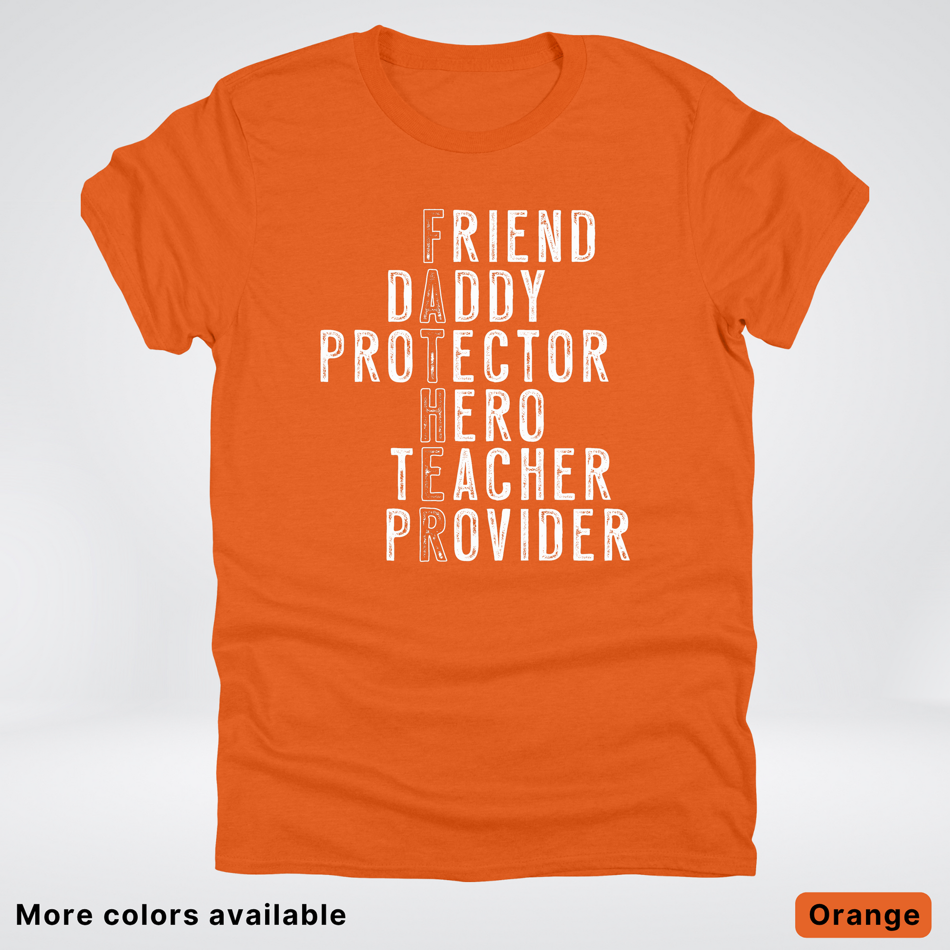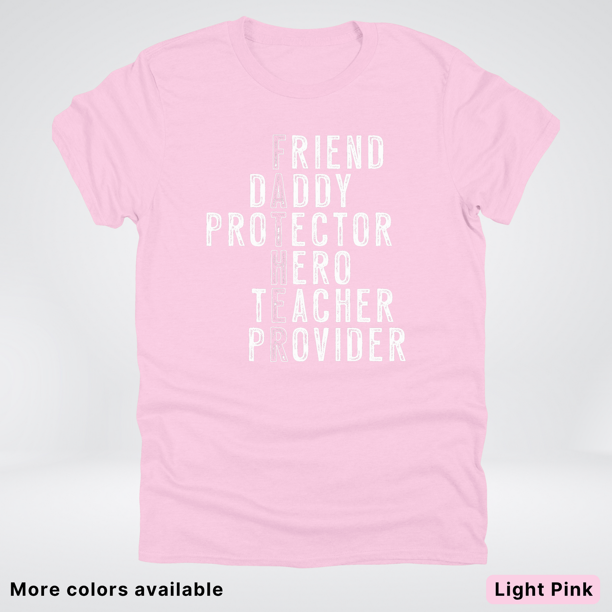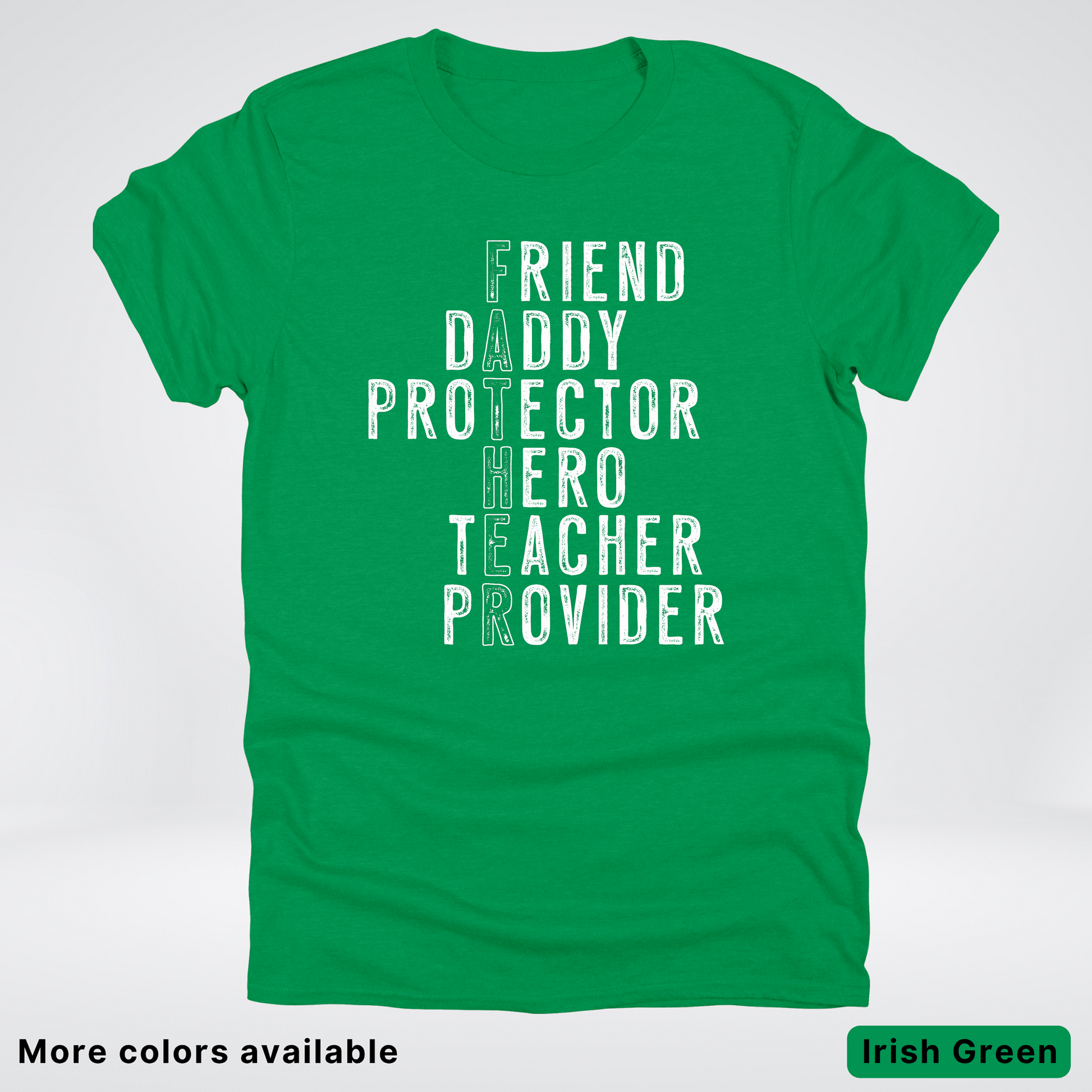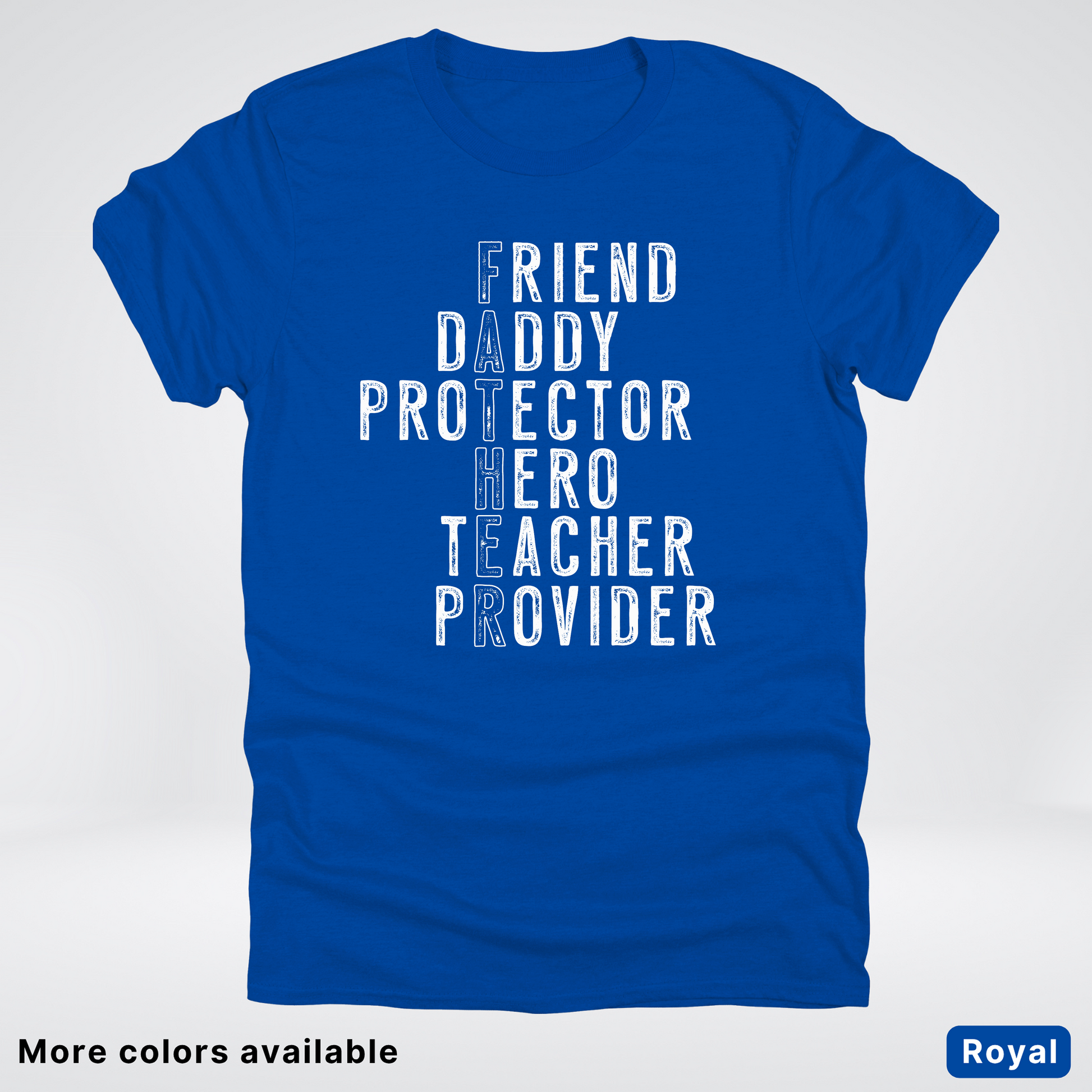 Celebrate the superhero in your life with our Father Crossword T-Shirt! This playful design cleverly weaves together all the roles dad juggles daily - Friend, Daddy, Protector, Hero, Teacher, and Provider. The crisp white design pops against the shirt, making it the perfect way to show your appreciation this Father's Day. Dad will smile every time he wears this thoughtful reminder of all he means to you!