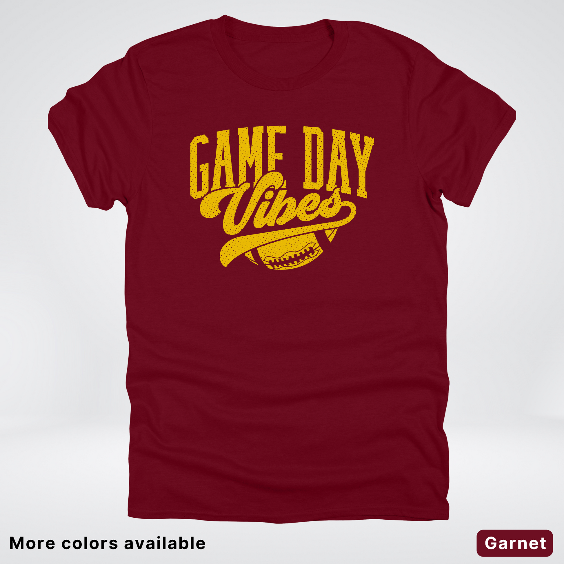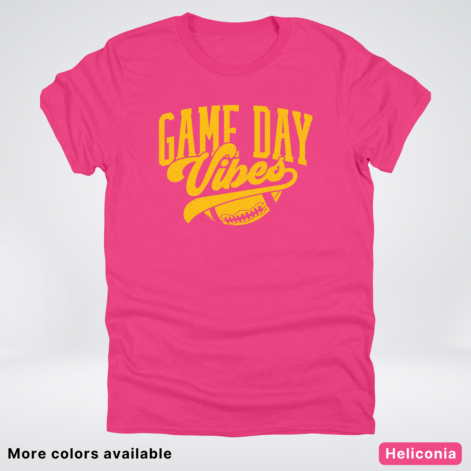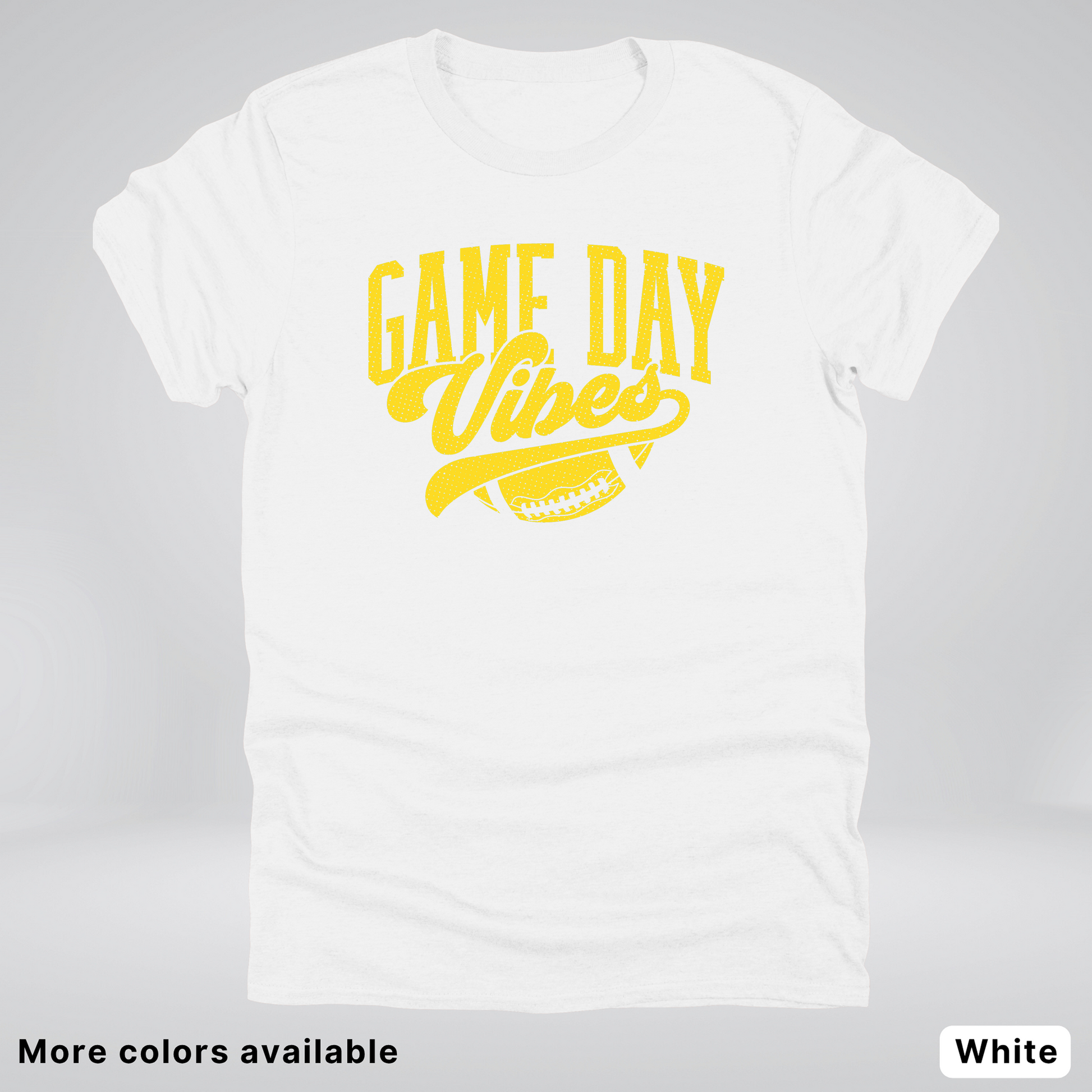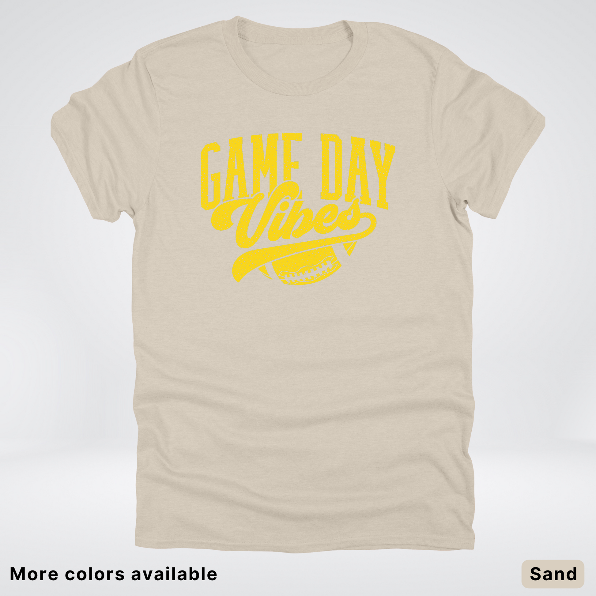 Shine bright on game day with the Game Day Vibes Football T-Shirt in bold gold. This playful tee adds a splash of fun and flair to your fan gear, keeping you comfy while you root for your team. Perfect for turning heads and celebrating every touchdown in style!