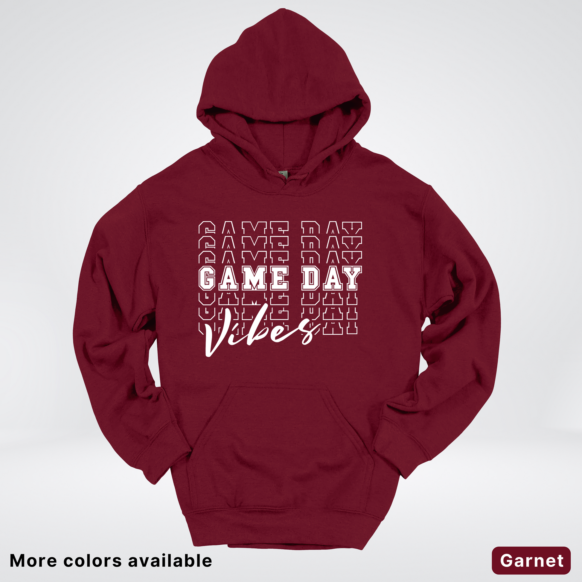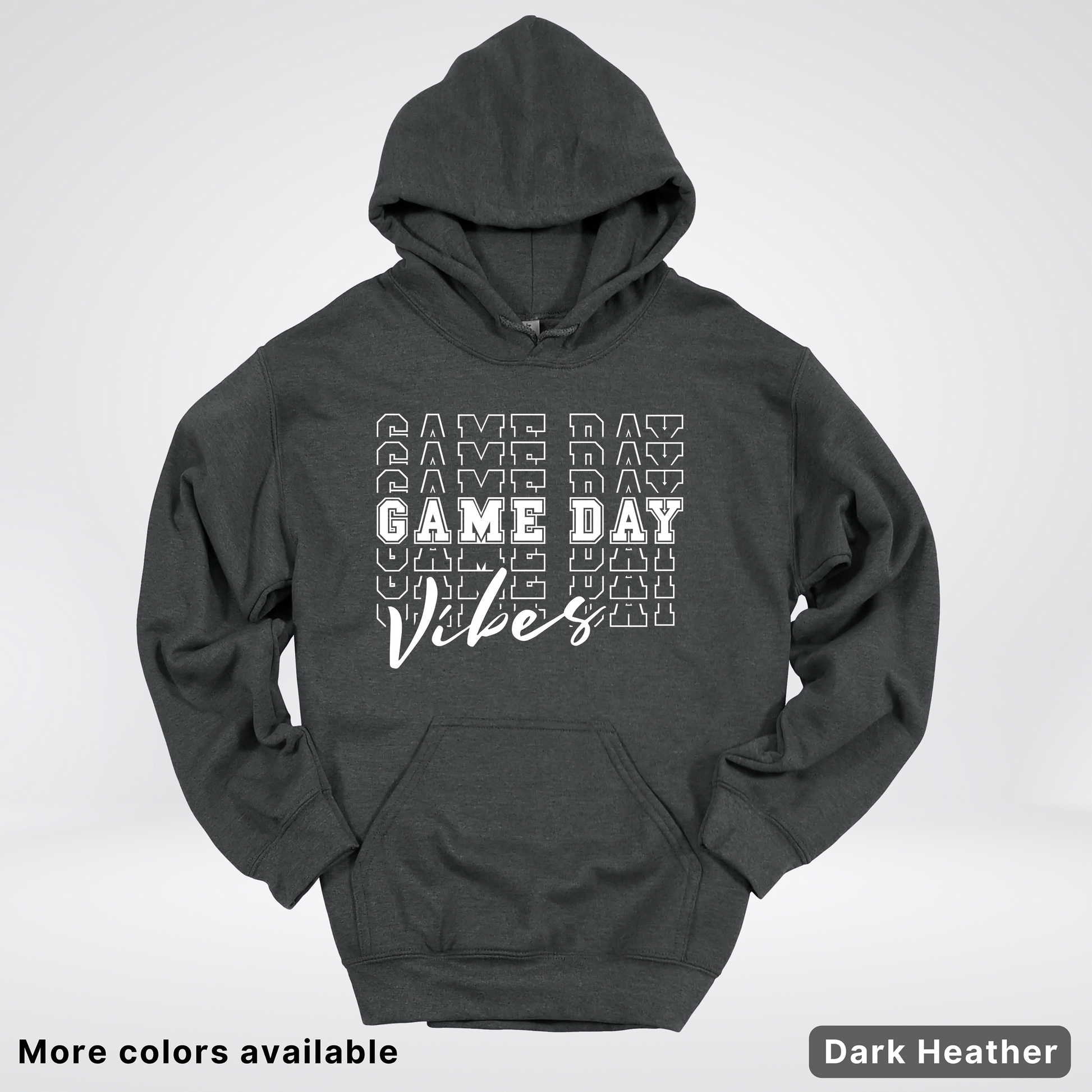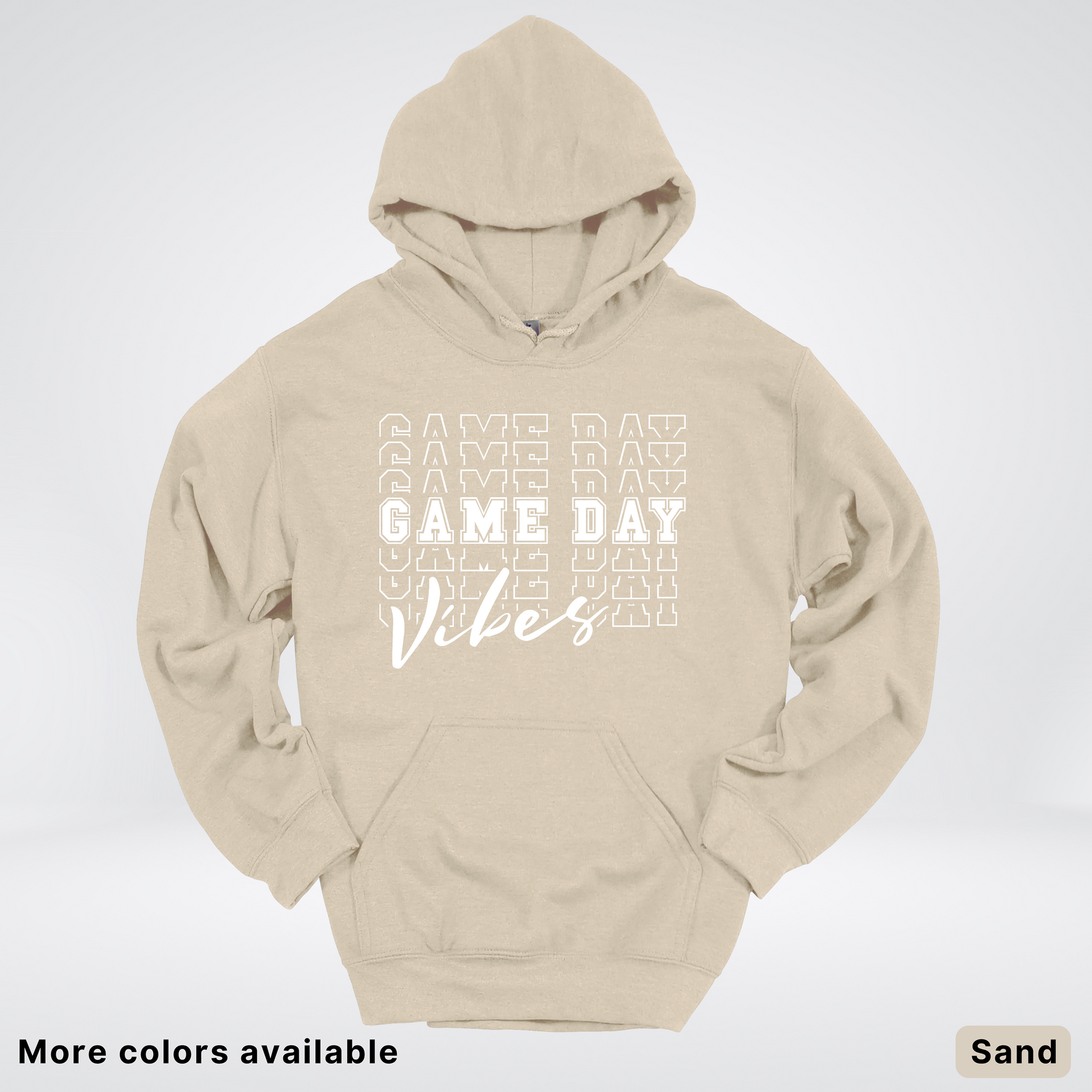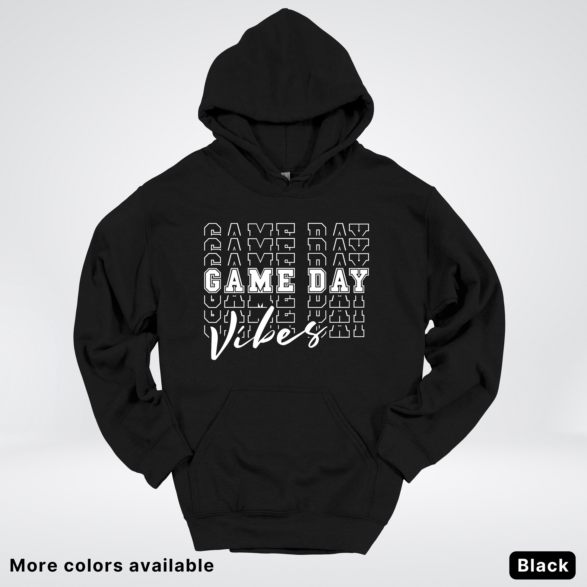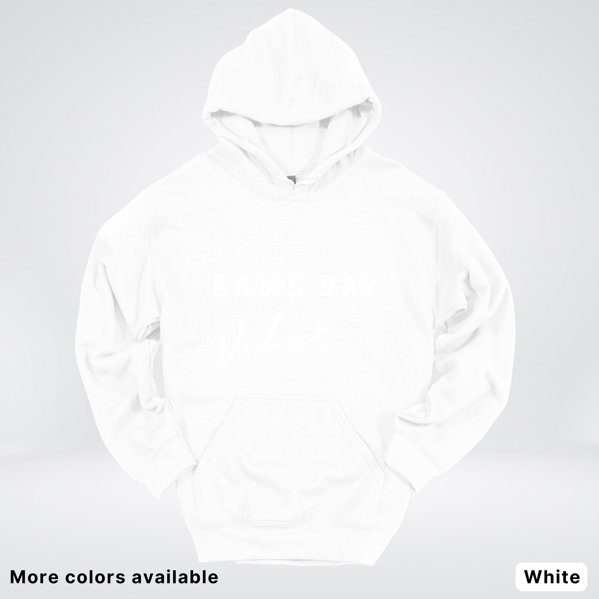 Game Day Vibes Stacked - White Design - Hoodie Throw on this playful hoodie and let your team spirit shine! Featuring a bold, stacked "Game Day Vibes" design in crisp white, it's the perfect way to show your enthusiasm whether you're cheering from the stands or hanging with fellow fans. Cozy, comfortable, and conversation-starting—this hoodie brings the energy and style to every game day gathering.