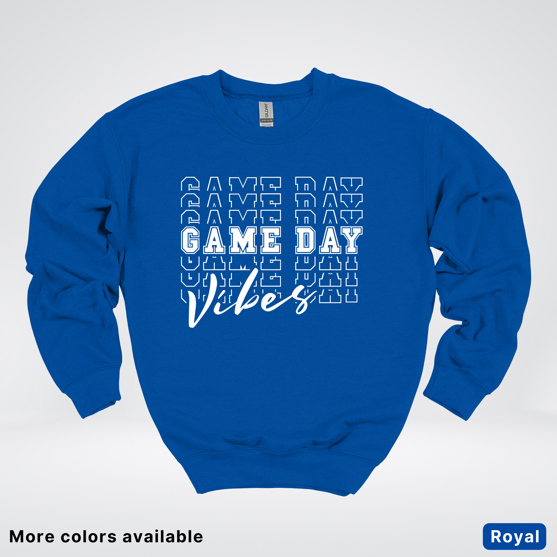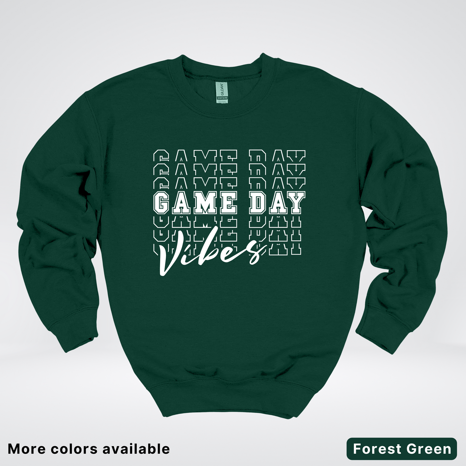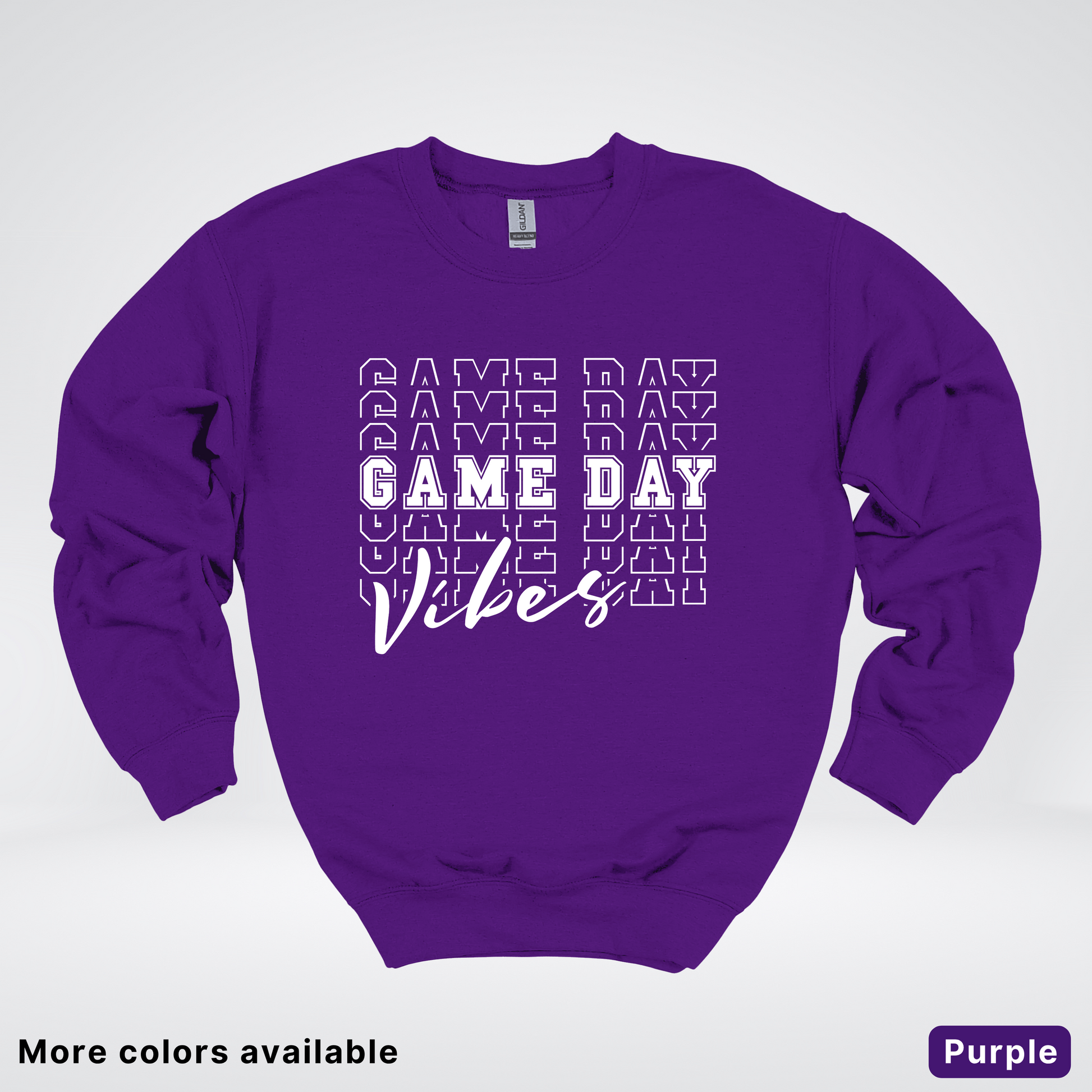 Game Day Vibes Stacked - White Design - Sweatshirt Throw on this cozy sweatshirt and let everyone know you're ready to cheer! Featuring a bold white stacked design that screams game day energy, this comfy layer is perfect for tailgates, watch parties, or just showing your team spirit year-round. Soft, warm, and undeniably fun—because the best fans look the part.