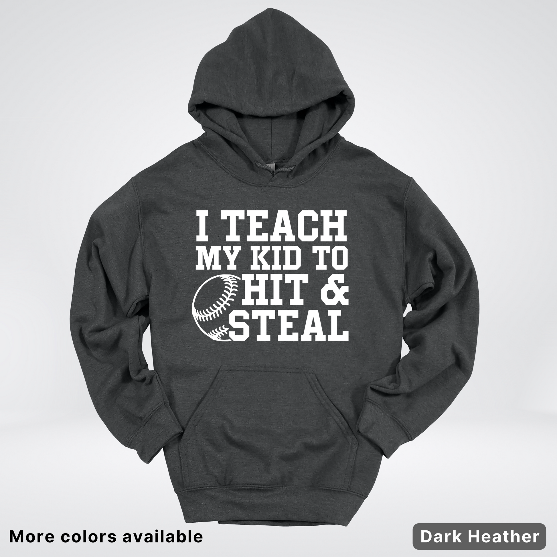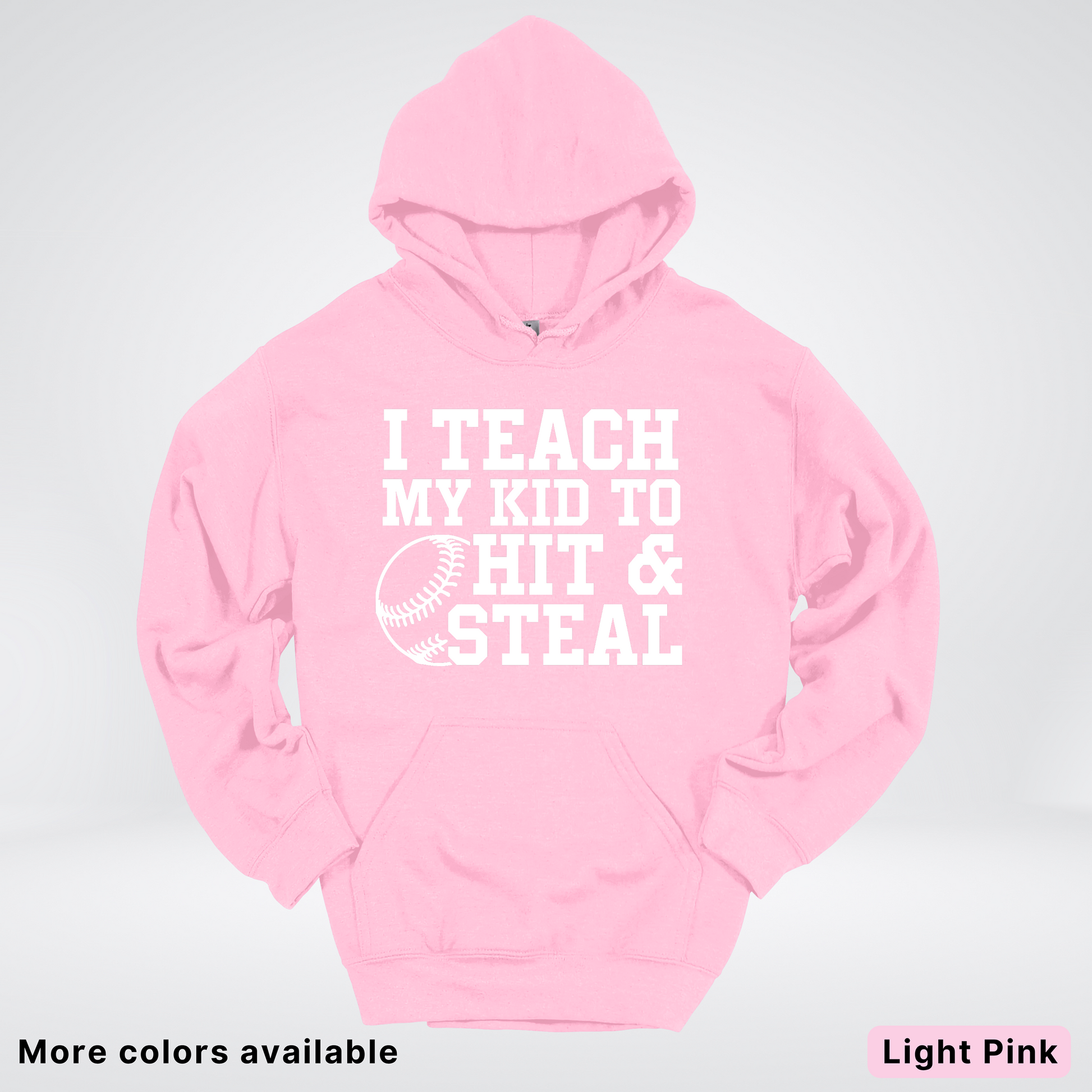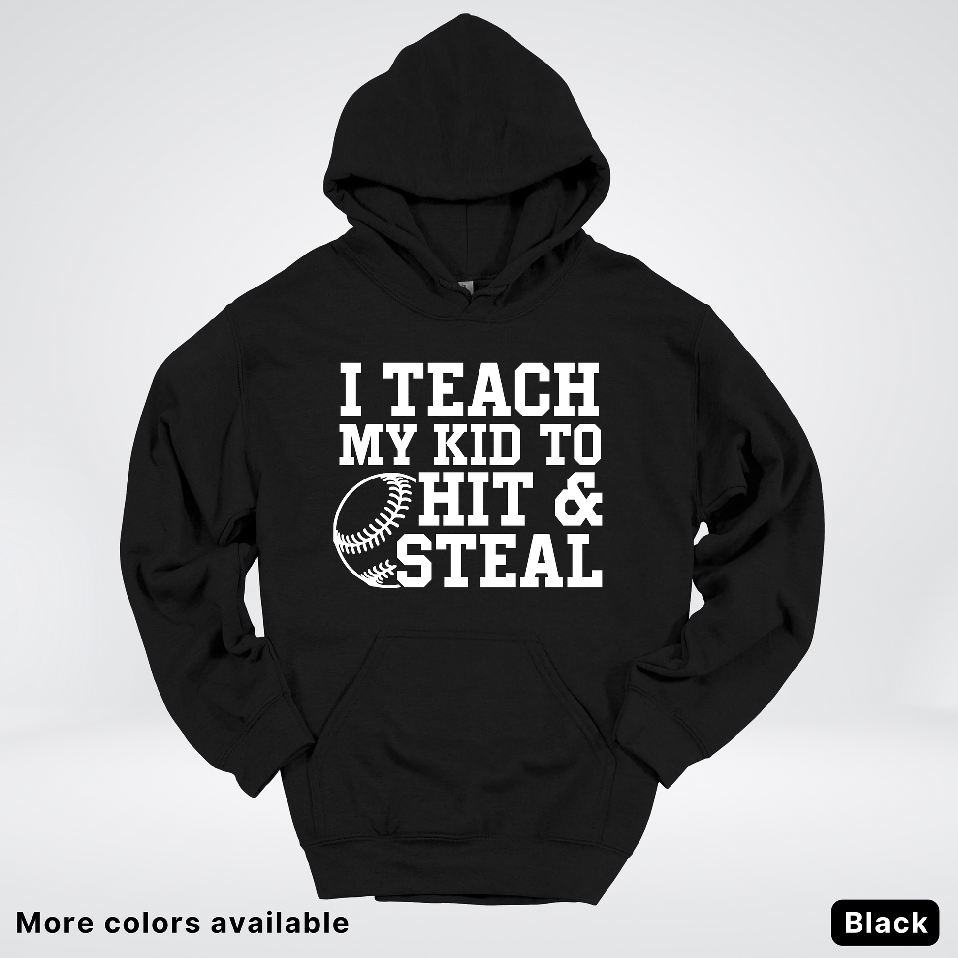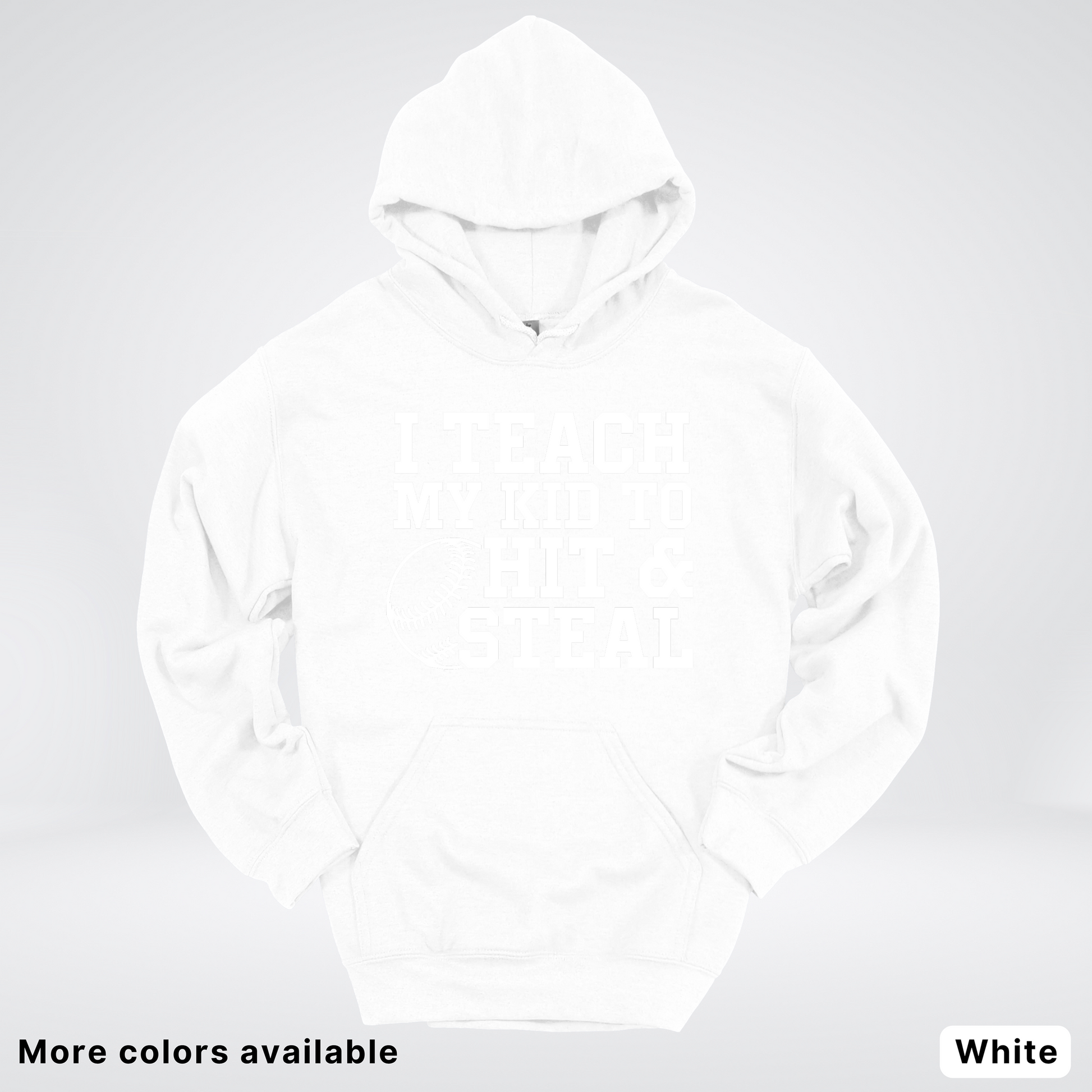 Stay warm and stylish in our "I Teach My Kids To Hit & Steal" hoodie. This comfortable and durable white design hoodie is perfect for sports games and casual outings. Show off your unique and fun parenting style while also staying cozy.