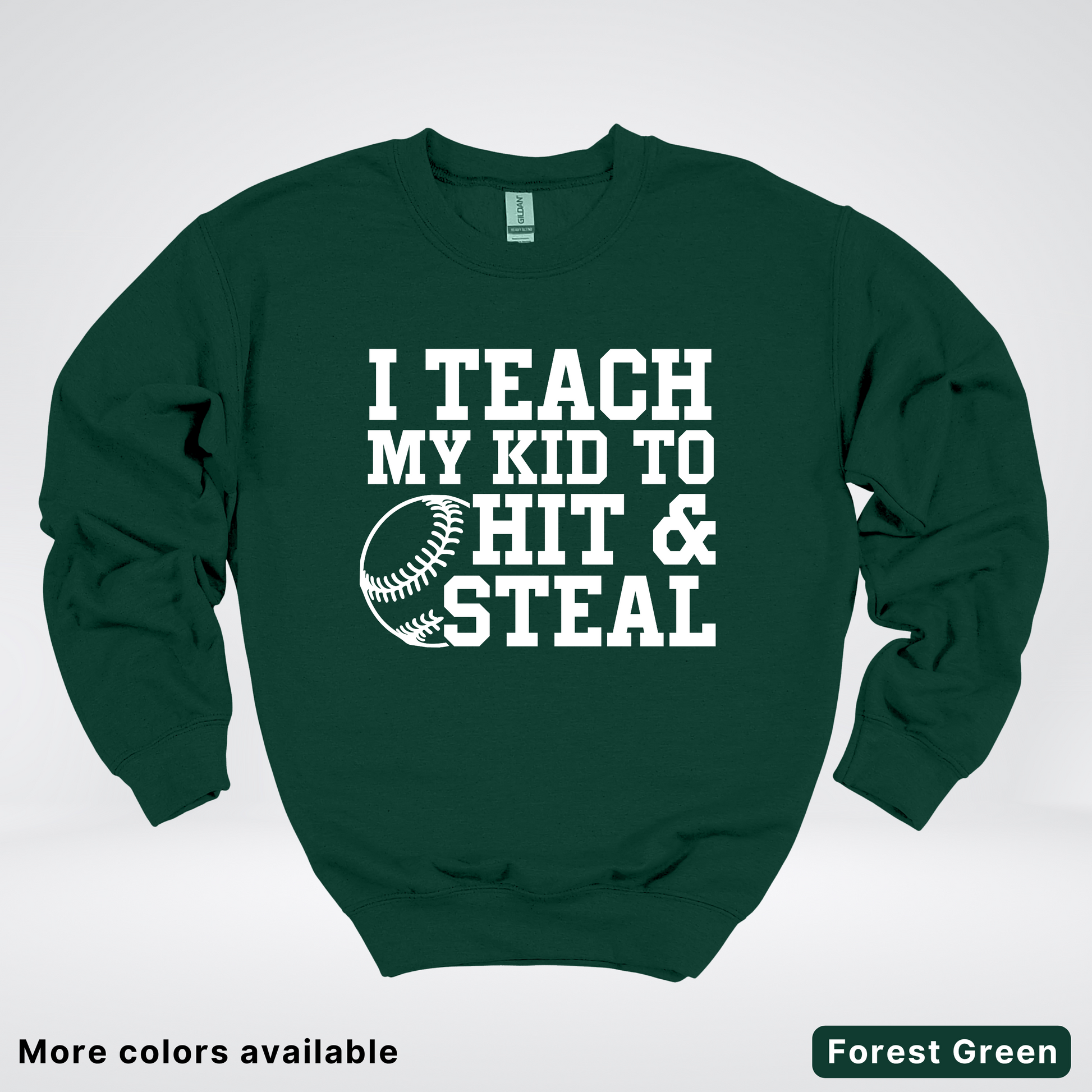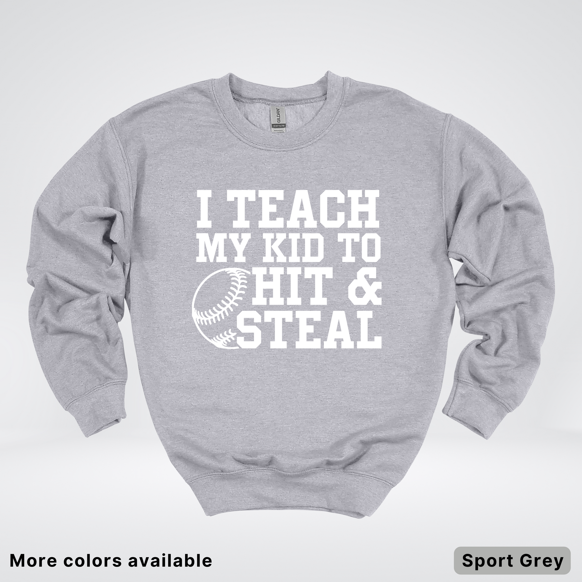 This white sweatshirt features the phrase "I Teach My Kids To Hit & Steal" in bold lettering. Show off your funny and playful side while staying warm and comfortable. Let everyone know you have a great sense of humor and aren't afraid to break the rules.