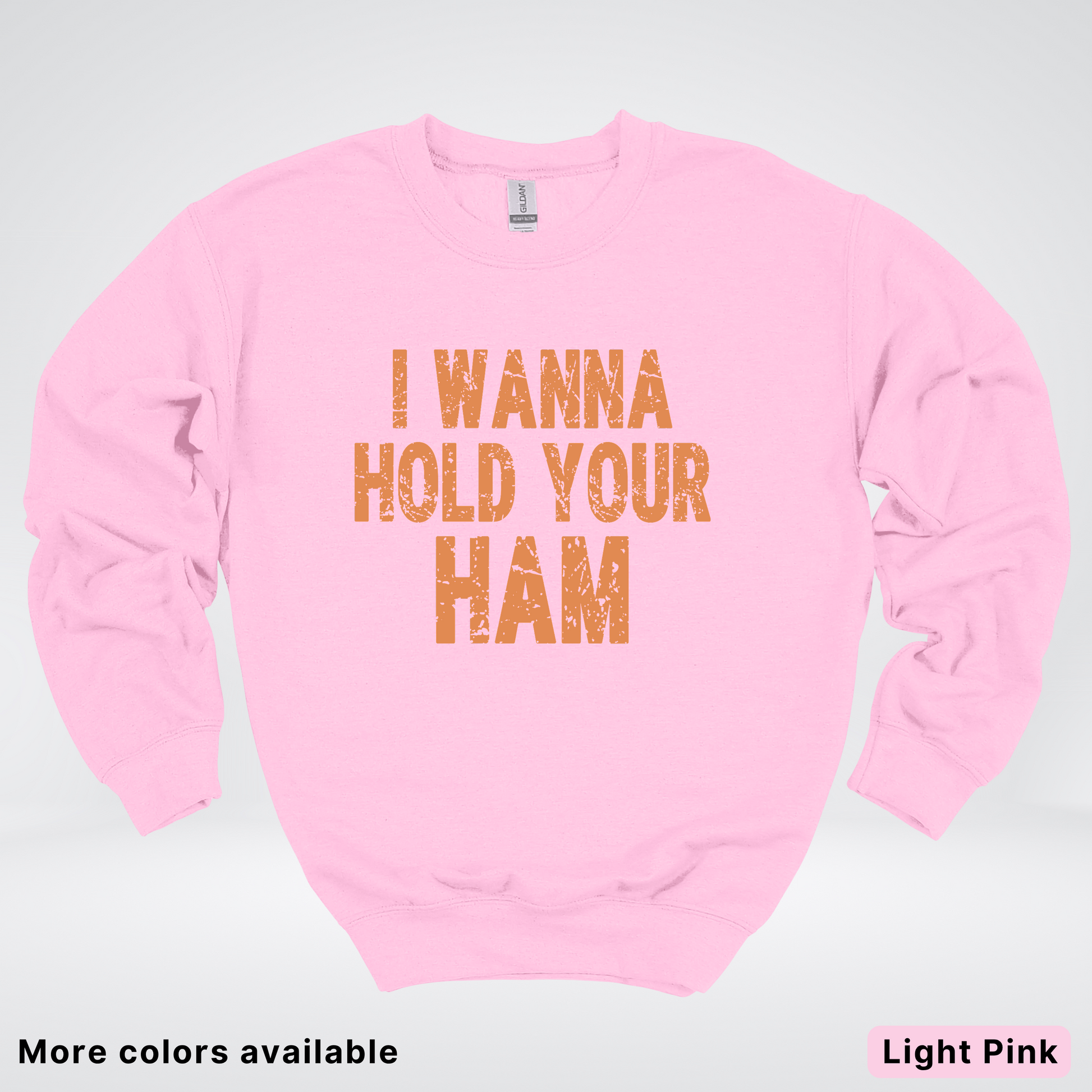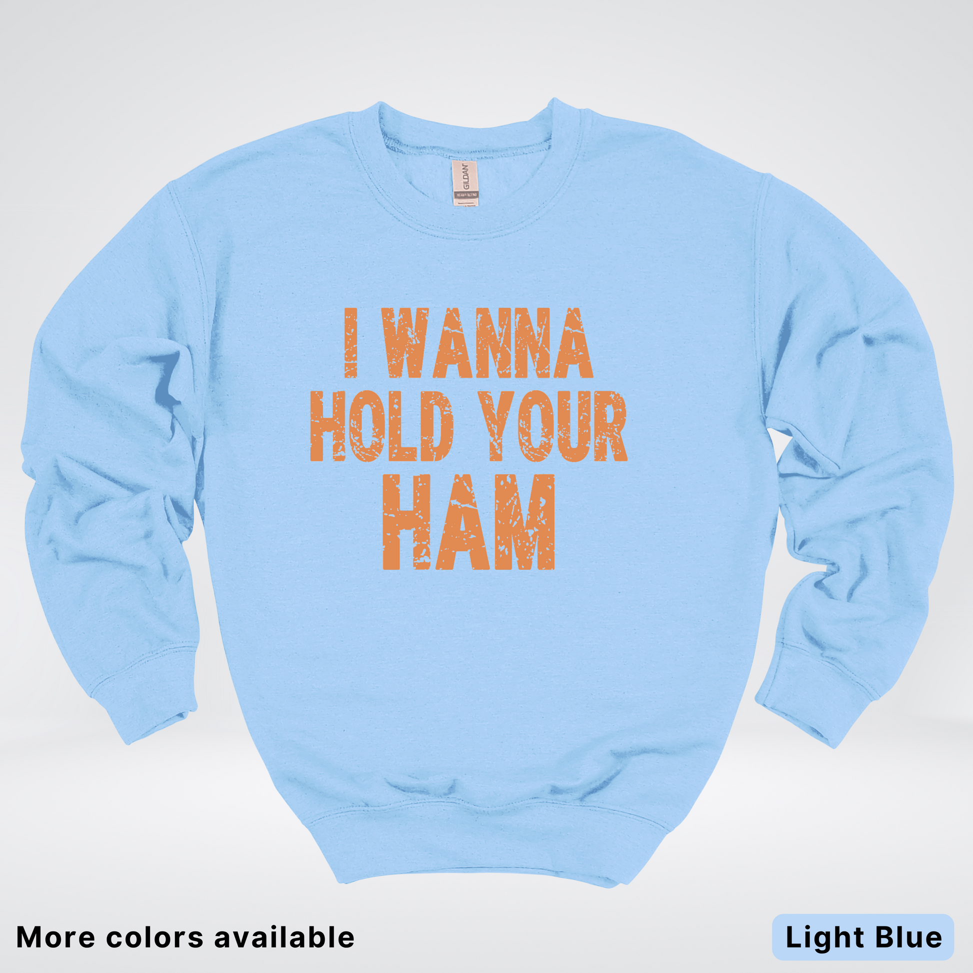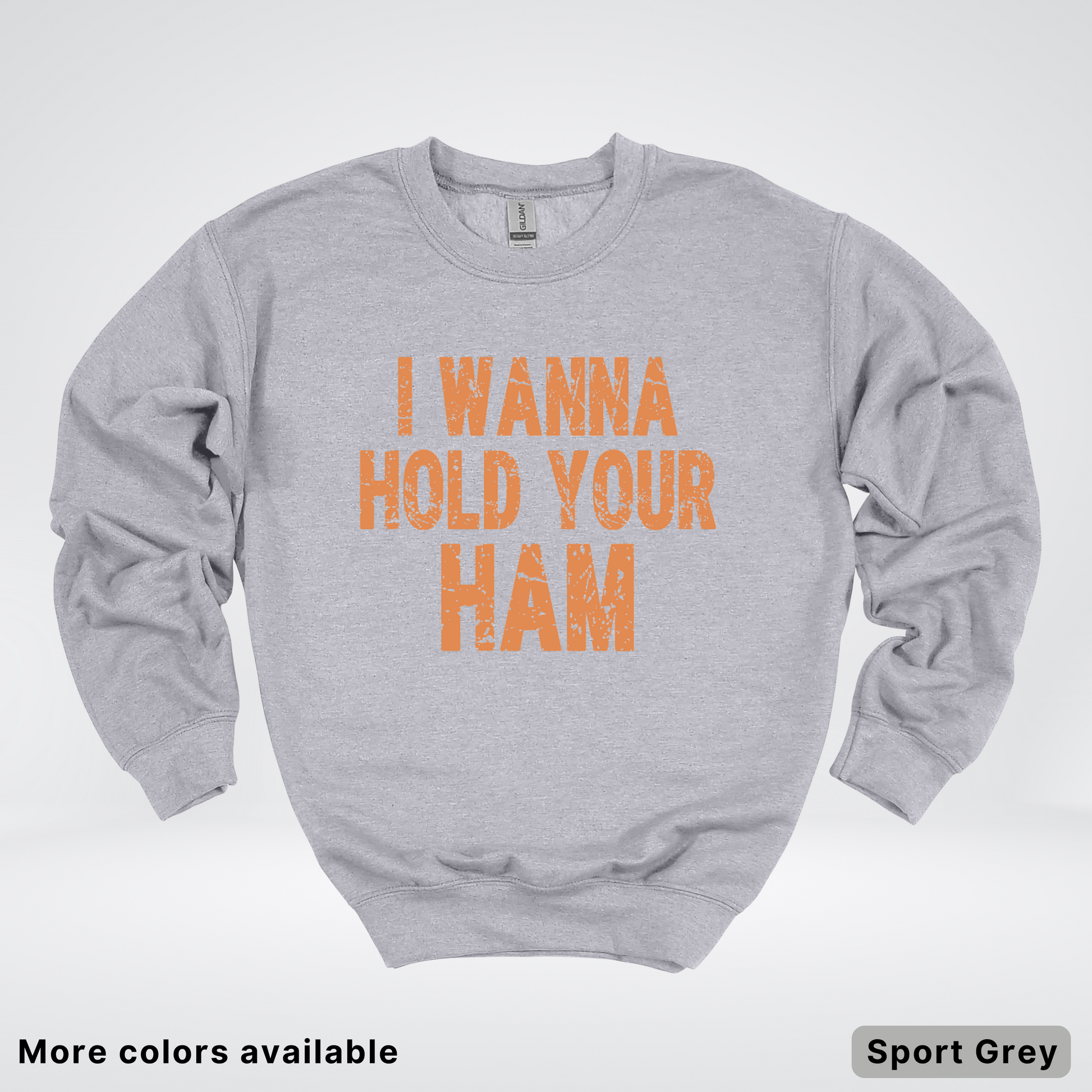 Wrap your arms around comfort with this playful sweatshirt that's sure to get a laugh. Featuring the cheeky phrase "I Wanna Hold Your Ham," it's perfect for Beatles fans with a quirky sense of humor and a love for puns. Soft, cozy fabric keeps you warm while you spread smiles wherever you go. A conversation starter that proves the best style comes with a side of silly.
