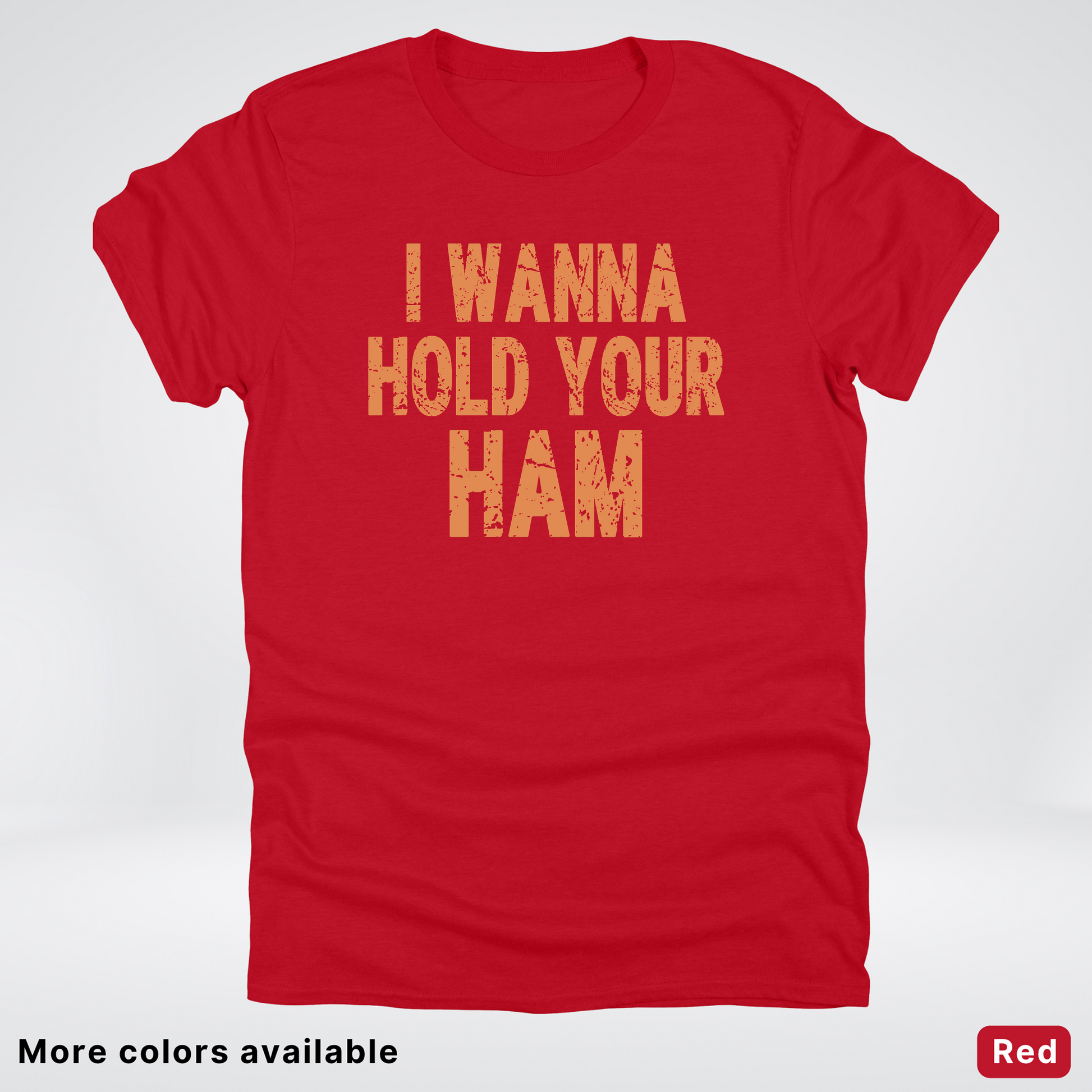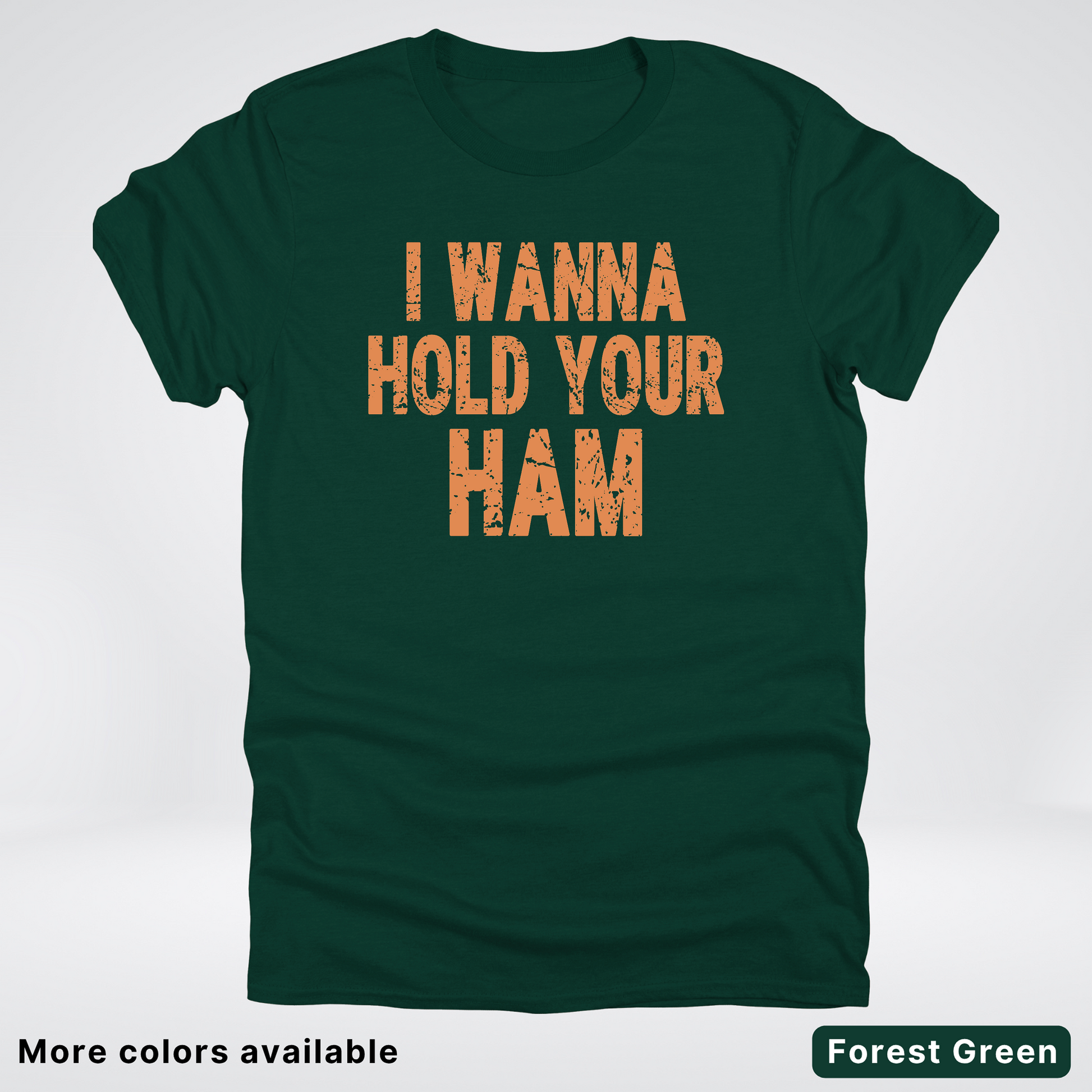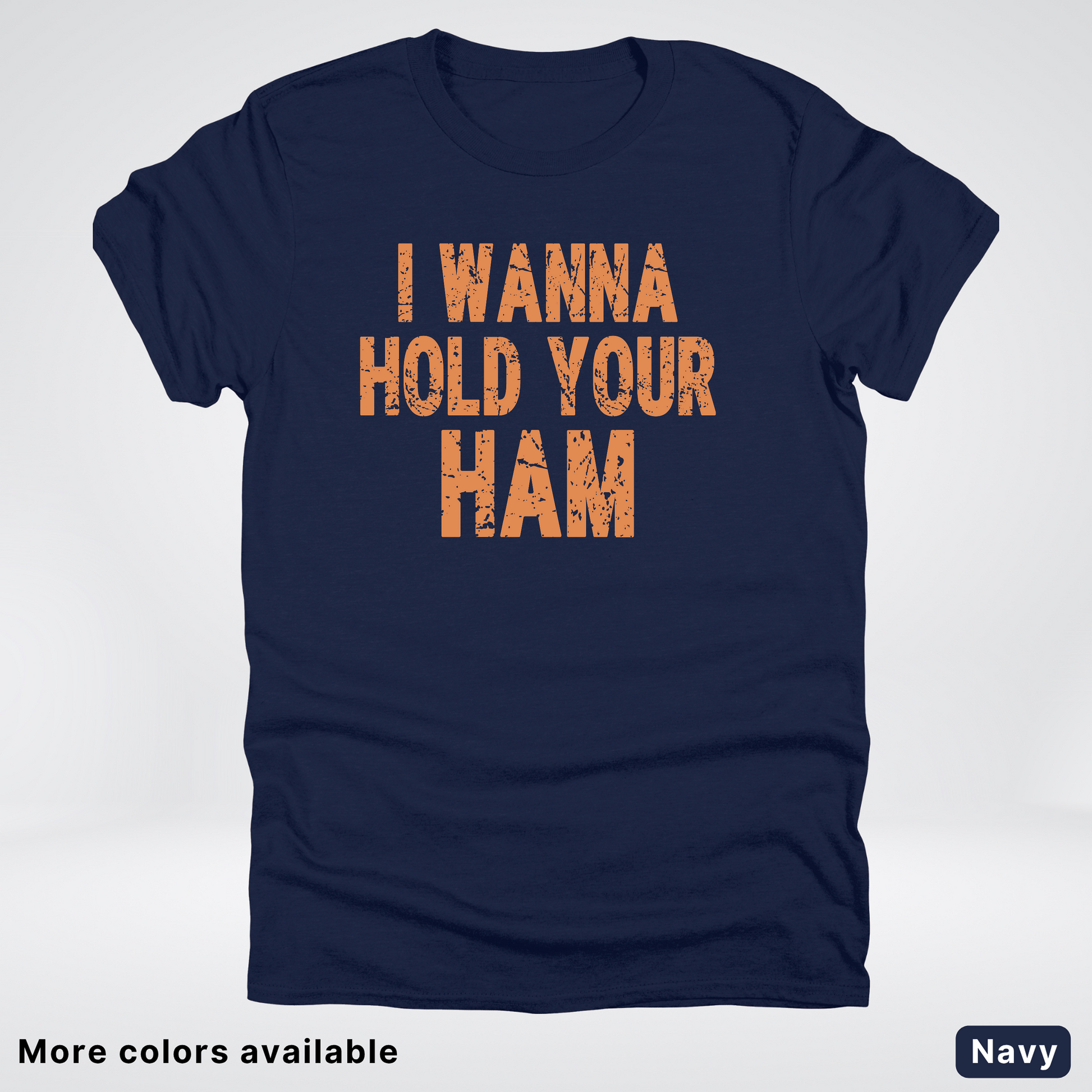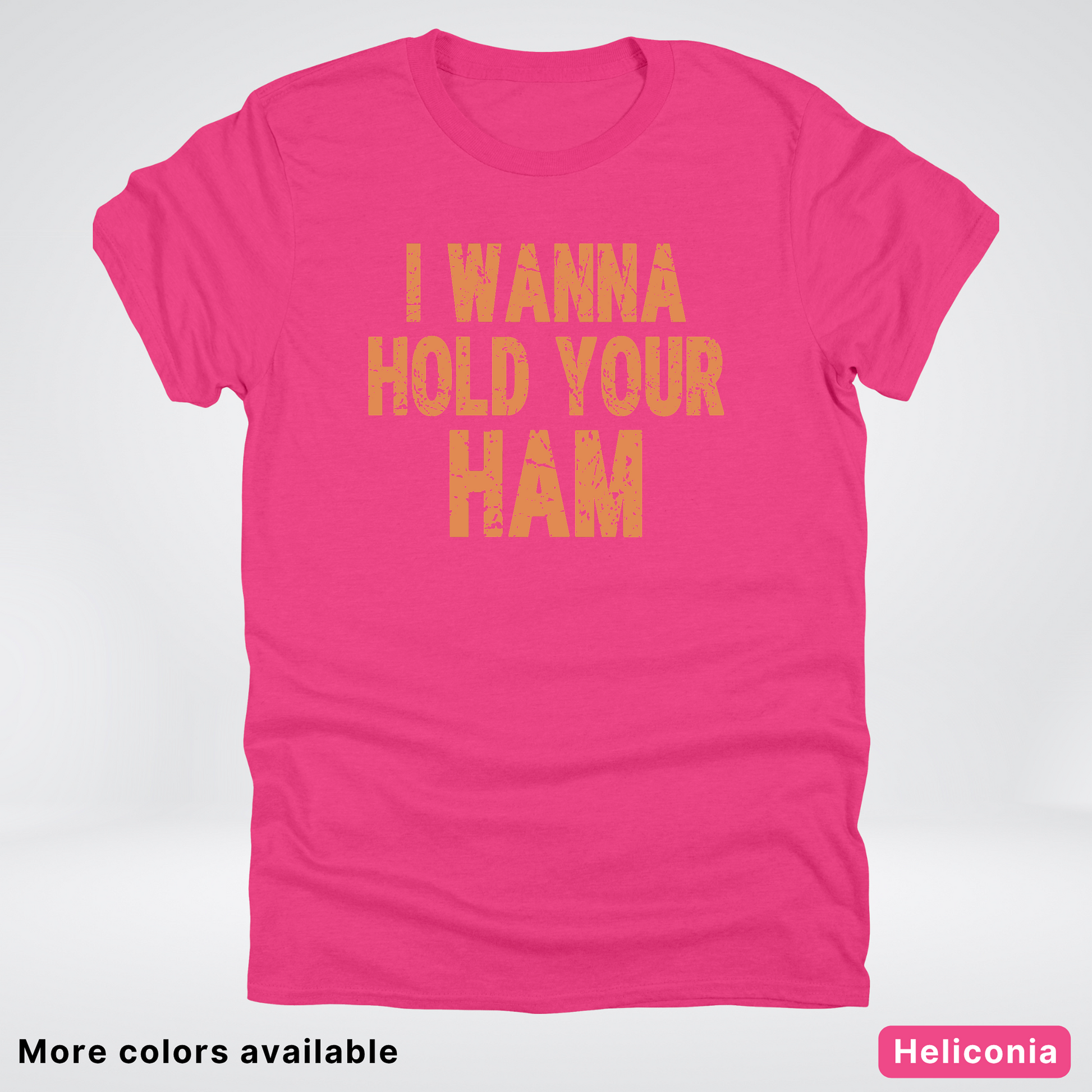I Wanna Hold Your Ham – a playful twist on a classic that'll make any music lover smile. This fun graphic tee combines witty wordplay with comfortable everyday wear, perfect for fans of clever humor and nostalgic pop culture references. Whether you're hitting the grocery store or hanging with friends, this shirt sparks conversations and laughs. Soft, breathable cotton keeps you comfy all day long. A must-have for anyone who appreciates a good pun and timeless style.