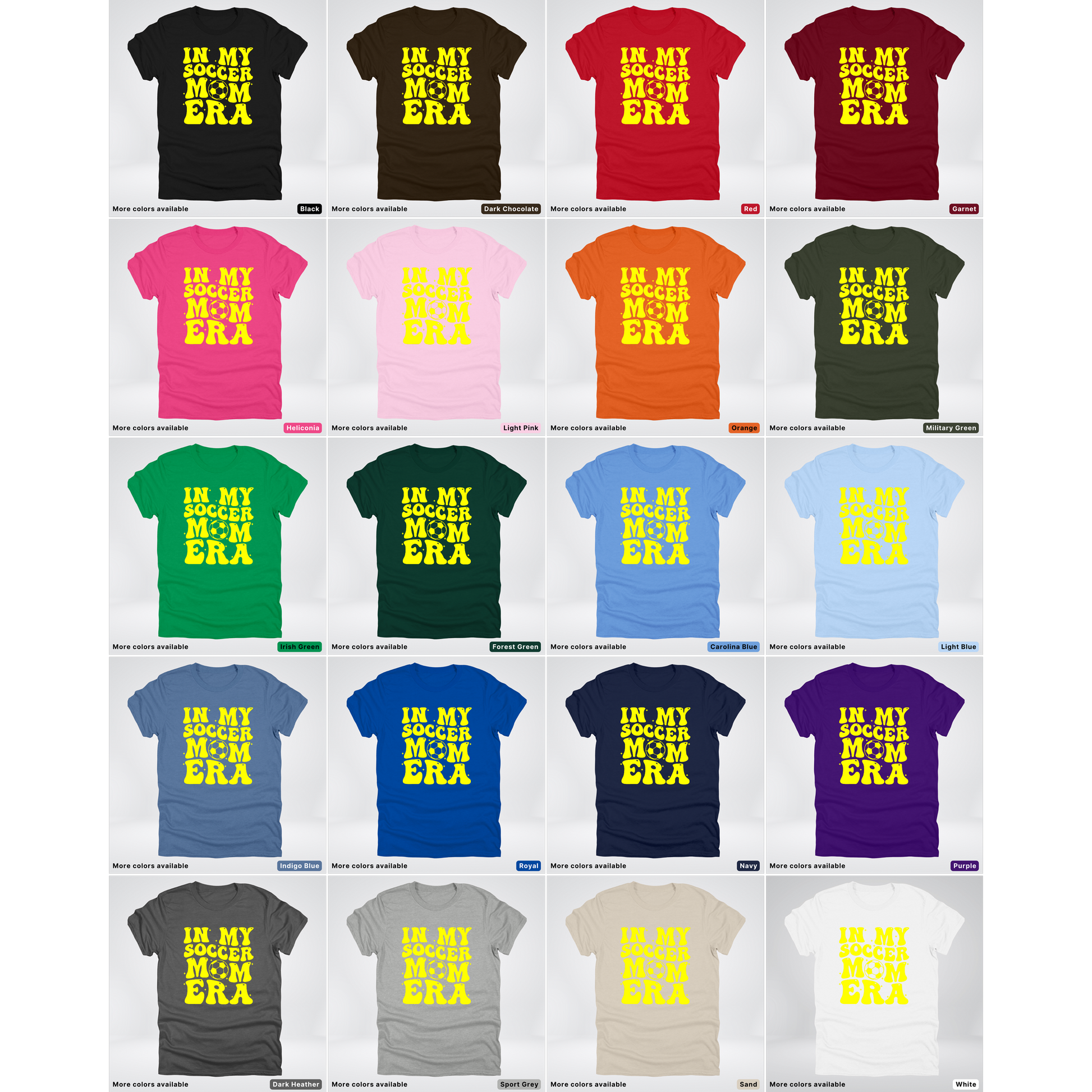 Celebrate your fun and busy life with the In My Soccer Mom Era T-Shirt in cheerful yellow. Perfect for those who rock carpool duties, sideline cheers, and snack runs, this shirt adds a playful touch to your everyday hustle. Comfortable and bright, it’s your new go-to for showing off your mom superpowers with a smile.