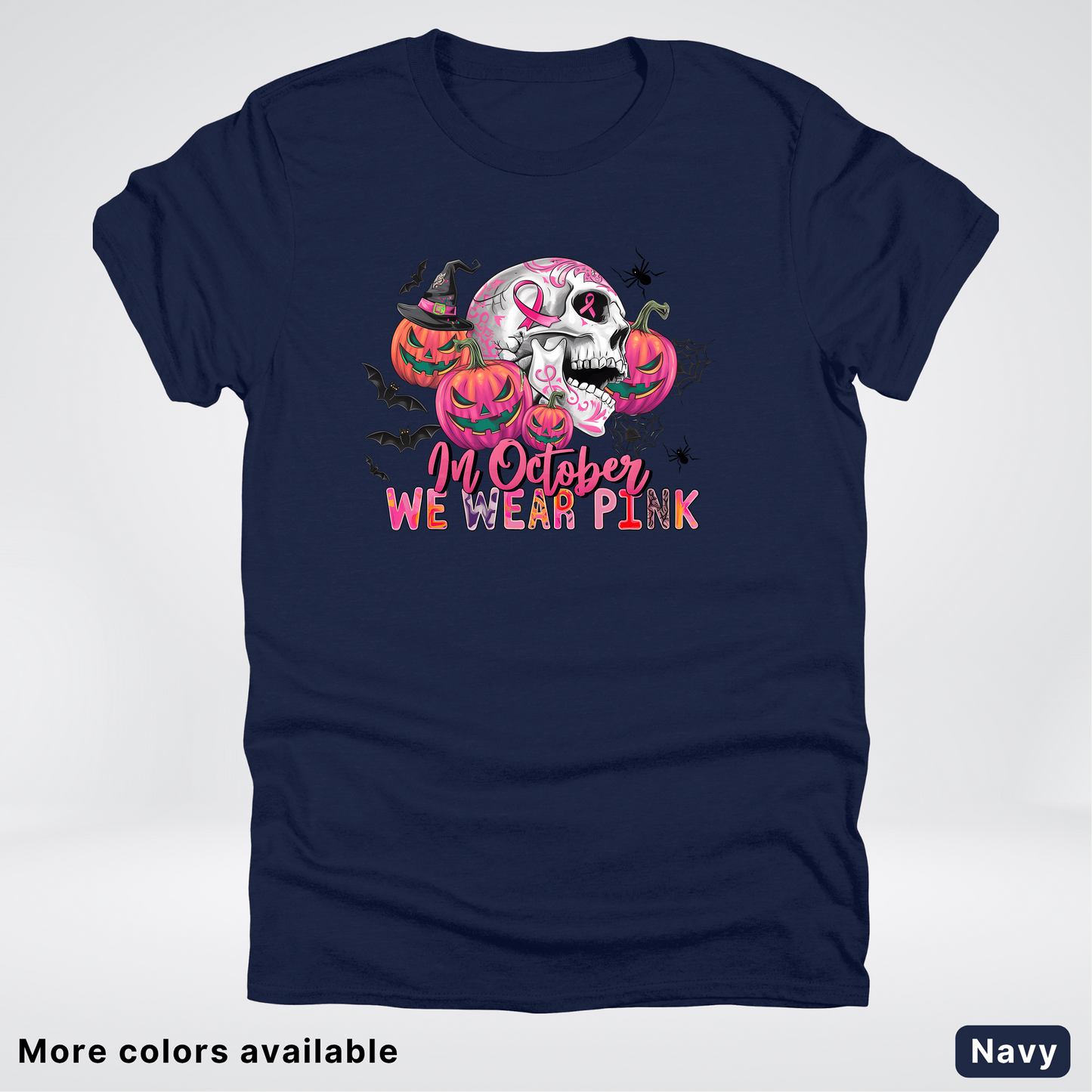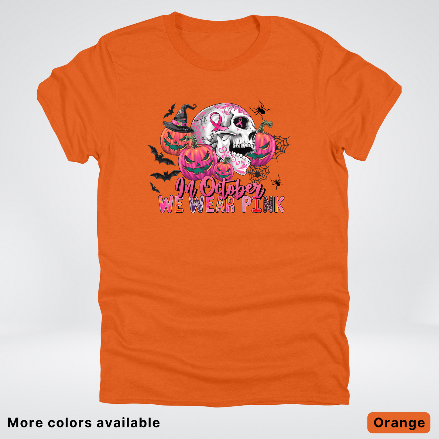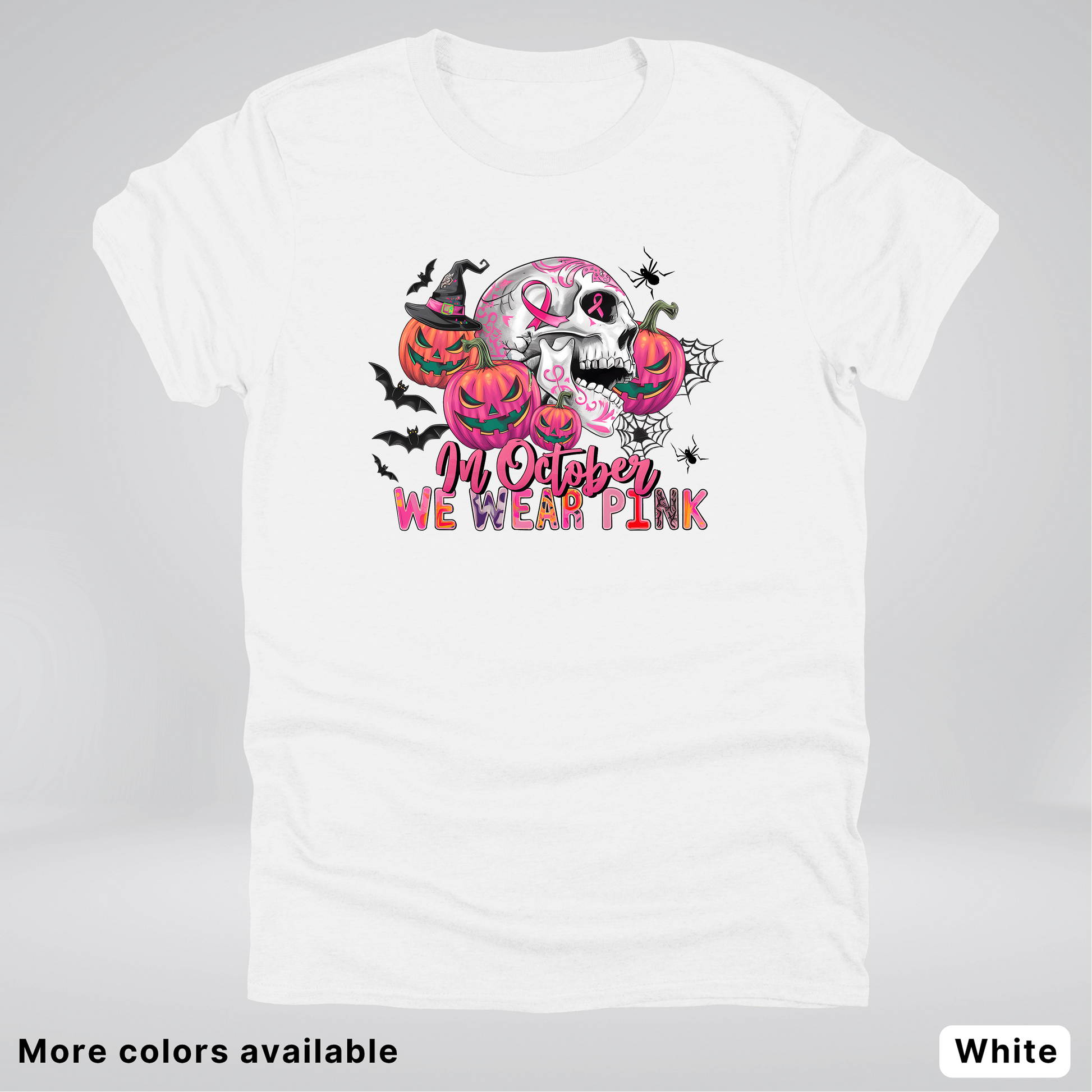 In October We Wear Pink Skull Pumpkins Spiders & Bats - T-Shirt