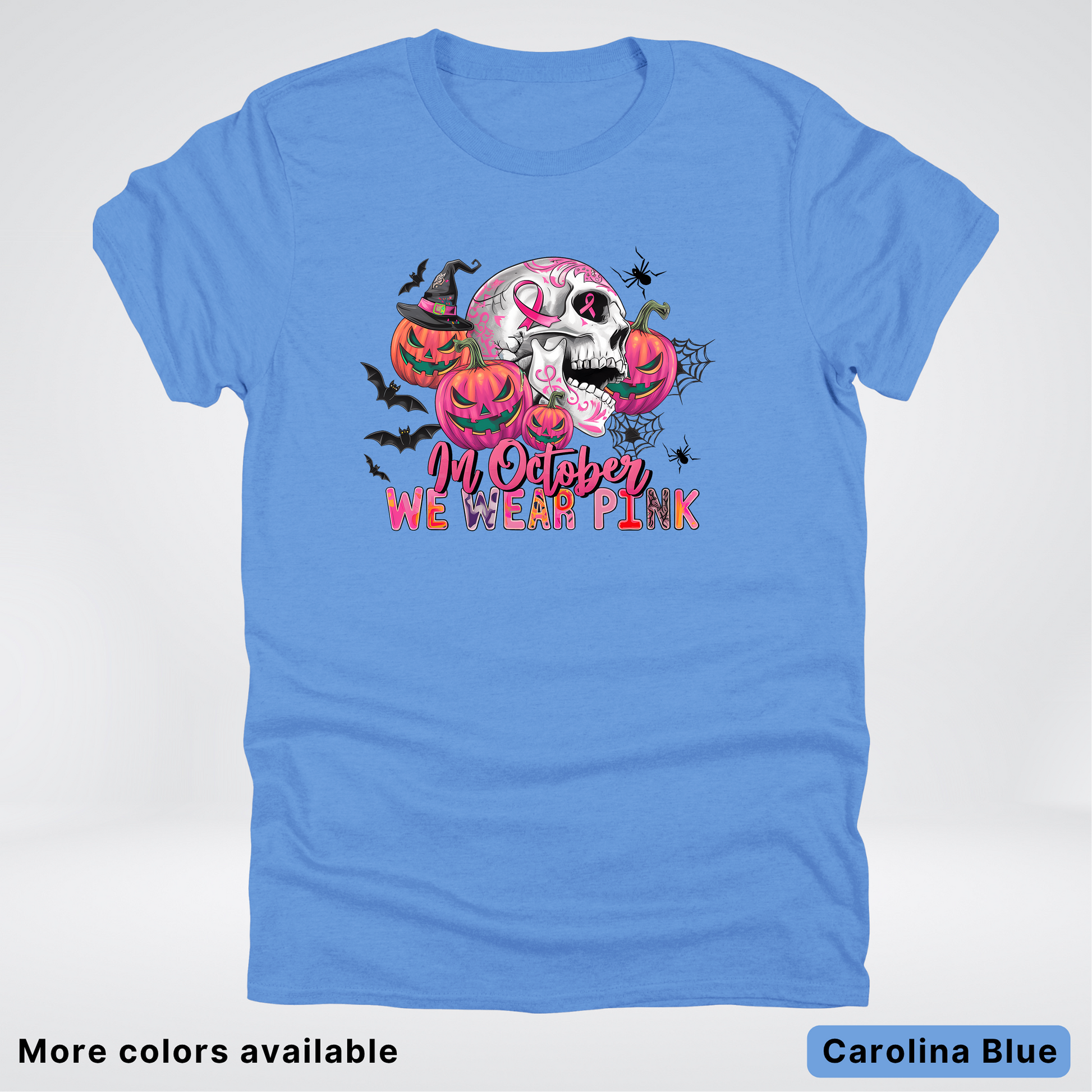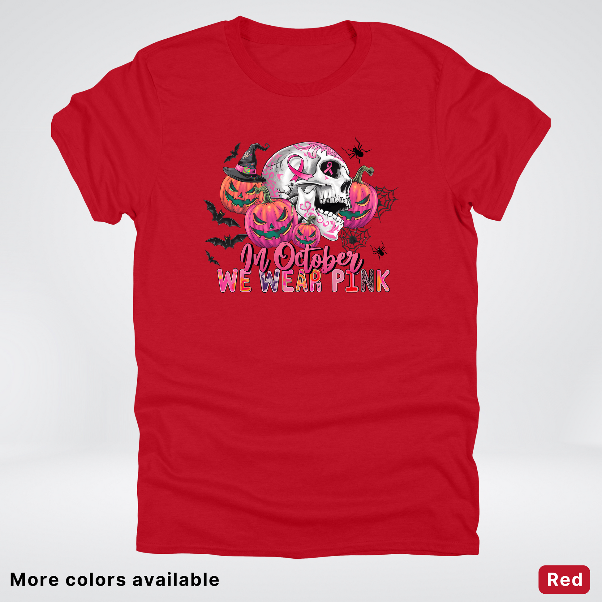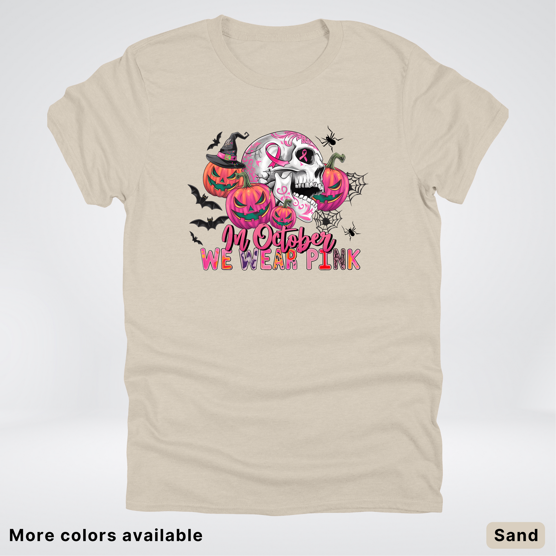 In October We Wear Pink Skull Pumpkins Spiders & Bats - T-Shirt