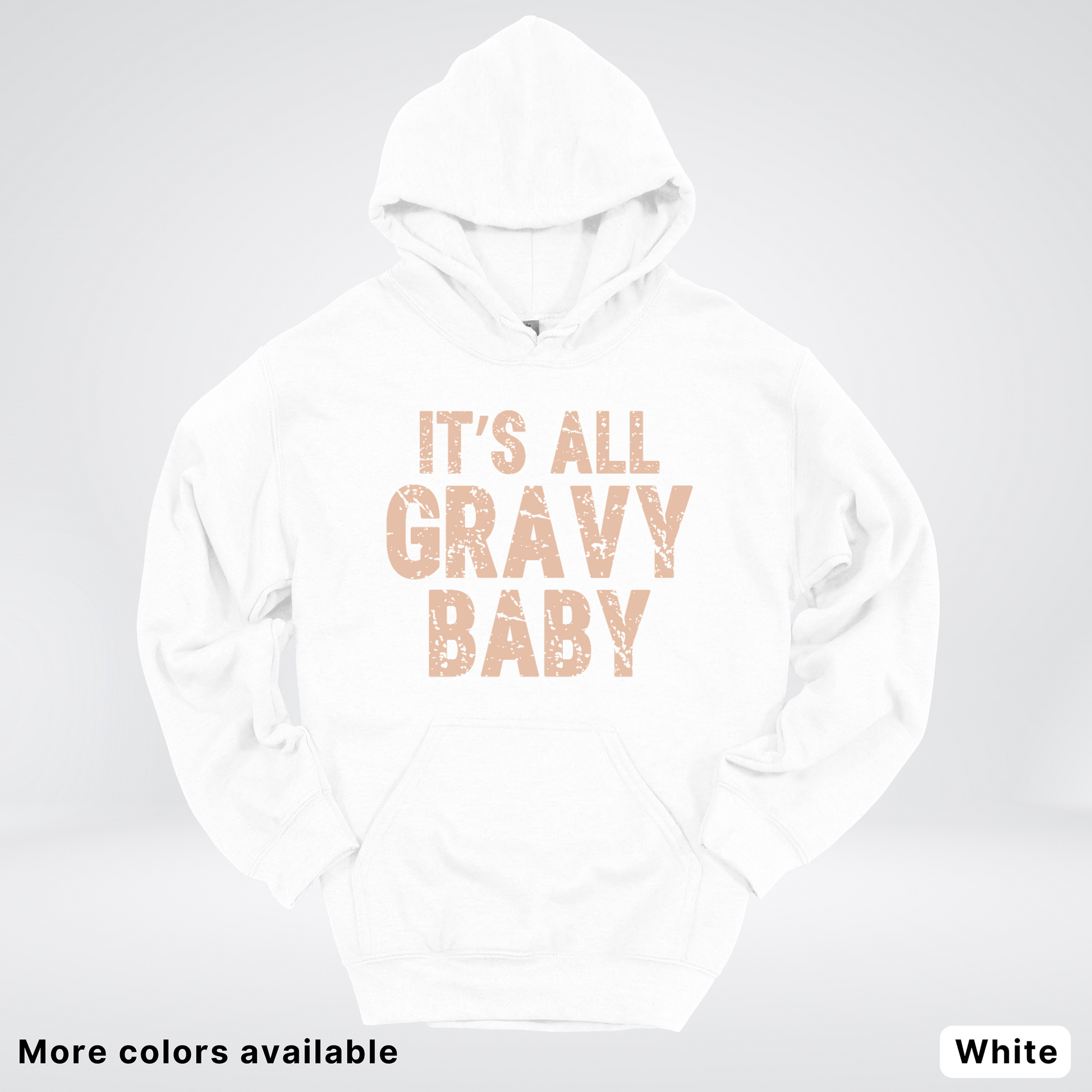 Stay cozy and keep it light with this playful hoodie that says what we're all thinking—it's all gravy, baby! Perfect for laid-back vibes, casual hangouts, or just embracing life's smooth moments. Soft, comfortable, and ready to become your go-to layer for any season. Rock this fun statement piece and spread good energy wherever you go.