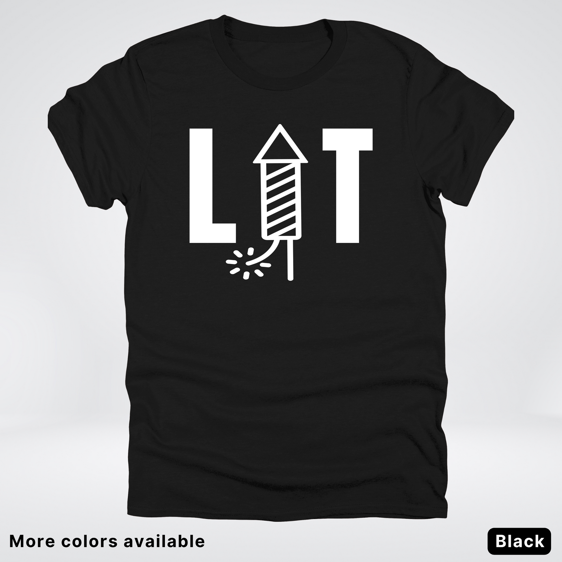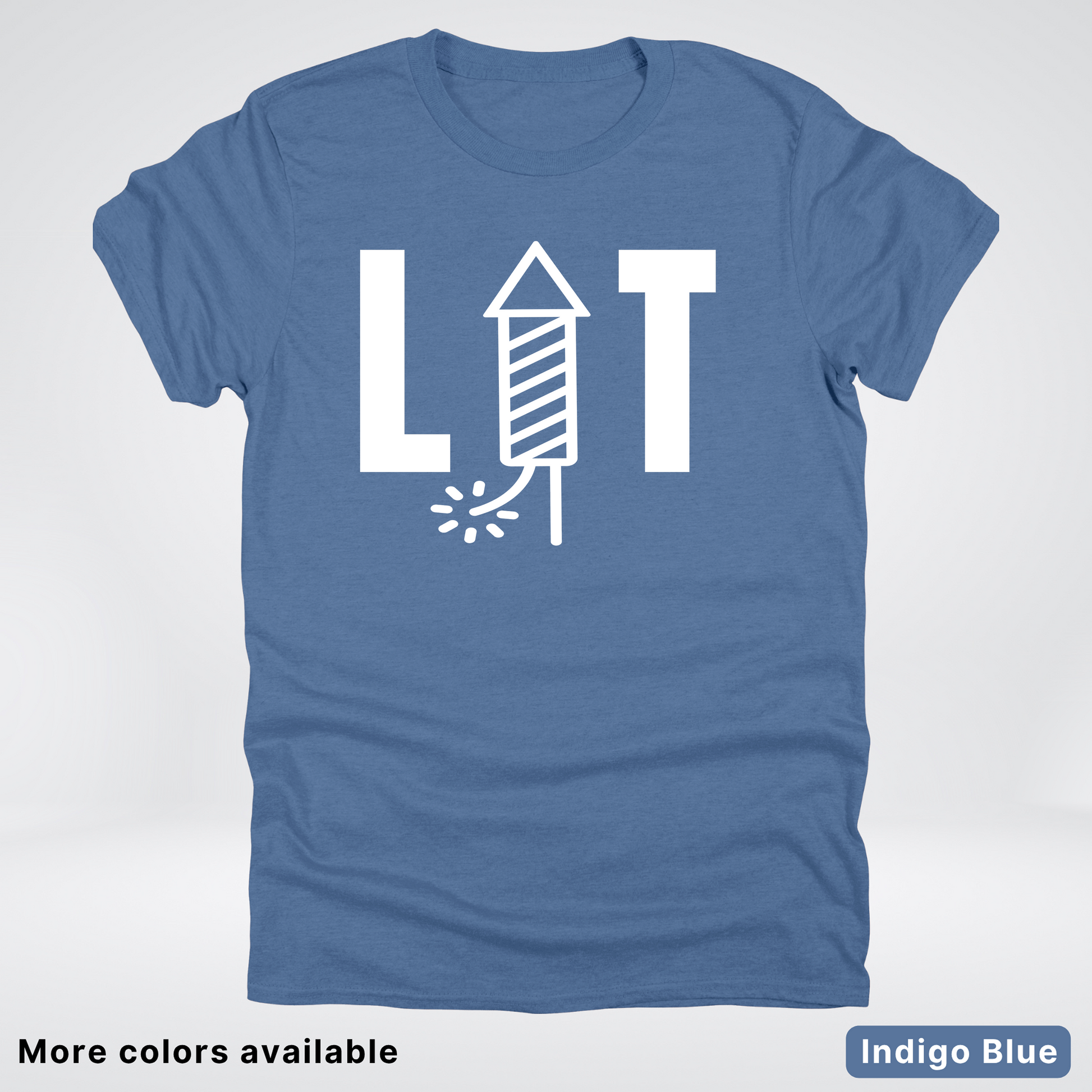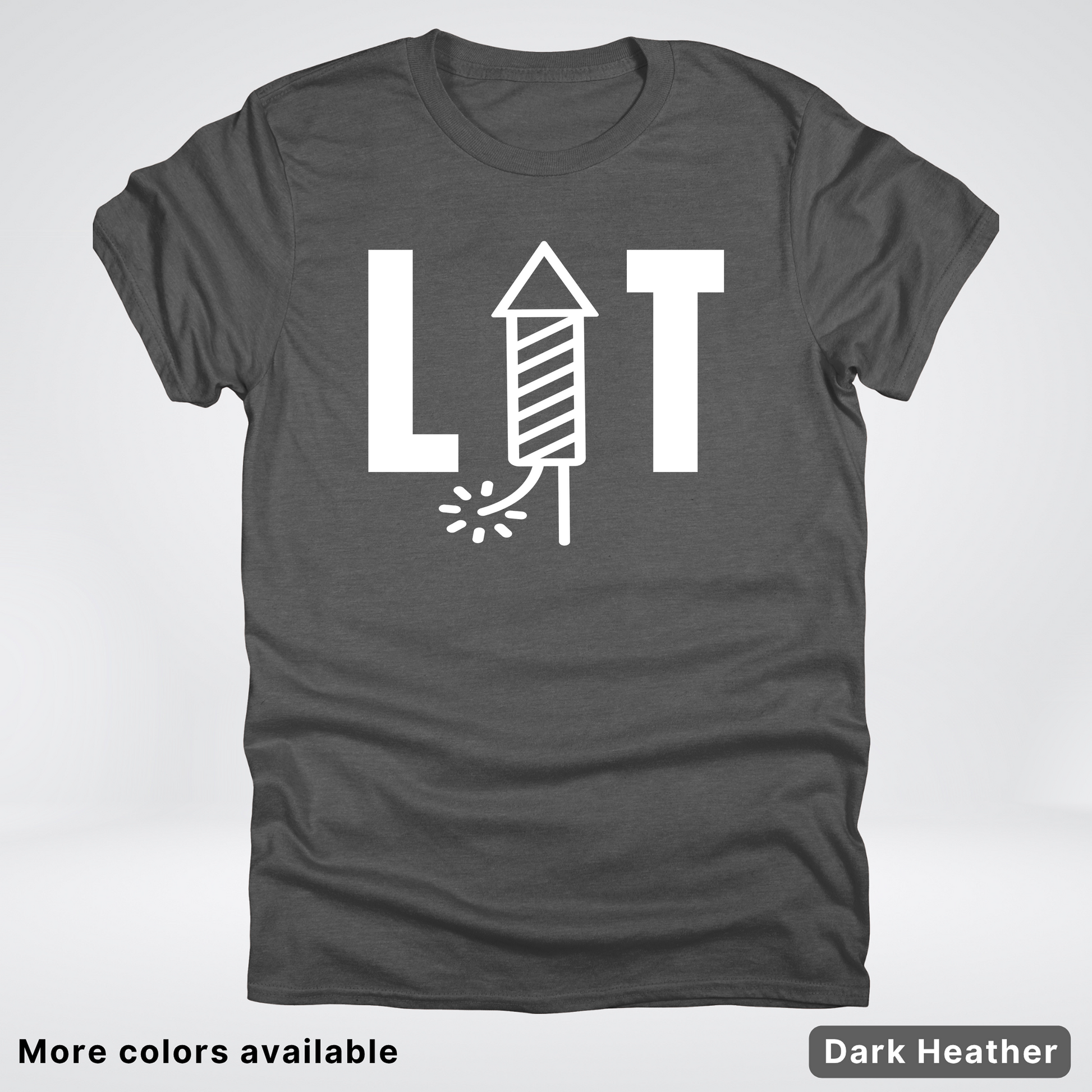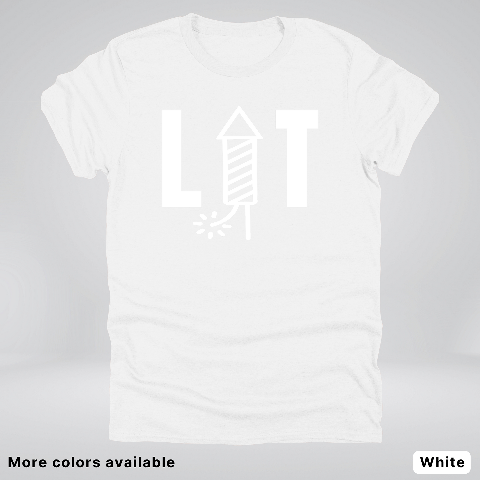 Get ready to spark up your 4th of July celebrations with the LIT T-Shirt! This playful tee features the letter "I" as a real lit firework, adding a burst of fun to your holiday look. Perfect for lighting up BBQs and fireworks displays, it’s the ultimate festive outfit choice.