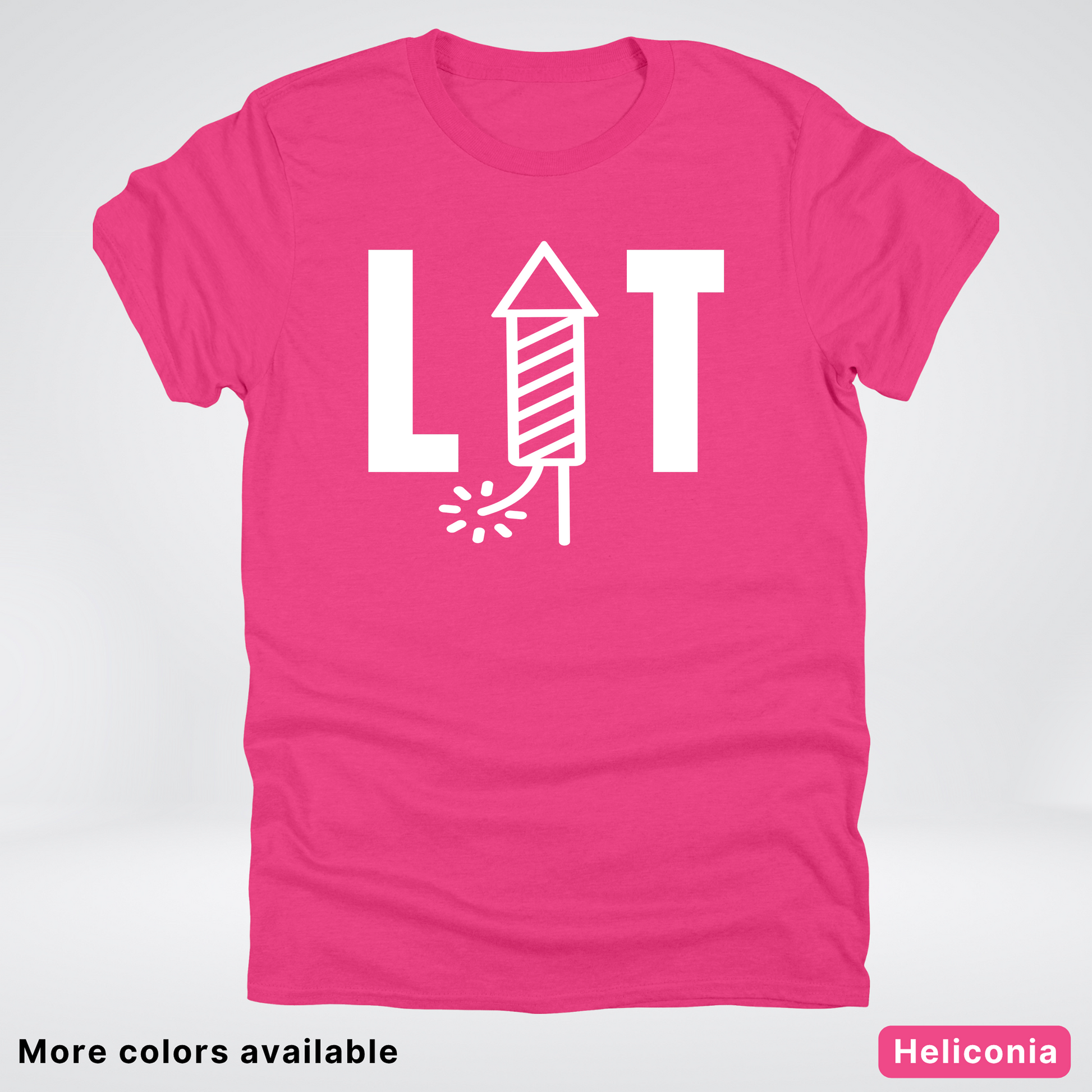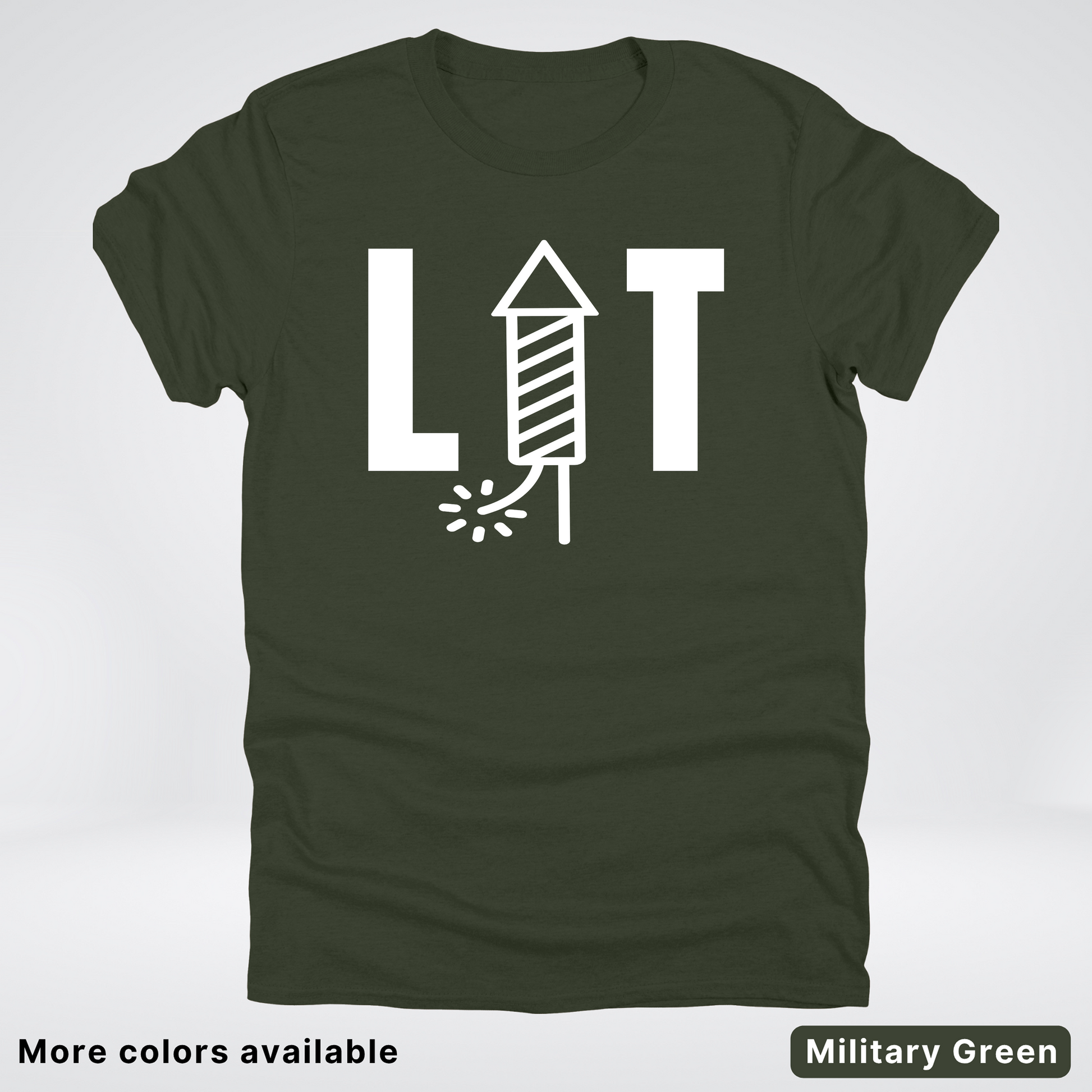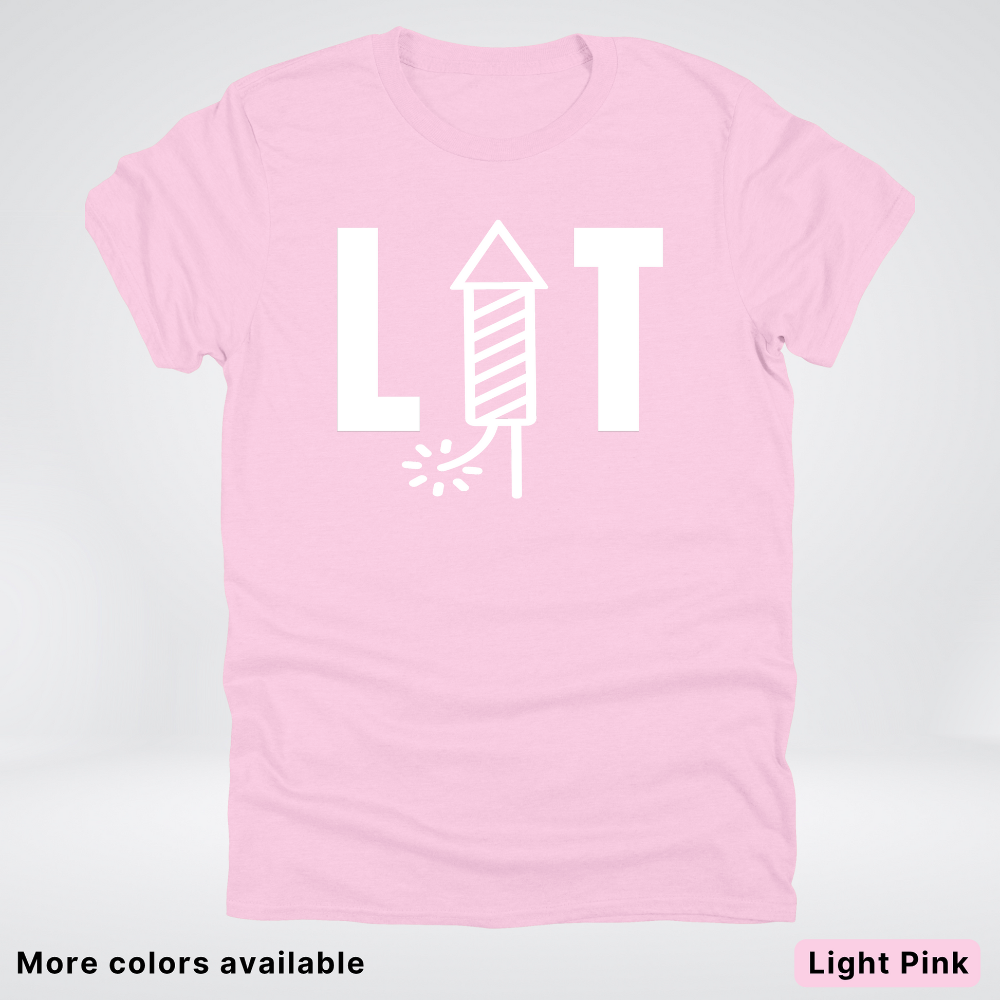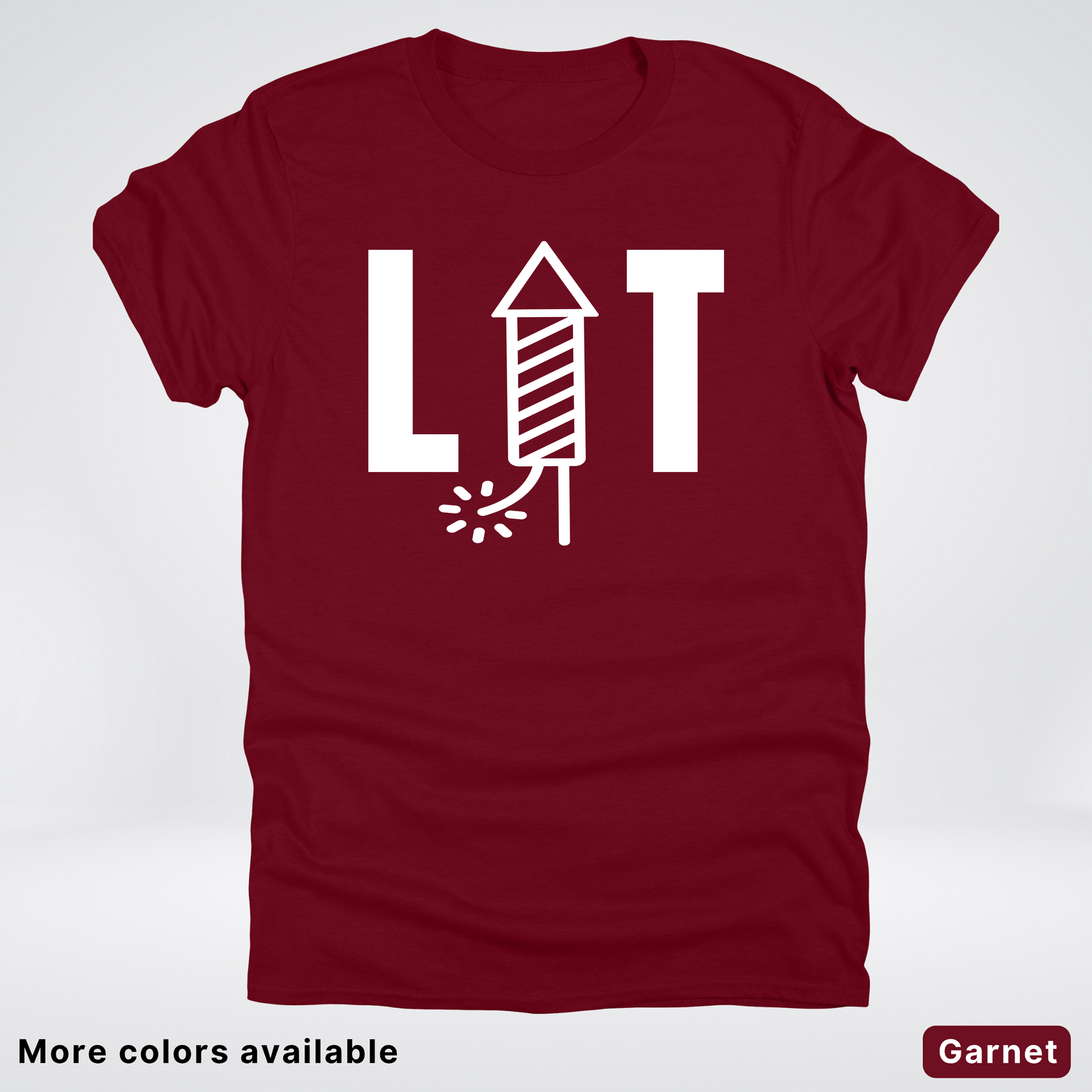 Get ready to spark up your 4th of July celebrations with the LIT T-Shirt! This playful tee features the letter "I" as a real lit firework, adding a burst of fun to your holiday look. Perfect for lighting up BBQs and fireworks displays, it’s the ultimate festive outfit choice.