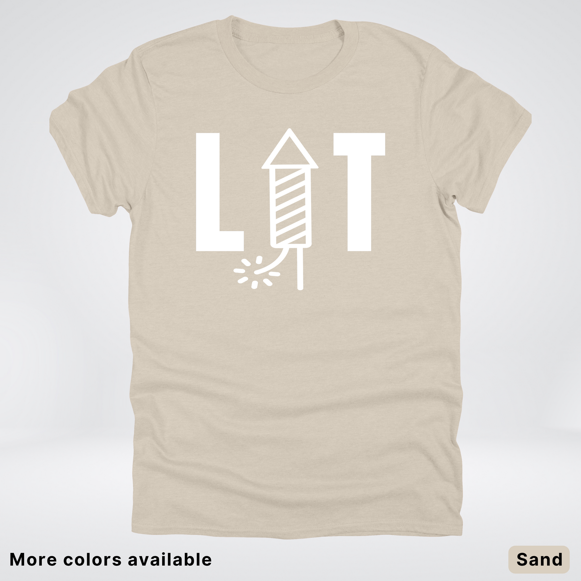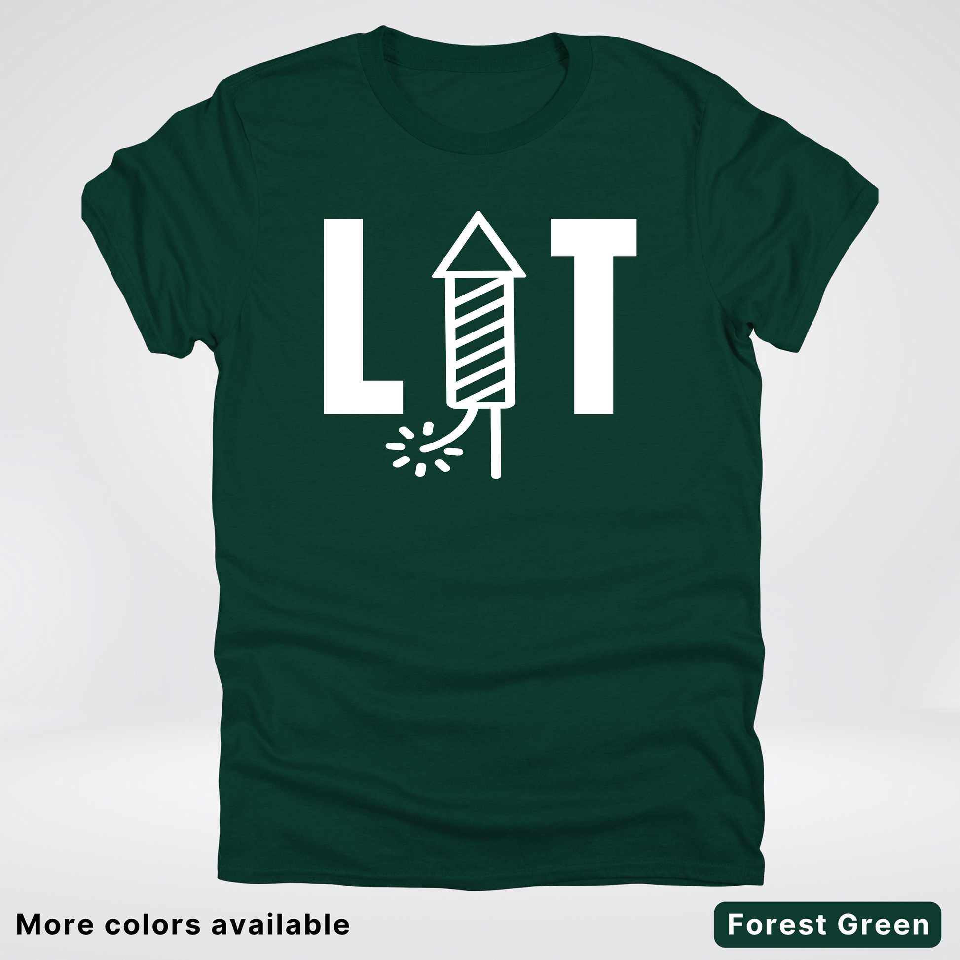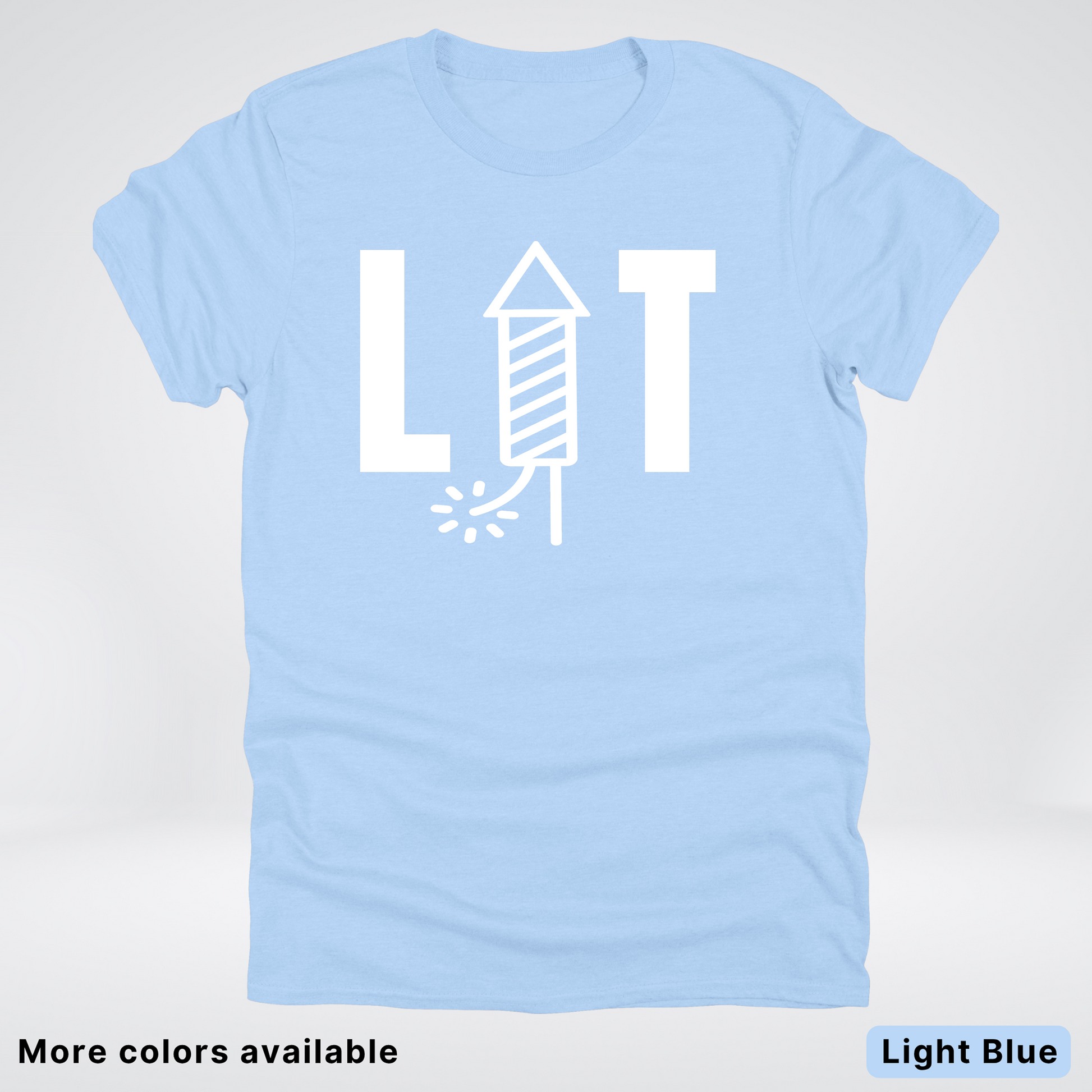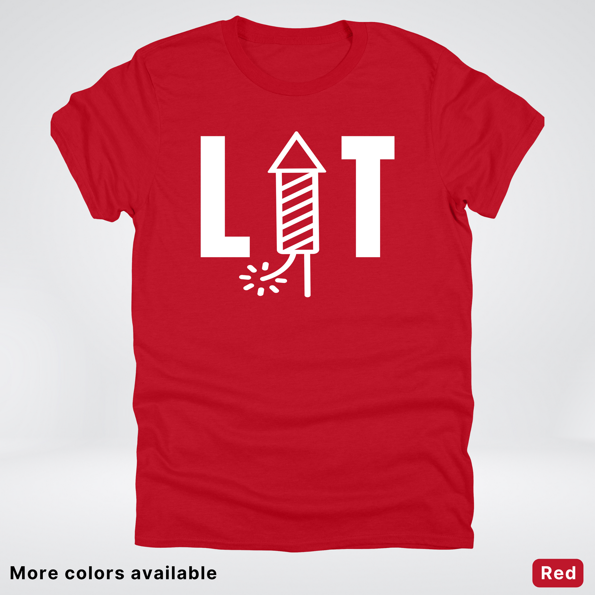 Get ready to spark up your 4th of July celebrations with the LIT T-Shirt! This playful tee features the letter "I" as a real lit firework, adding a burst of fun to your holiday look. Perfect for lighting up BBQs and fireworks displays, it’s the ultimate festive outfit choice.