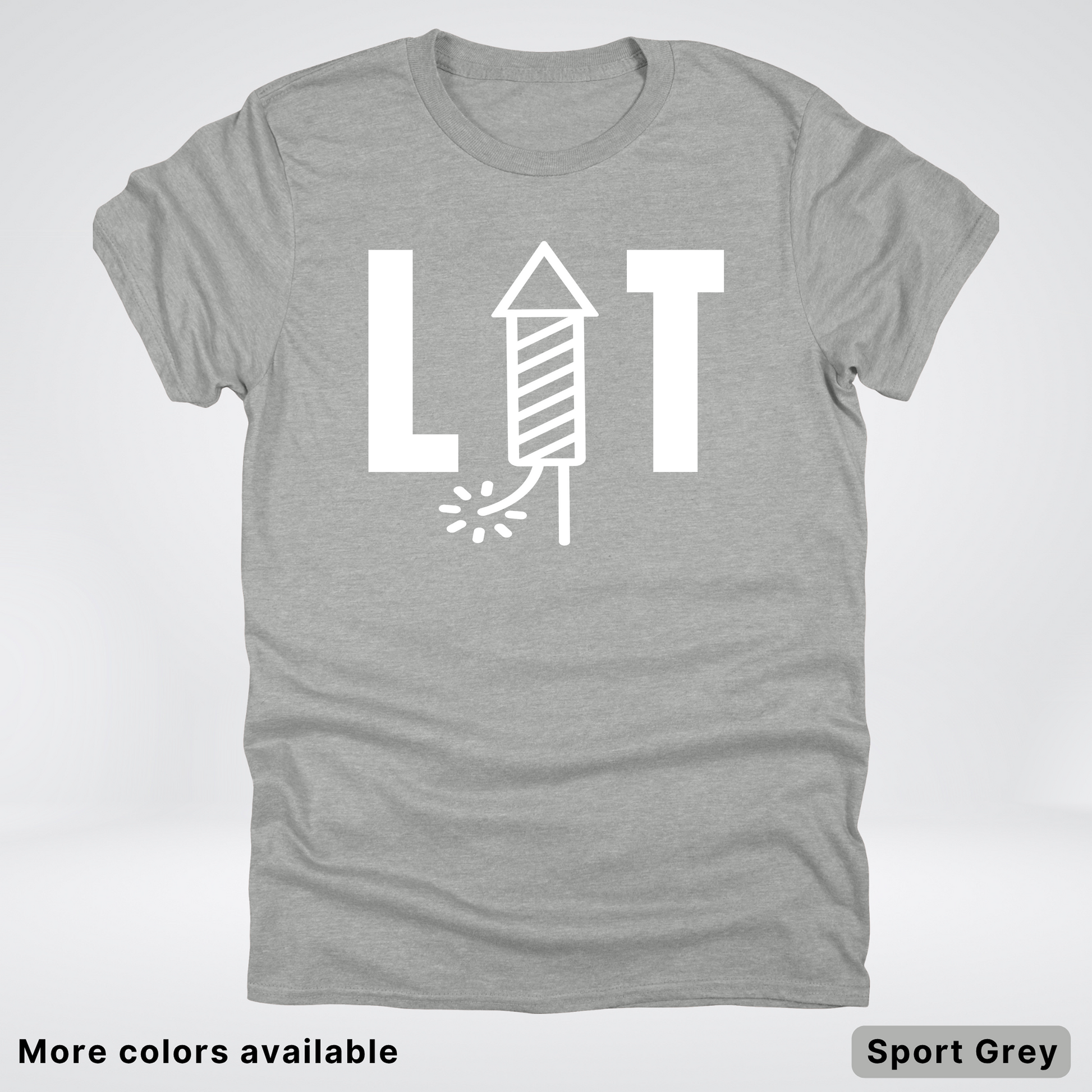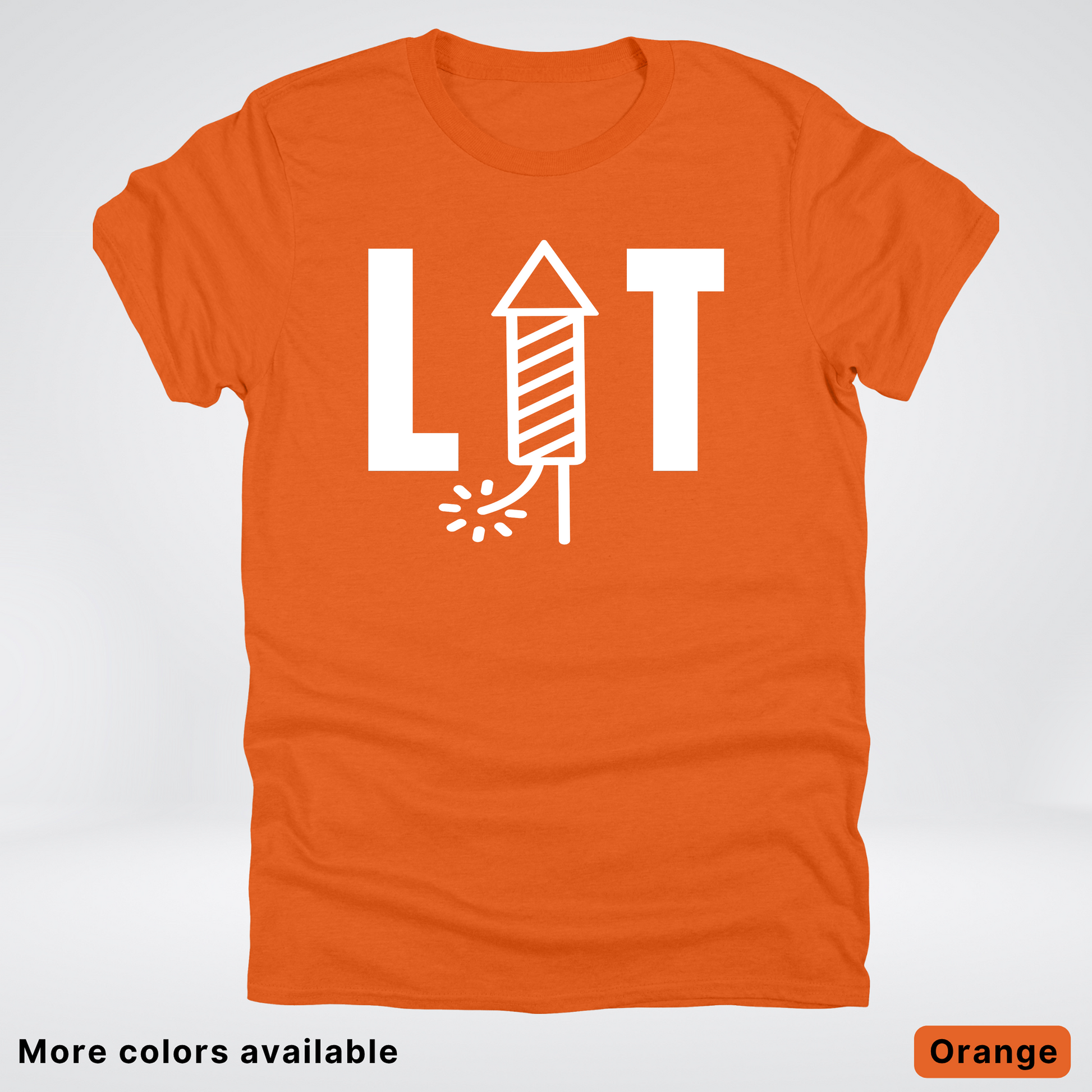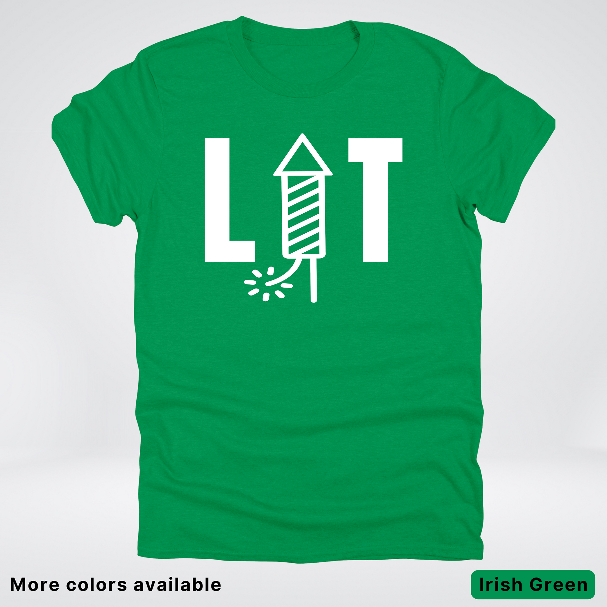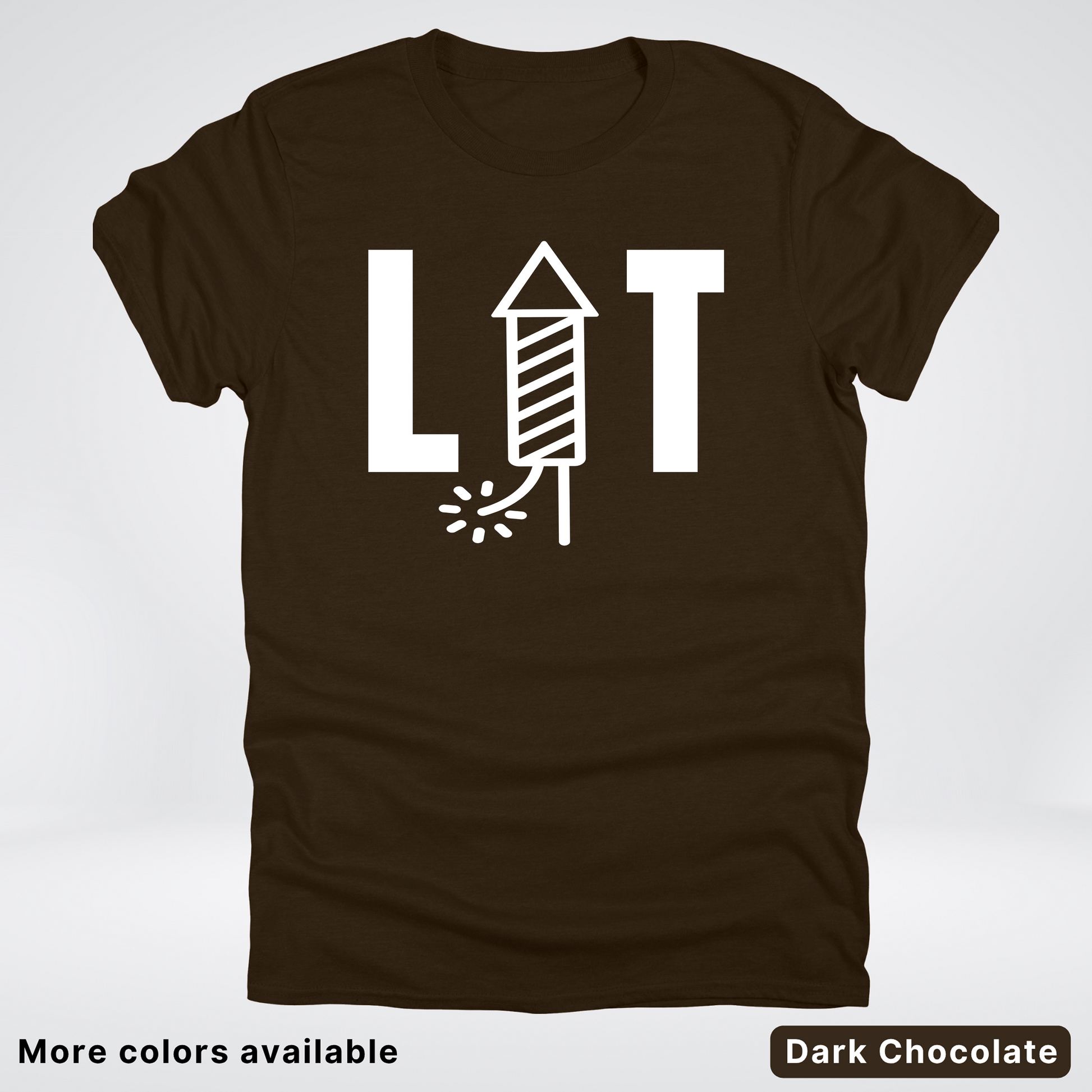 Get ready to spark up your 4th of July celebrations with the LIT T-Shirt! This playful tee features the letter "I" as a real lit firework, adding a burst of fun to your holiday look. Perfect for lighting up BBQs and fireworks displays, it’s the ultimate festive outfit choice.
