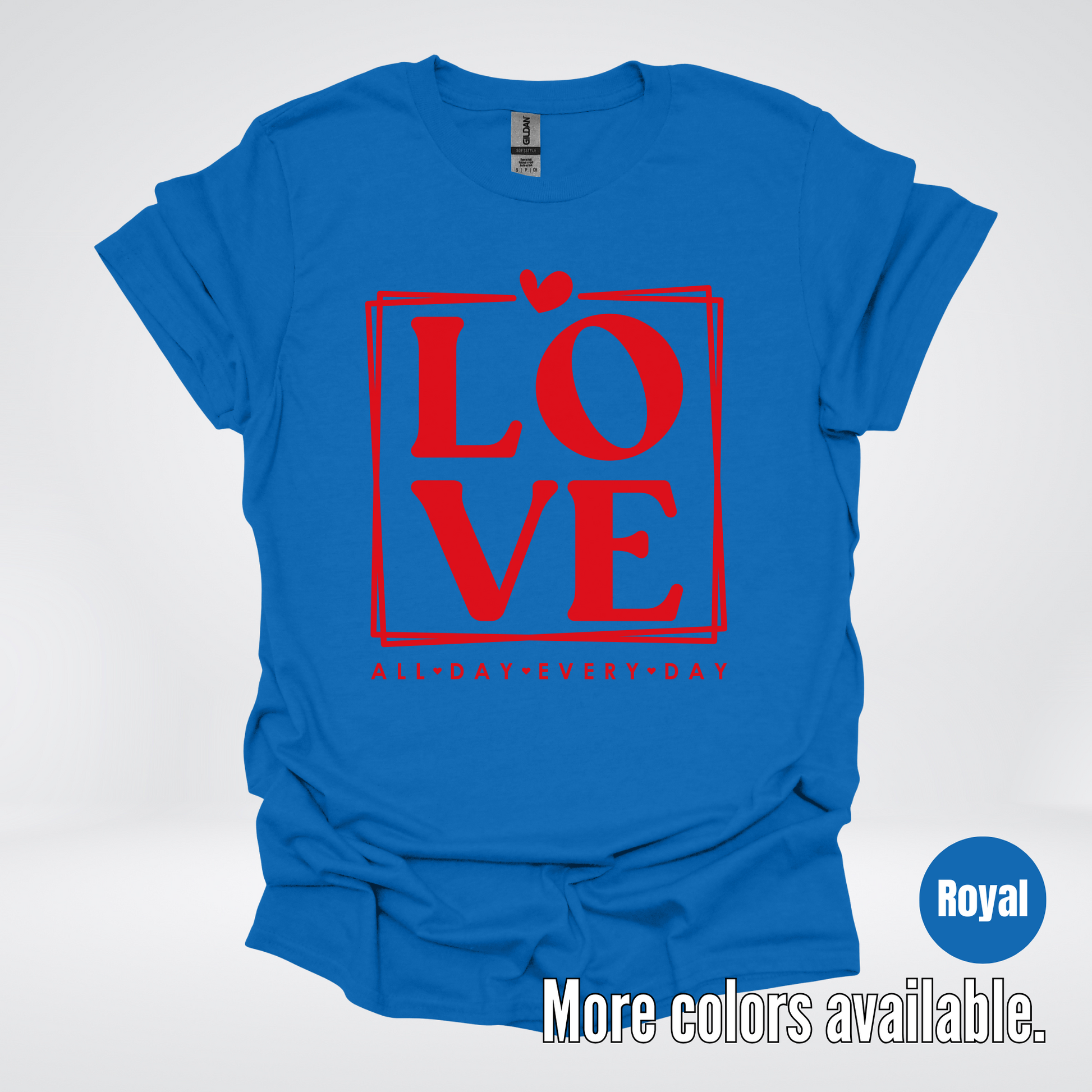 Spread love all day every day with this playful and stylish t-shirt. Featuring a bold red design, this shirt is perfect for adding a pop of color to any outfit. Show off your fun and quirky side while expressing your love for all things with this unique t-shirt.
