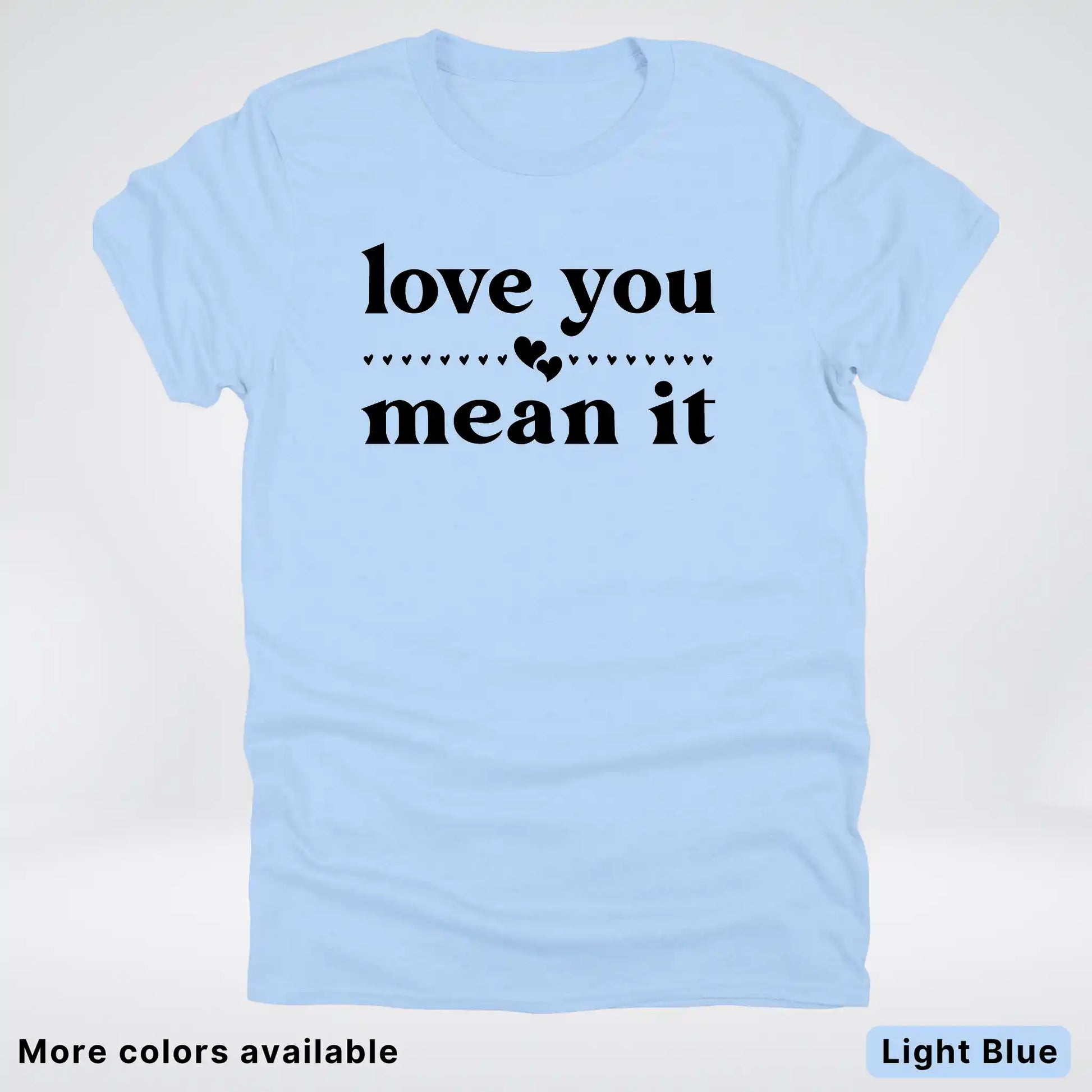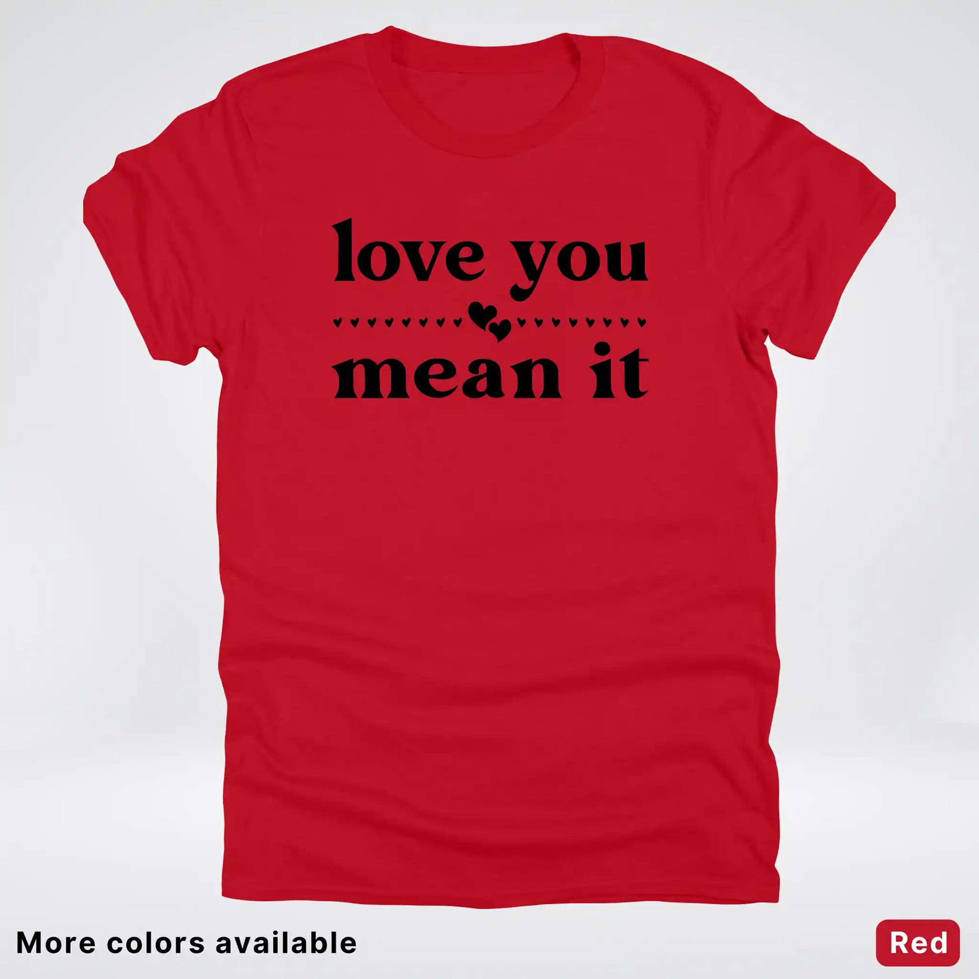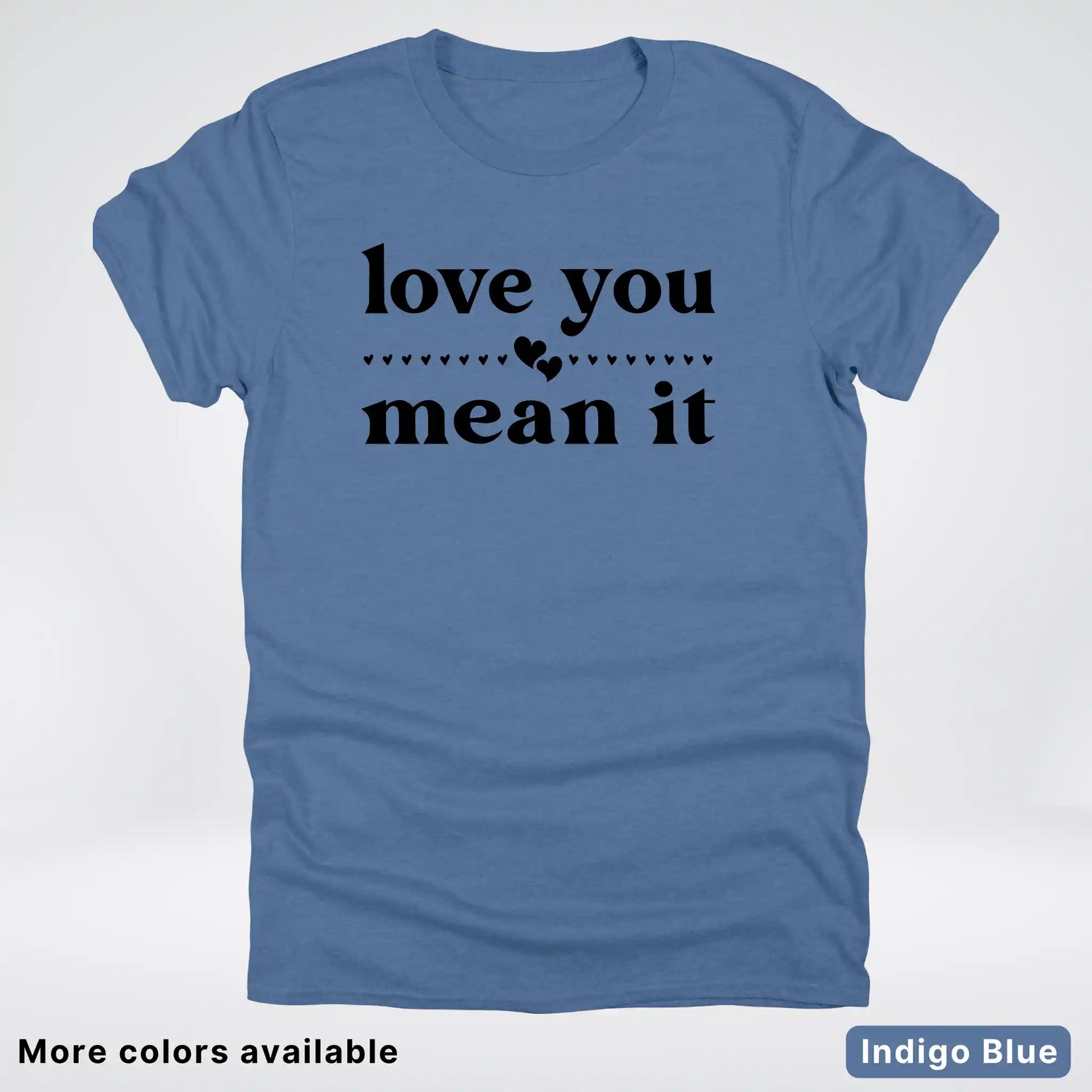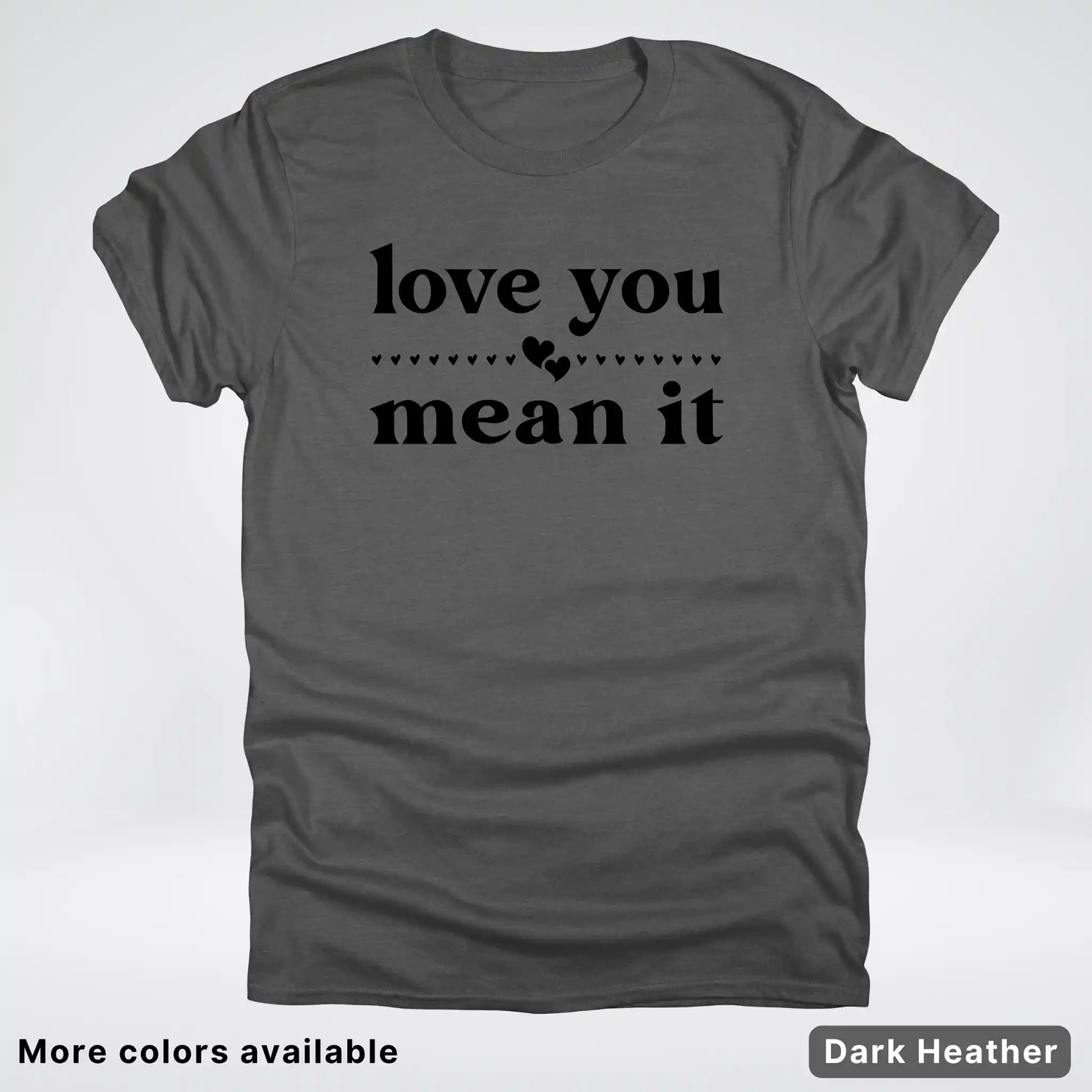 Express your affection with style in this classic black tee featuring a bold "Love You Mean It" design. Perfect for sharing genuine feelings with someone special, this comfortable everyday shirt combines heartfelt messaging with timeless appeal. Whether you're gifting it to a loved one or keeping it for yourself, this piece serves as a wearable reminder that true love deserves to be said—and meant. Soft, versatile, and ready to become a wardrobe favorite.