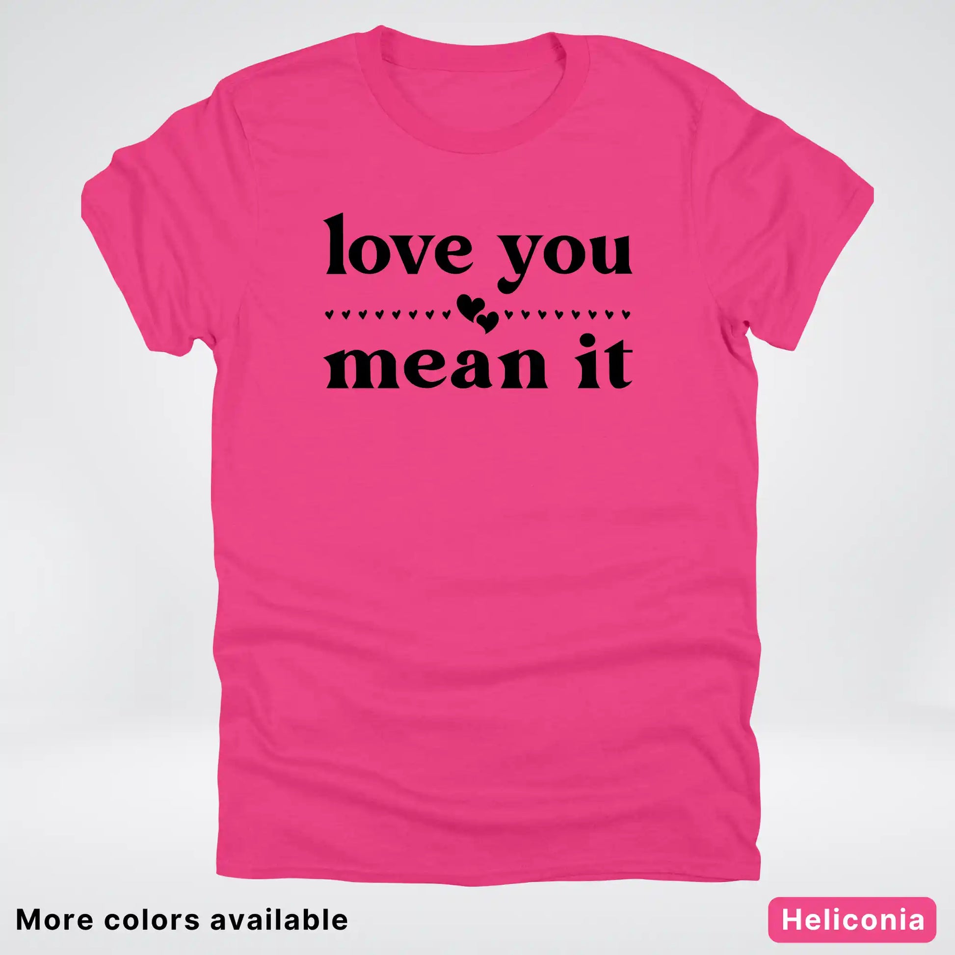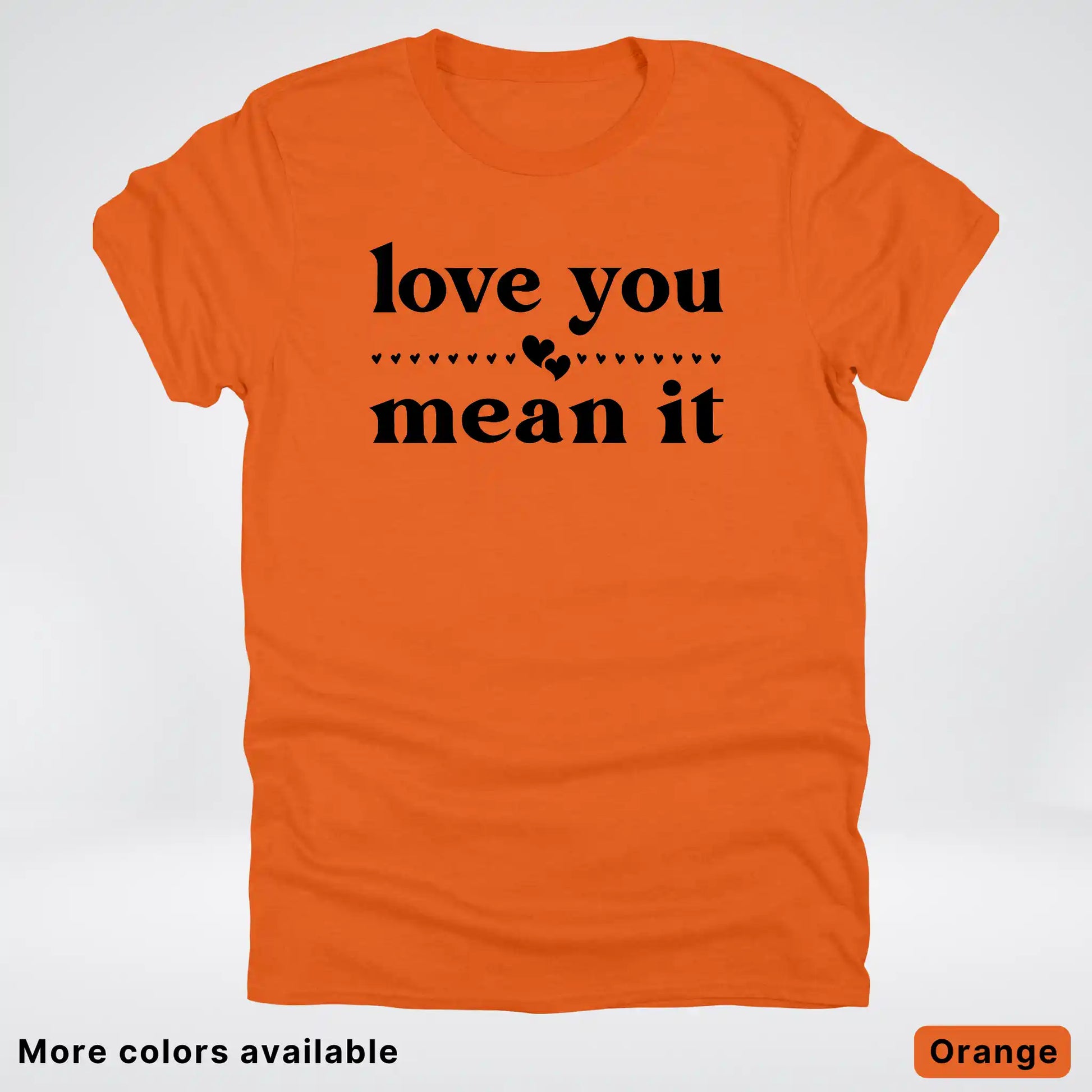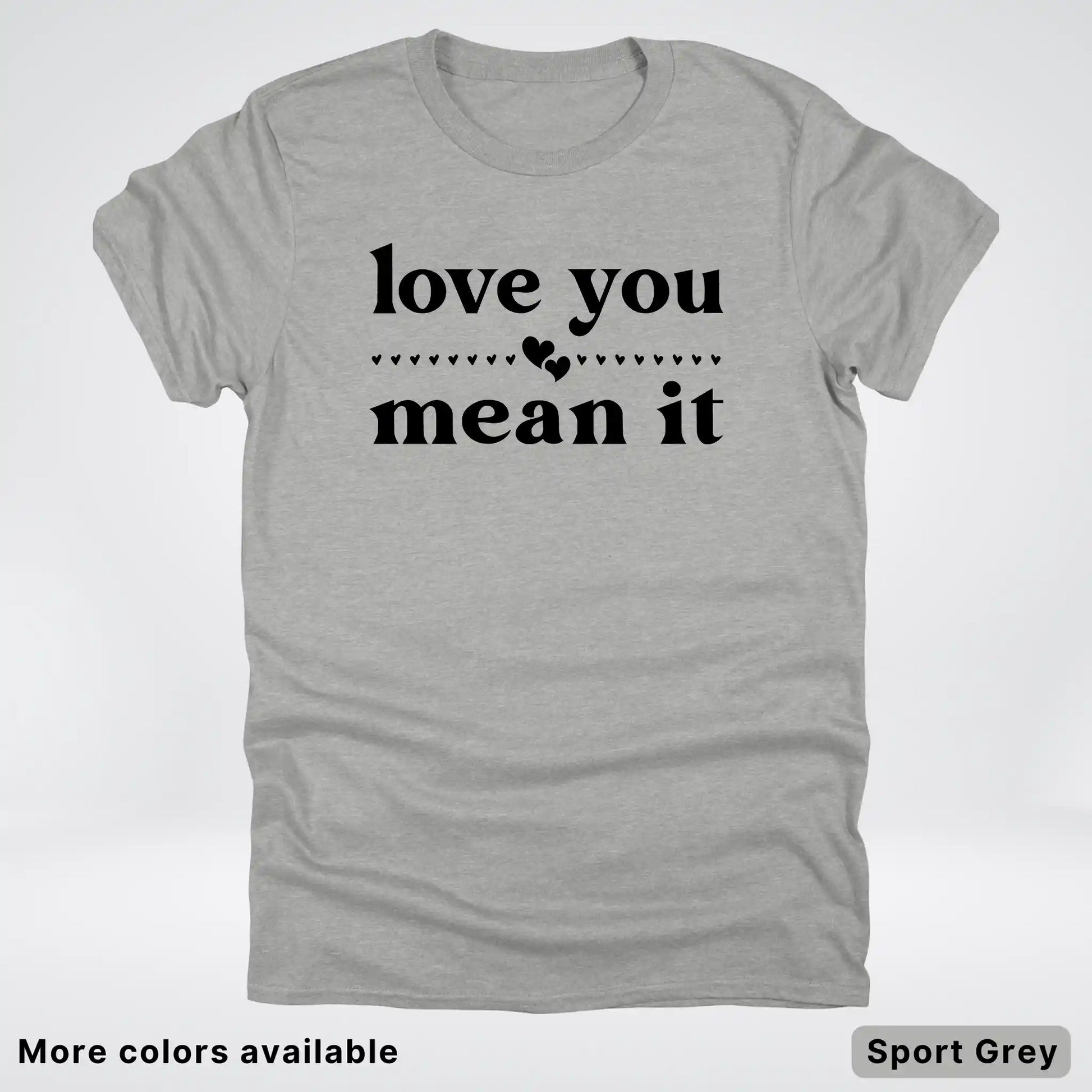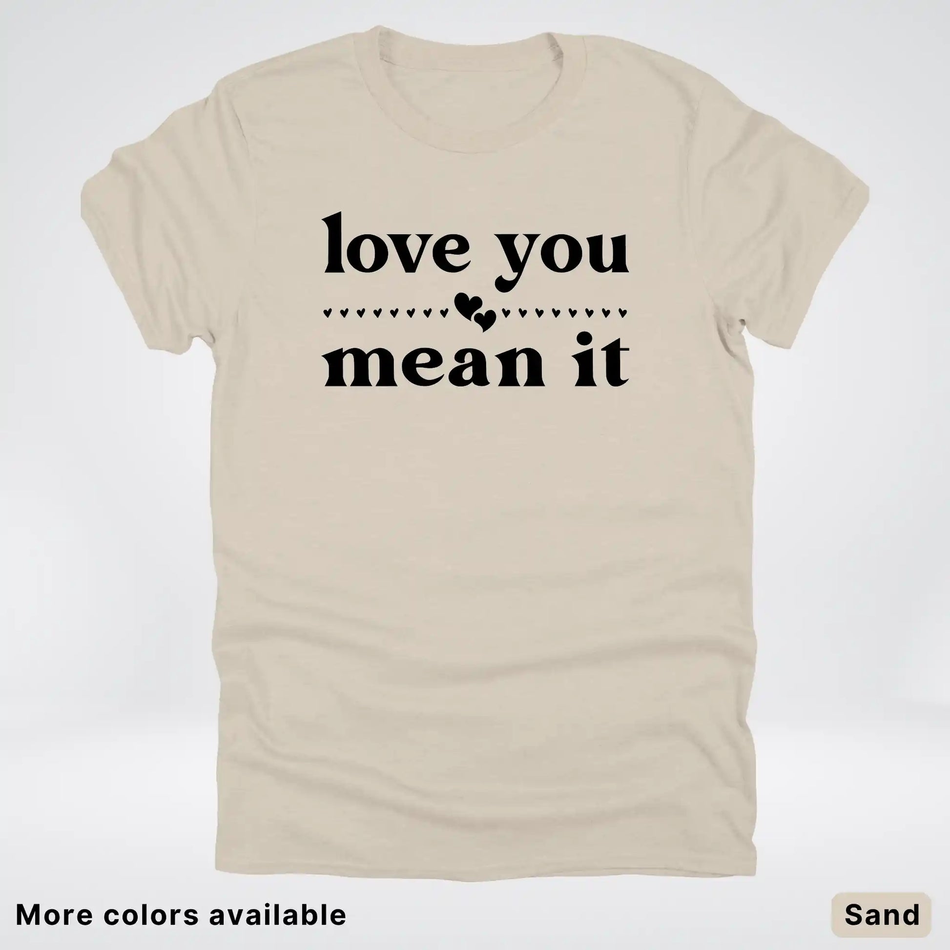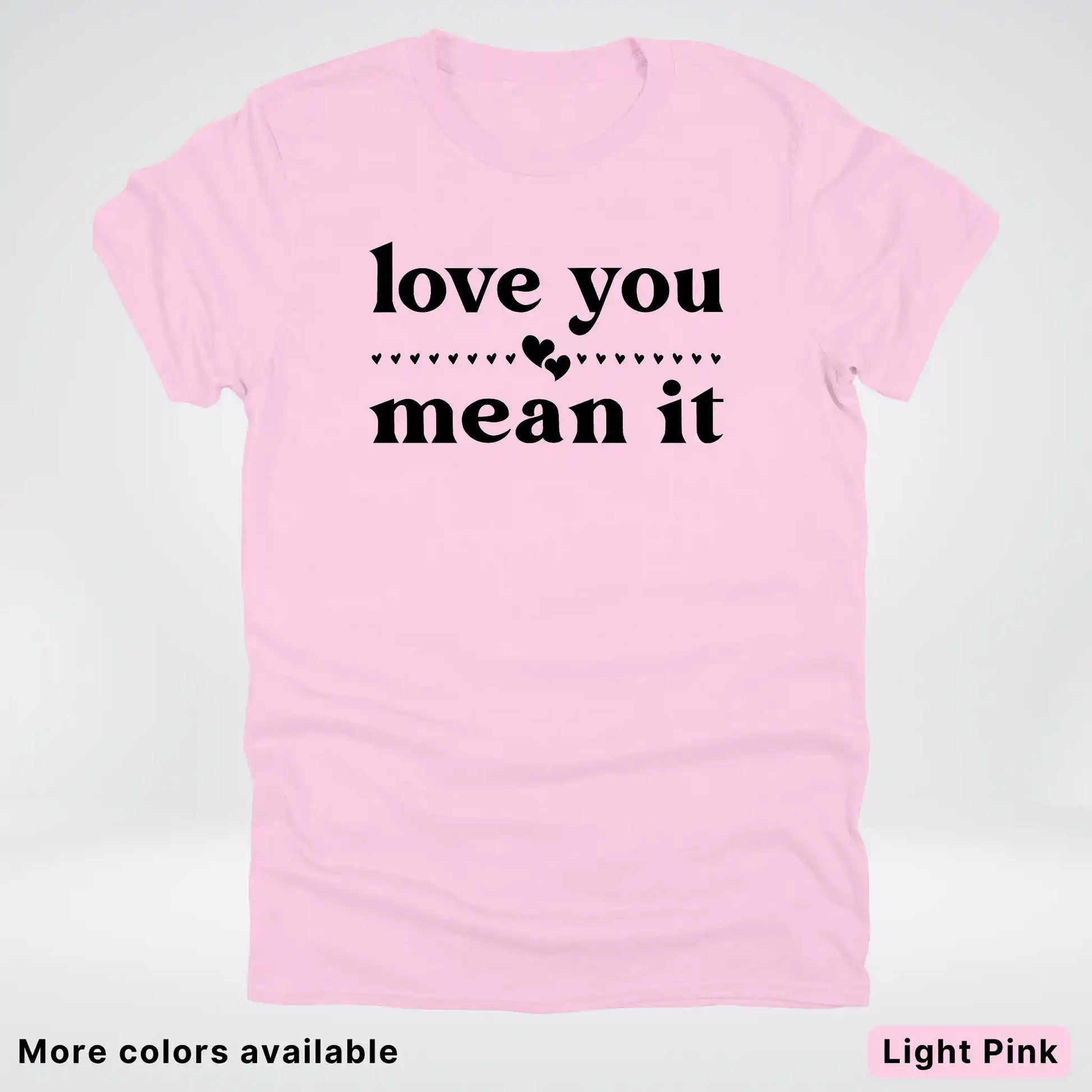 Express your affection with style in this classic black tee featuring a bold "Love You Mean It" design. Perfect for sharing genuine feelings with someone special, this comfortable everyday shirt combines heartfelt messaging with timeless appeal. Whether you're gifting it to a loved one or keeping it for yourself, this piece serves as a wearable reminder that true love deserves to be said—and meant. Soft, versatile, and ready to become a wardrobe favorite.