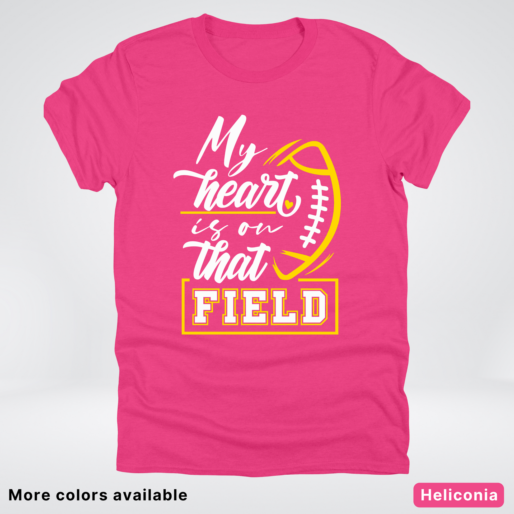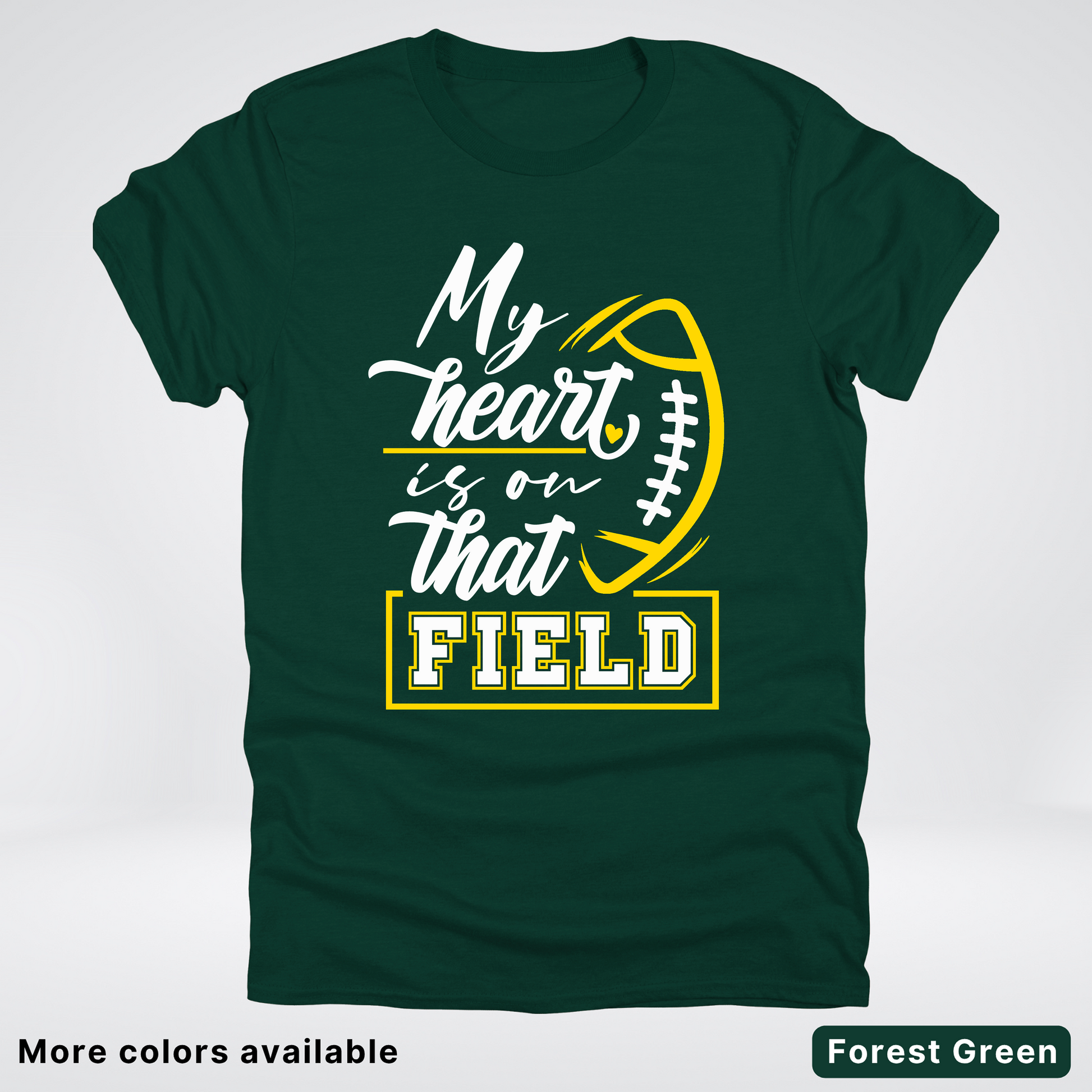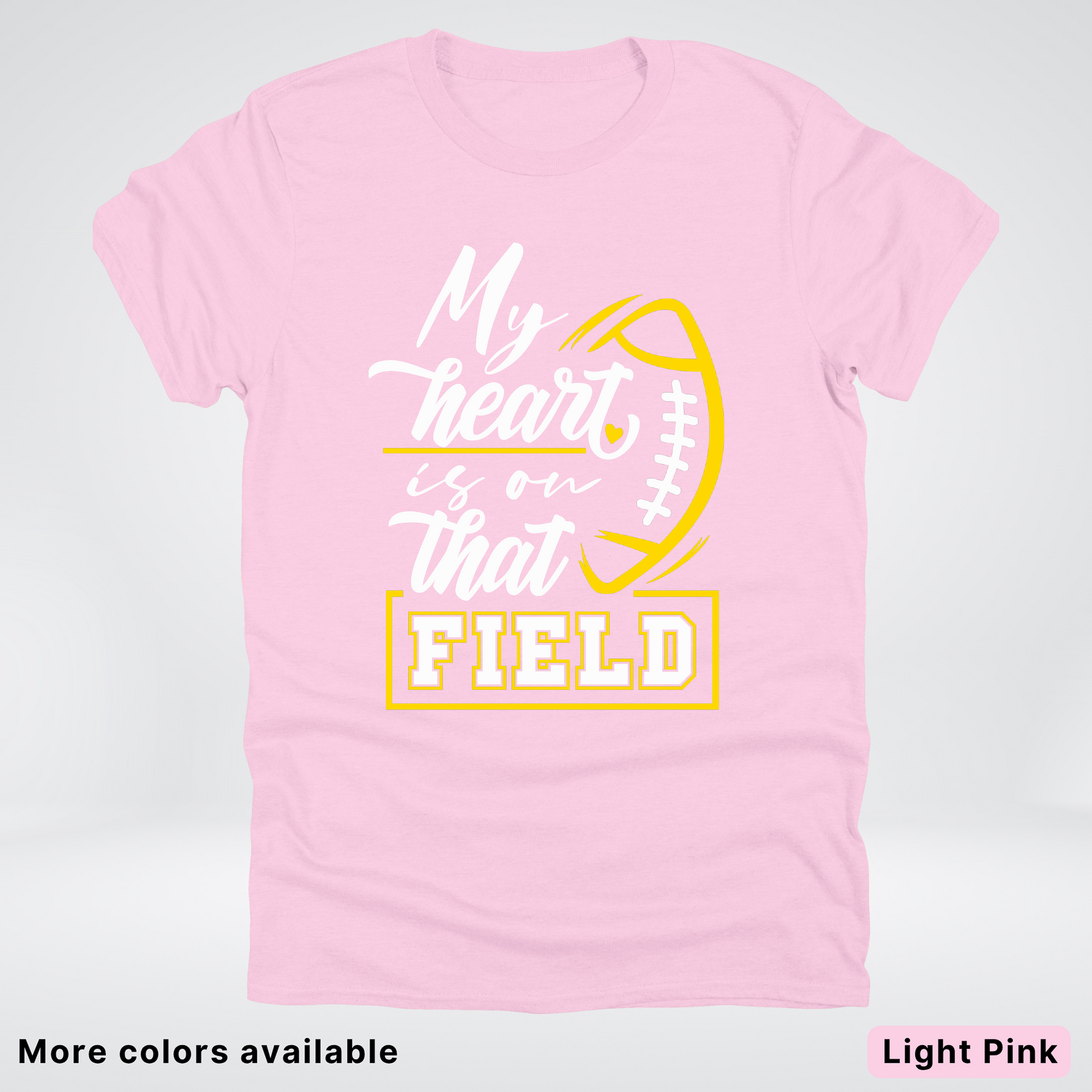 Show your passion with the "My Heart Is On That Field" gold design t-shirt. Perfect for sports fans and proud supporters, this tee combines comfort with a bold statement. Whether cheering from the stands or hanging out, its vibrant gold print keeps your love for the game shining bright. Wear your heart—and your team spirit—right on your sleeve!