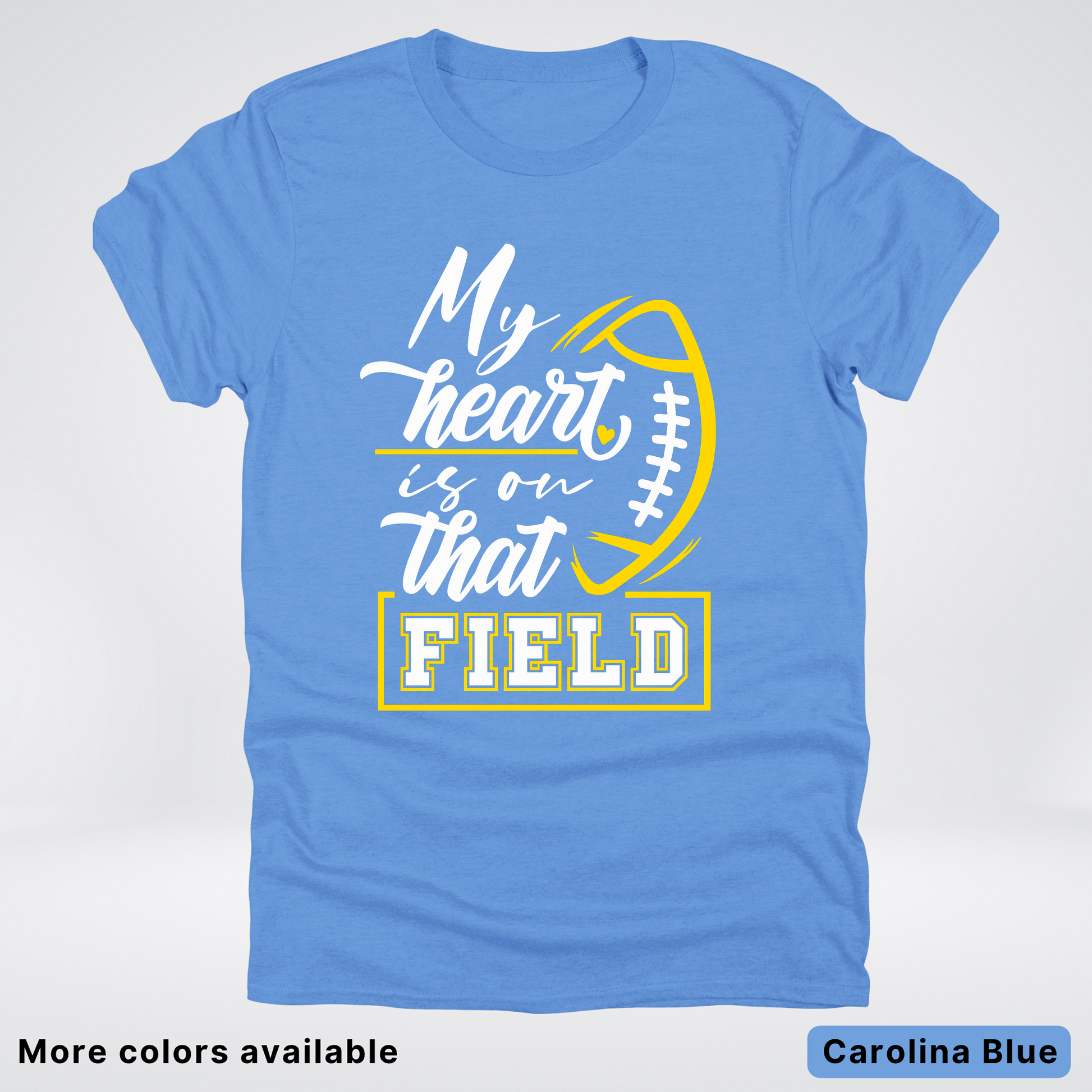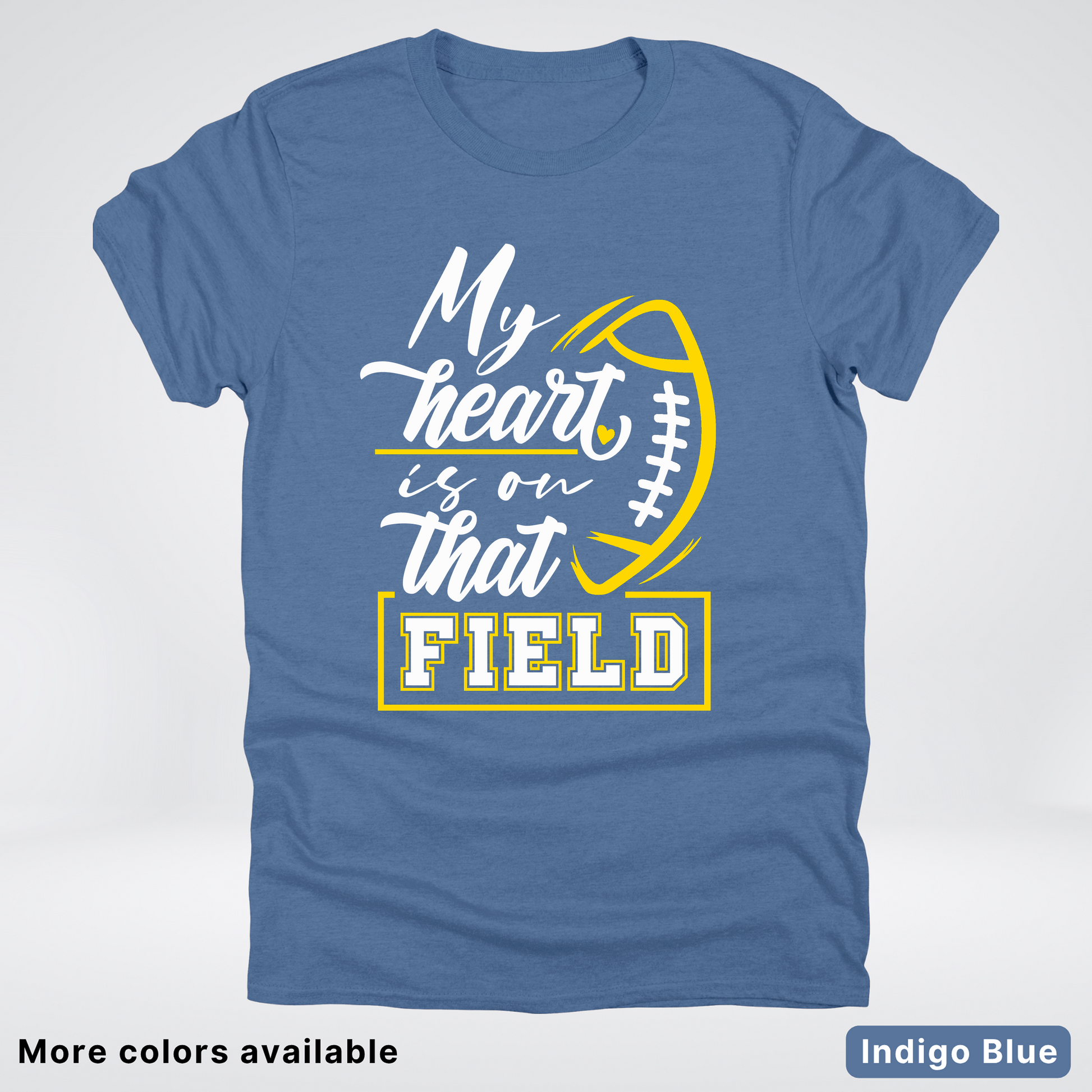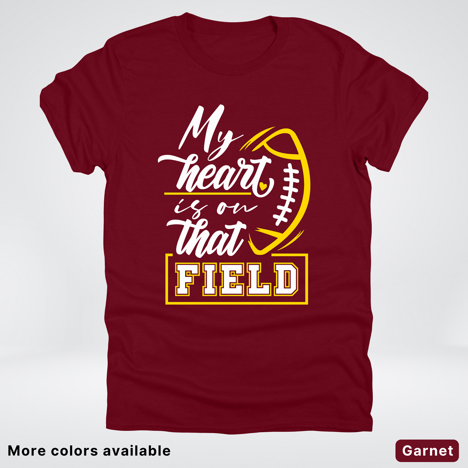 Show your passion with the "My Heart Is On That Field" gold design t-shirt. Perfect for sports fans and proud supporters, this tee combines comfort with a bold statement. Whether cheering from the stands or hanging out, its vibrant gold print keeps your love for the game shining bright. Wear your heart—and your team spirit—right on your sleeve!
