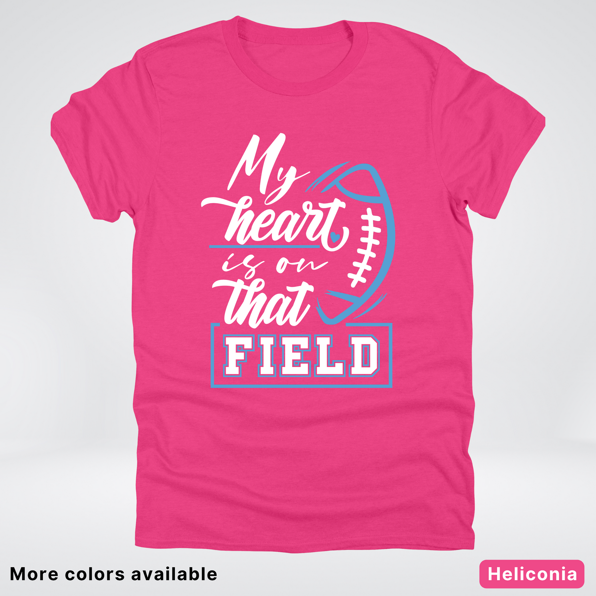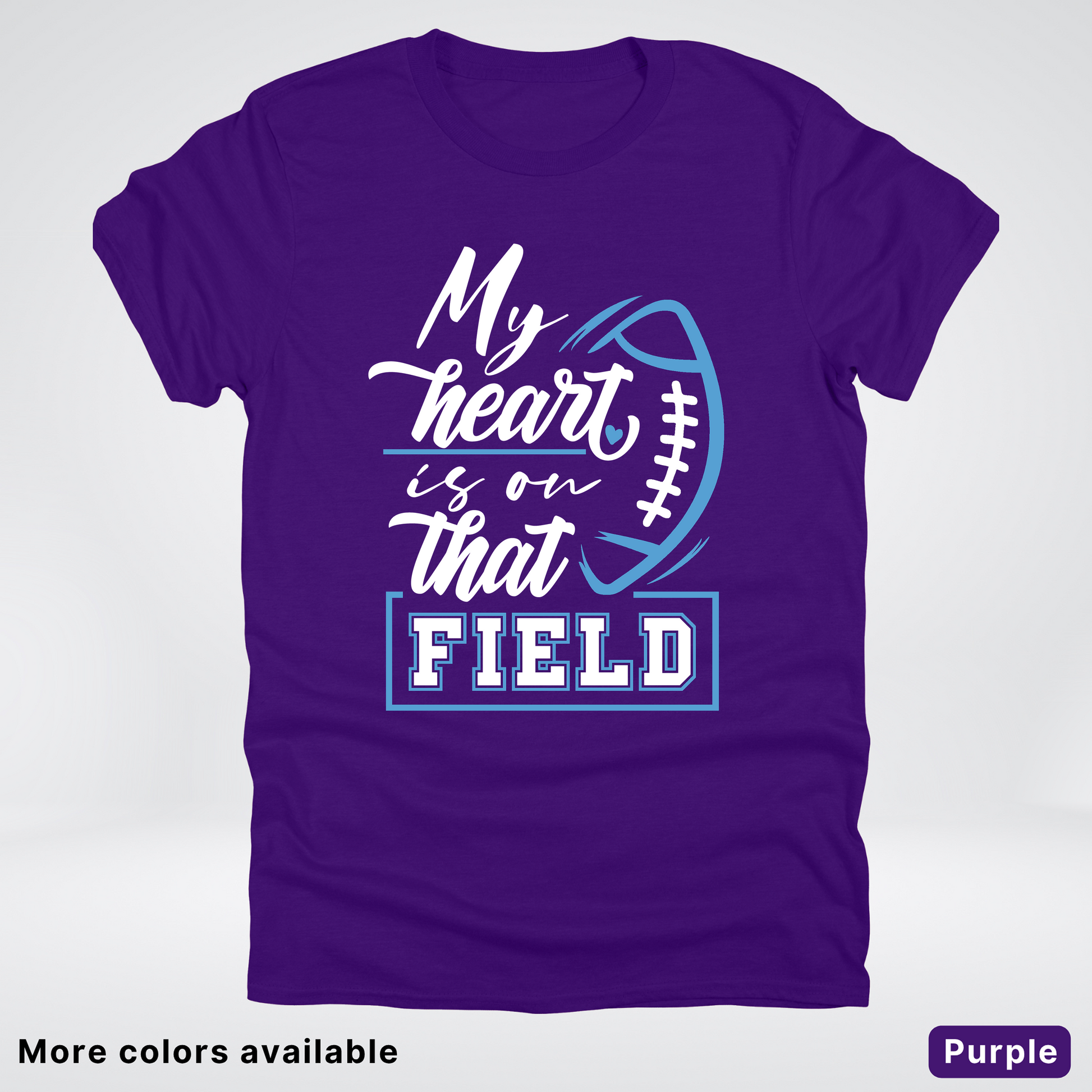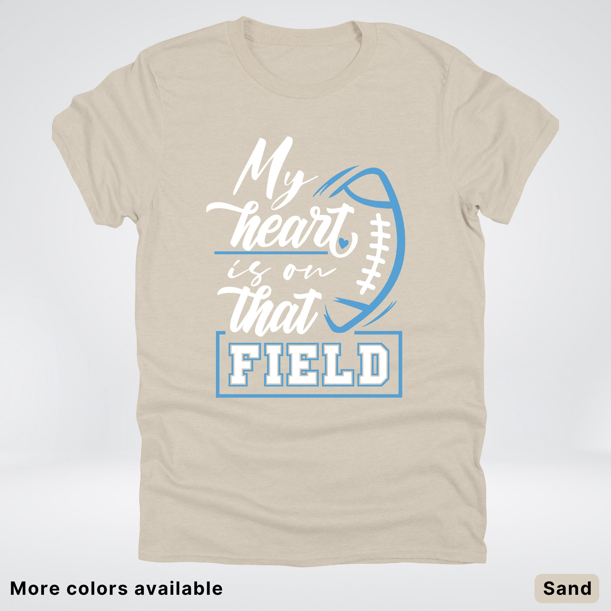 Show your passion for the game with this playful light blue "My Heart Is On That Field" t-shirt. Perfect for cheering from the sidelines or casual wear, its vibrant design lets everyone know where your heart truly belongs. Comfortable and stylish, this tee adds a fun touch to your game day gear.