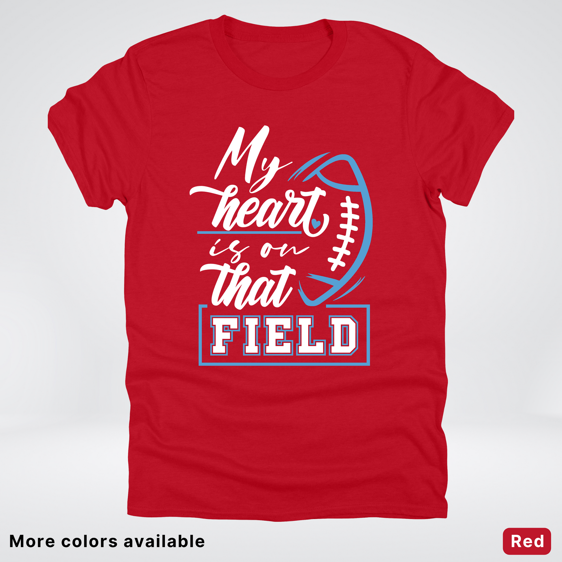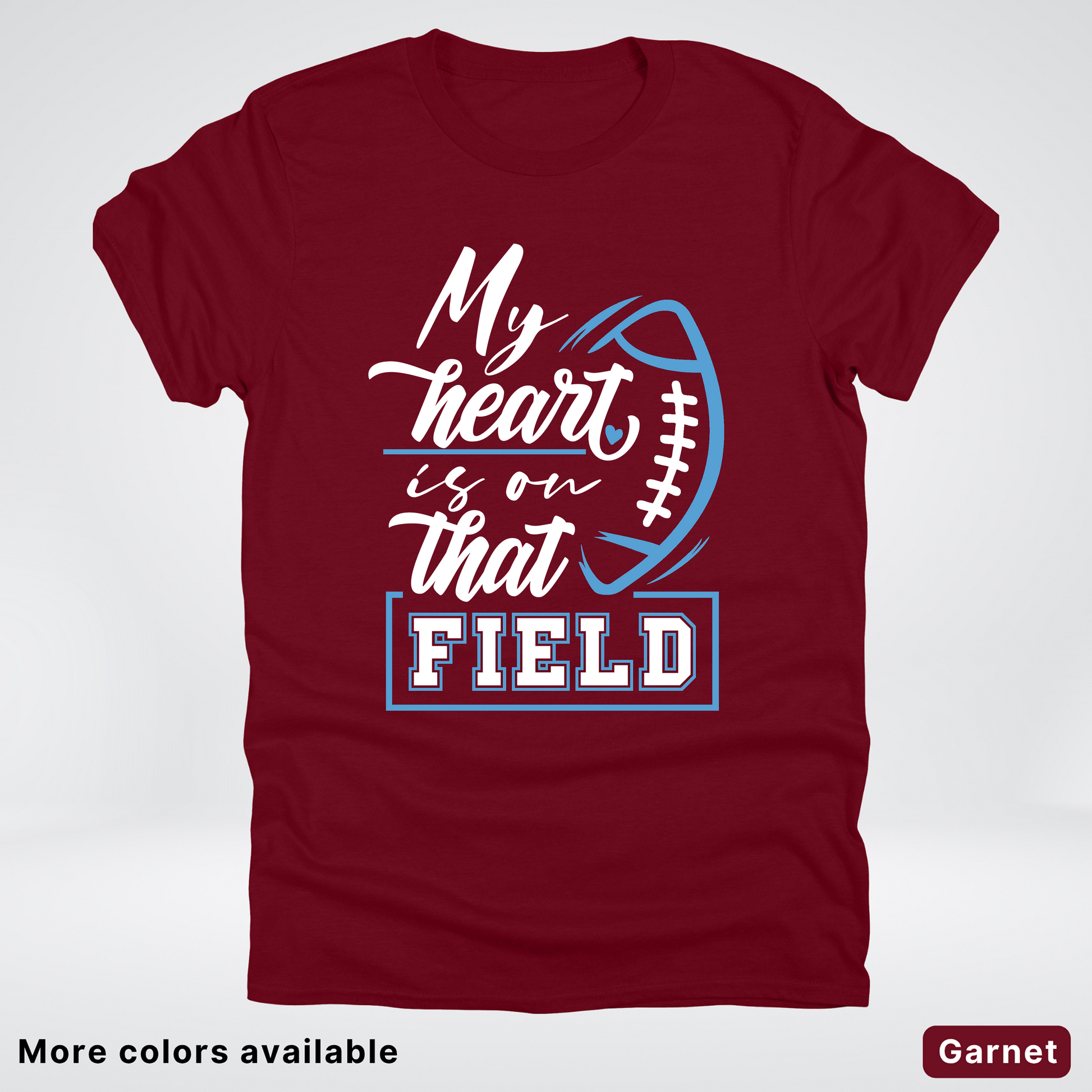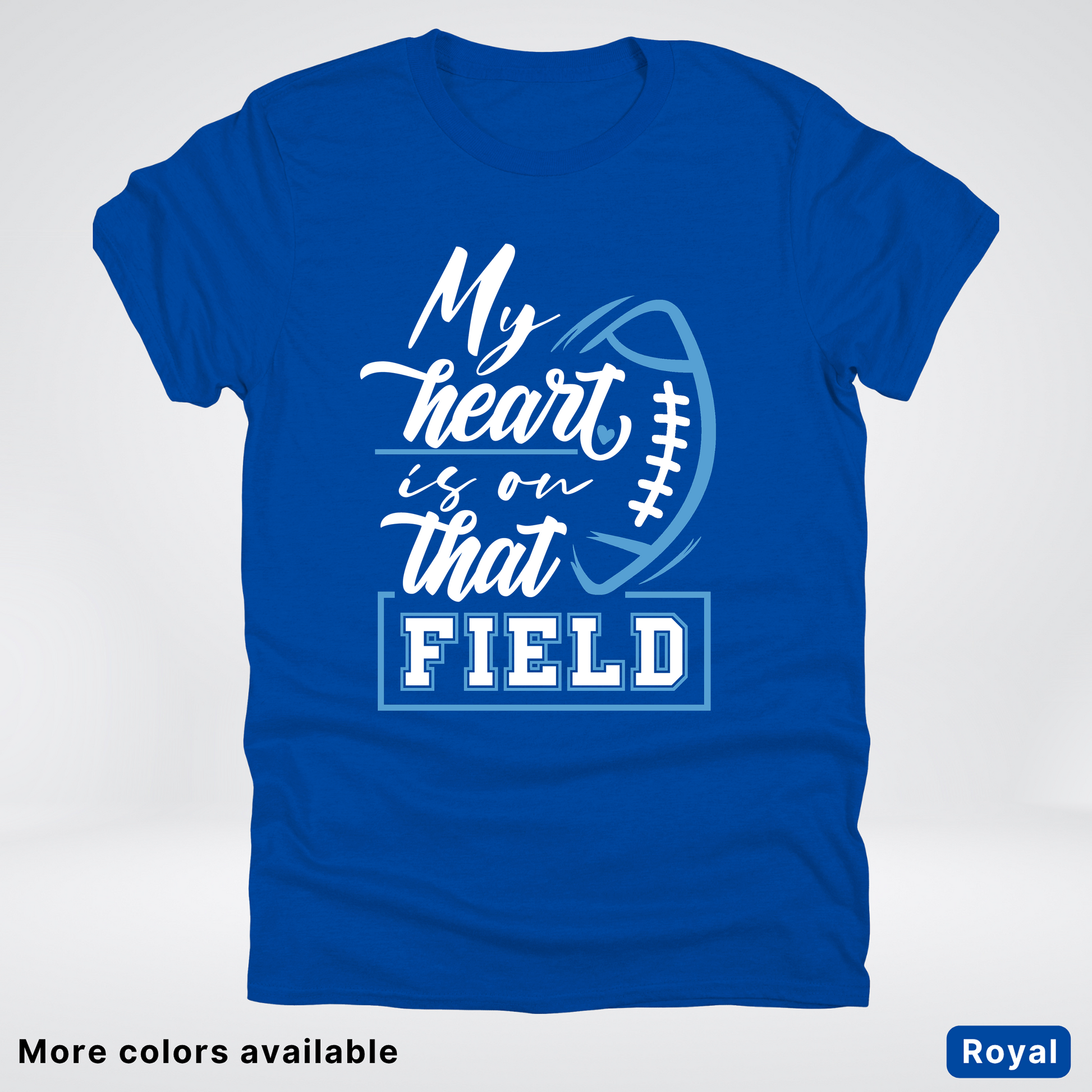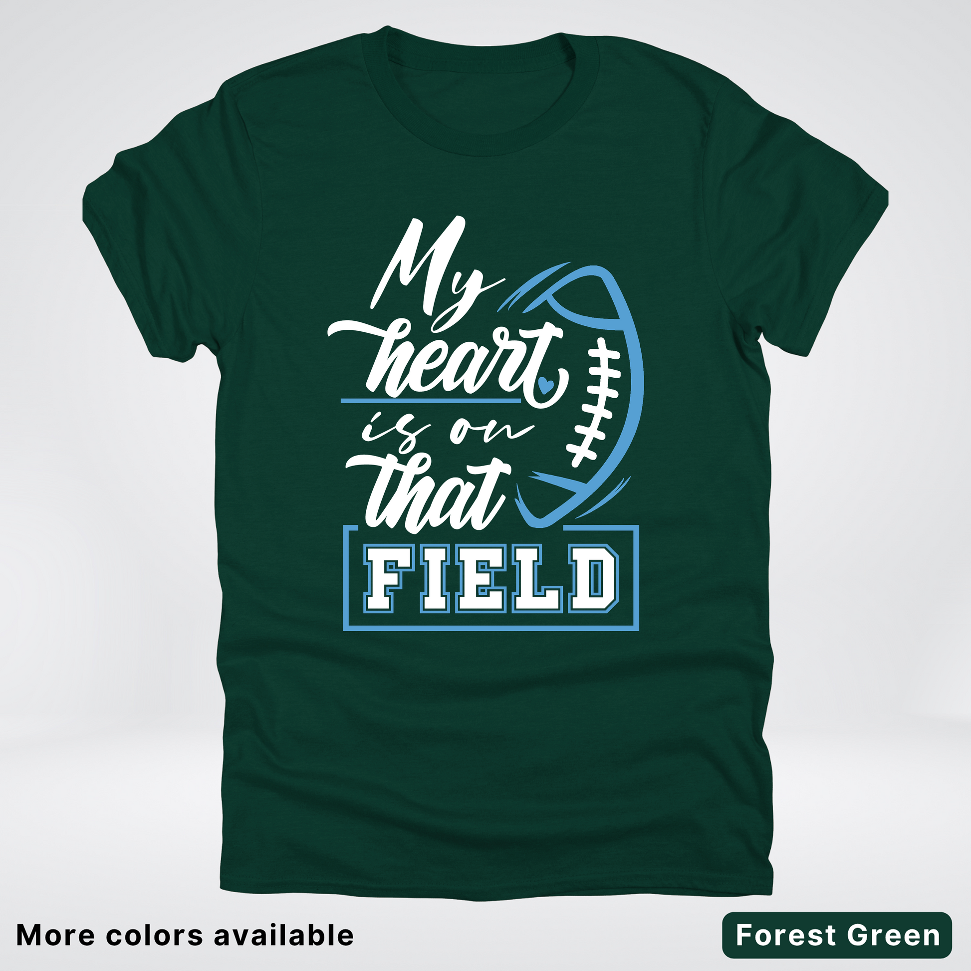 Show your passion for the game with this playful light blue "My Heart Is On That Field" t-shirt. Perfect for cheering from the sidelines or casual wear, its vibrant design lets everyone know where your heart truly belongs. Comfortable and stylish, this tee adds a fun touch to your game day gear.