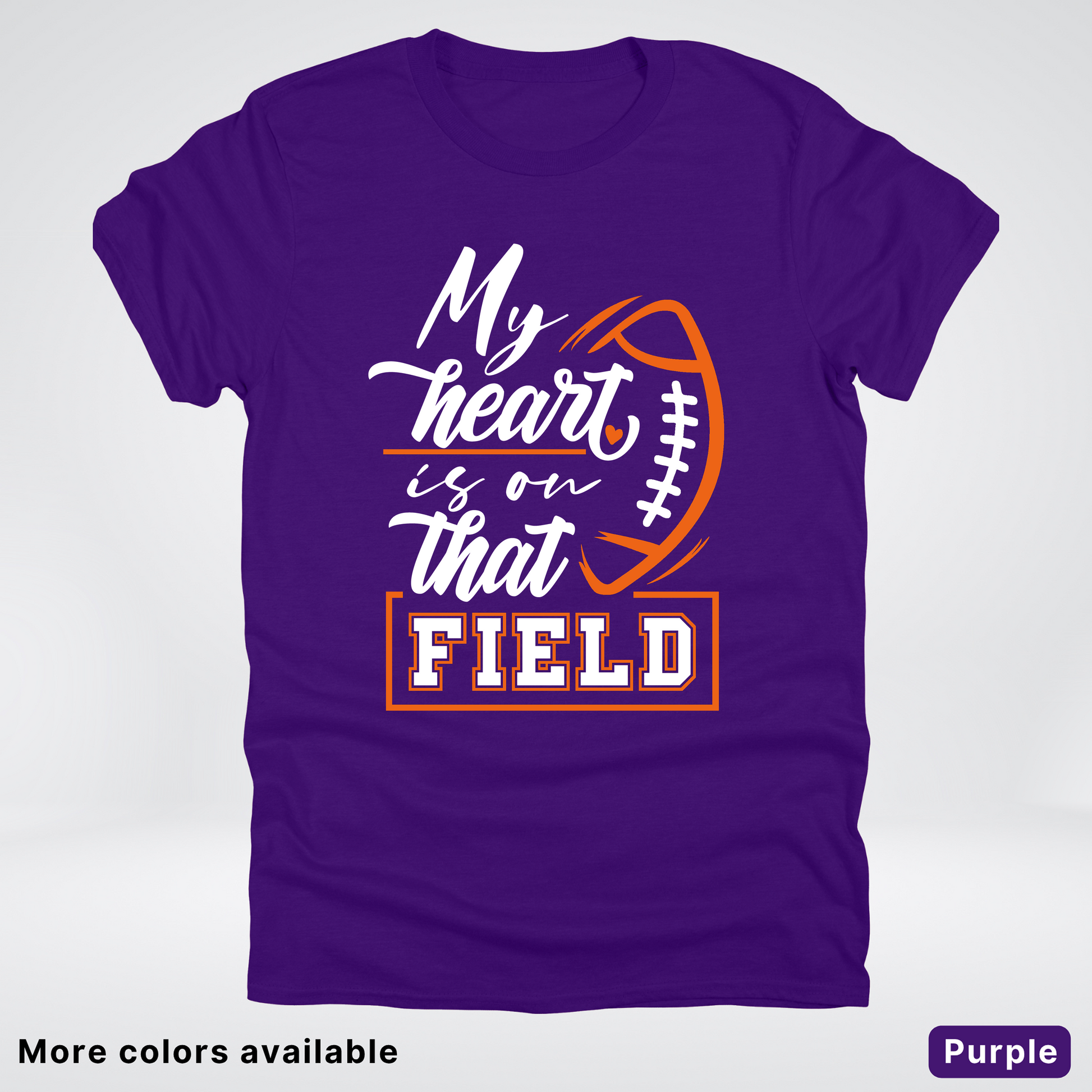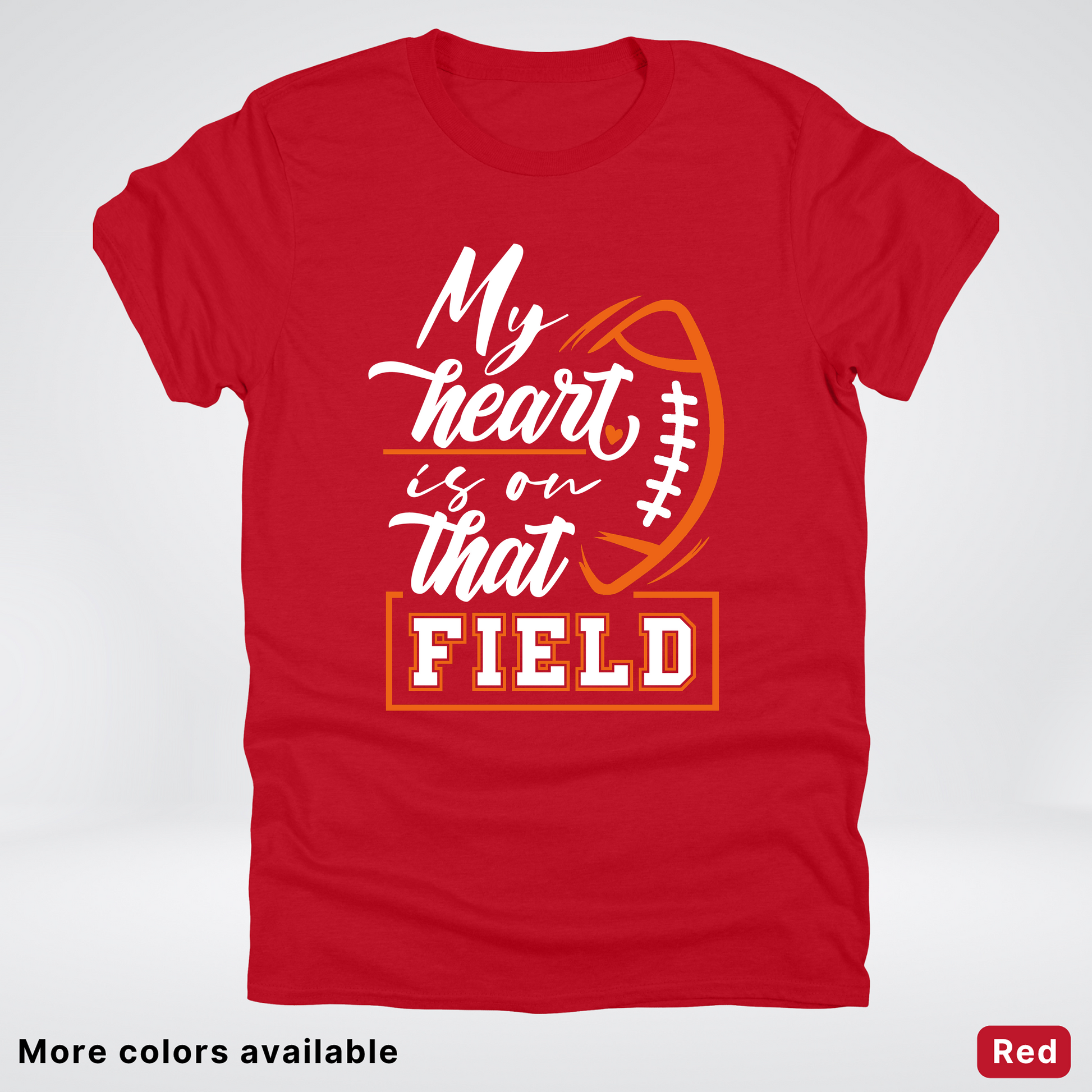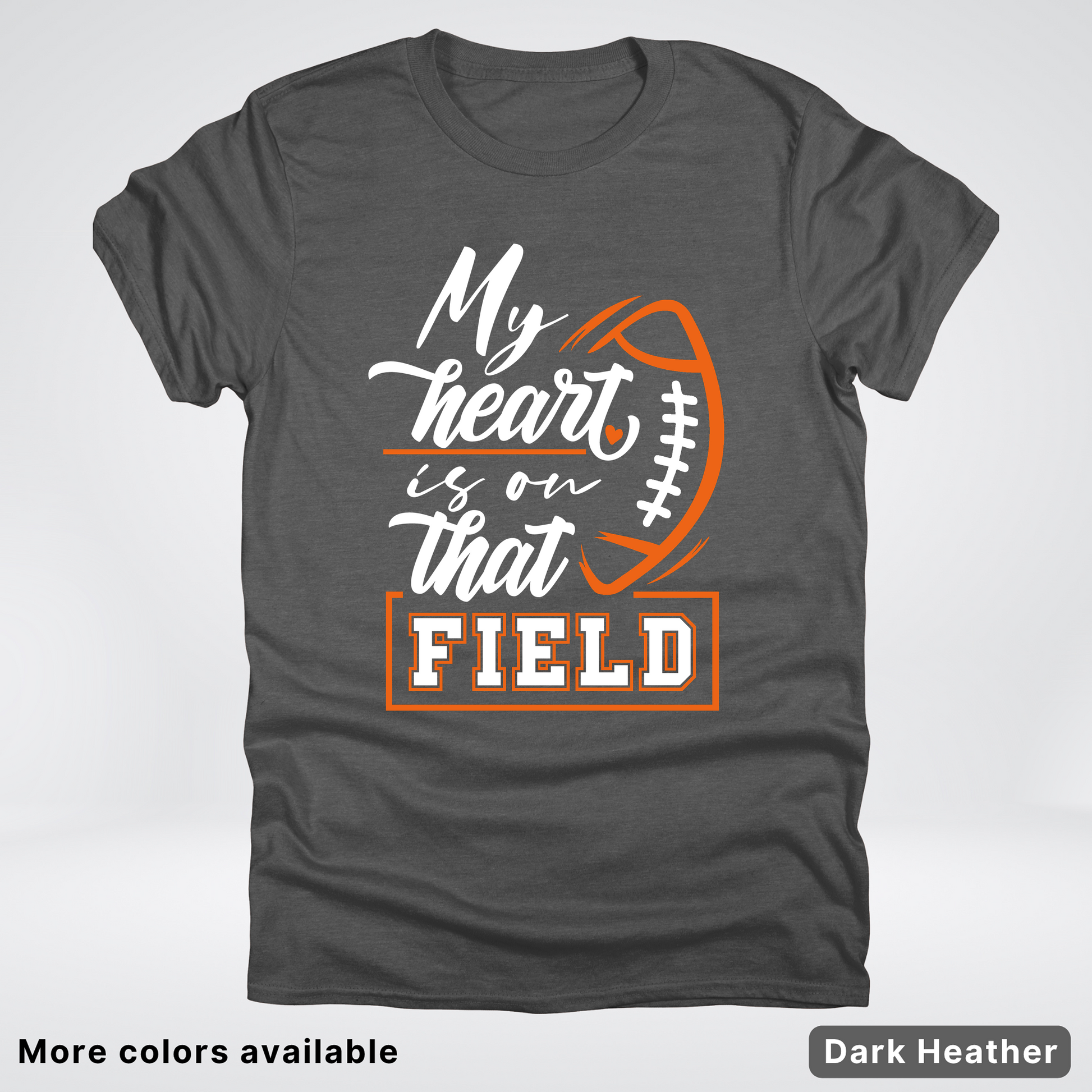 Show your love for the game with this vibrant orange "My Heart Is On That Field" T-shirt. Perfect for fans and players alike, it lets everyone know where your passion lies.