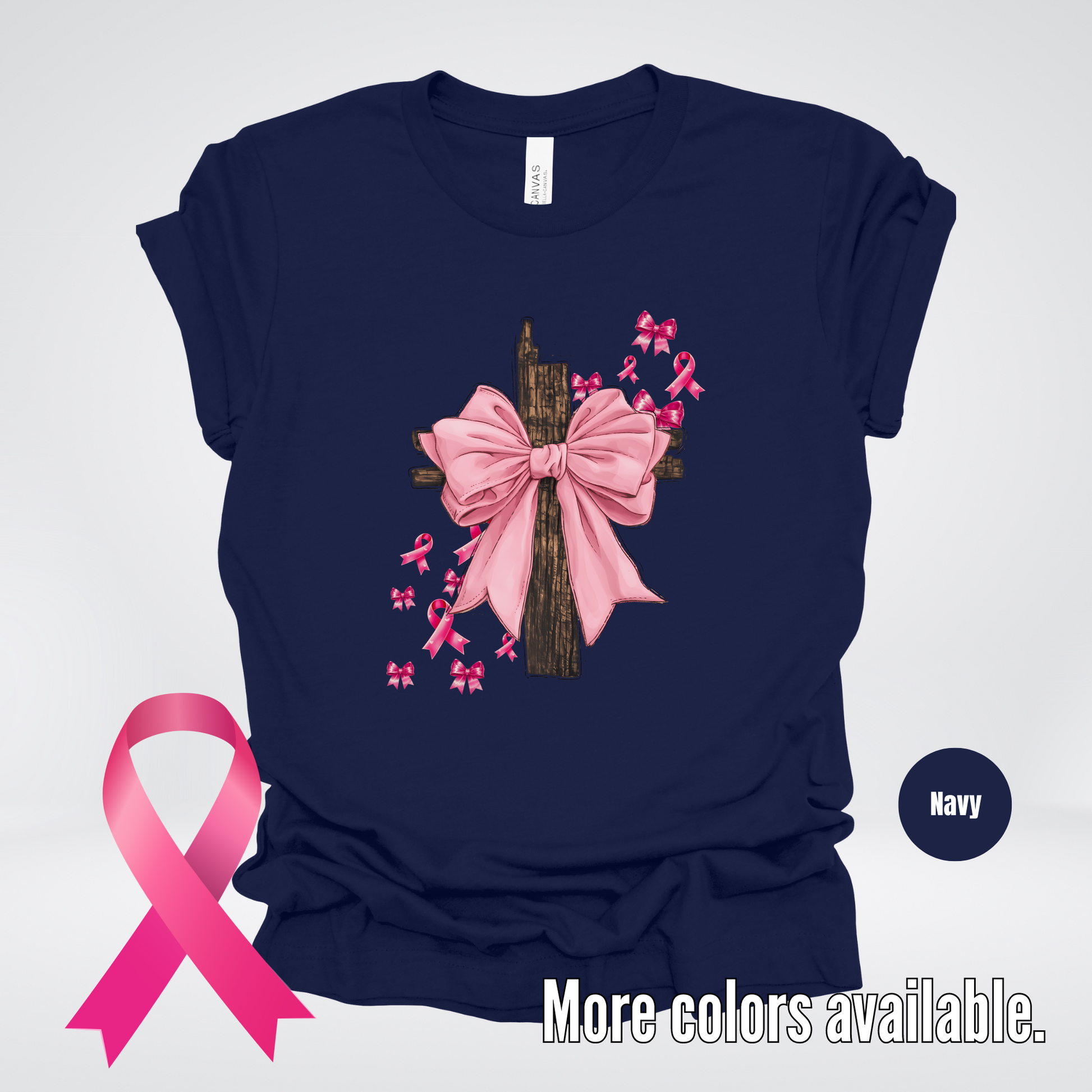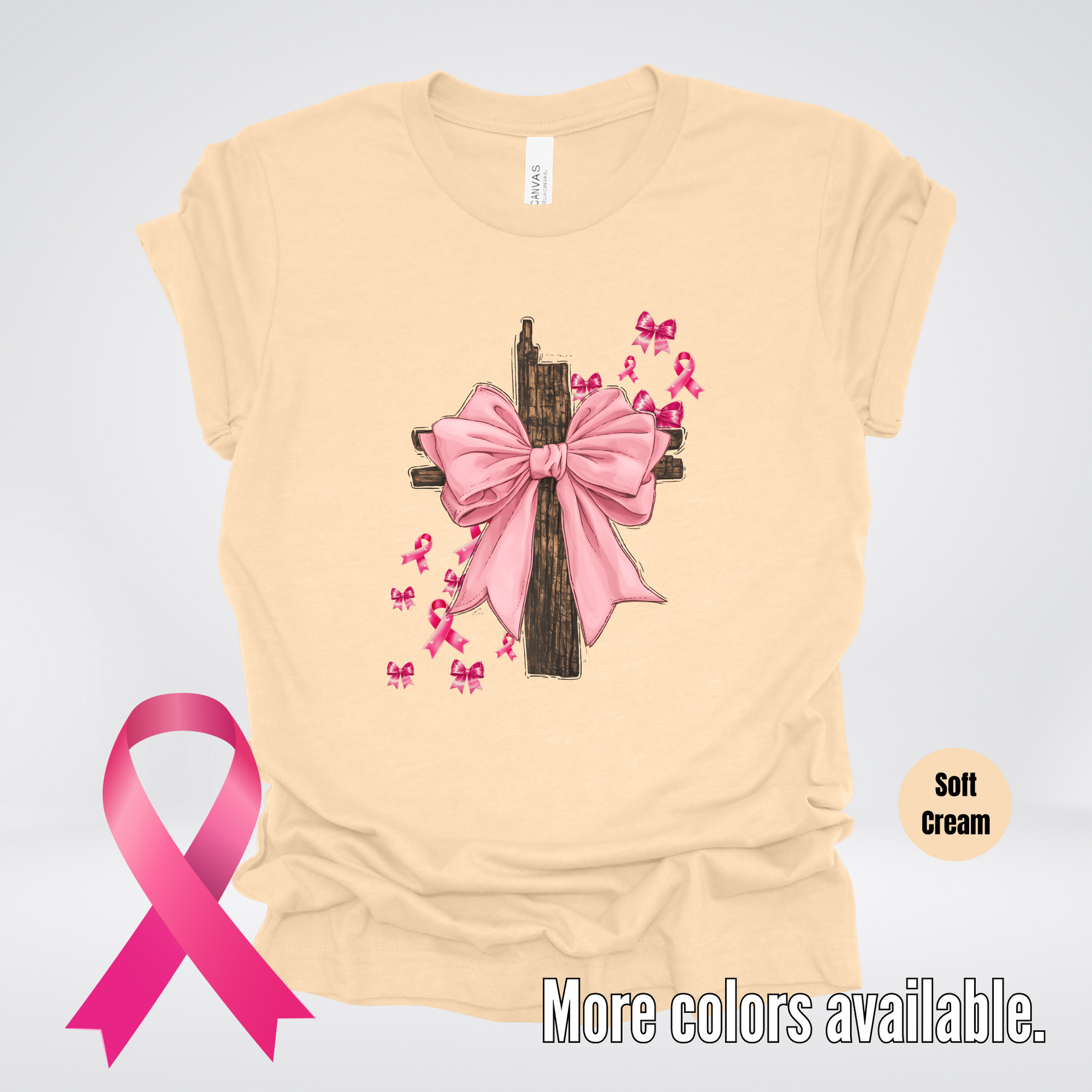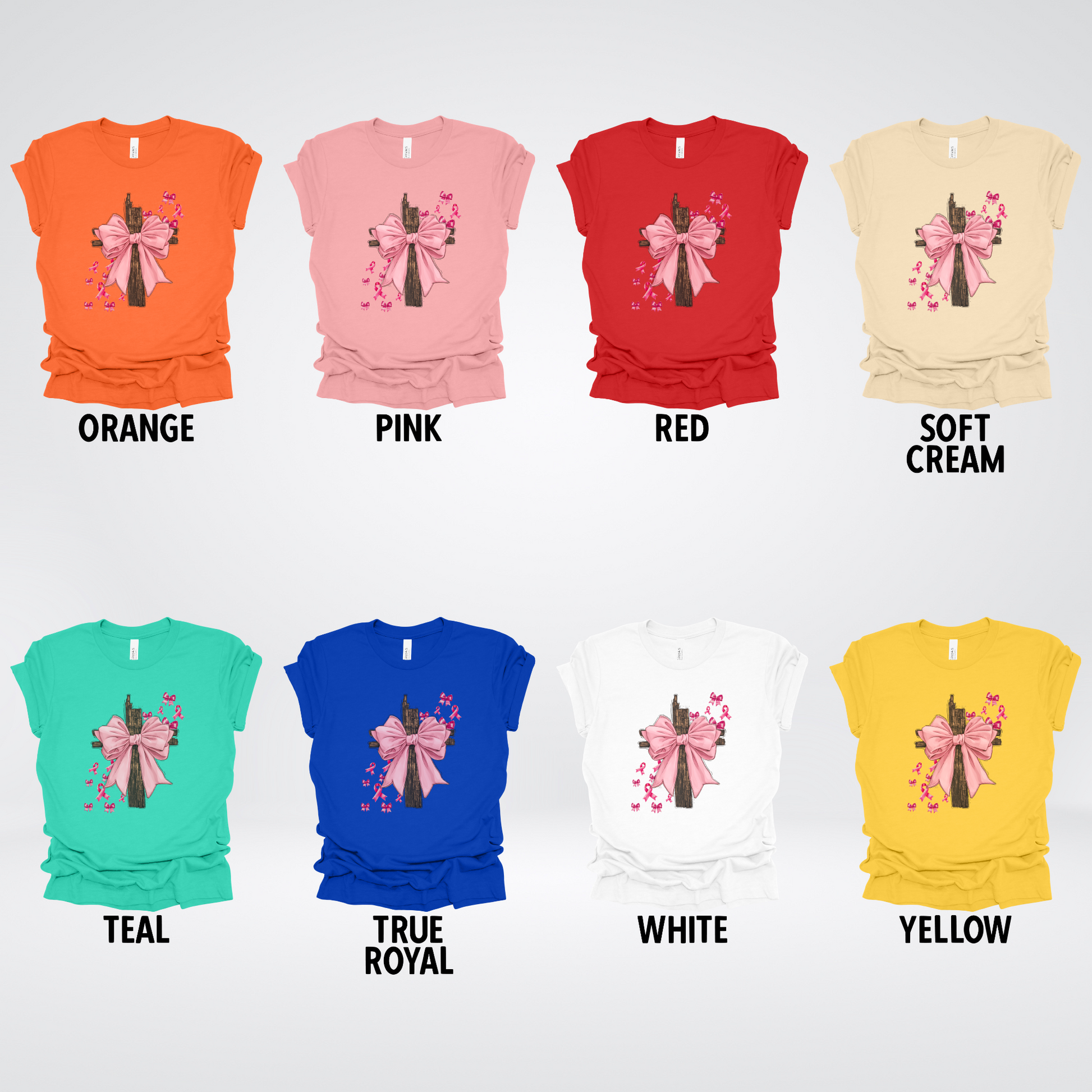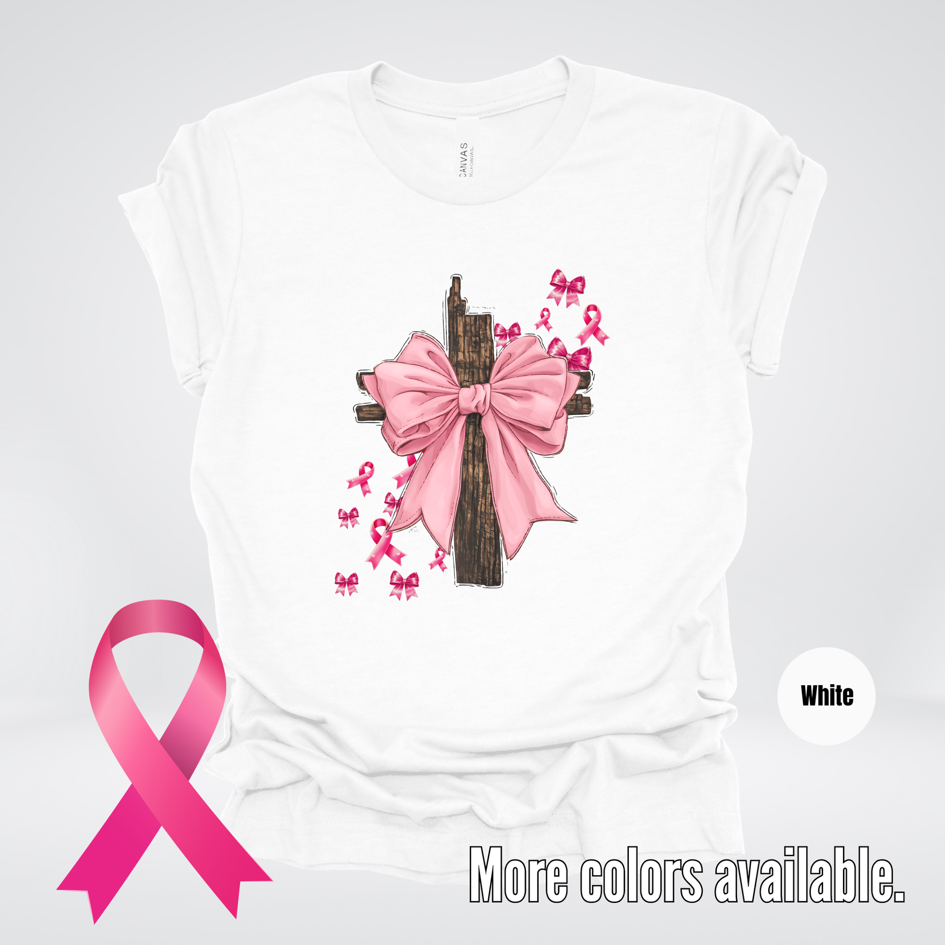Rock your support for breast cancer awareness with our Pink Out Coquette Cross T-Shirt! This quirky tee features a bold pink cross design, making a statement while showing your solidarity. 100% of profits go towards breast cancer research. Join the fight and look stylish doing it!