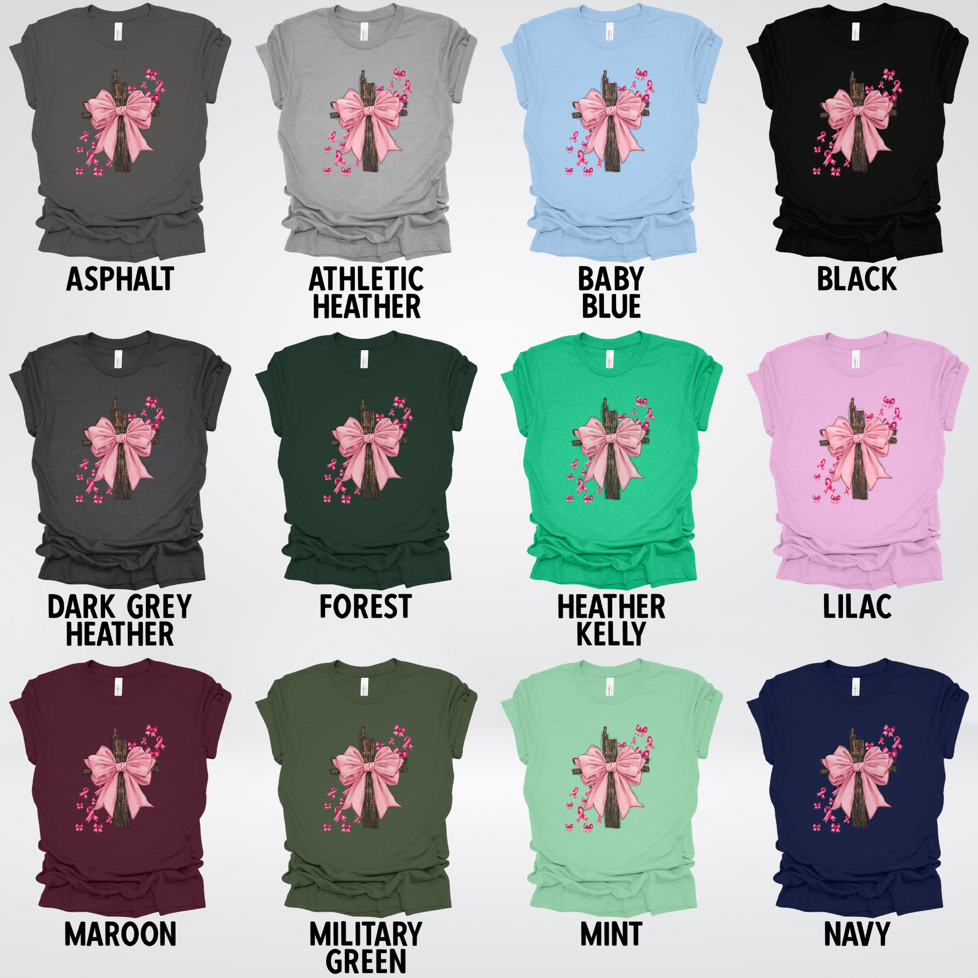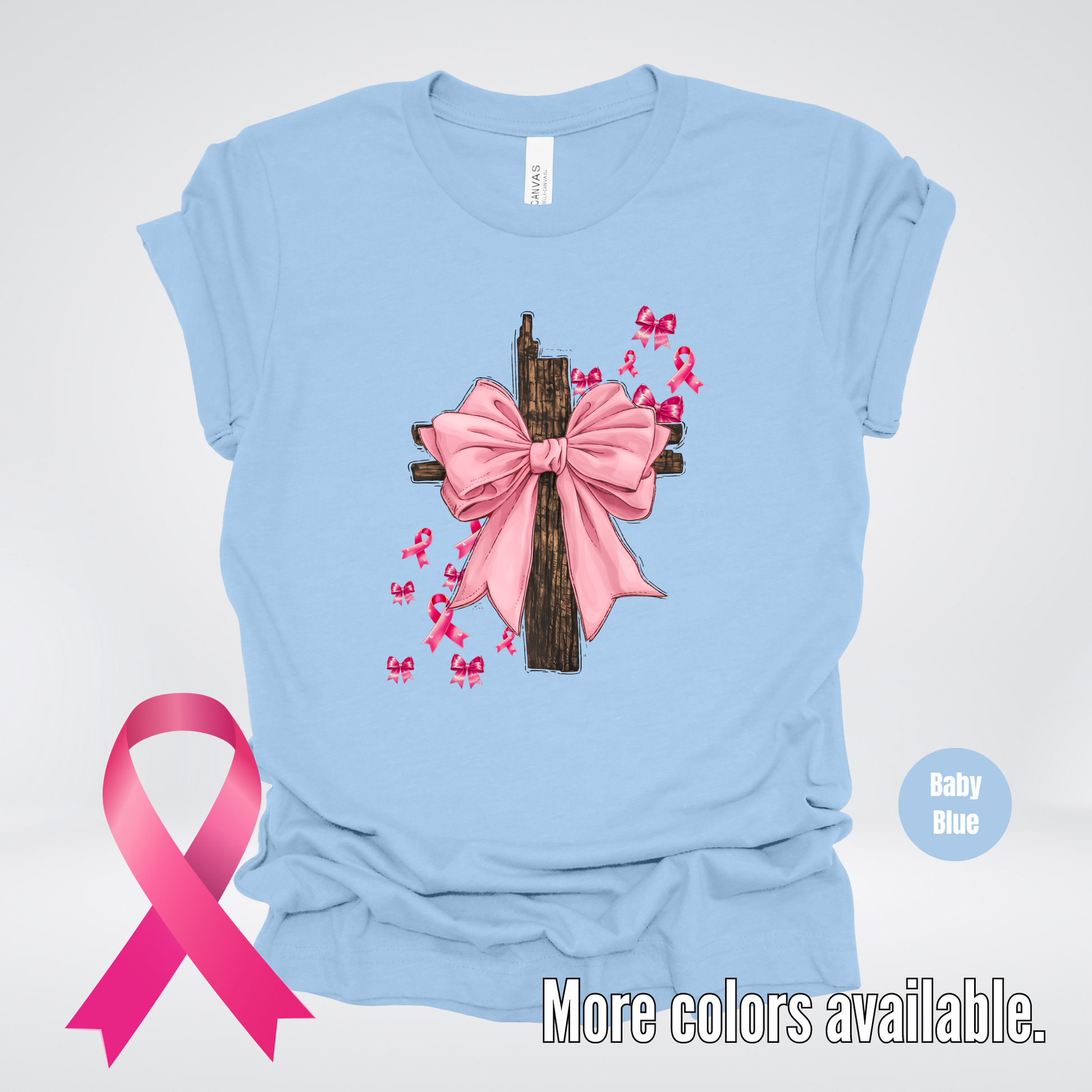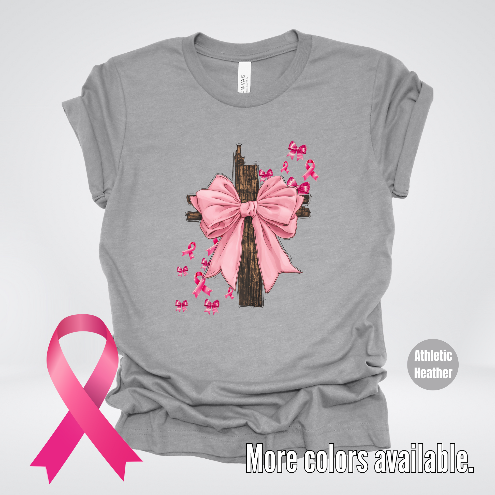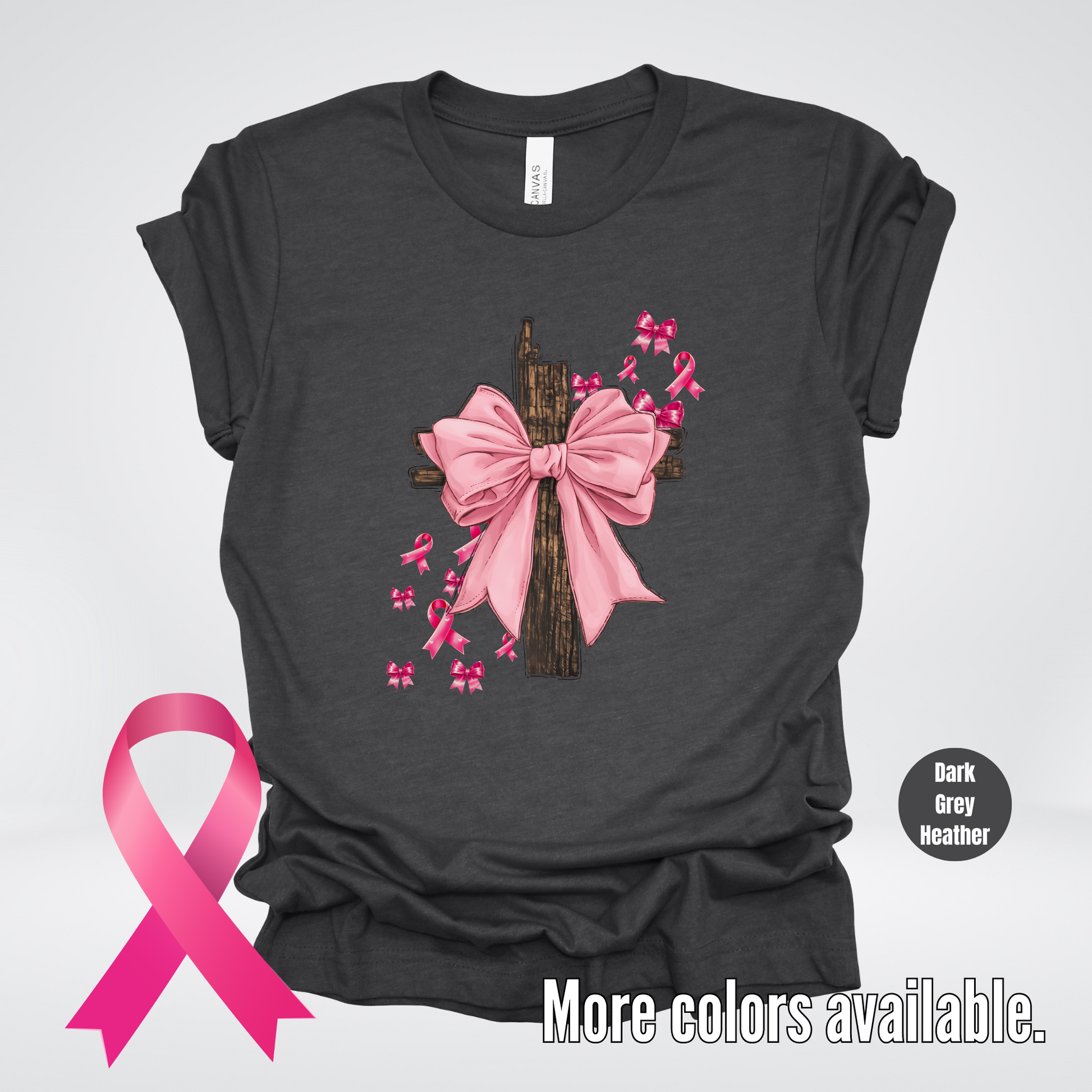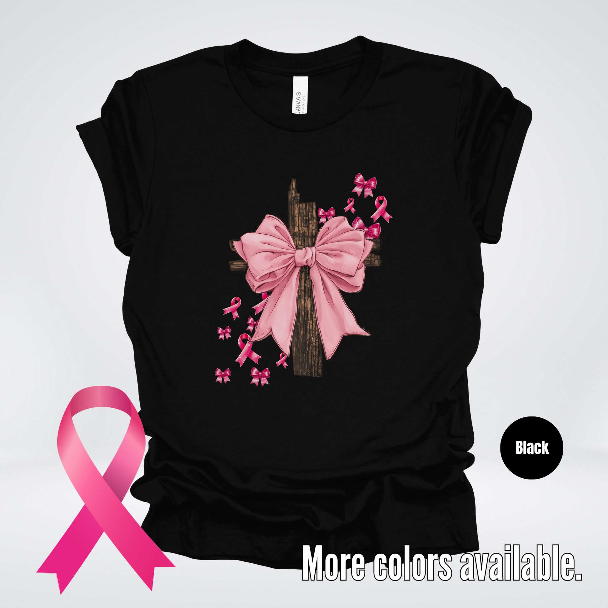 Rock your support for breast cancer awareness with our Pink Out Coquette Cross T-Shirt! This quirky tee features a bold pink cross design, making a statement while showing your solidarity. 100% of profits go towards breast cancer research. Join the fight and look stylish doing it!