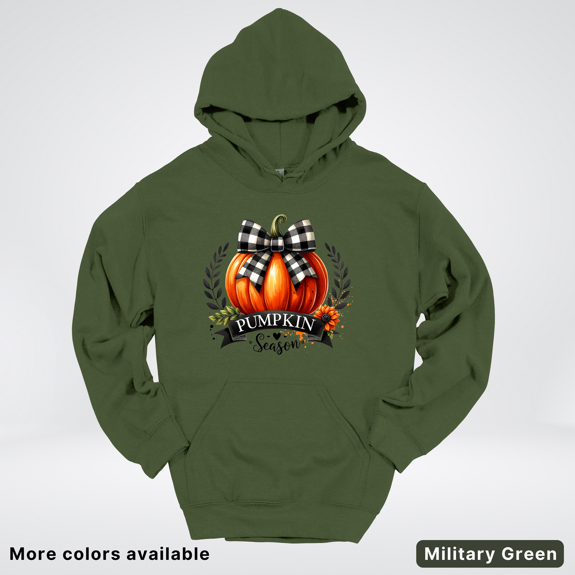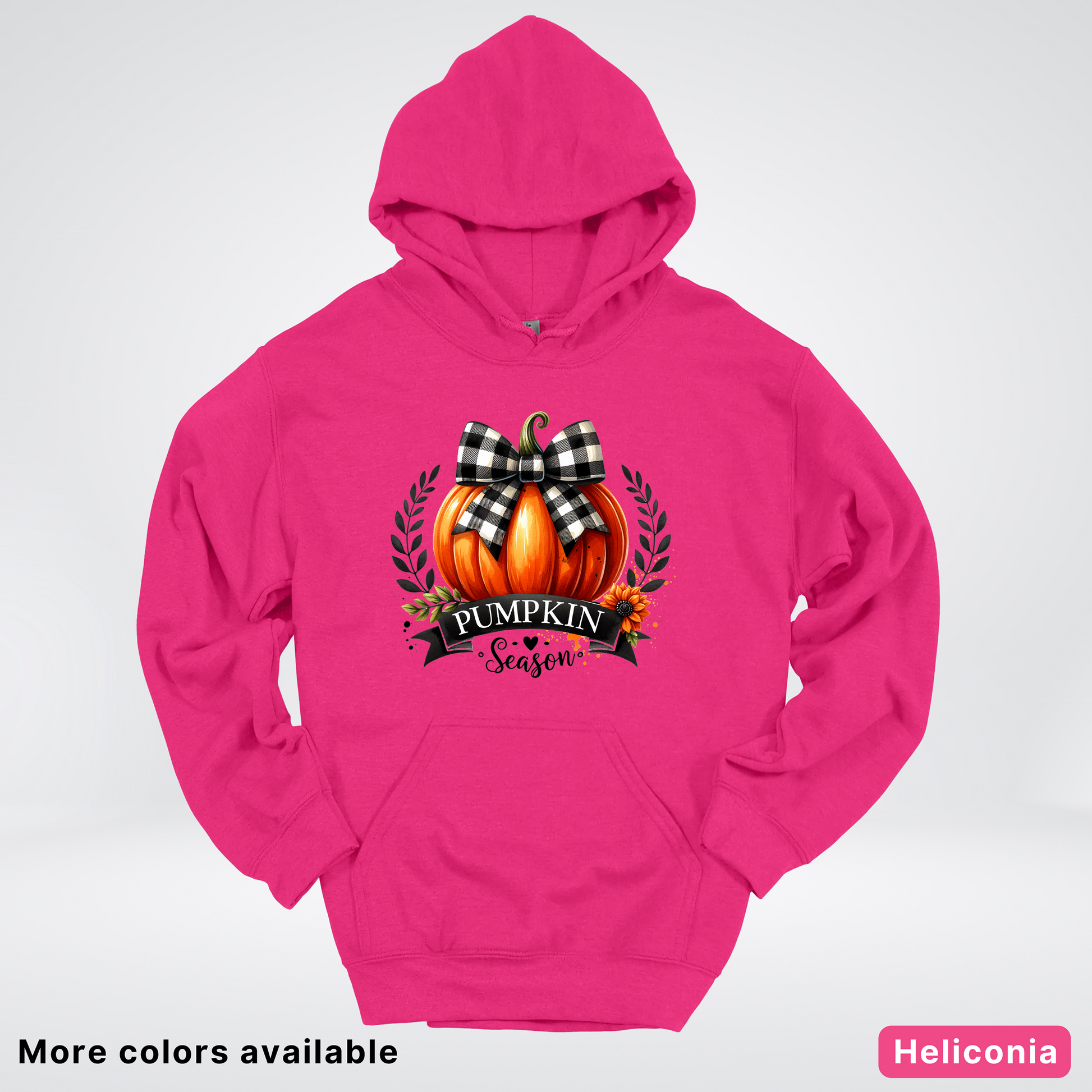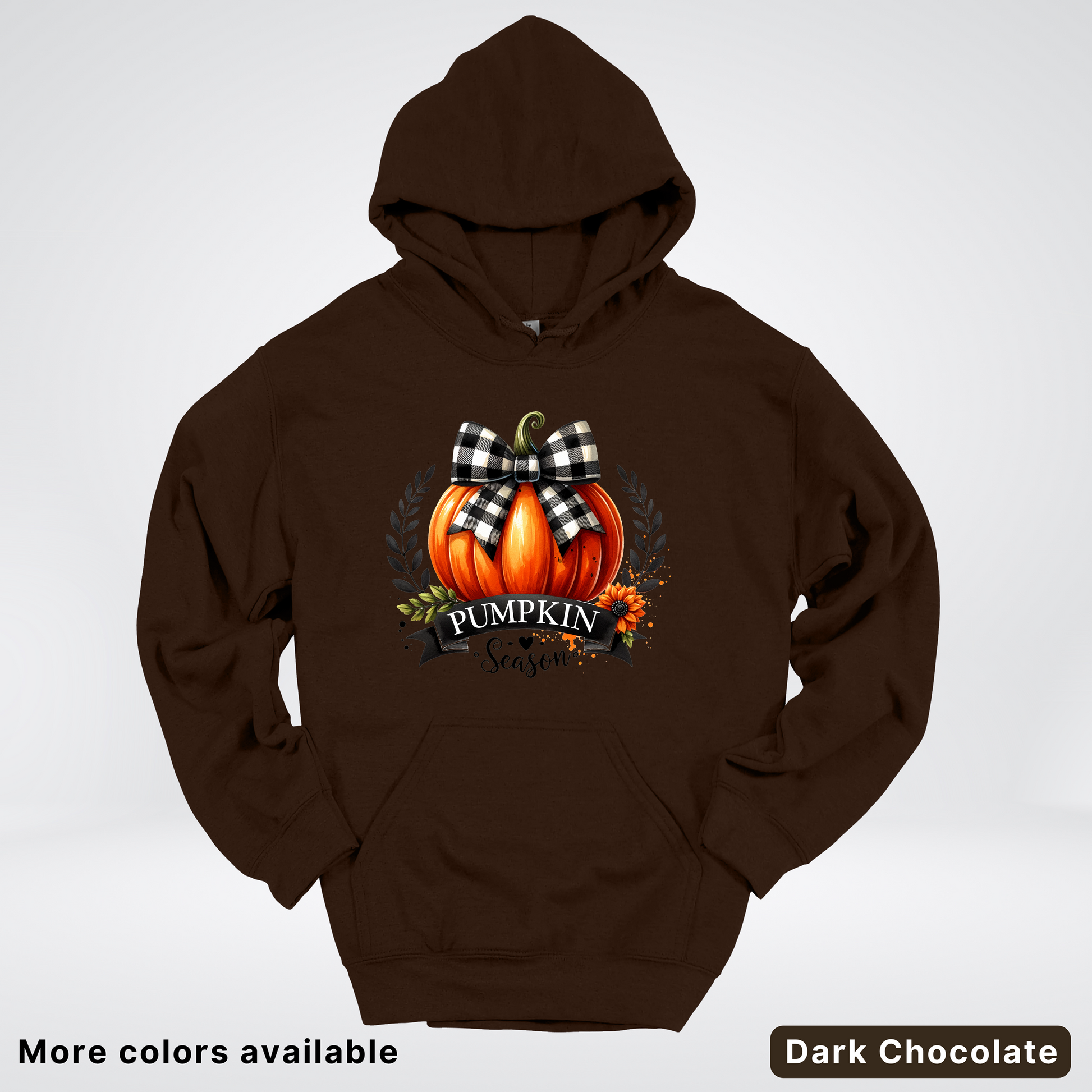 Embrace the cozy vibes of autumn with this charming hoodie featuring a bold black plaid bow design. Perfect for pumpkin season enthusiasts, this piece combines comfort with seasonal style. The soft fabric keeps you warm during crisp fall days, while the eye-catching plaid bow adds a playful touch to your casual wardrobe. Whether you're heading to a harvest festival or settling in for a quiet evening, this hoodie delivers both warmth and personality in one versatile piece.