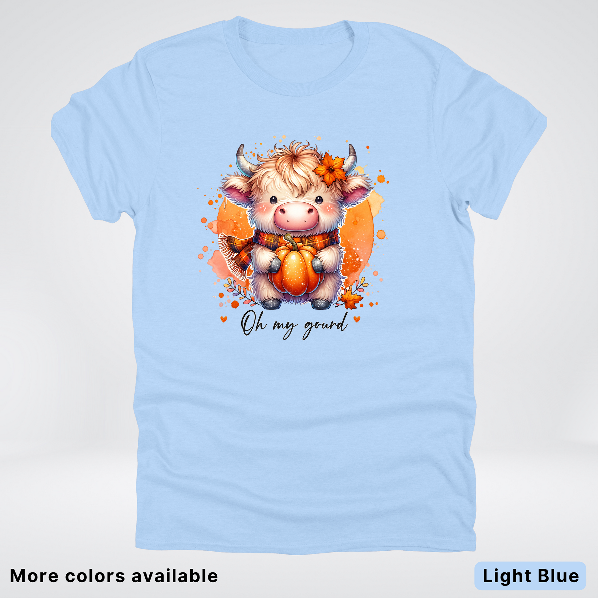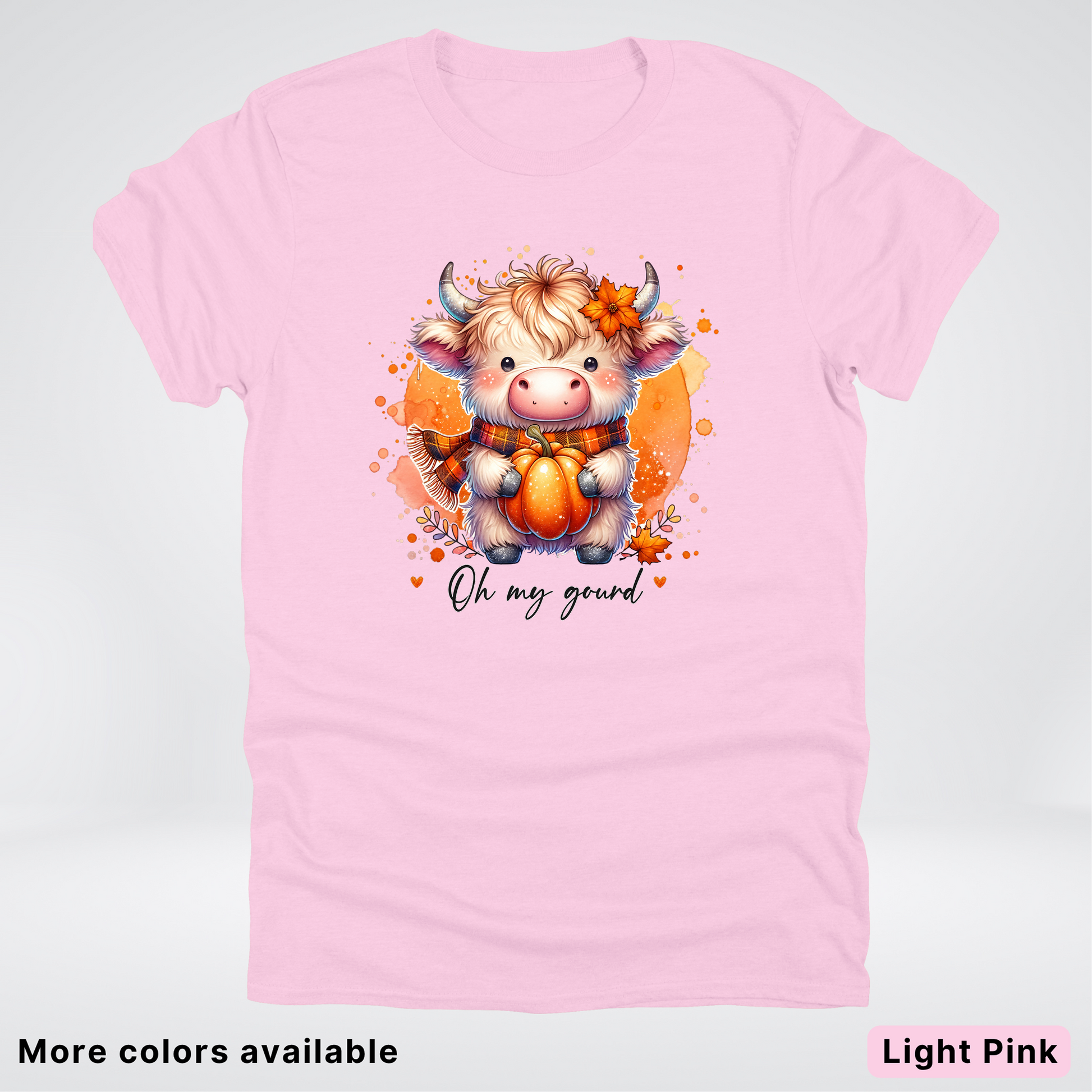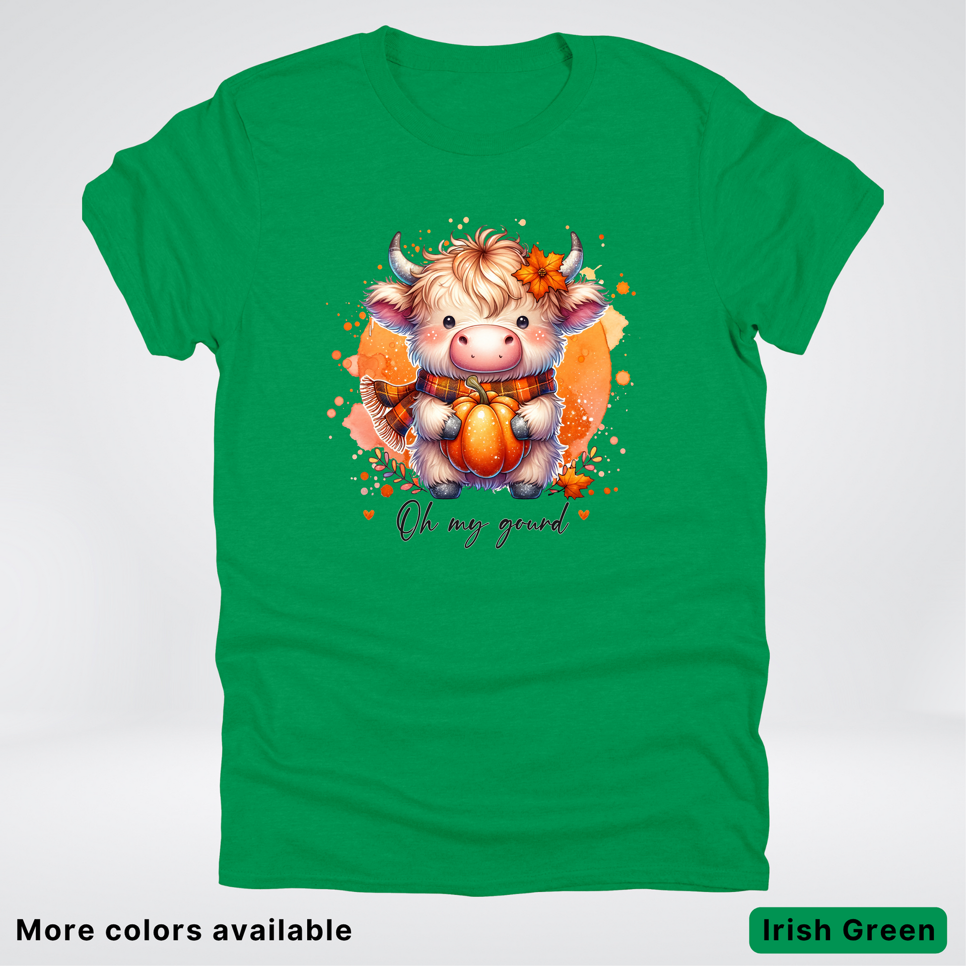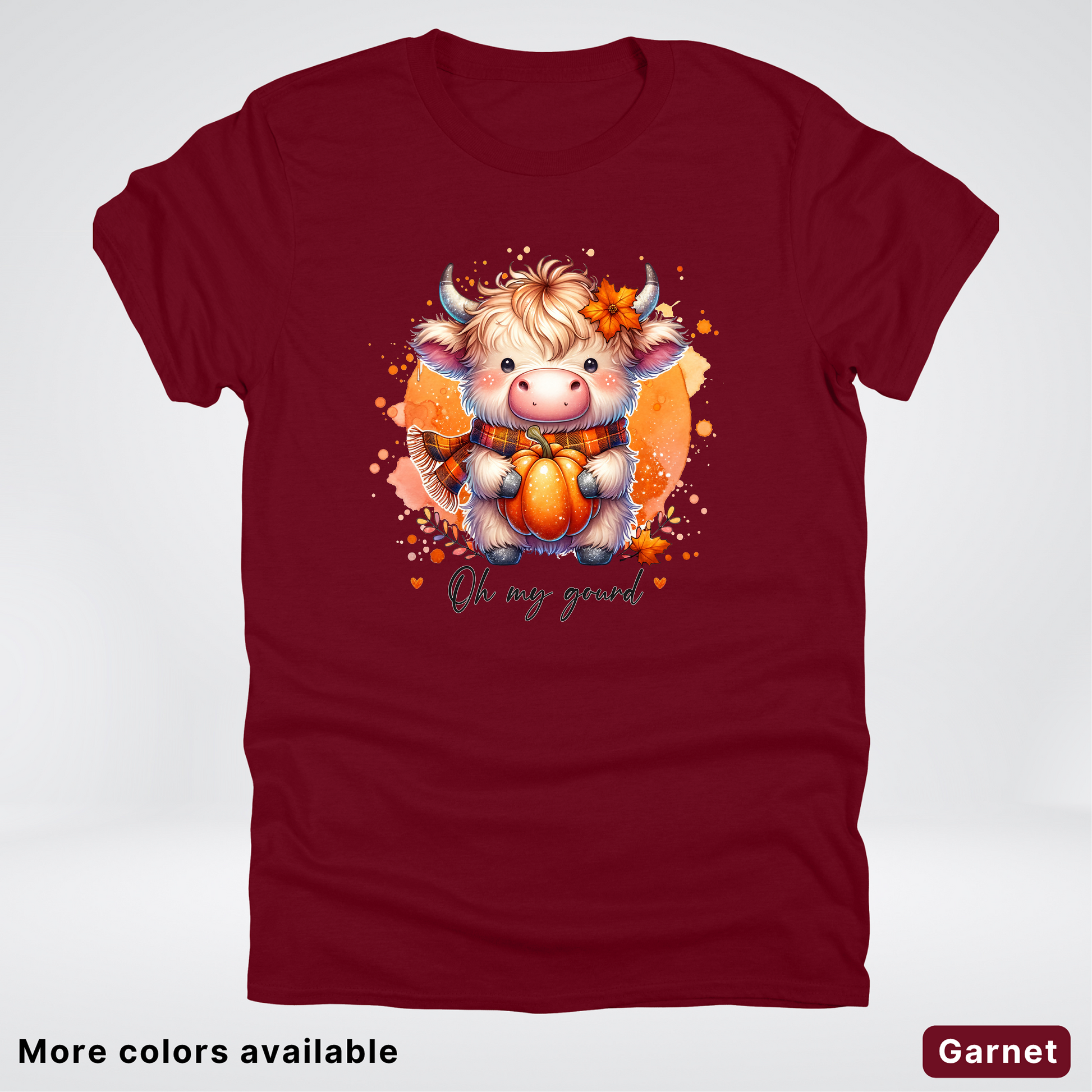 Celebrate the season with this adorable "Oh My Gourd" tee featuring a charming cow calf surrounded by festive pumpkins. Perfect for fall lovers who appreciate a little humor and whimsy, this playful design brings cozy autumn vibes to your everyday wardrobe. Soft, comfortable, and ready to spread smiles at the pumpkin patch, harvest festivals, or casual hangouts. A must-have for anyone who loves puns, farm animals, and all things pumpkin spice season.
