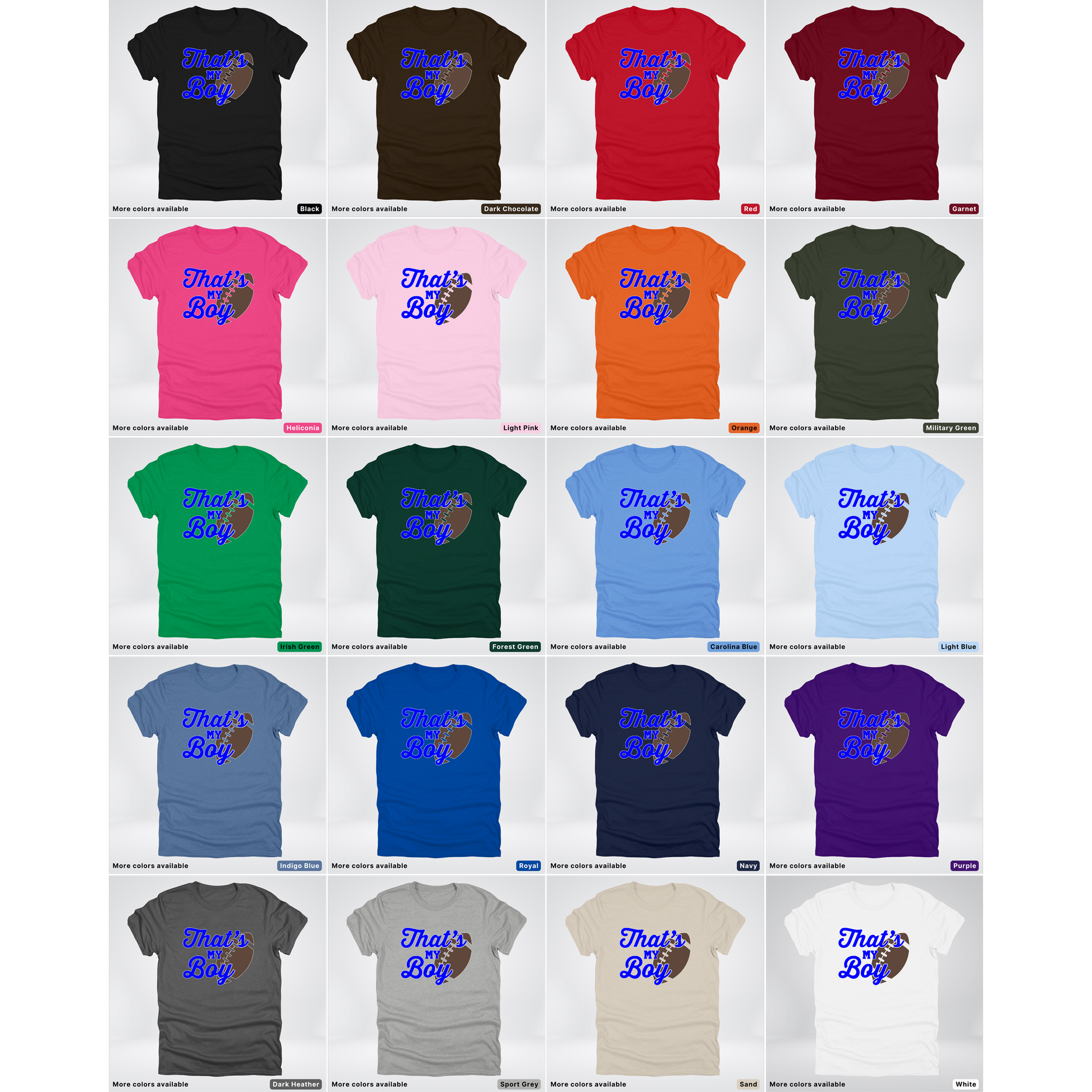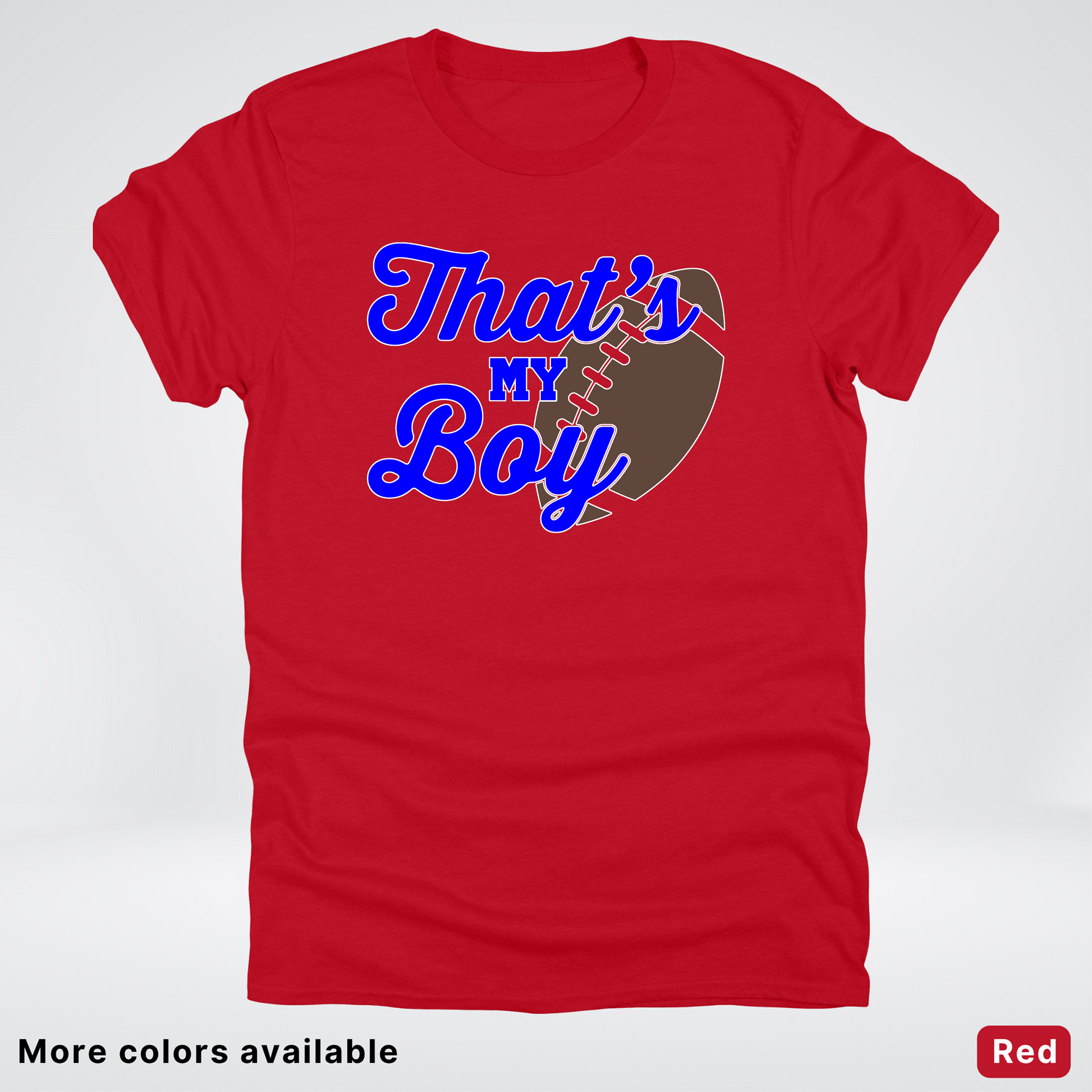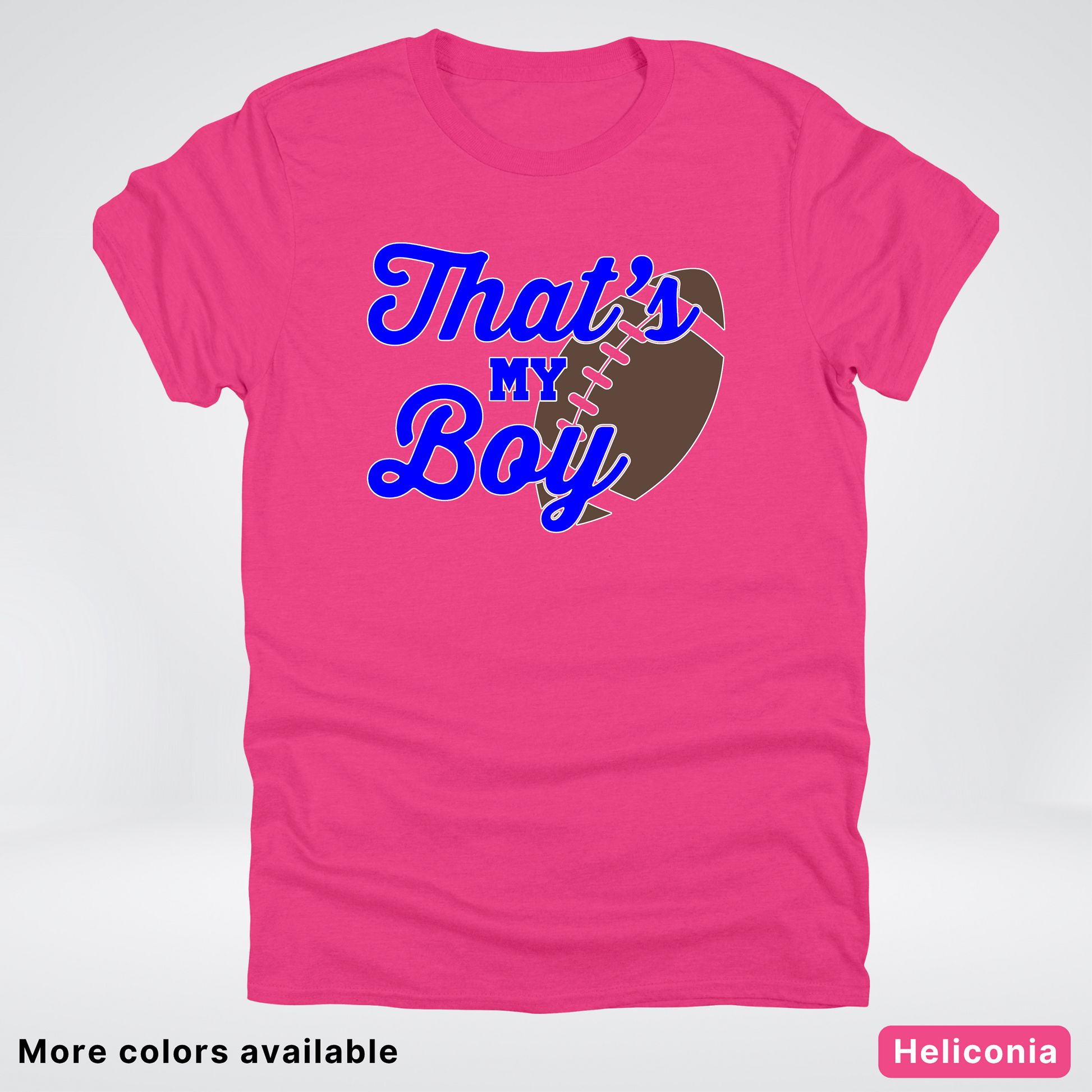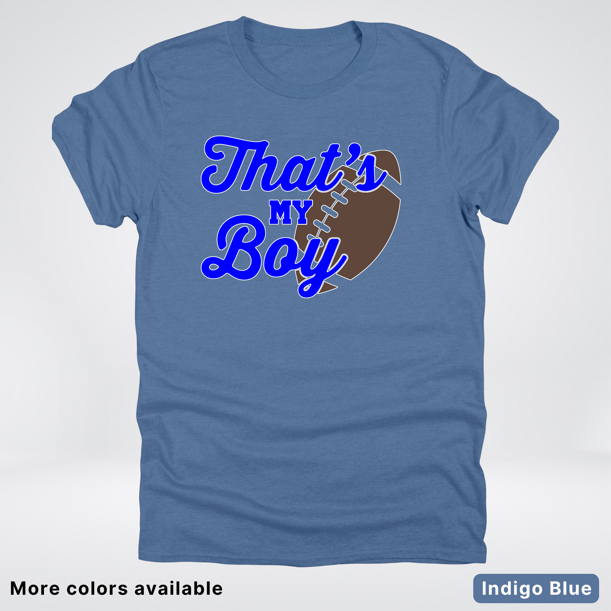 Celebrate your pride with this spirited football tee featuring a bold blue design that says it all. Perfect for game day or showing support year-round, this comfortable t-shirt lets every parent, grandparent, or fan cheer loud and proud. Whether your boy is on the field or in the stands, wear your enthusiasm with style. Soft, durable, and ready for countless washes, it's the ultimate way to rep your team and your favorite player.