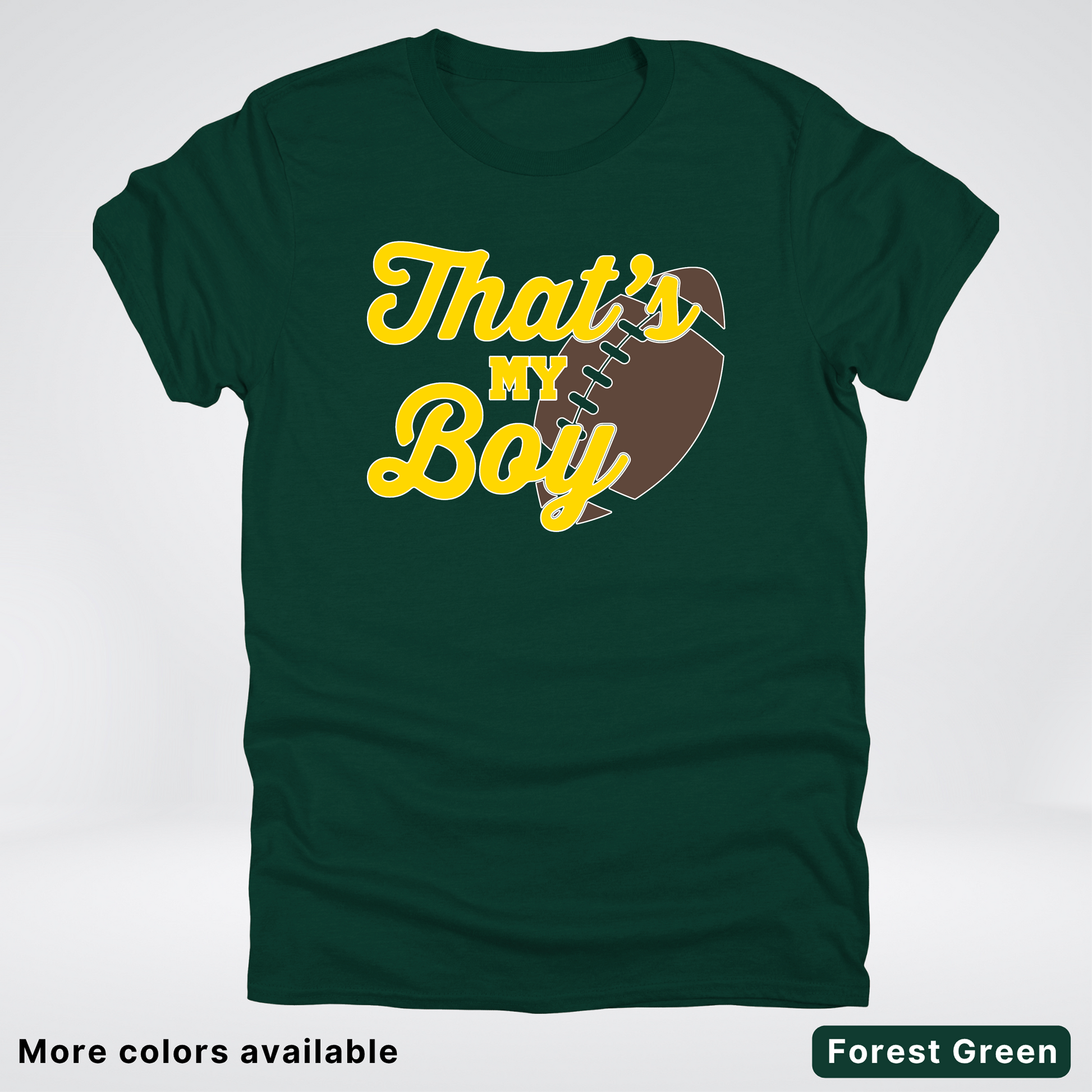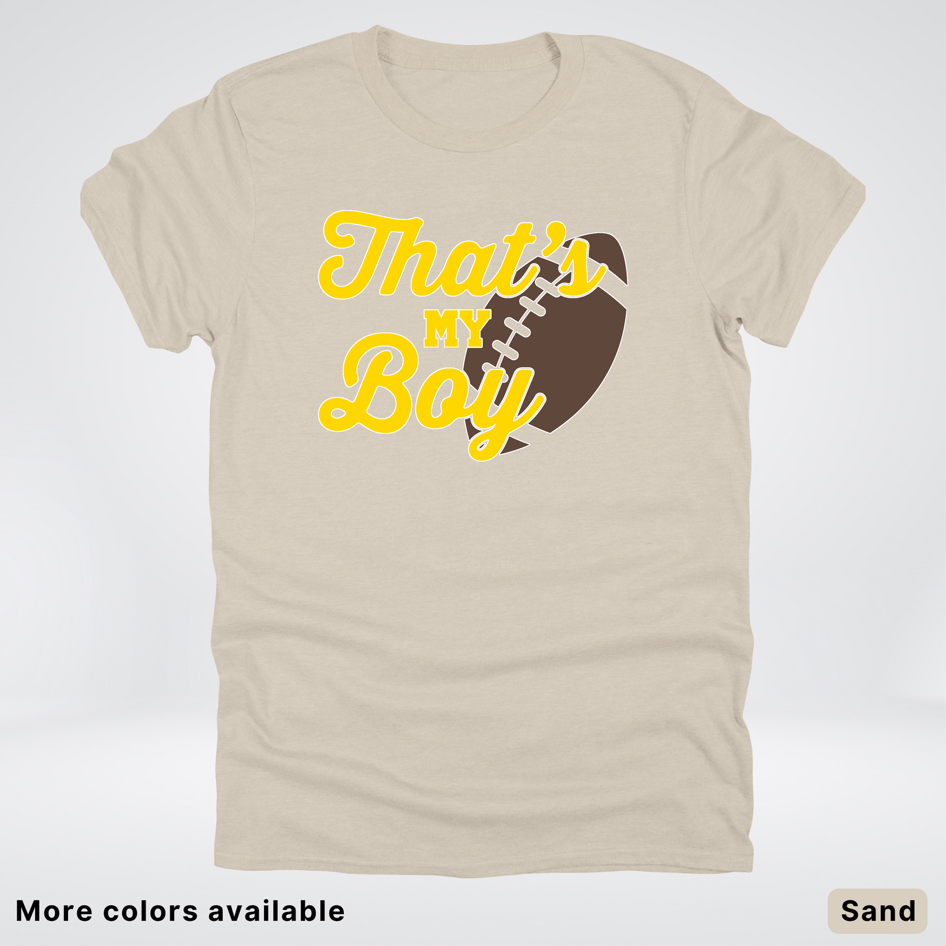 Celebrate your pride with this spirited football tee featuring a bold gold design that shouts "That's My Boy!" Perfect for game day, practice sidelines, or casual wear, this shirt lets every parent, coach, and fan show their unwavering support. The eye-catching gold graphic pops against quality fabric that's comfortable enough for all-day wear. Whether you're cheering from the stands or showing your team spirit around town, this tee is your go-to way to rep your champion in style.