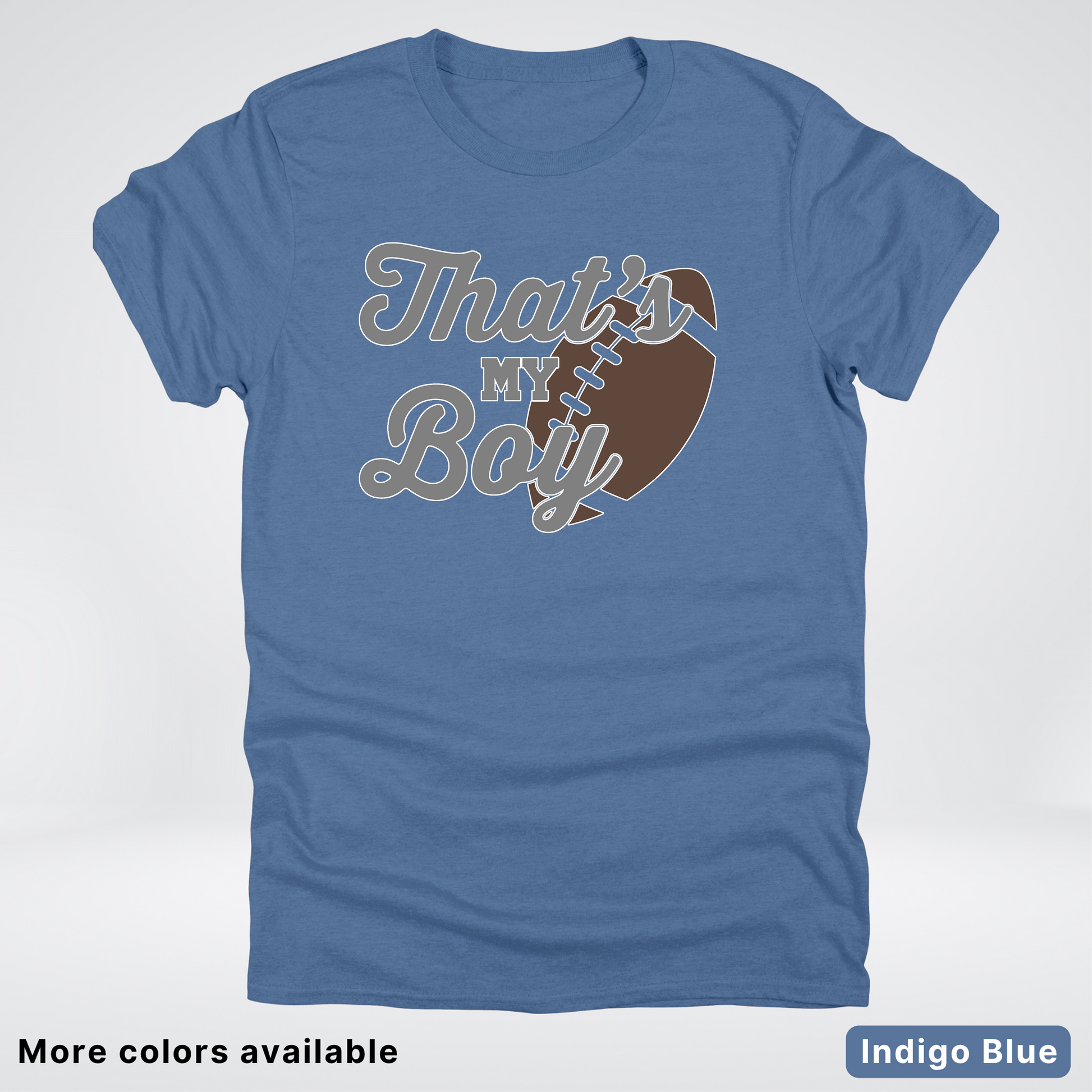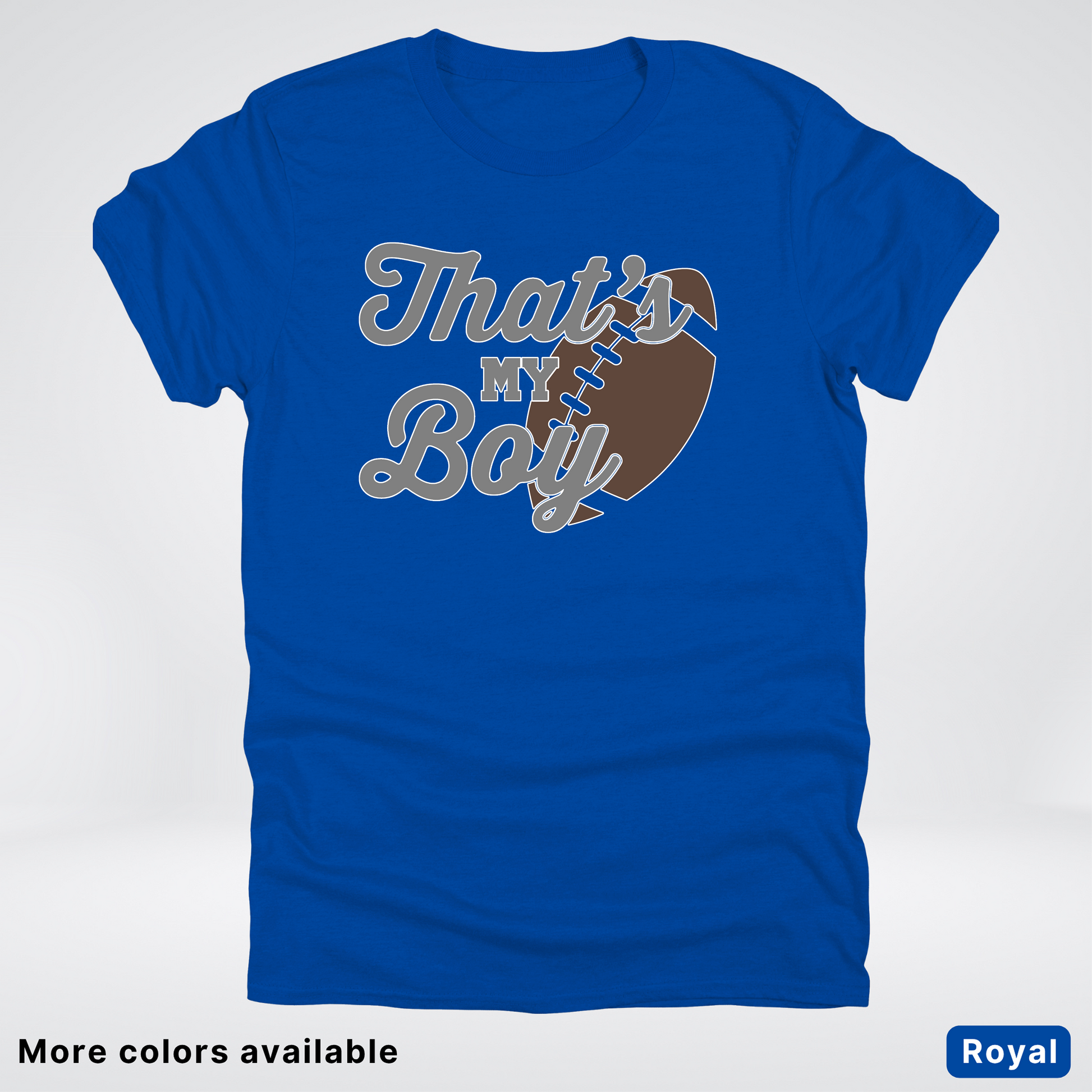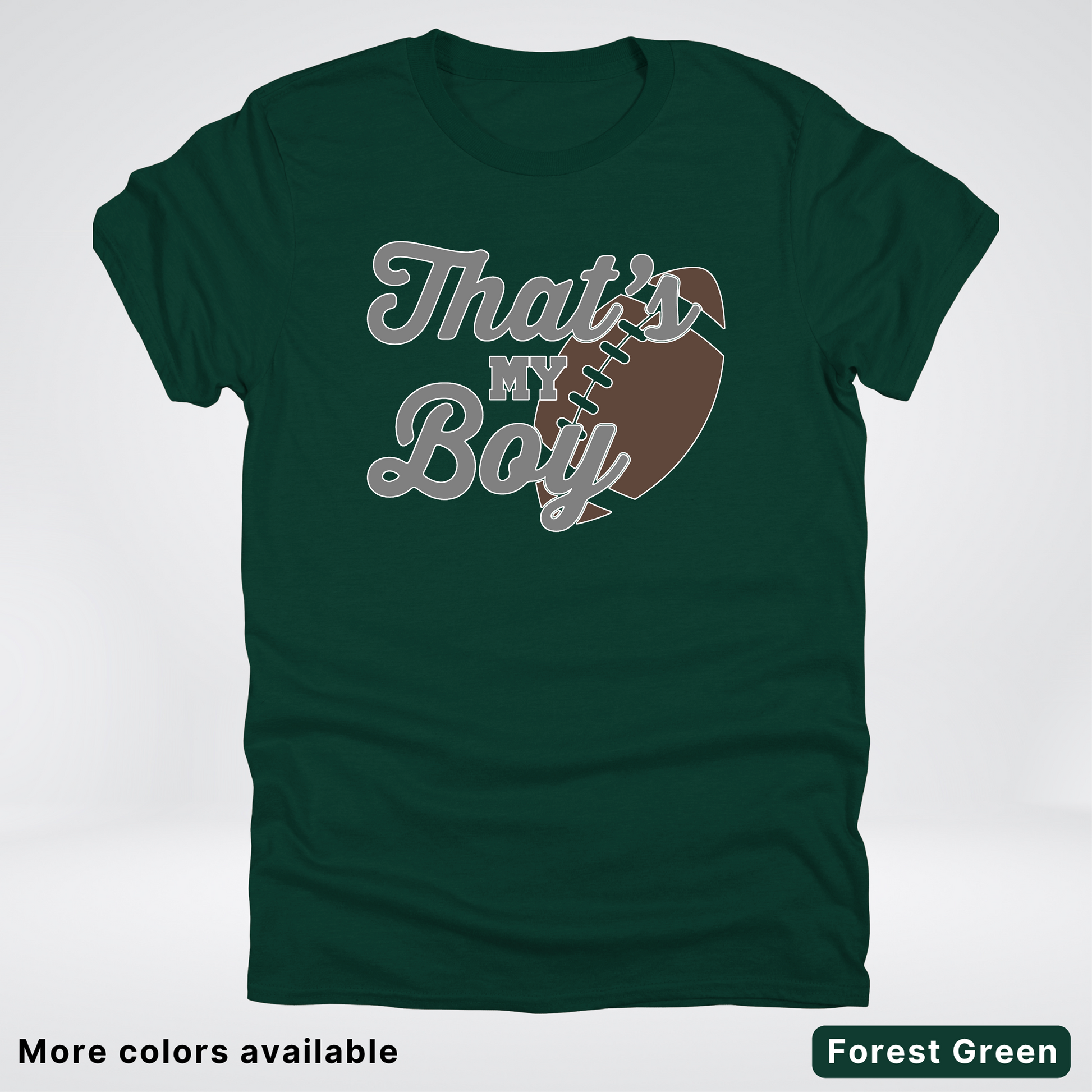 Celebrate your pride with this playful football tee! Perfect for parents and fans who want to show their support in style, this gray design features a fun "That's My Boy" message that'll get laughs and nods at the game. Whether you're cheering from the sidelines or just showing off your team spirit at home, this comfortable tee is your go-to choice. Soft, durable, and ready for game day—because every proud parent deserves a shirt that matches their enthusiasm!