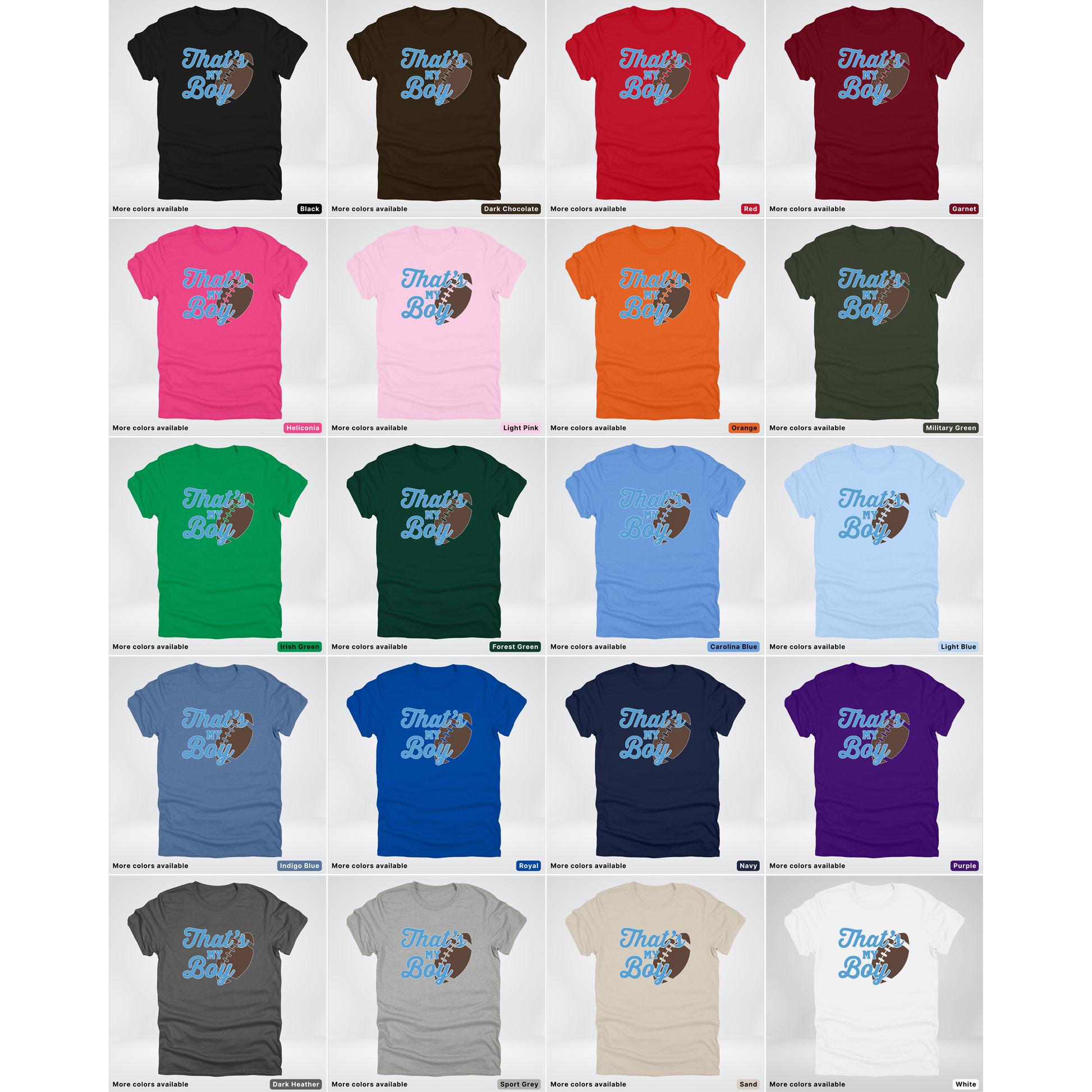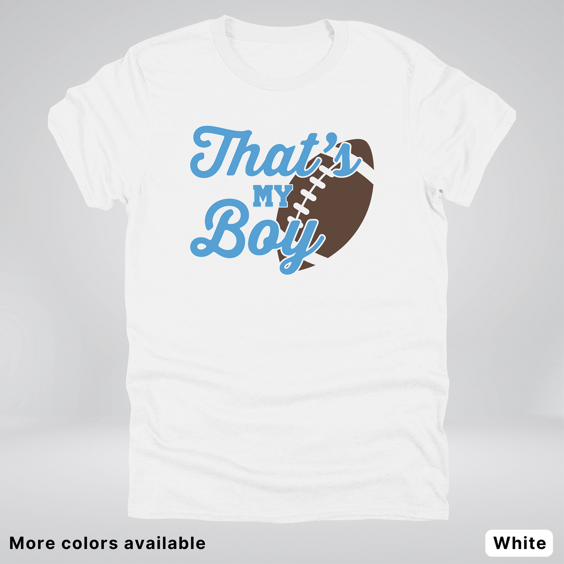 Cheer on your favorite player in style with this playful light blue football tee. Perfect for proud parents, dedicated fans, and game day enthusiasts, this shirt celebrates the spirit of the sport with a fun, eye-catching design. Comfortable, casual, and conversation-starting—because sometimes you just gotta let everyone know: that's your boy out there on the field!