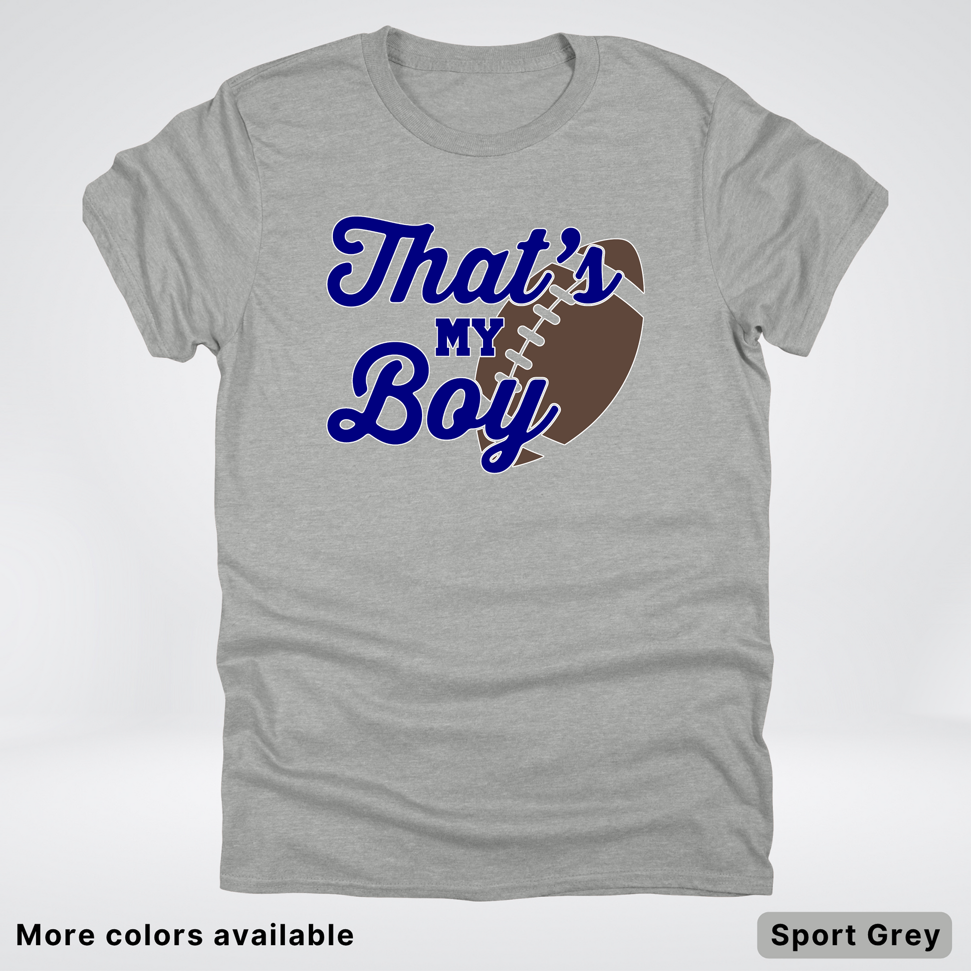 Celebrate your pride with this spirited football tee! Featuring a bold navy design, this shirt is perfect for the ultimate sports parent or fan cheering from the sidelines. The playful "That's My Boy" message captures that unmistakable joy of supporting your favorite player. Comfortable, casual, and conversation-starting—wear it to games, tailgates, or anywhere you want to show your team spirit. A must-have for any football enthusiast's wardrobe.