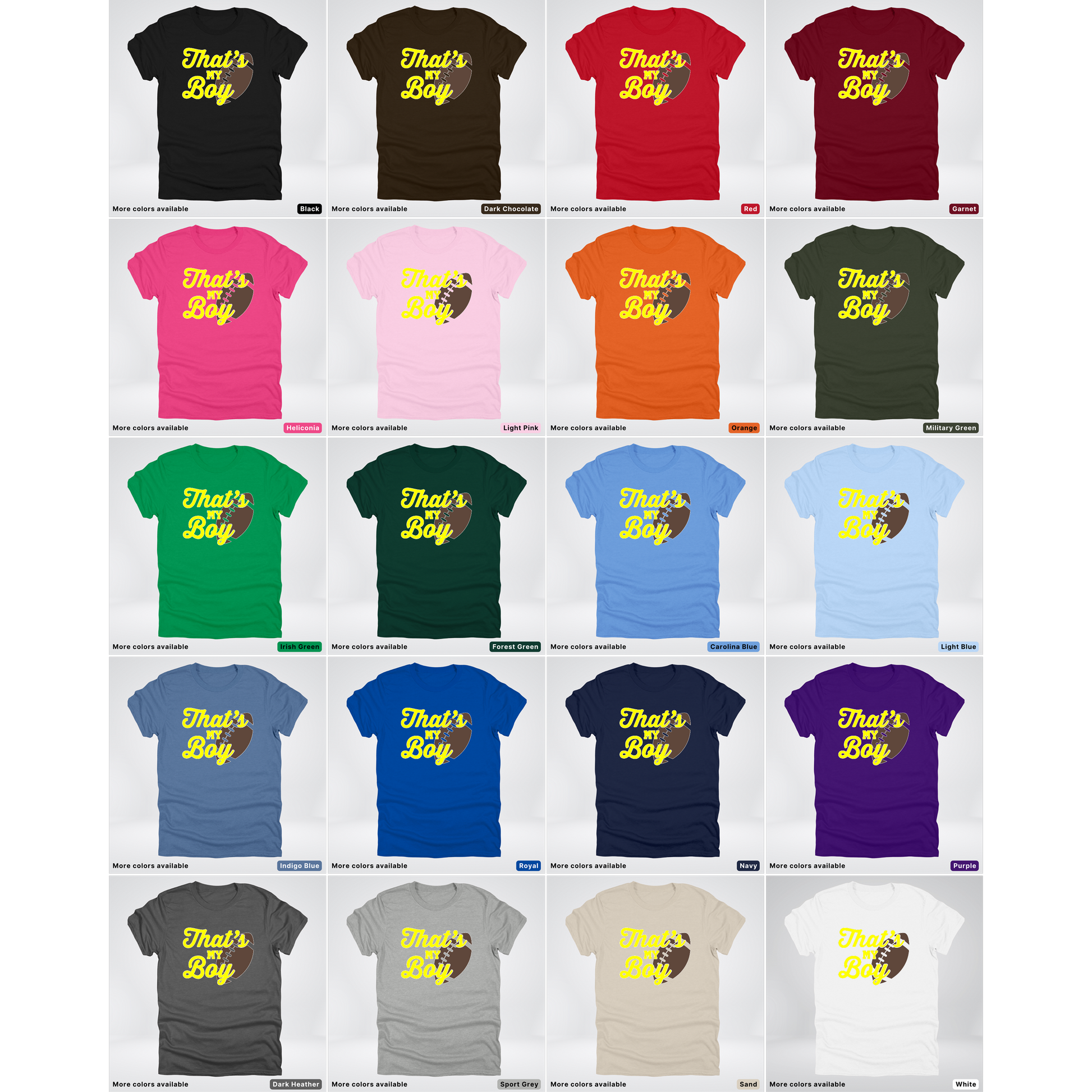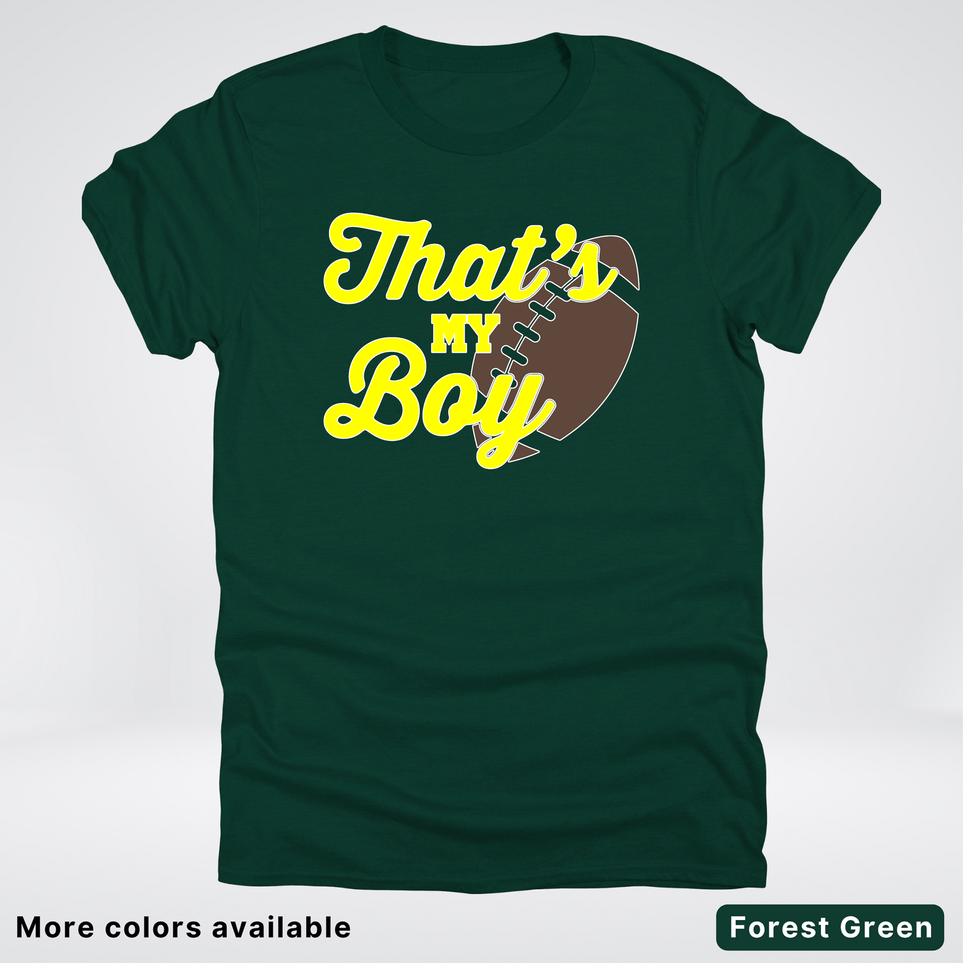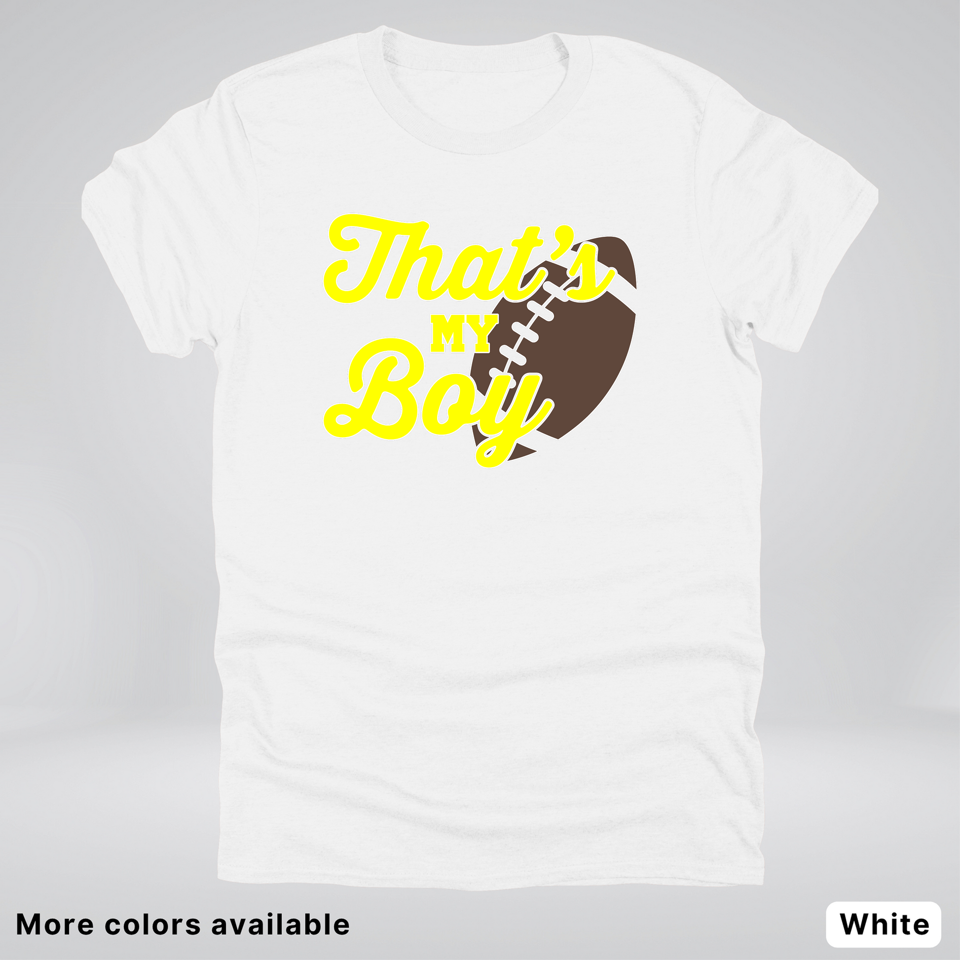 Cheer on your favorite player in style with this vibrant yellow football tee! Perfect for proud parents, dedicated fans, and game day enthusiasts, this shirt celebrates the spirit of the sport with bold, eye-catching design. Crafted for comfort and durability, it's ideal for wearing to the stadium, around town, or anywhere you want to show your team pride. Whether you're supporting a young athlete or a seasoned pro, this playful tee makes a statement that says it all: That's My Boy!